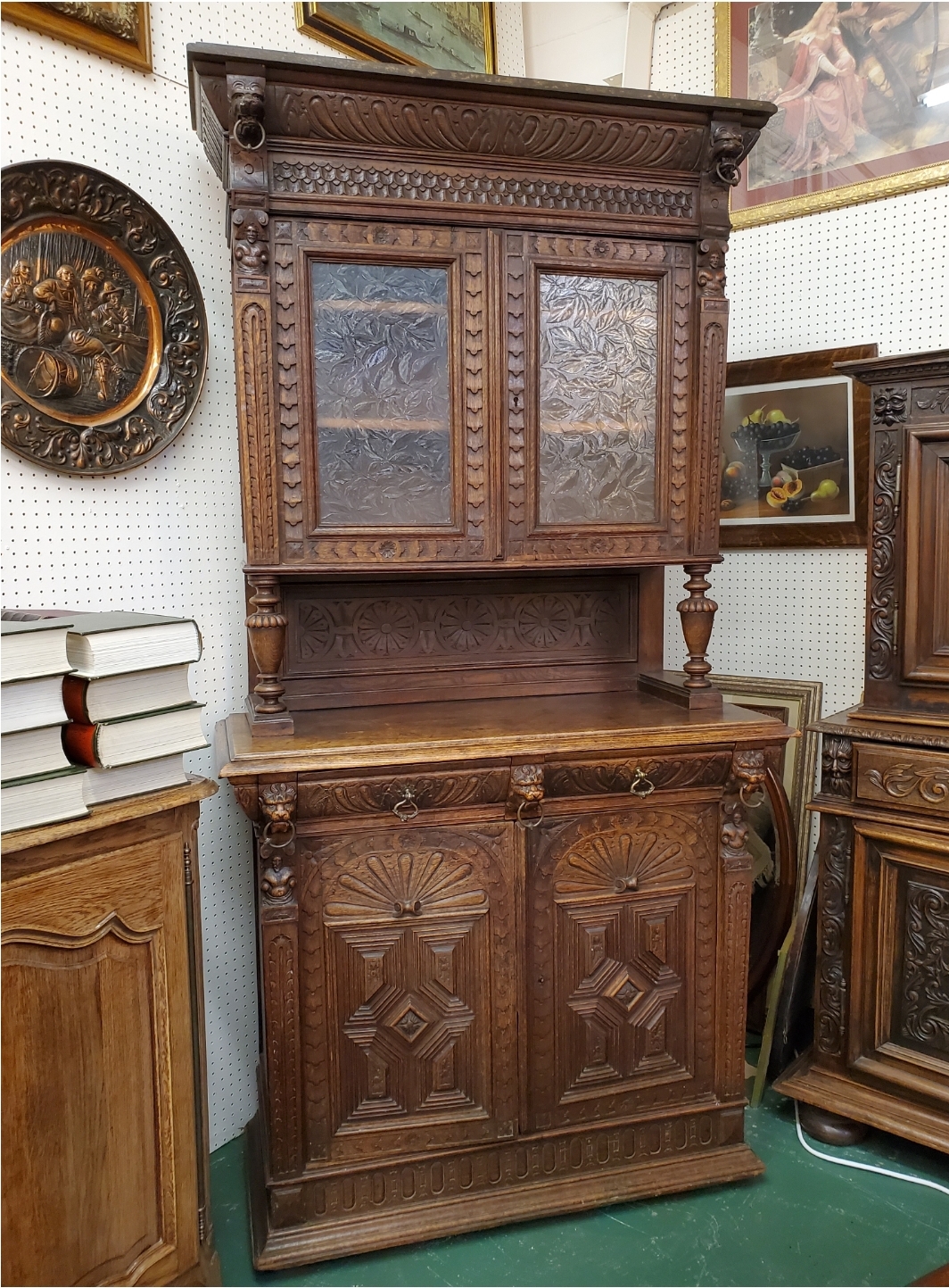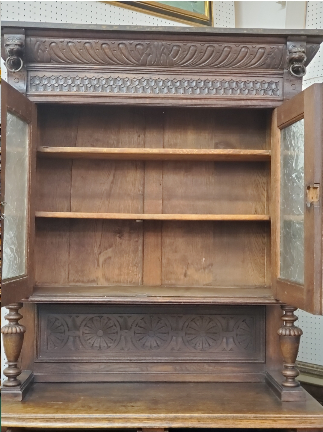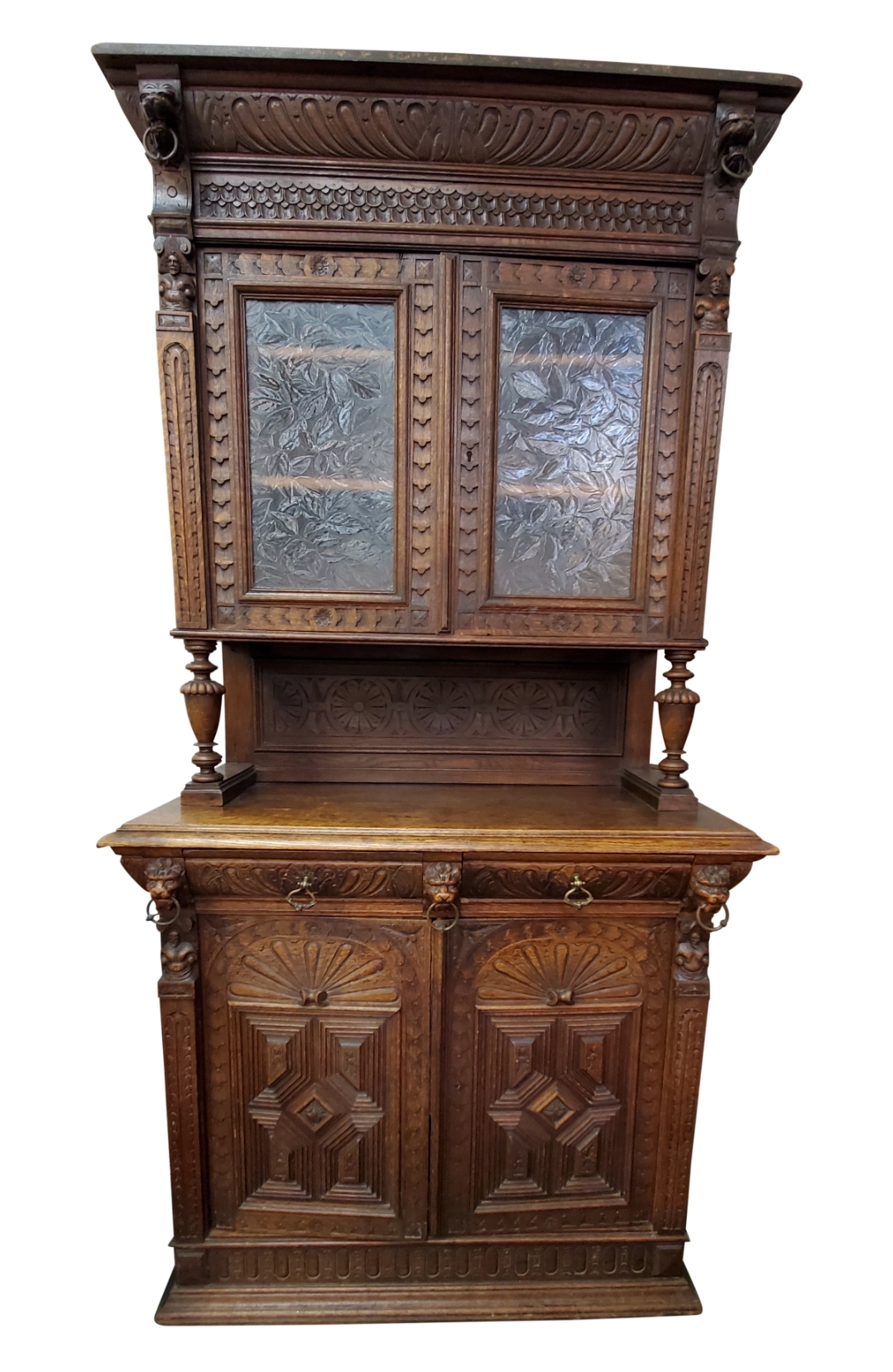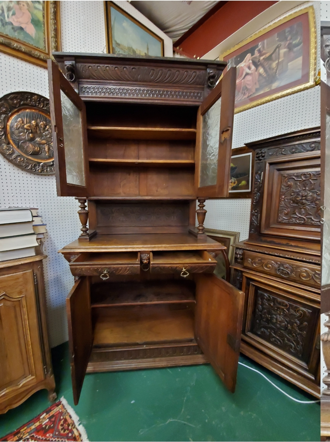 Antique 19th century gothic carved hunter’s cabinet. The top has two doors that open to reveal two wood shelves inside, the bottom has two carved doors with a shelf inside.