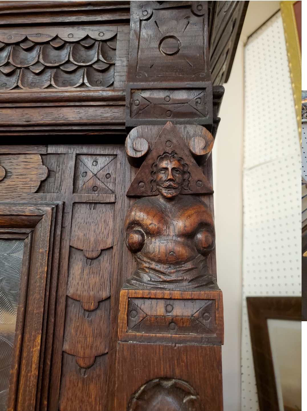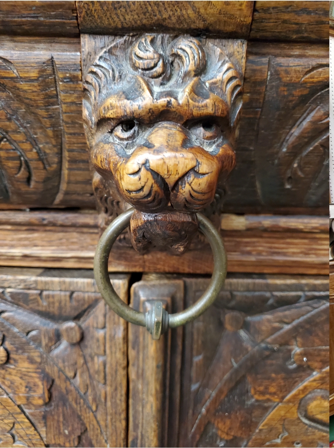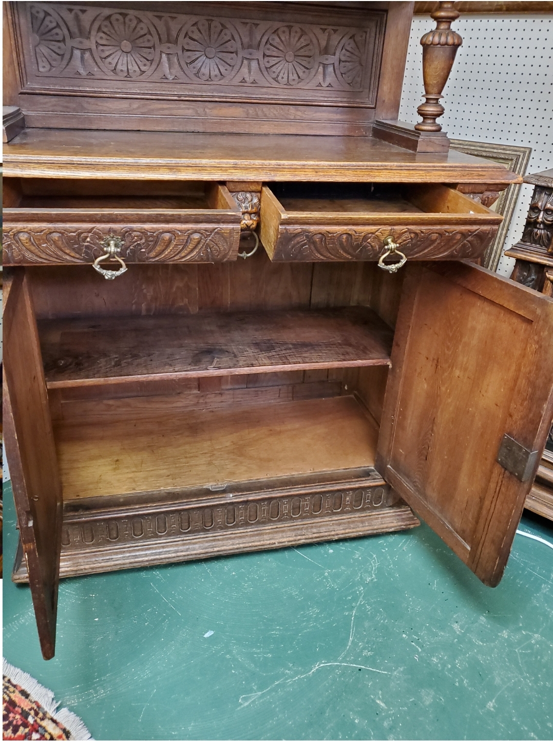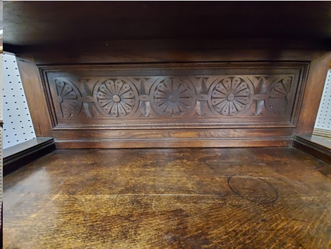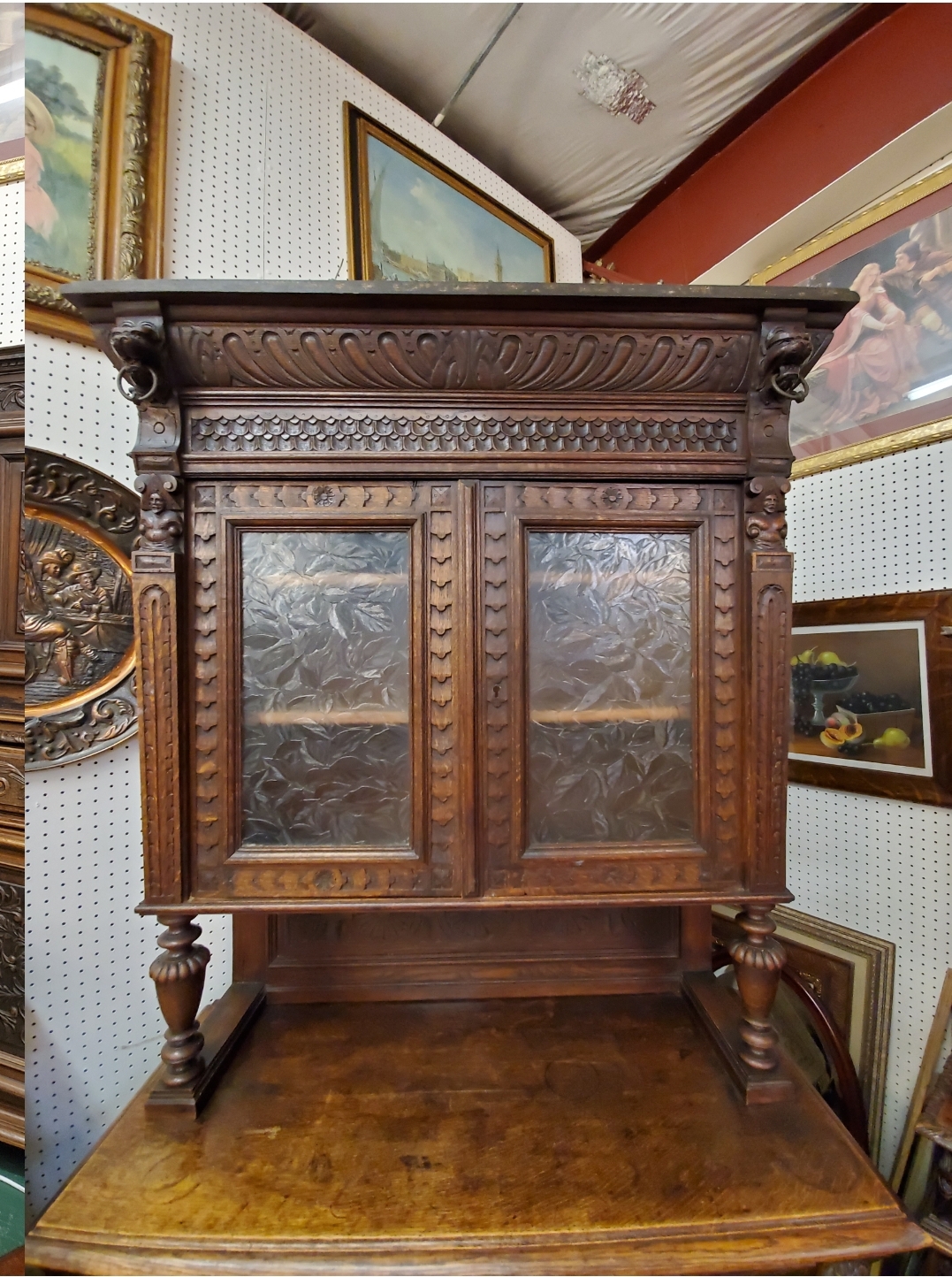 Antique 19th century gothic carved hunter’s cabinet. The top has two doors that open to reveal two wood shelves inside, the bottom has two carved doors with a shelf inside.