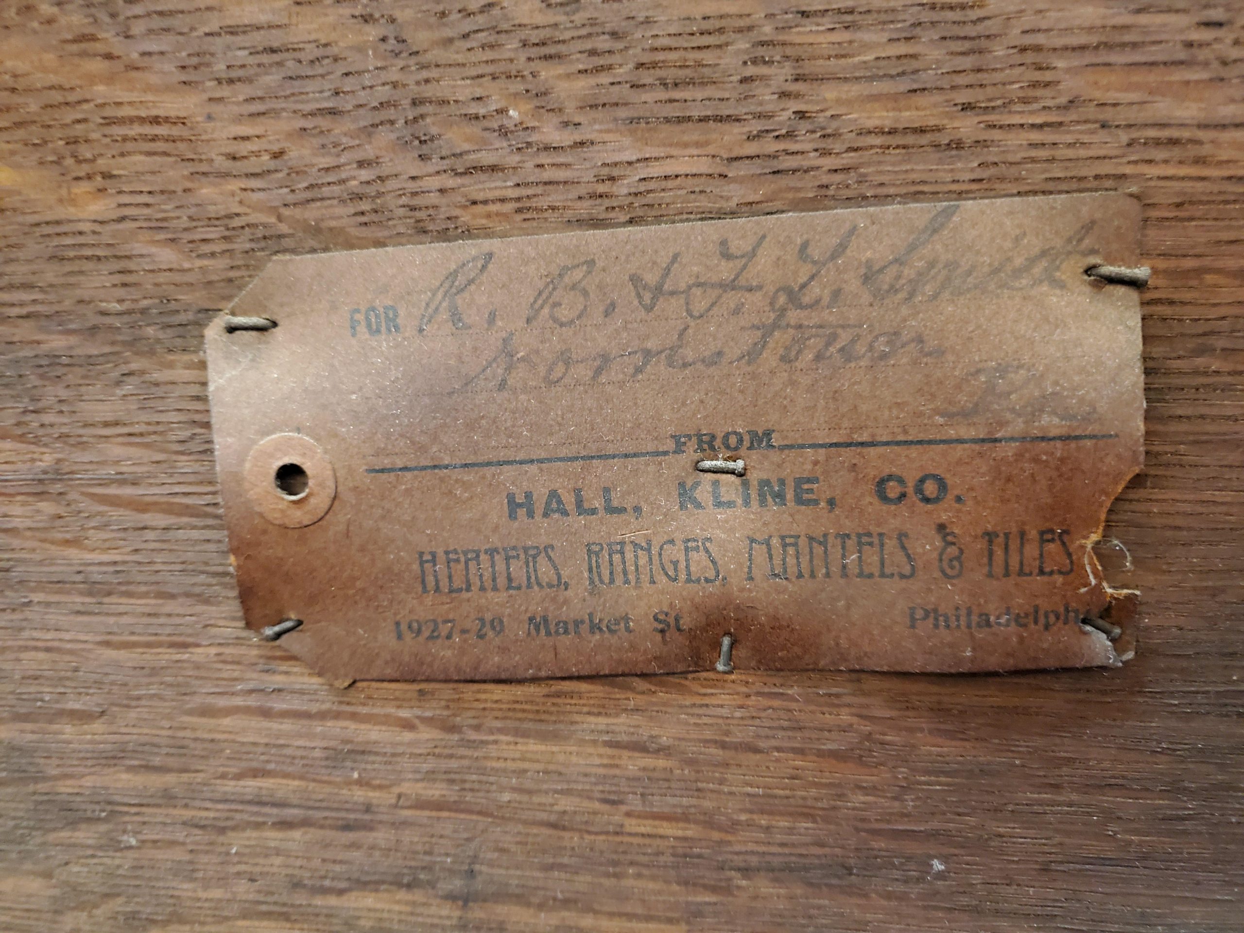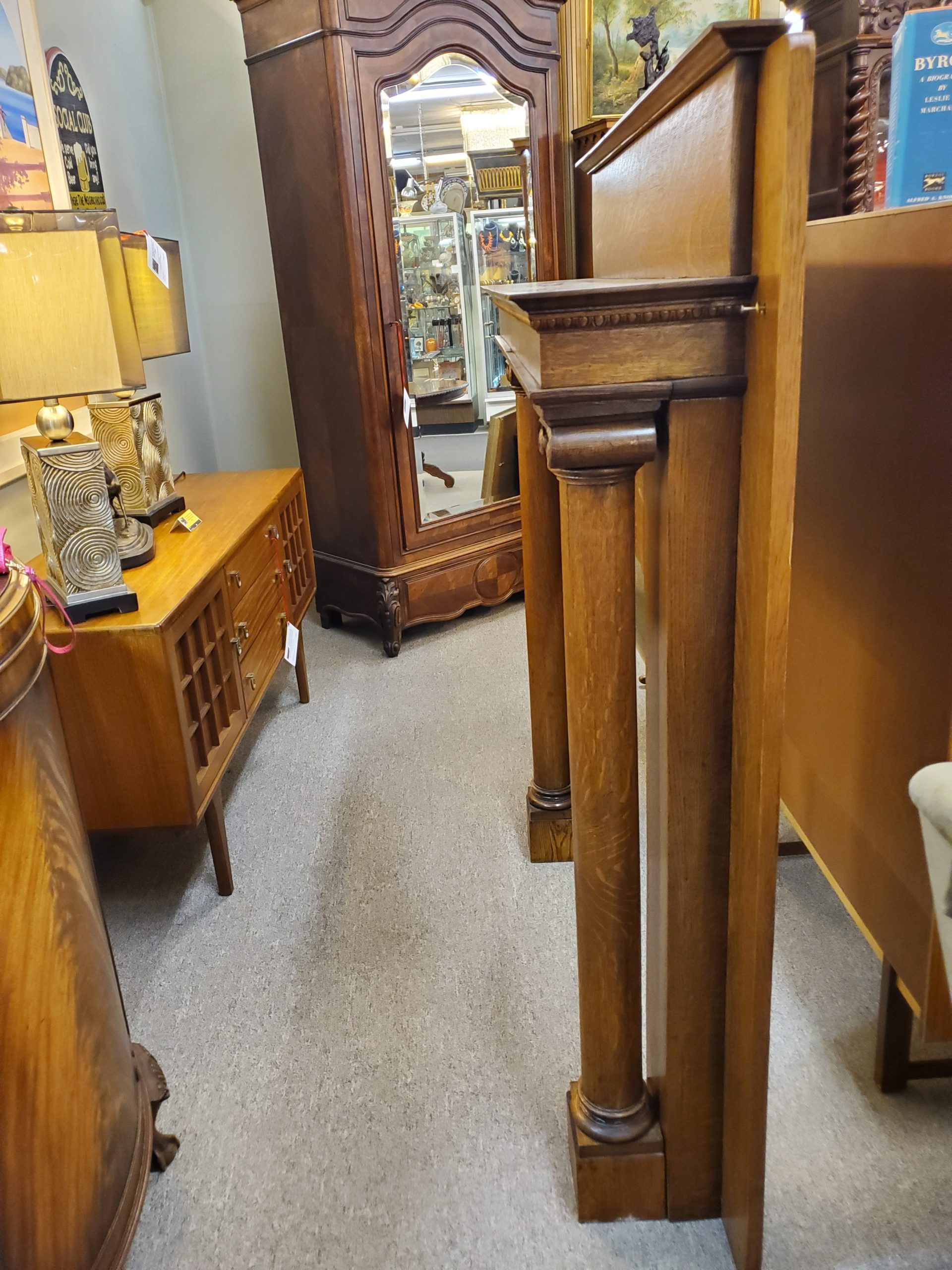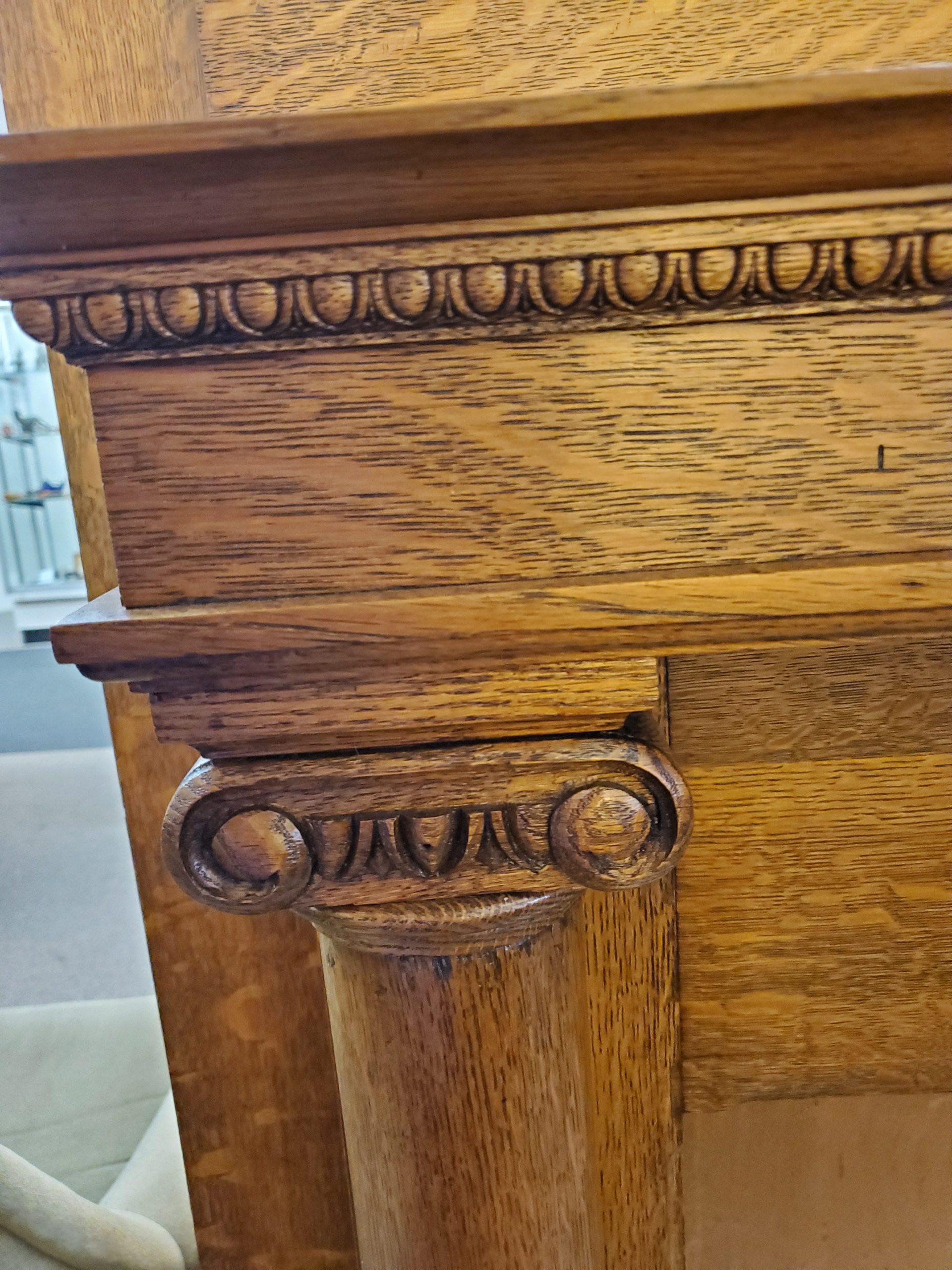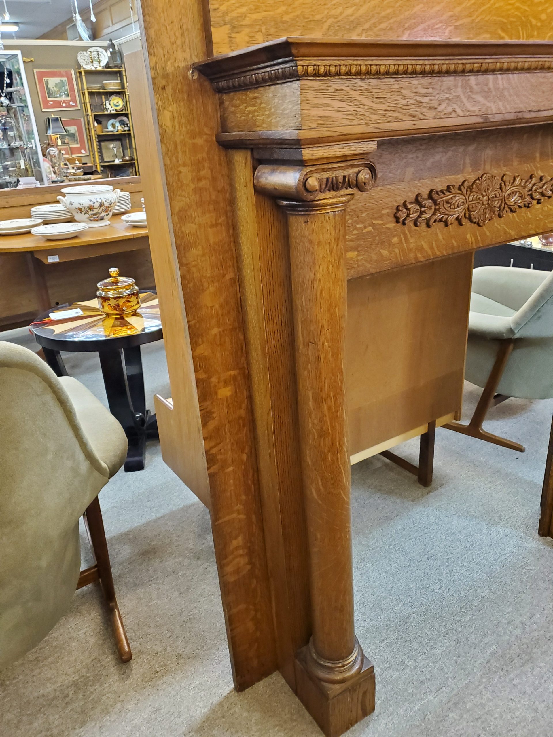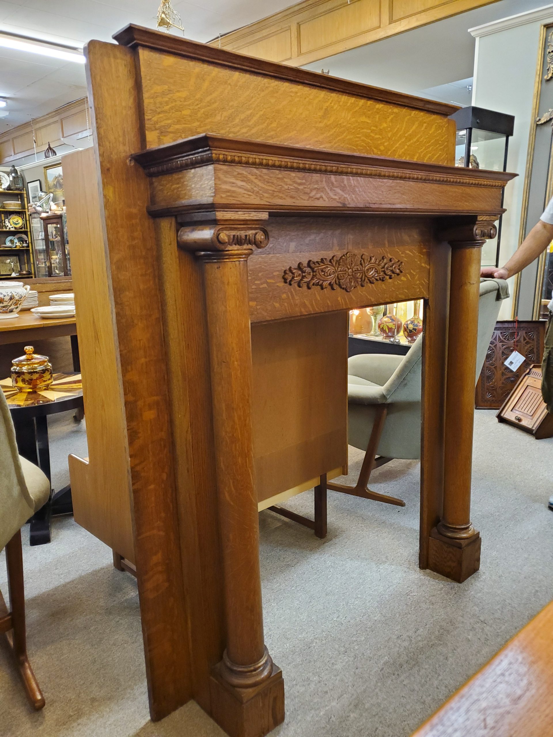 19th century made in Philadelphia antique tiger oak fire place mantel with a beautiful carved center piece and column pillars, with the manufacturer’s label on the back. Probably made between 1850’s and 1870’s.