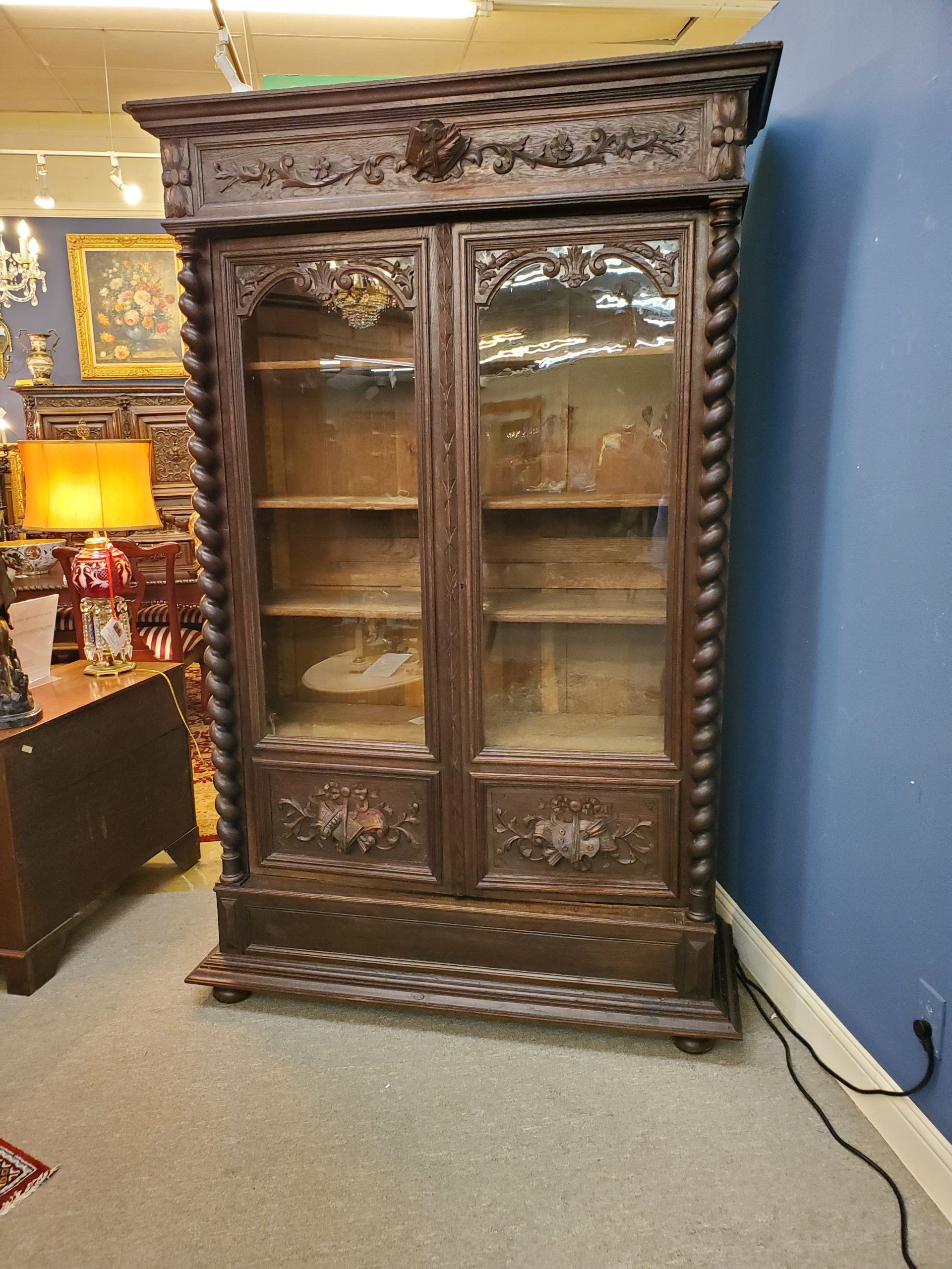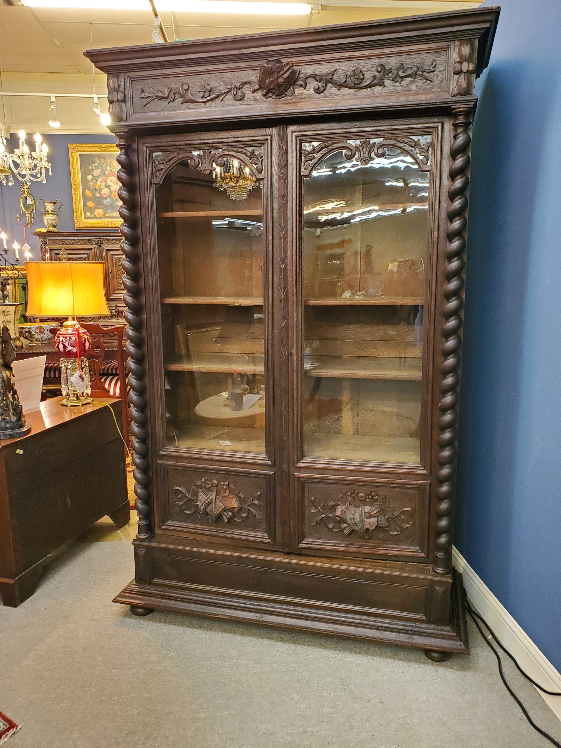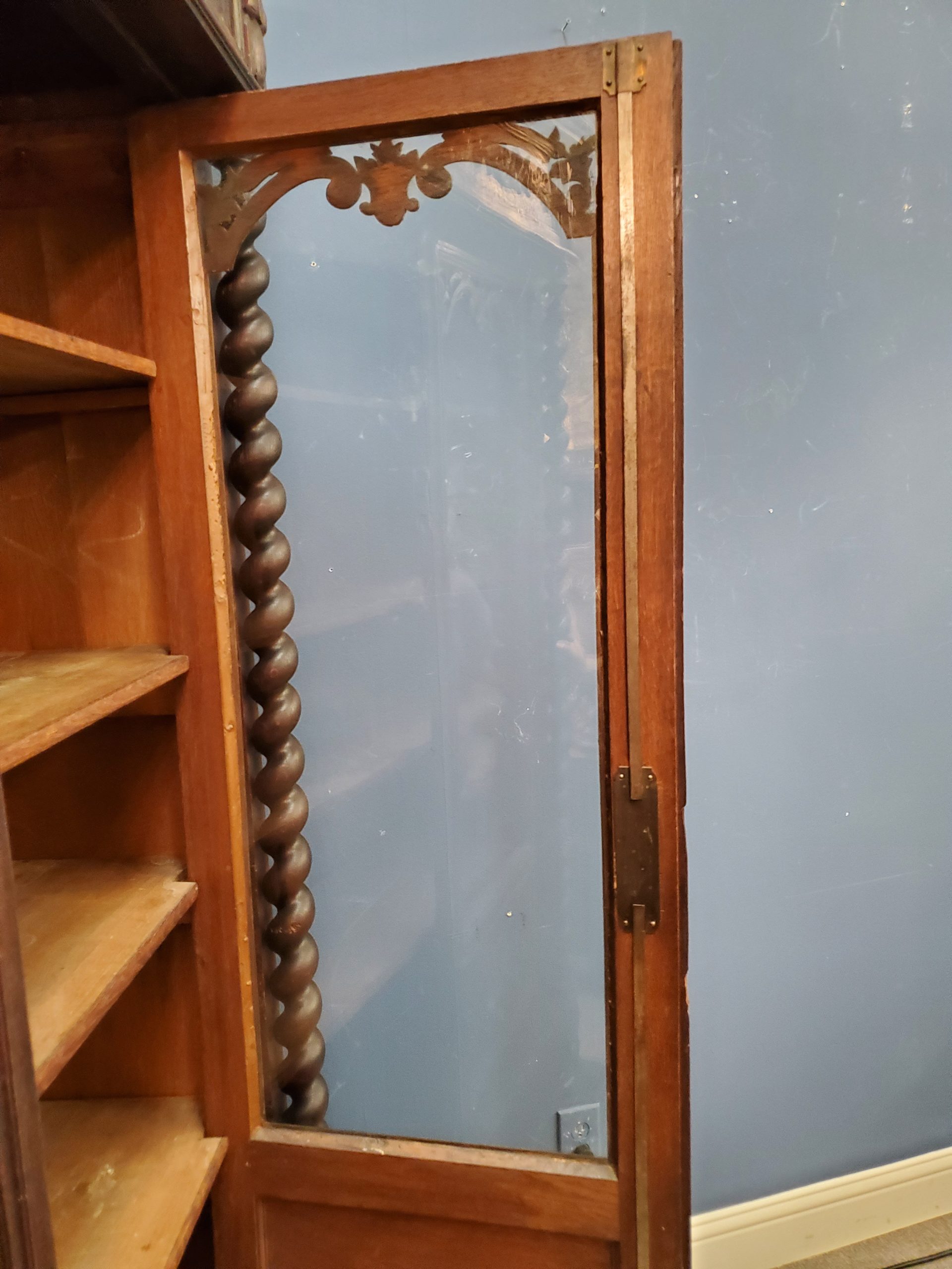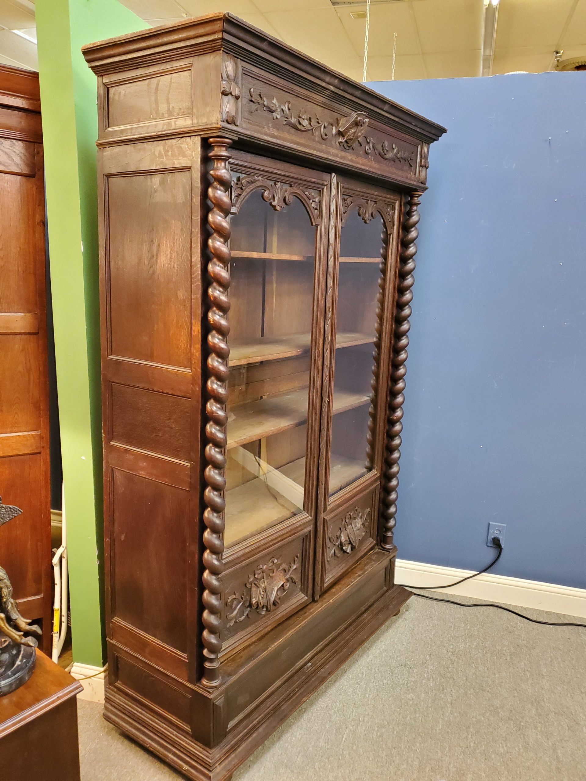 Antique French mid 19th century carved renaissance bookcase with barley twist columns, original old glass inserted in doors which opens to reveal four wood shelves, intricate hand carving throughout.
