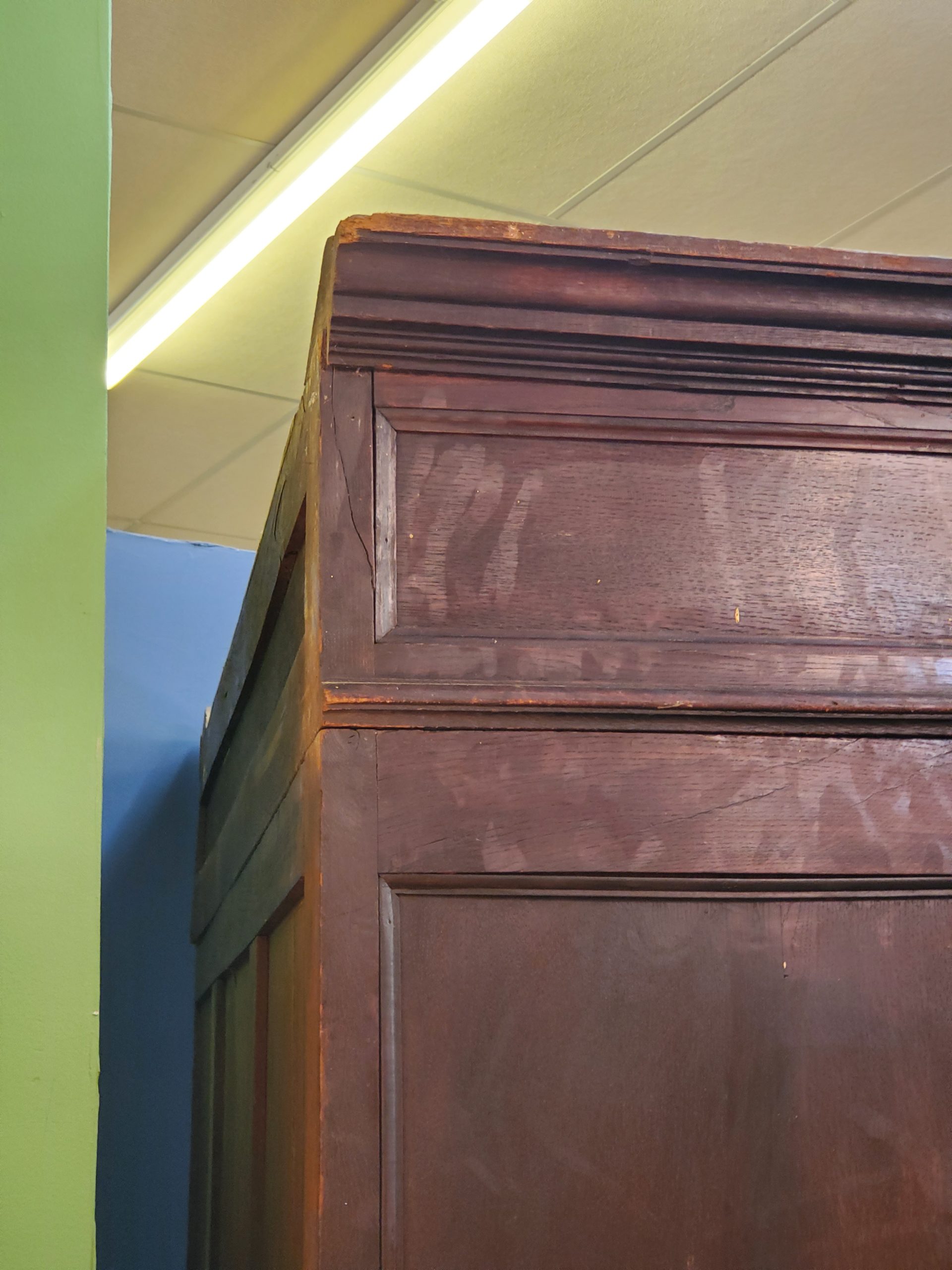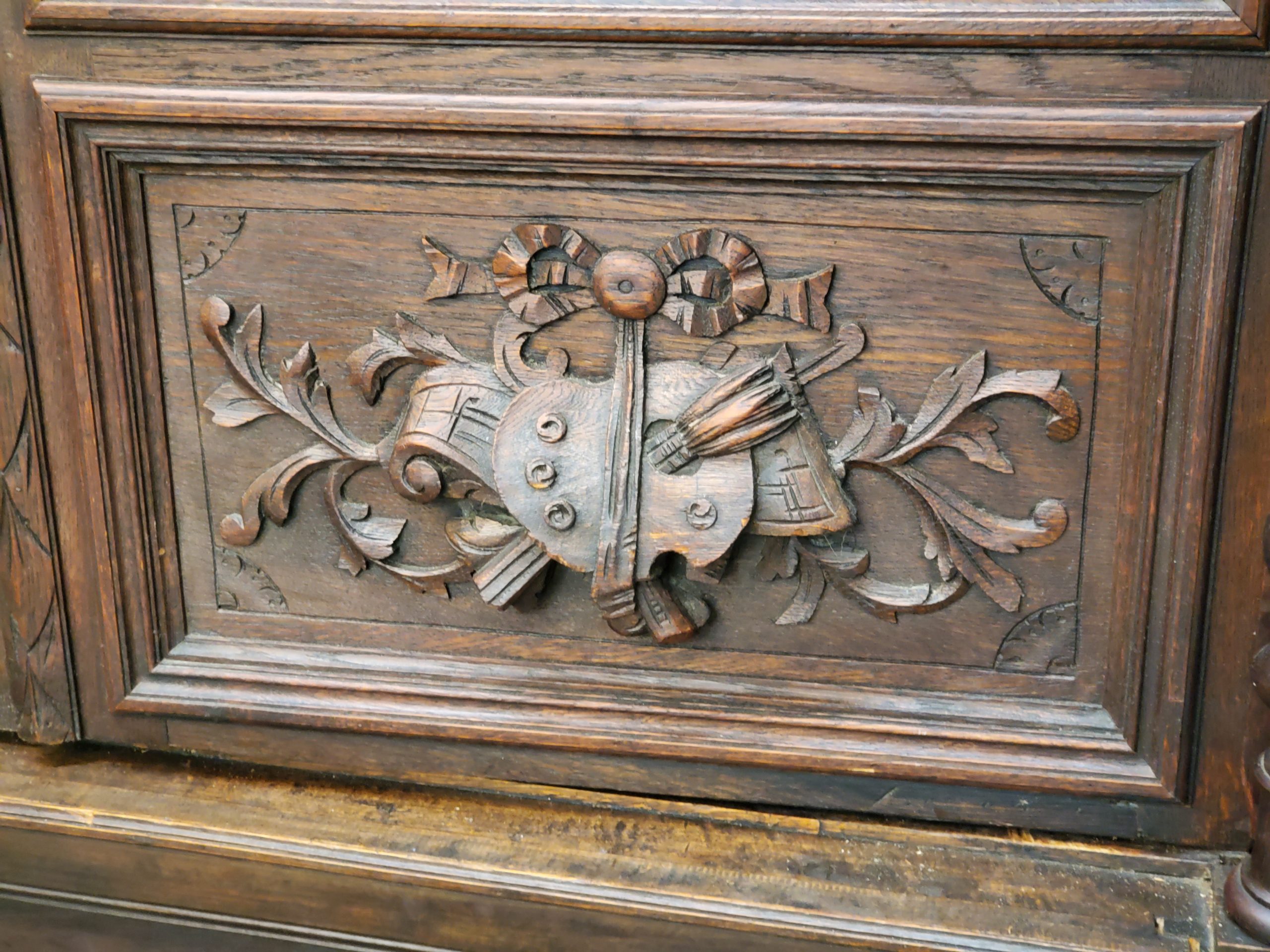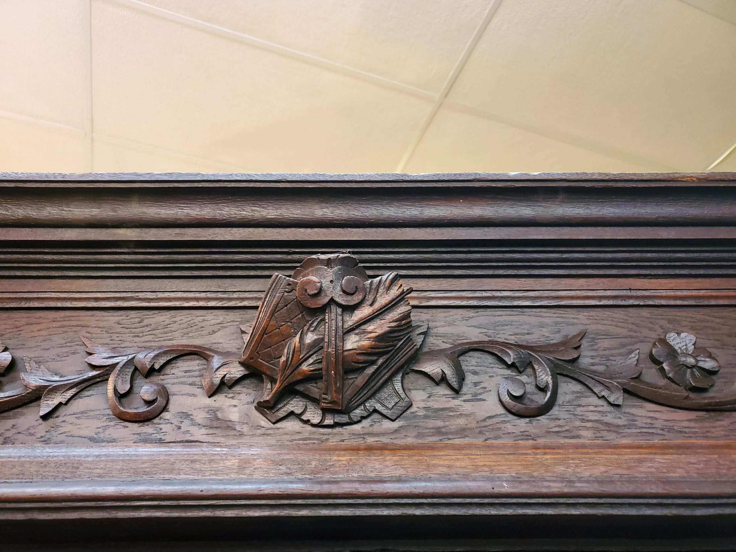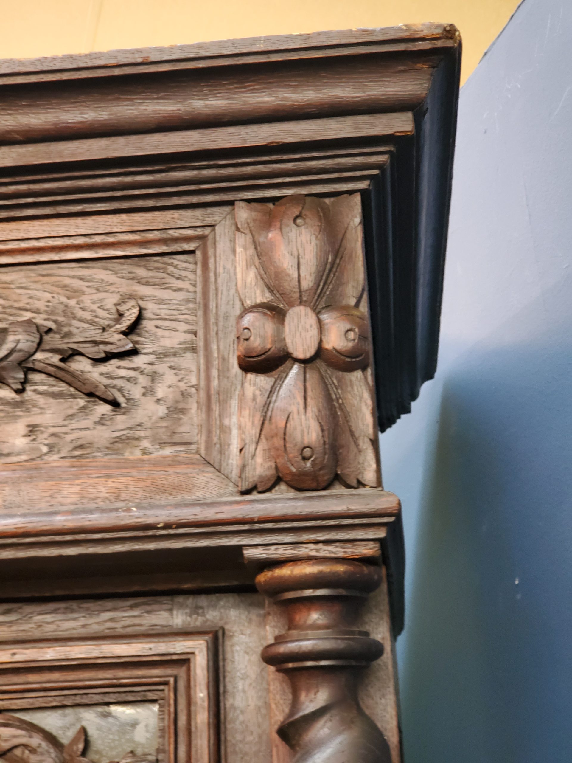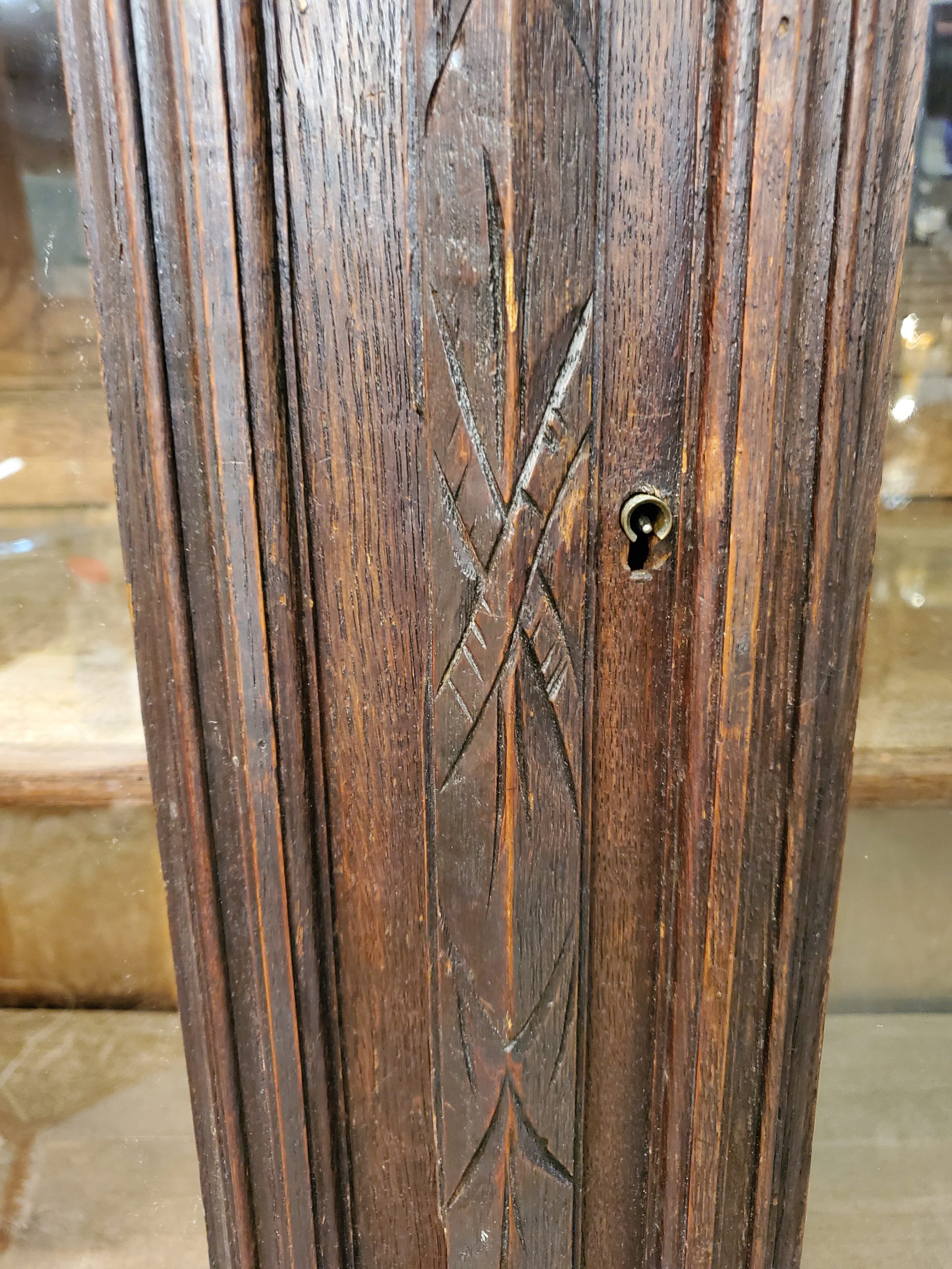 Antique French mid 19th century carved renaissance bookcase with barley twist columns, original old glass inserted in doors which opens to reveal four wood shelves, intricate hand carving throughout.