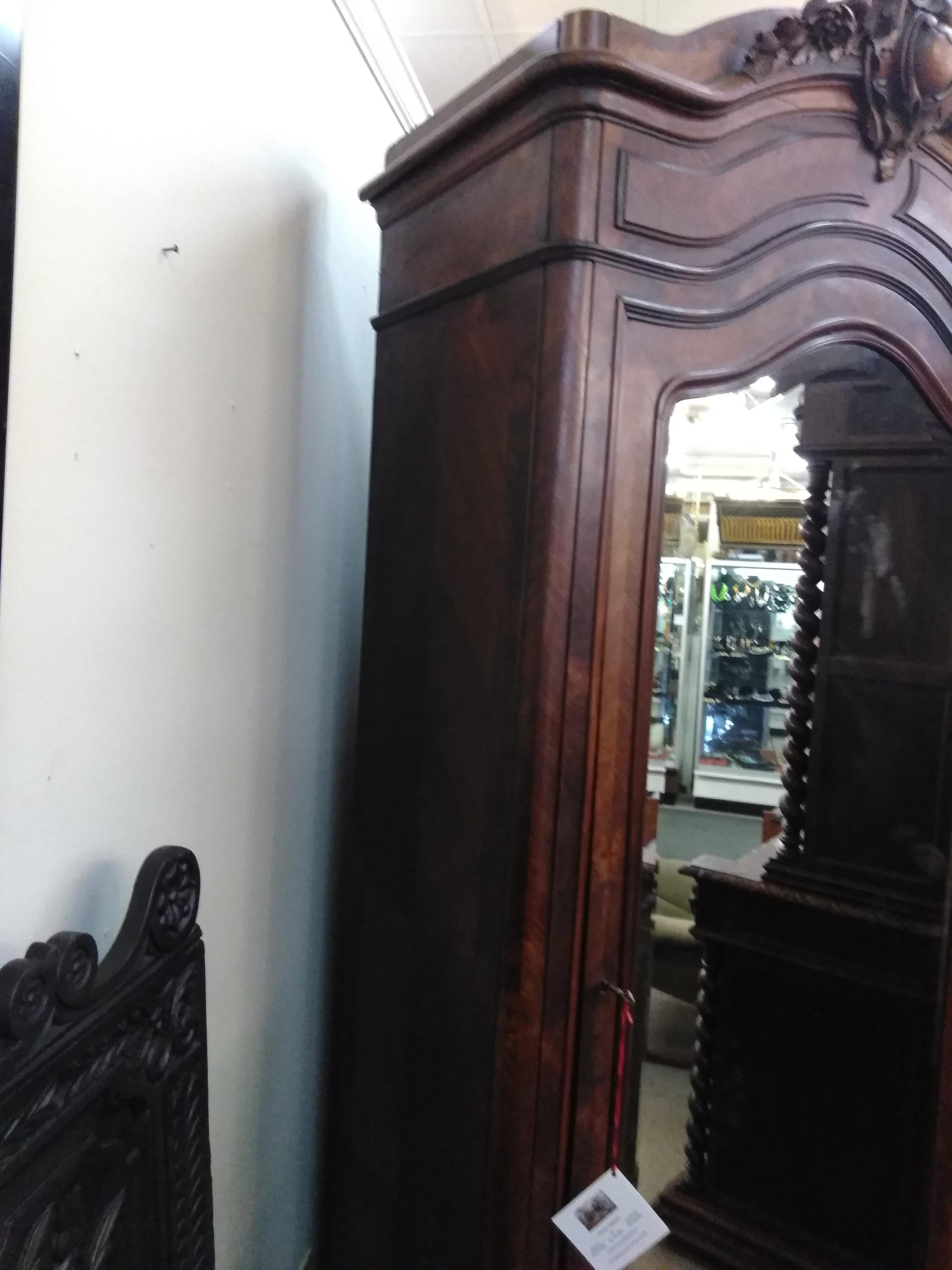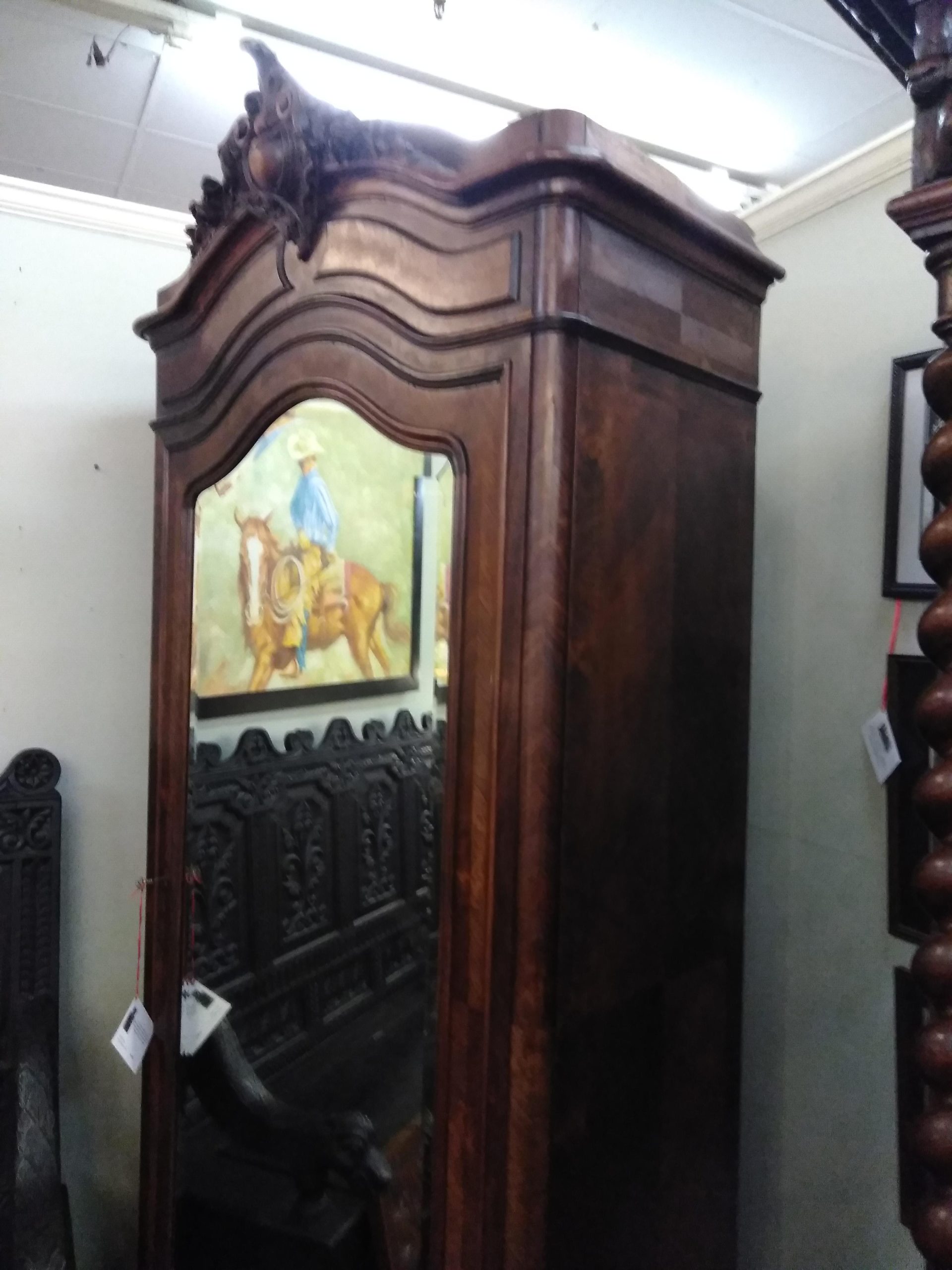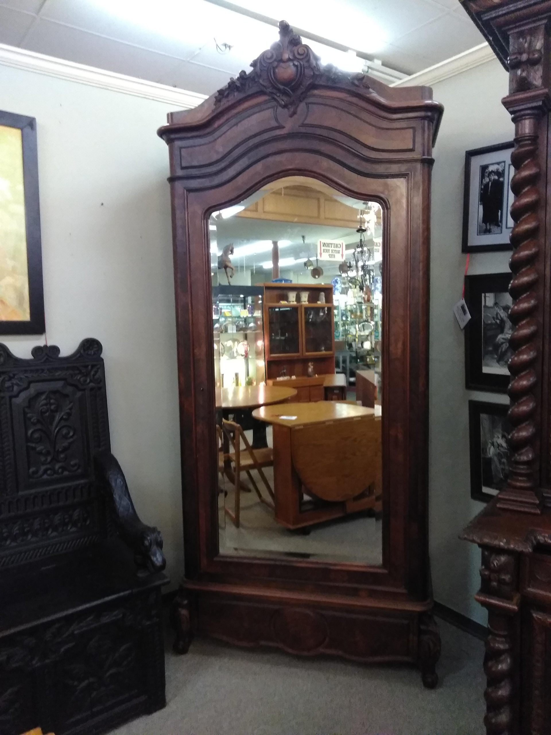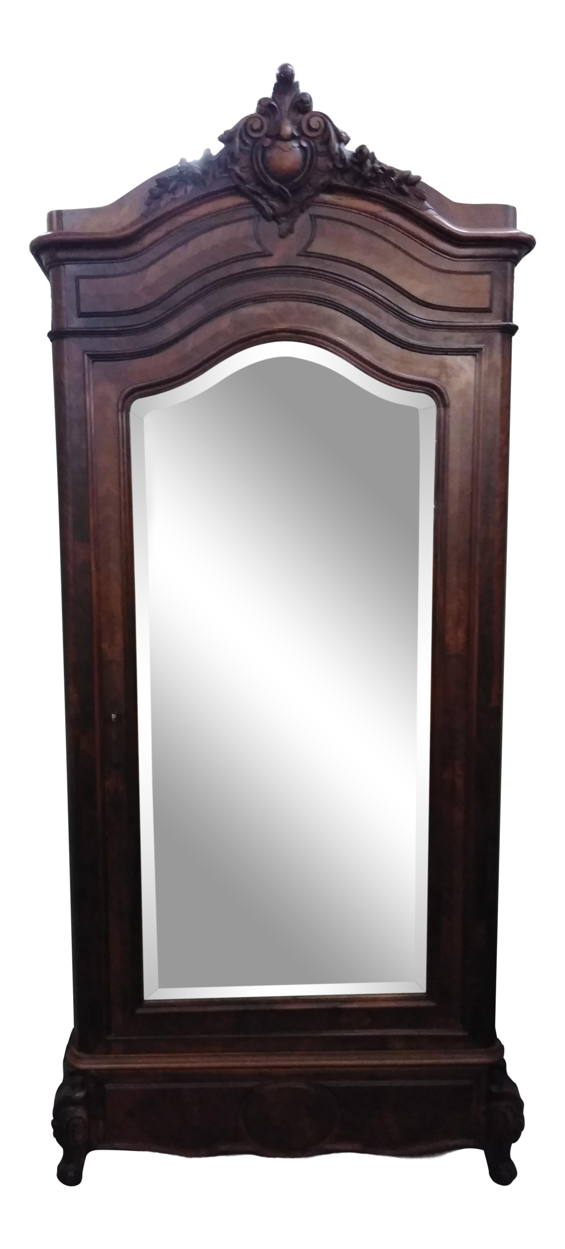 Antique single door armoire with beveled mirror, & drawer, the door opens to reveal four wooden shelves and a drawer inside, ending in cabriole legs.