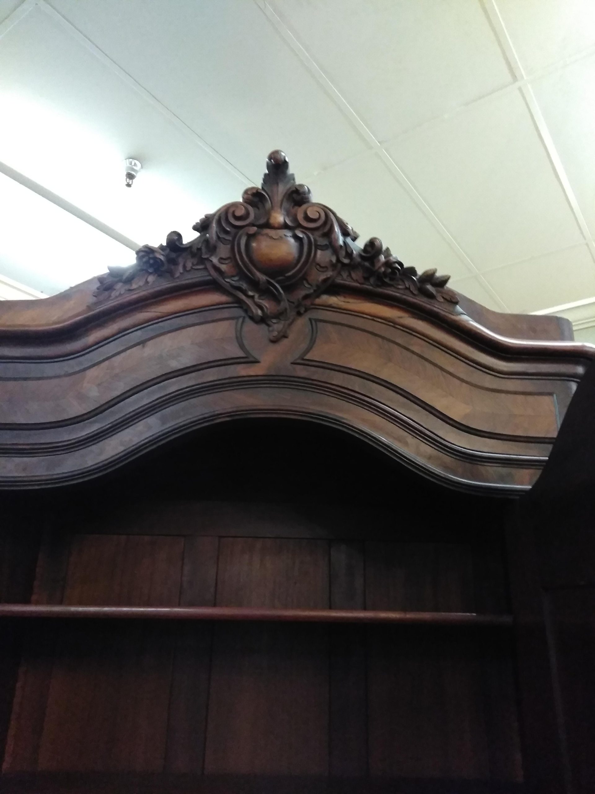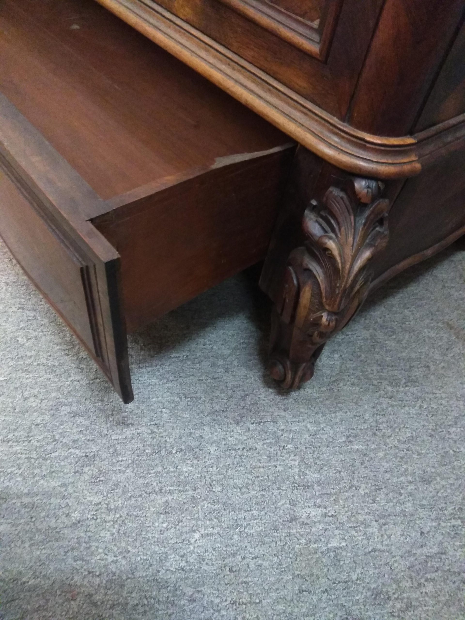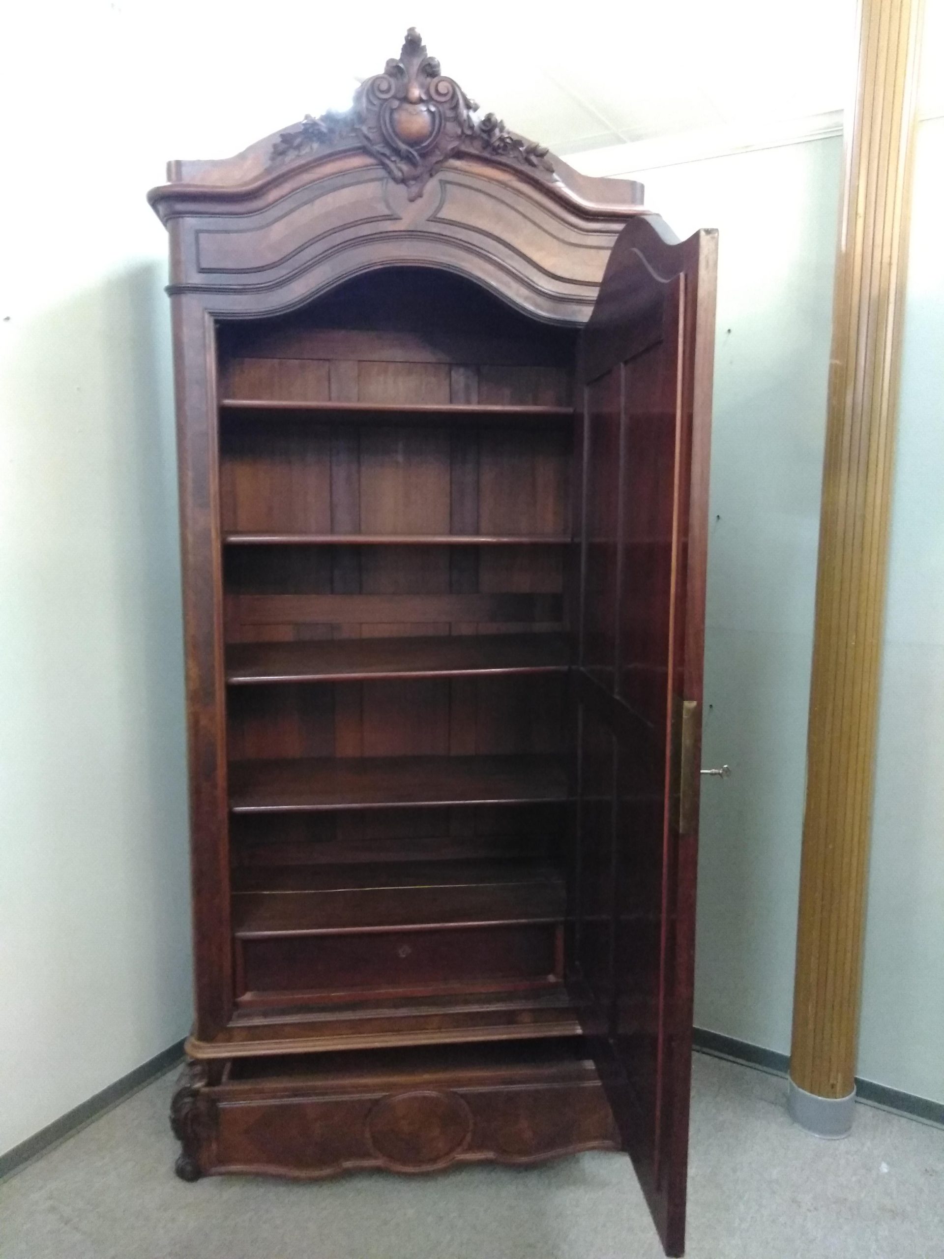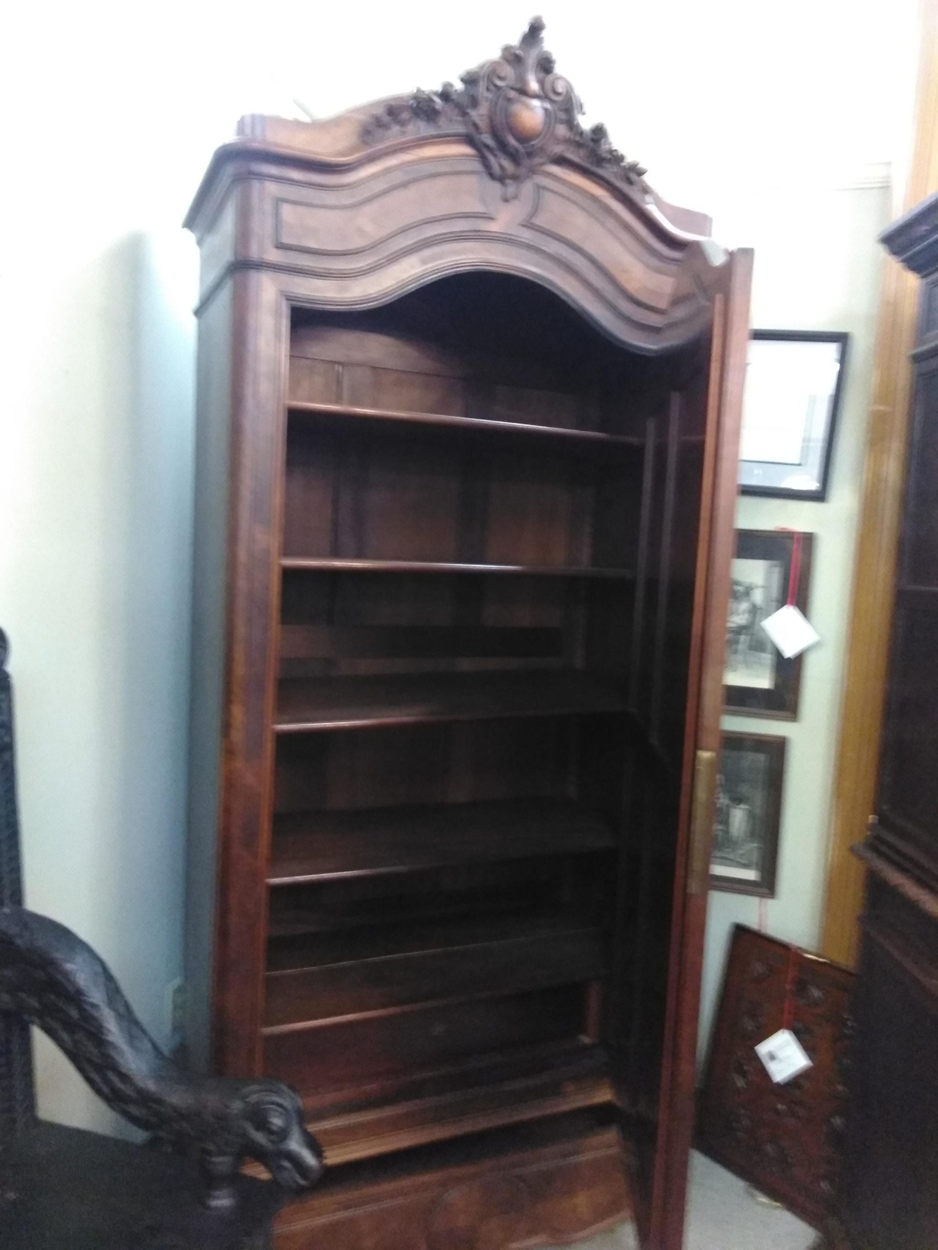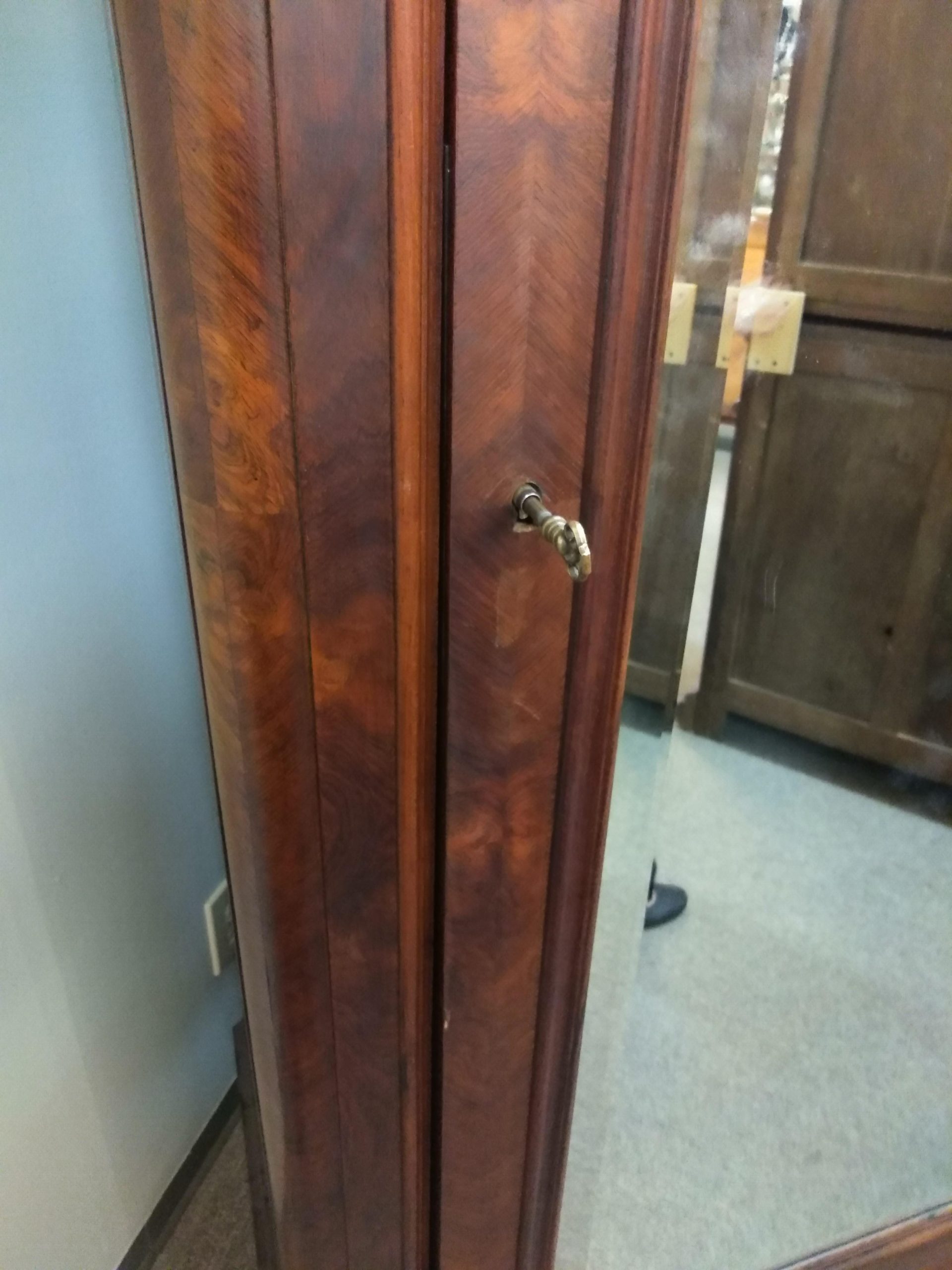 Antique single door armoire with beveled mirror, & drawer, the door opens to reveal four wooden shelves and a drawer inside, ending in cabriole legs.