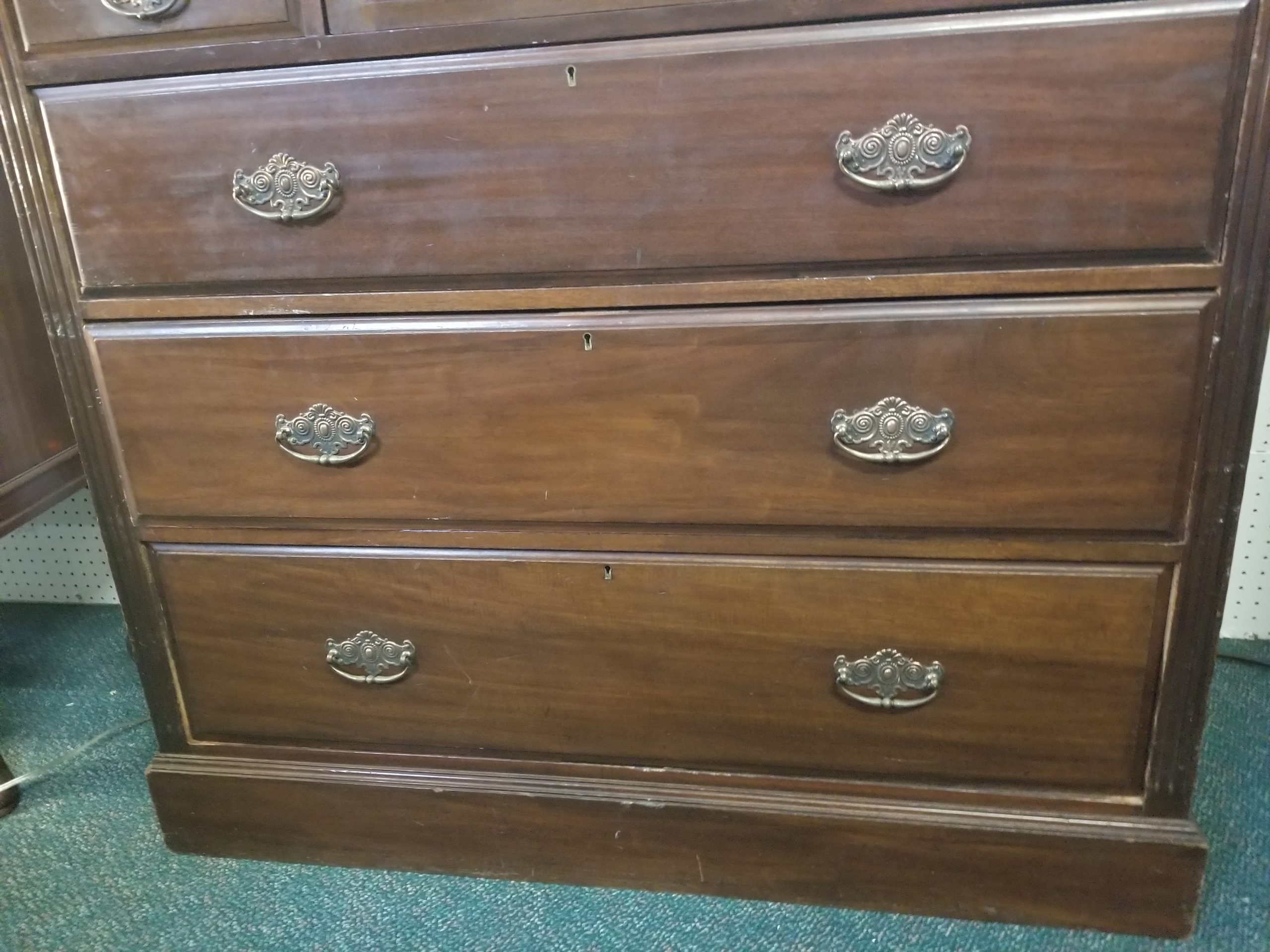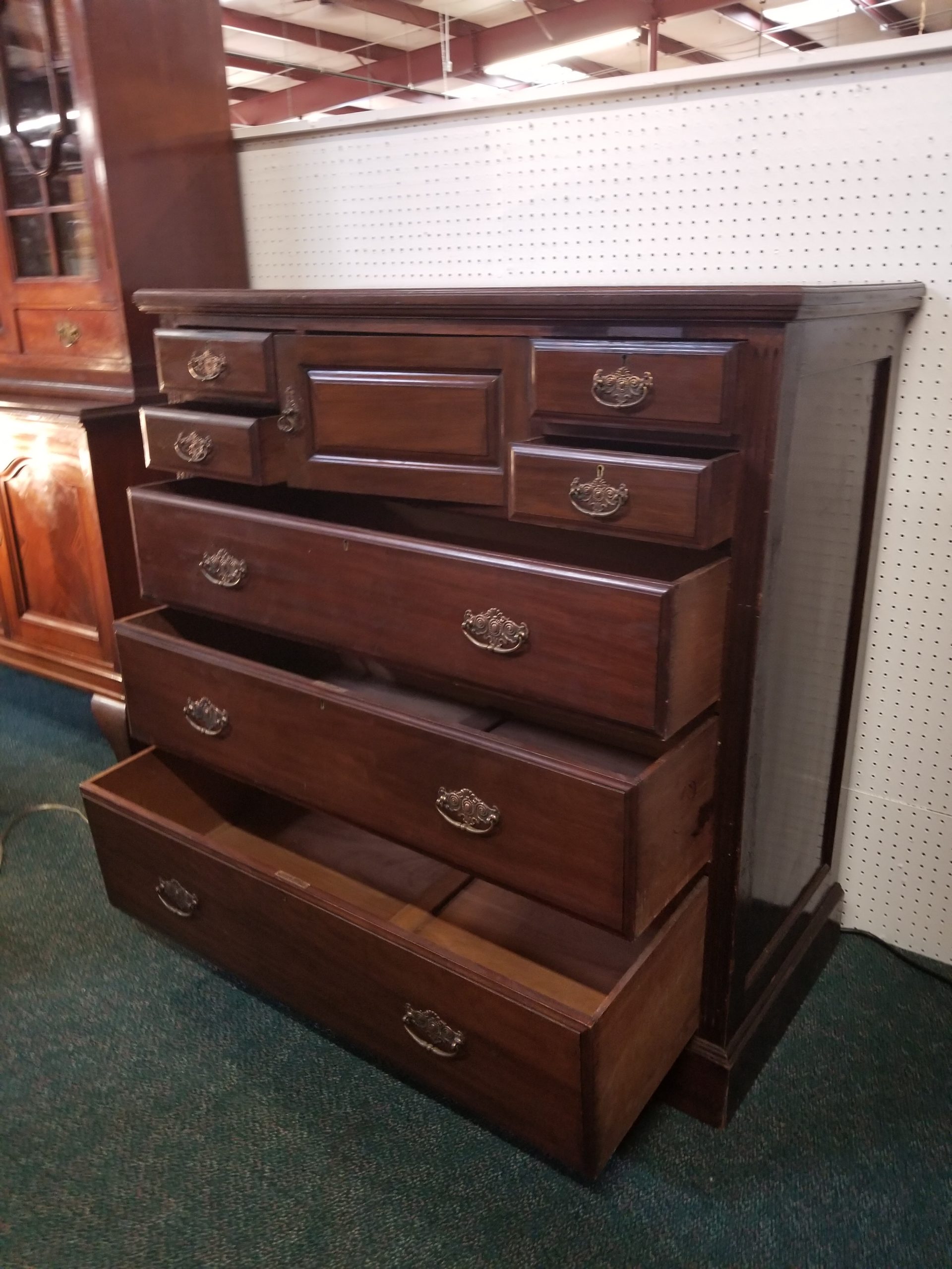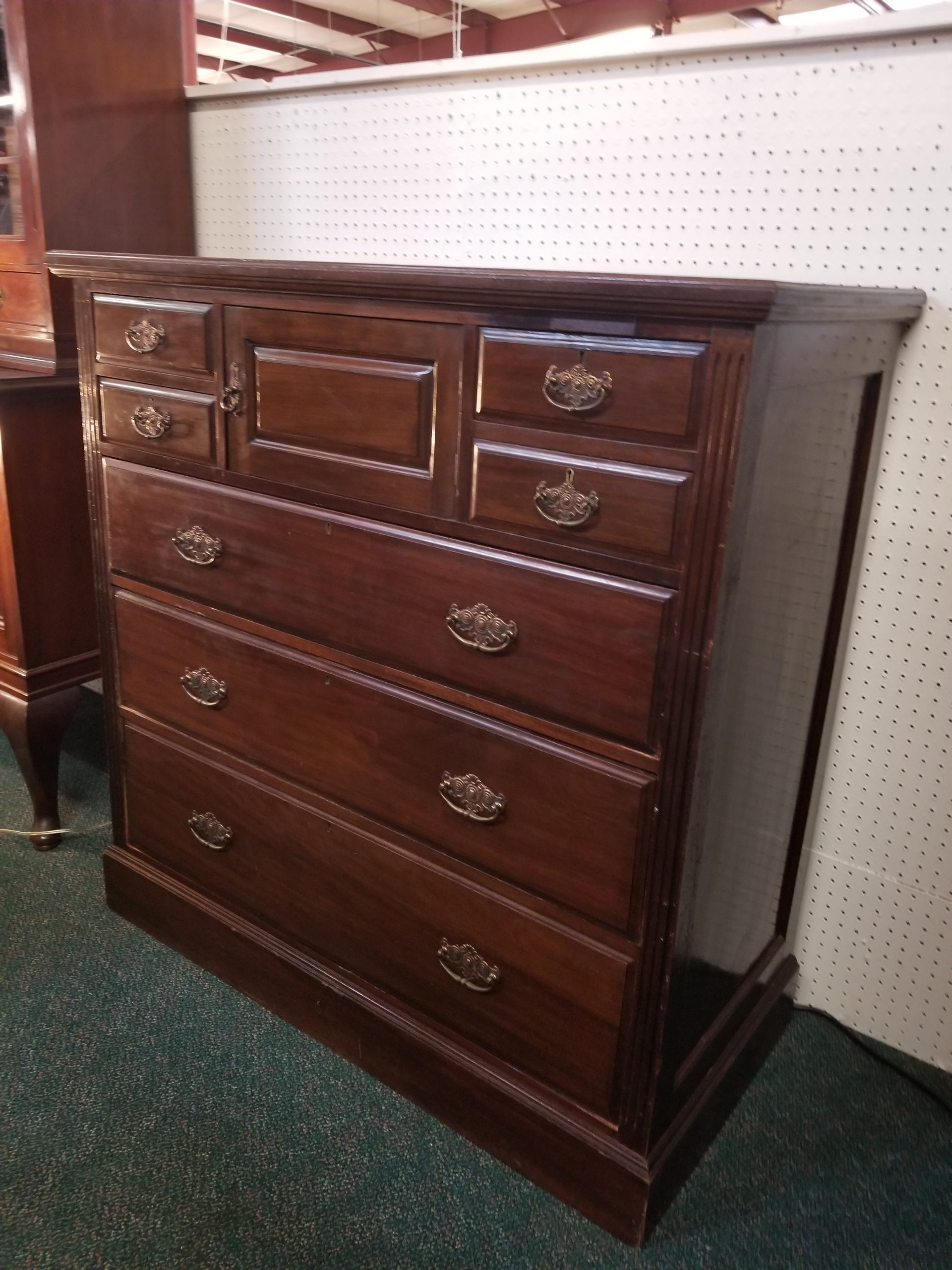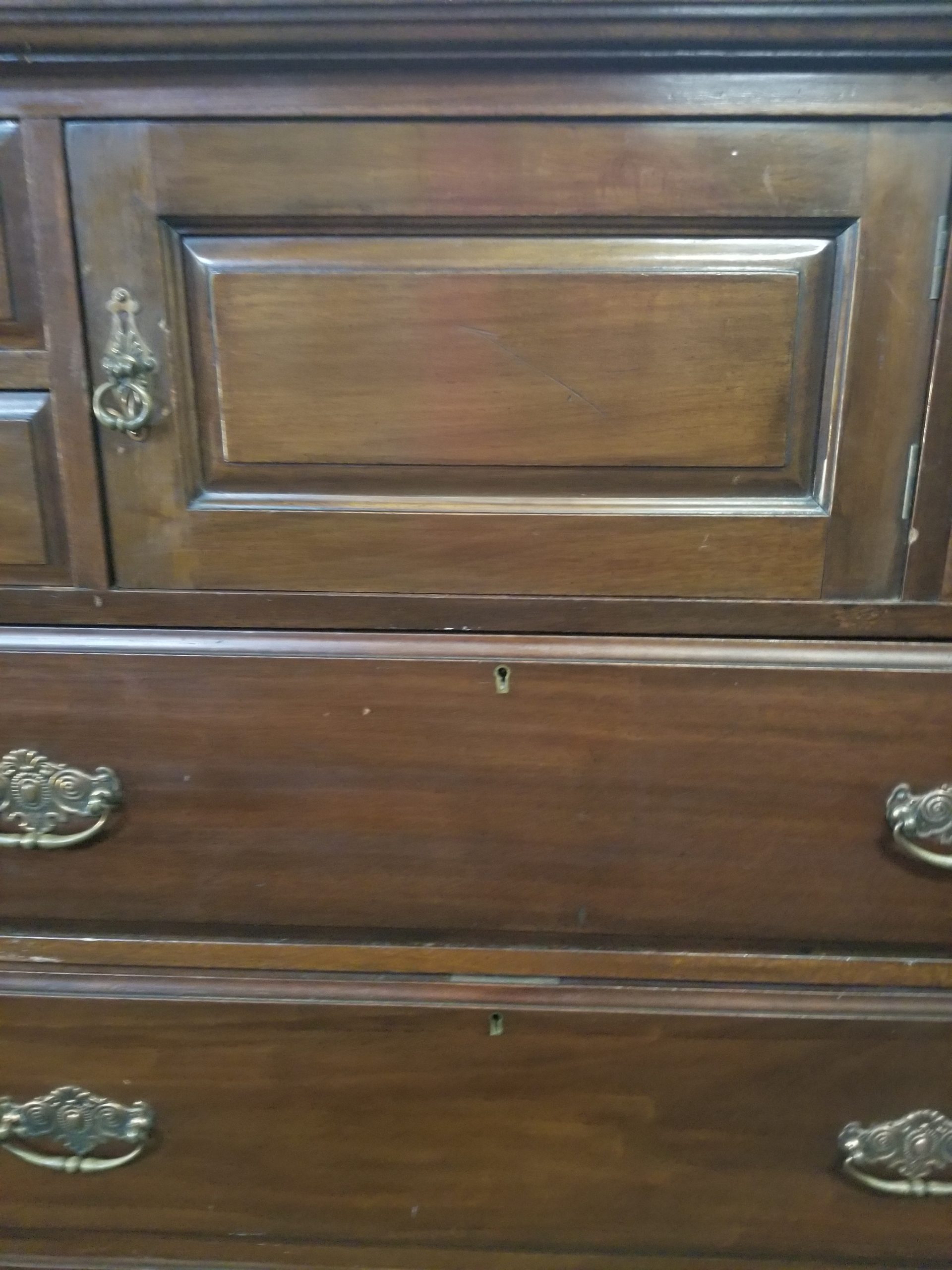 Antique 19th century mahogany chest of drawers, it has a central door and it’s flanked by four small drawers over three drawers.