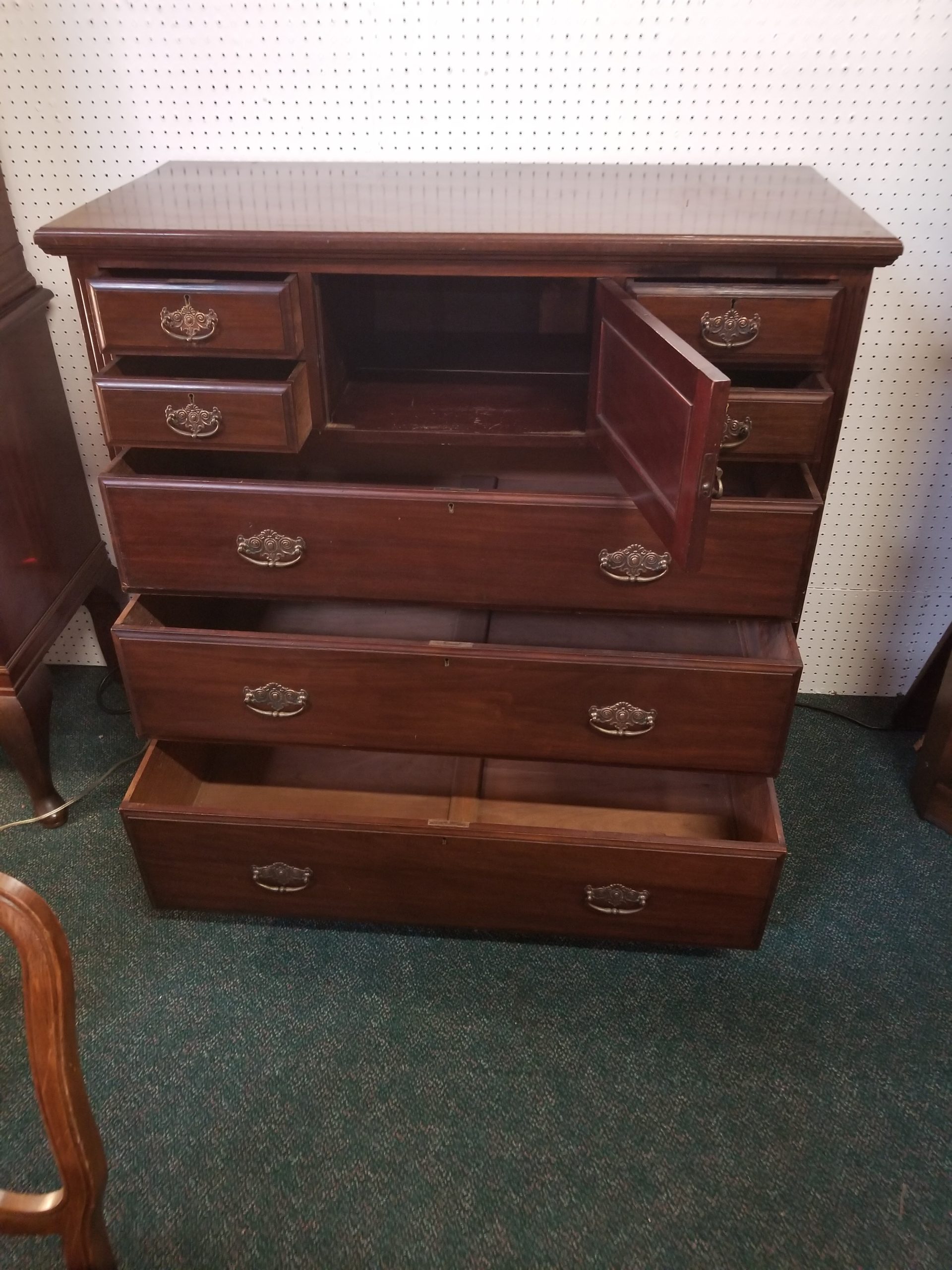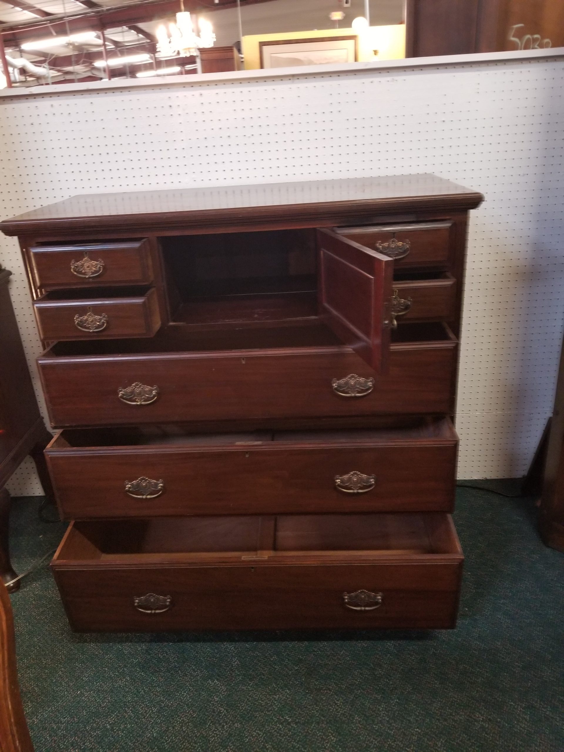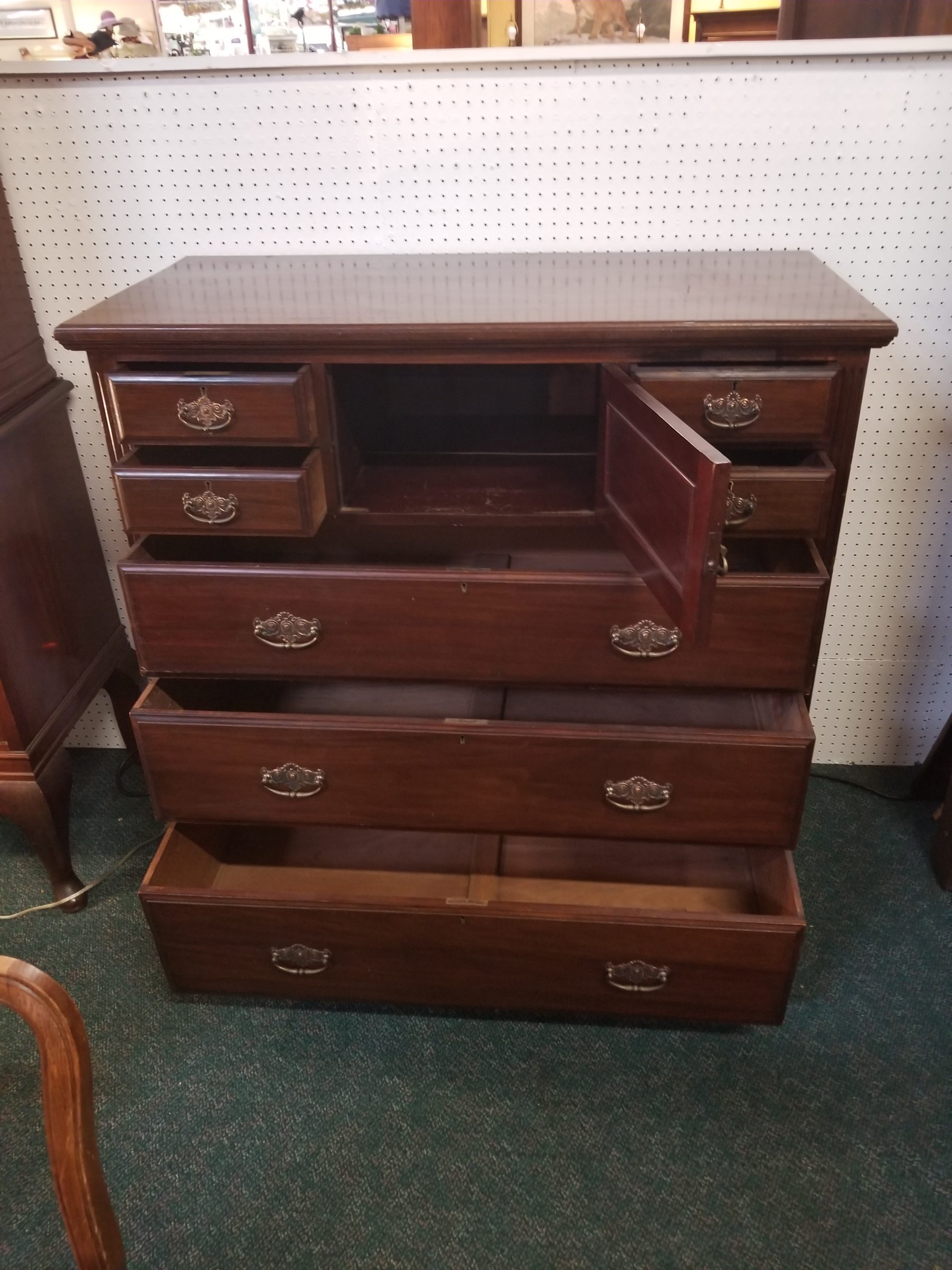 Antique 19th century mahogany chest of drawers, it has a central door and it’s flanked by four small drawers over three drawers.