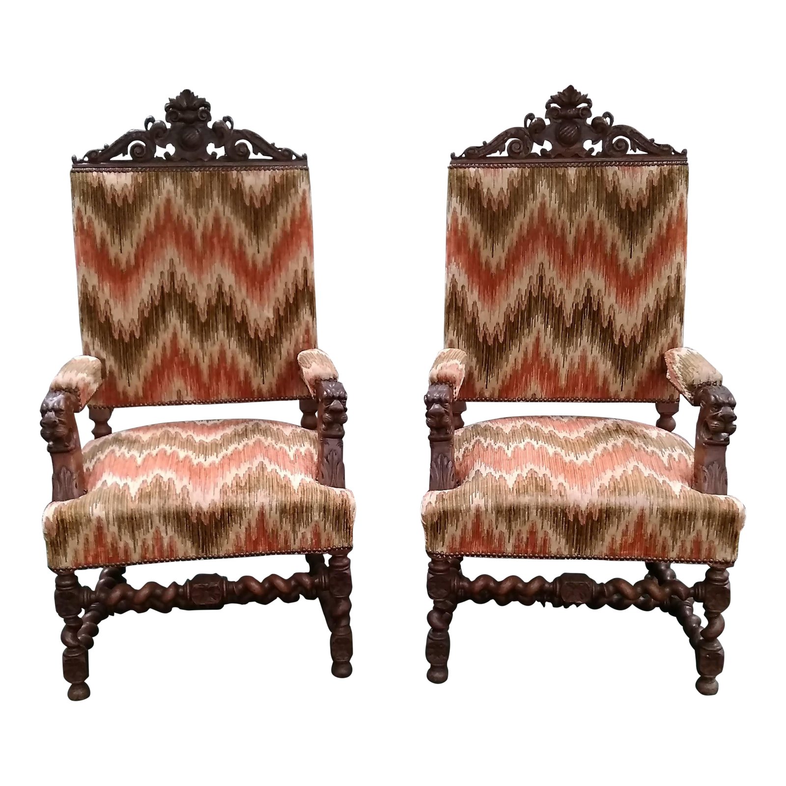 Pair of intricately carved Antique (19th Century) Oak Barley Twist Hunt Armchairs
