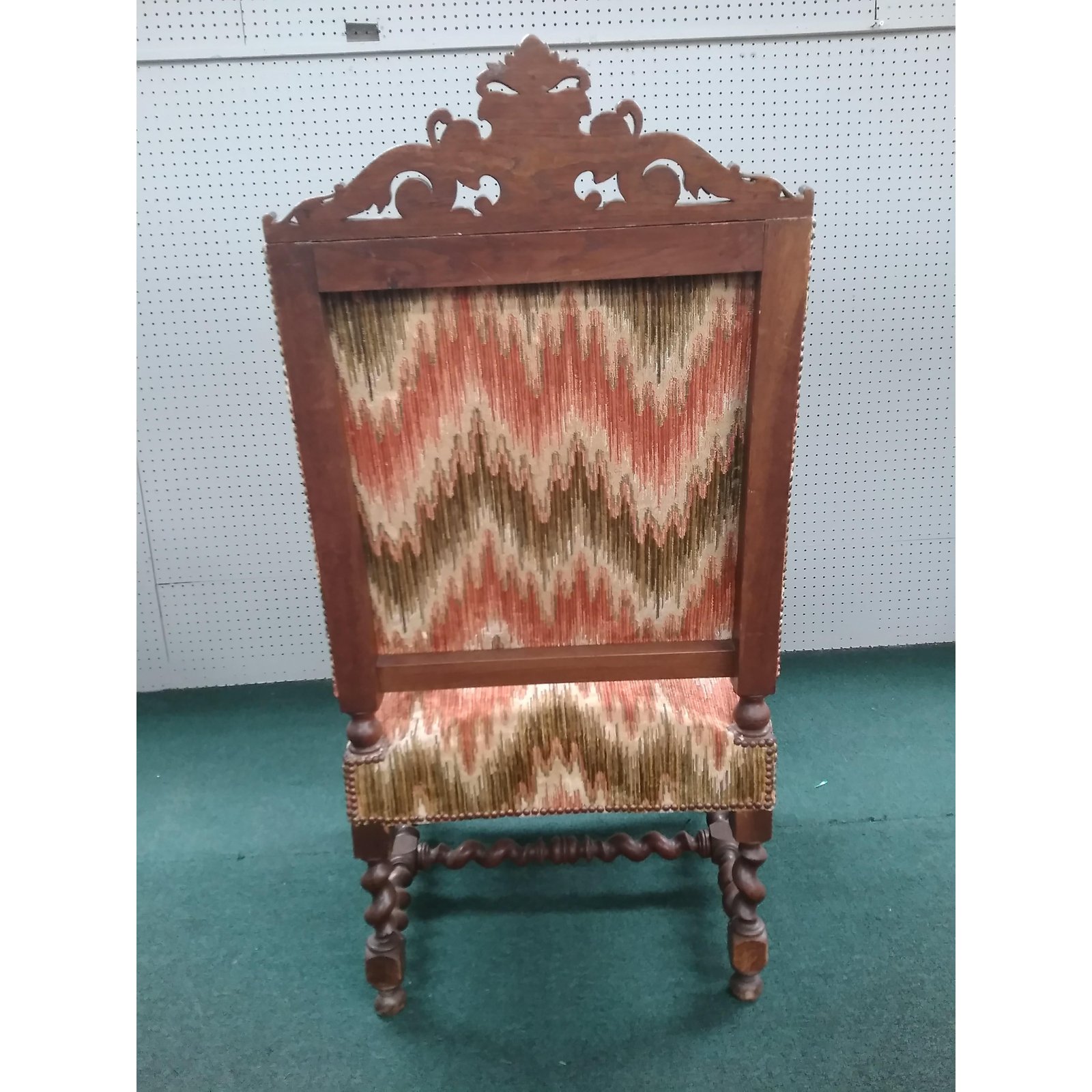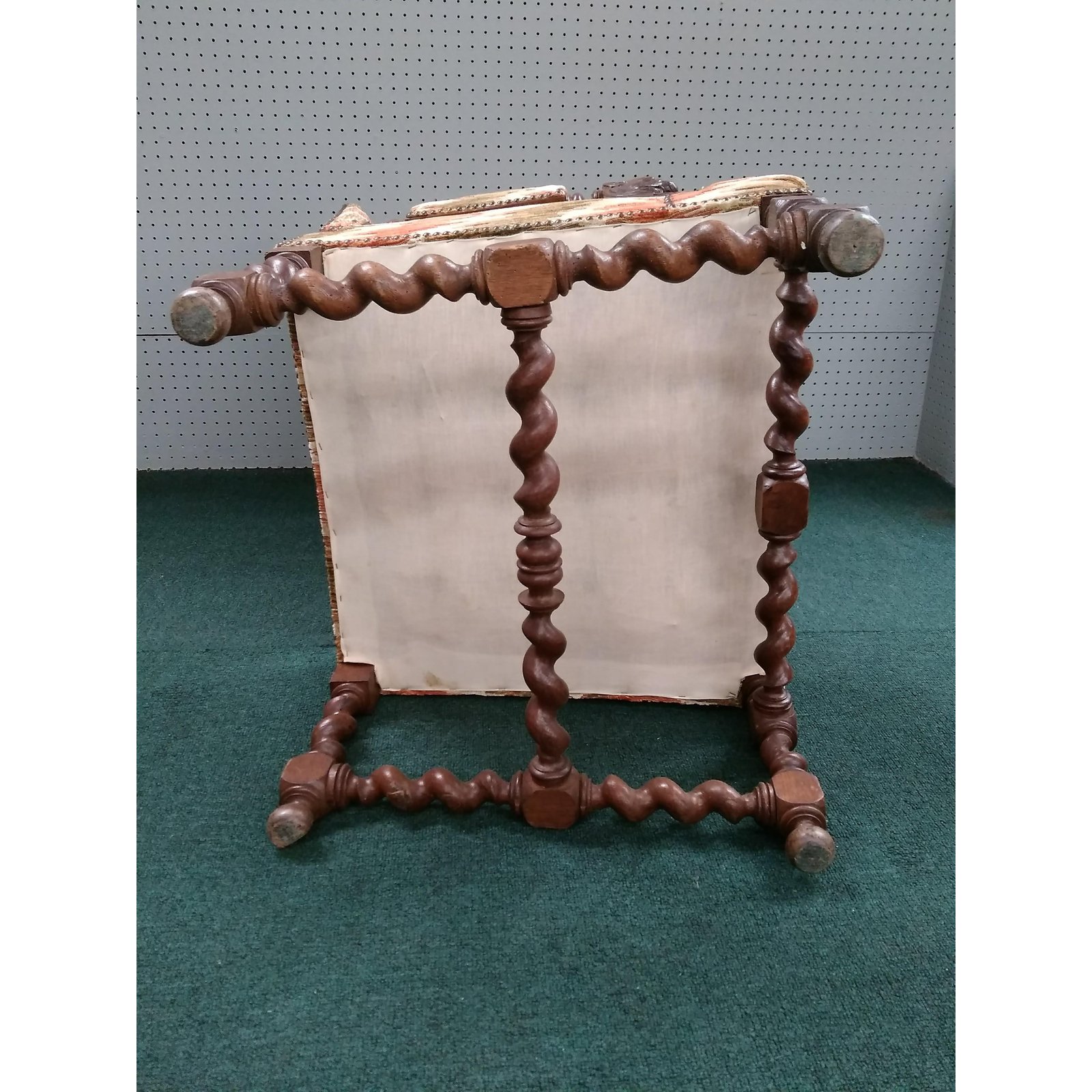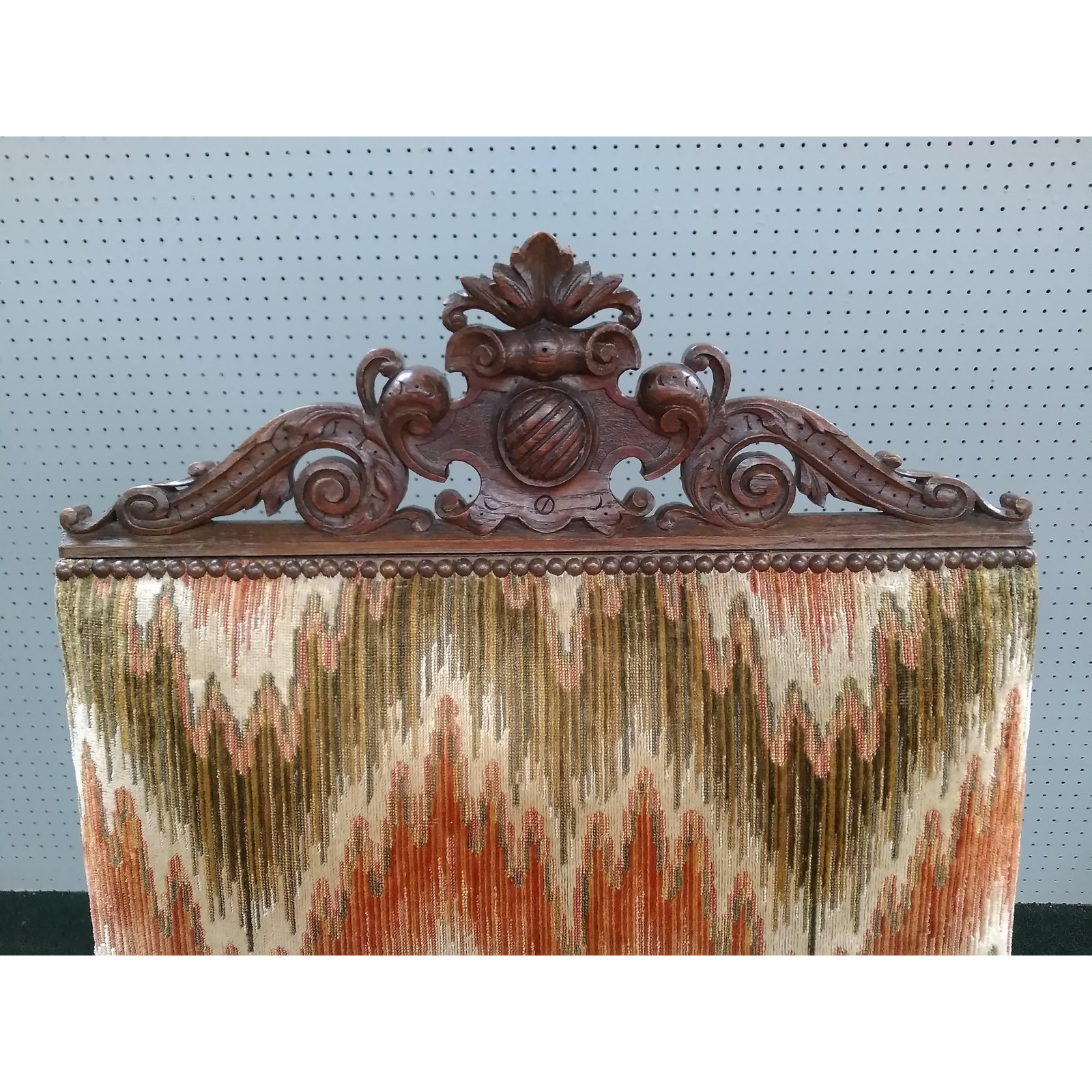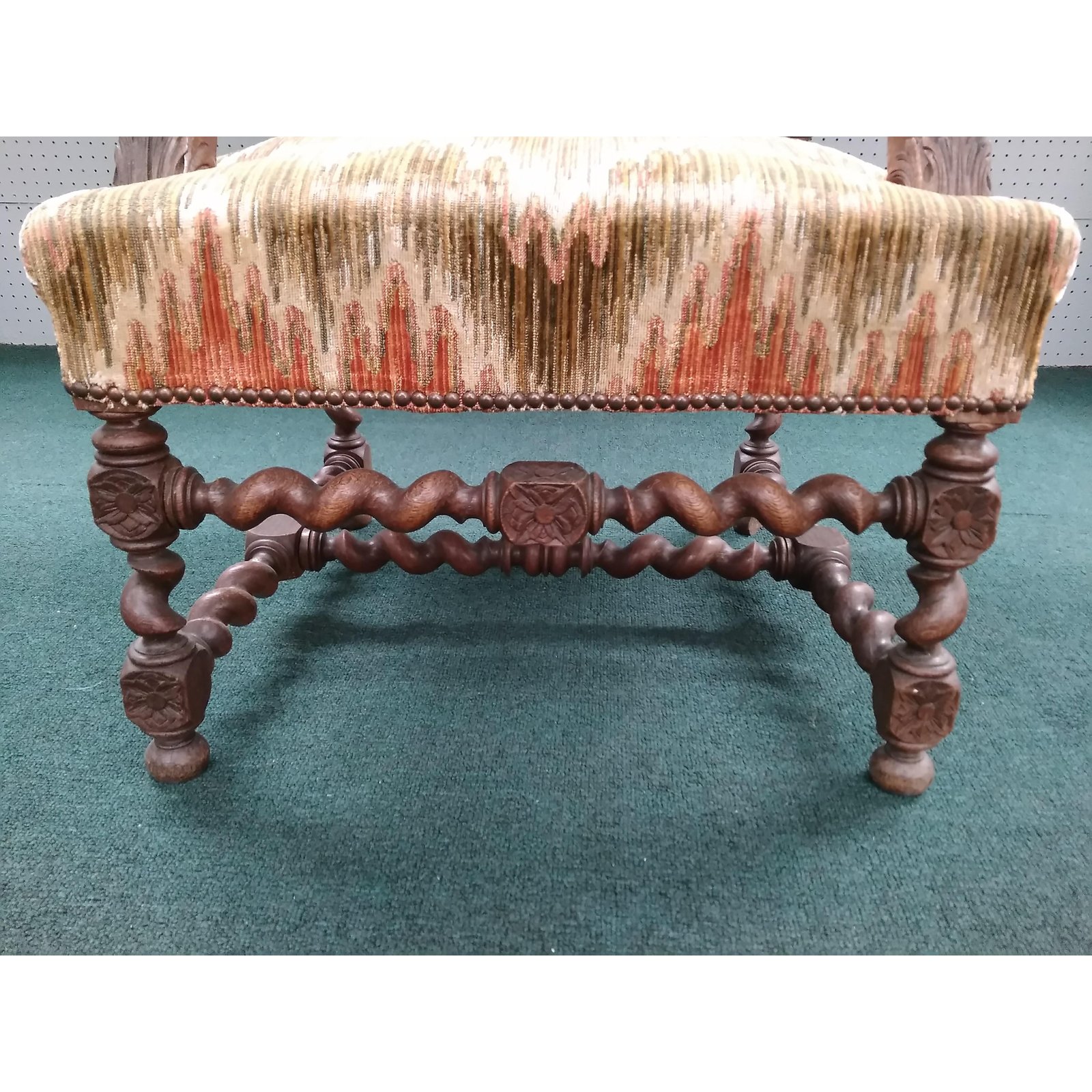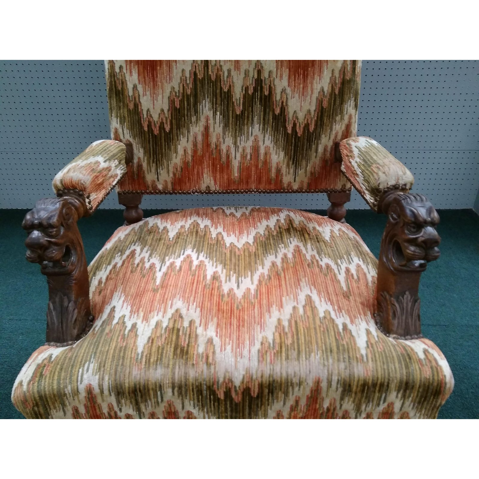 Flanked by griffins and upholstered in a flame stitch velvet.