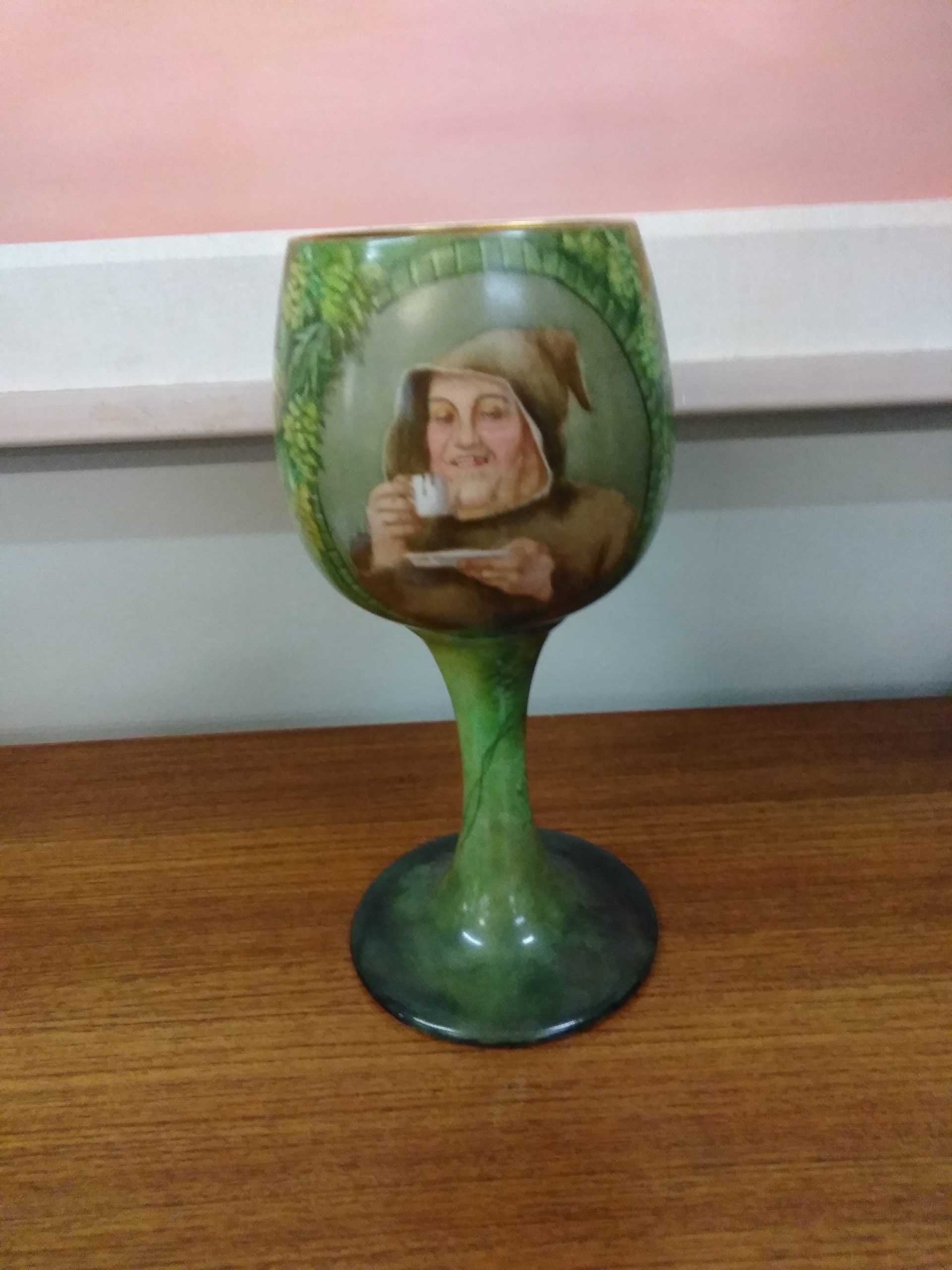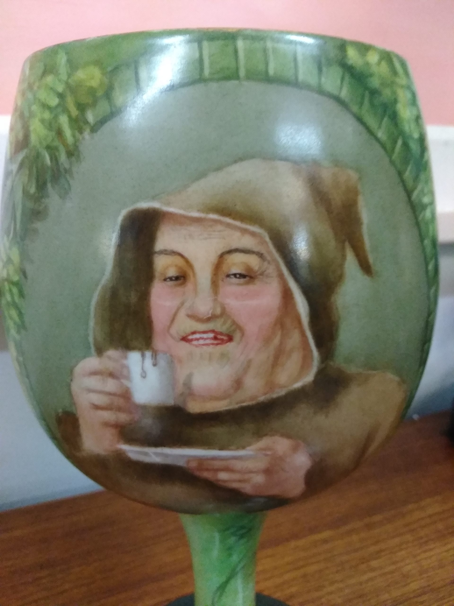 Monk drinking from cup, green tones.