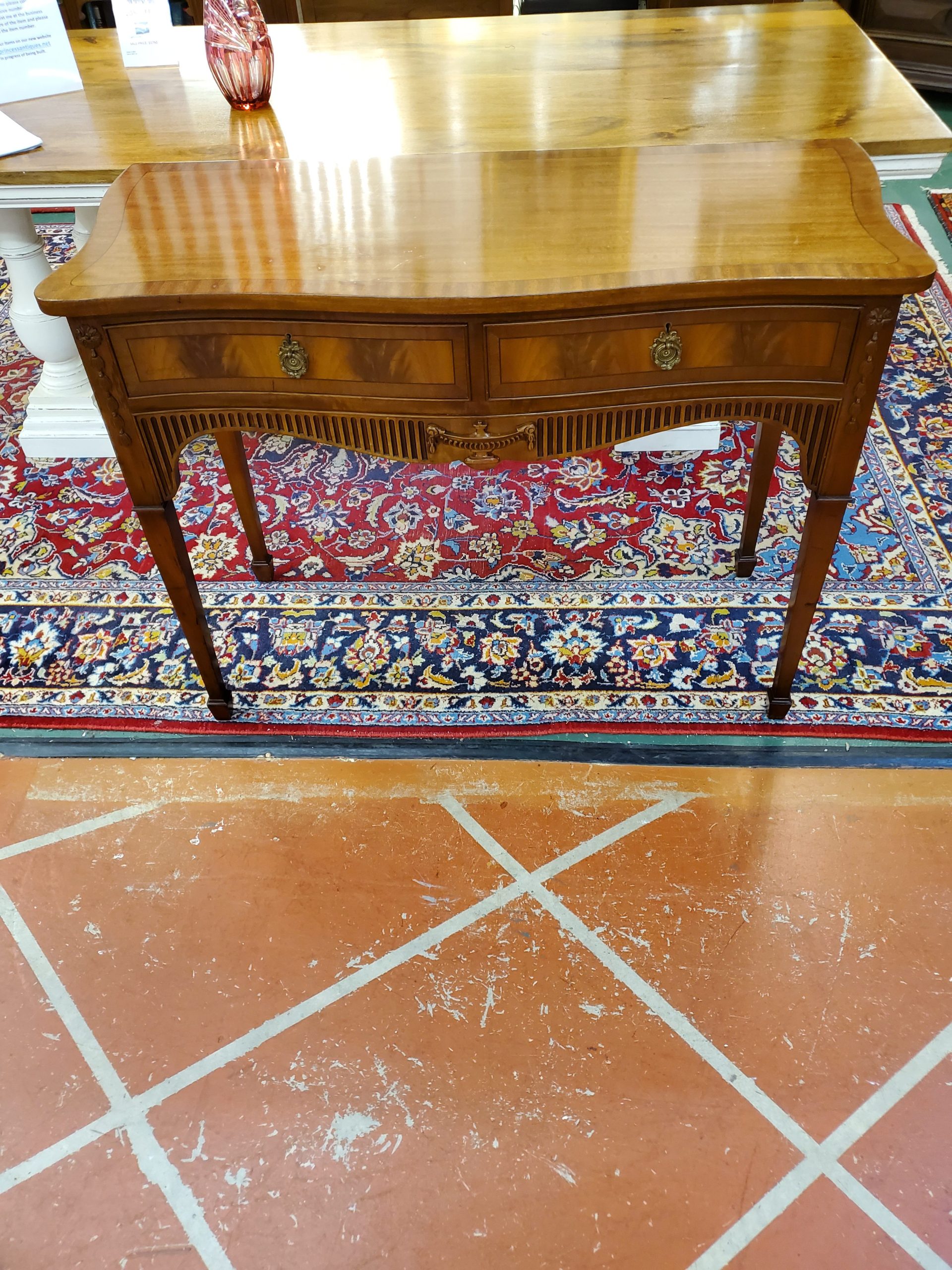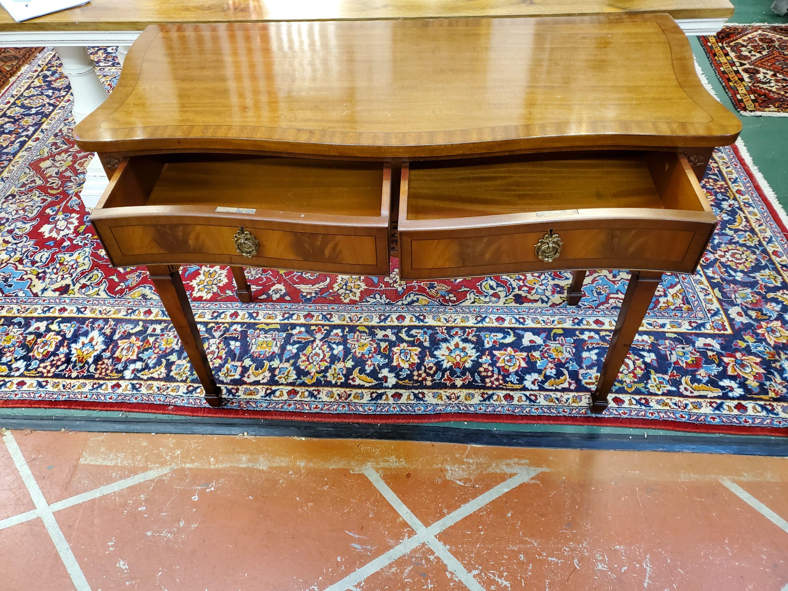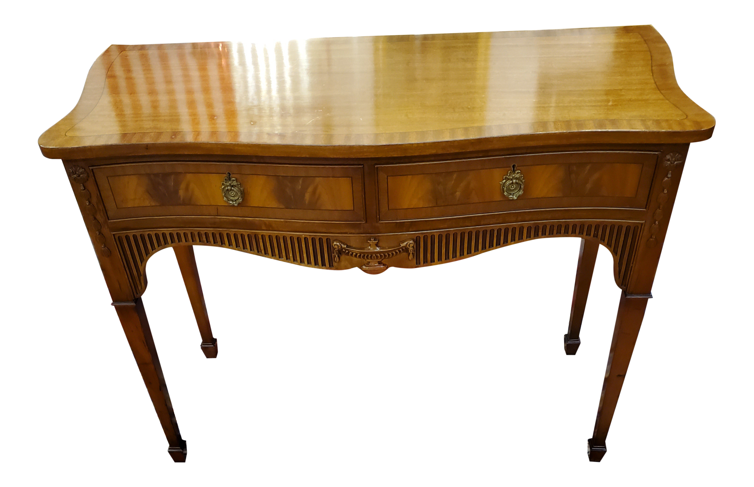 George III style serpentine fronted mahogany two drawer console table, circa 1900, in the Adam taste with cross banded top, urn on square tapering legs ending in block feet.