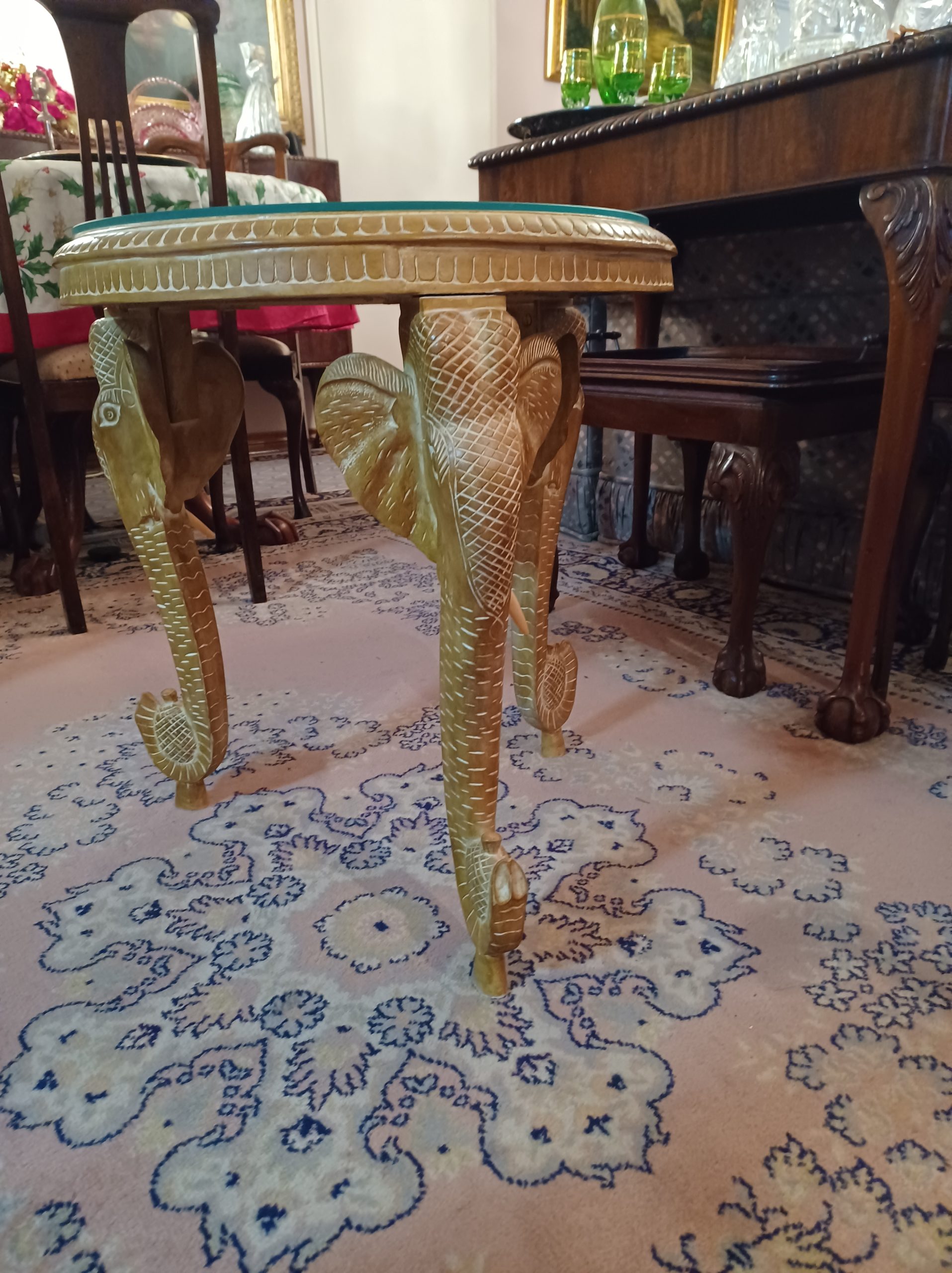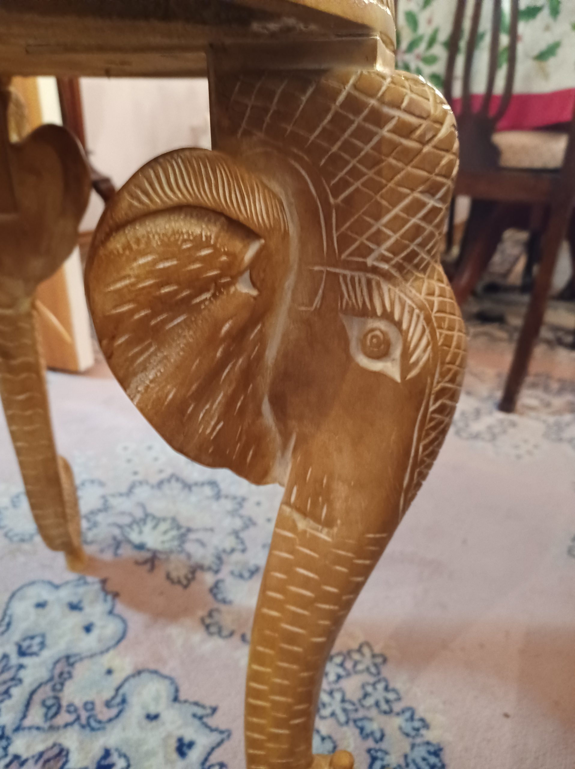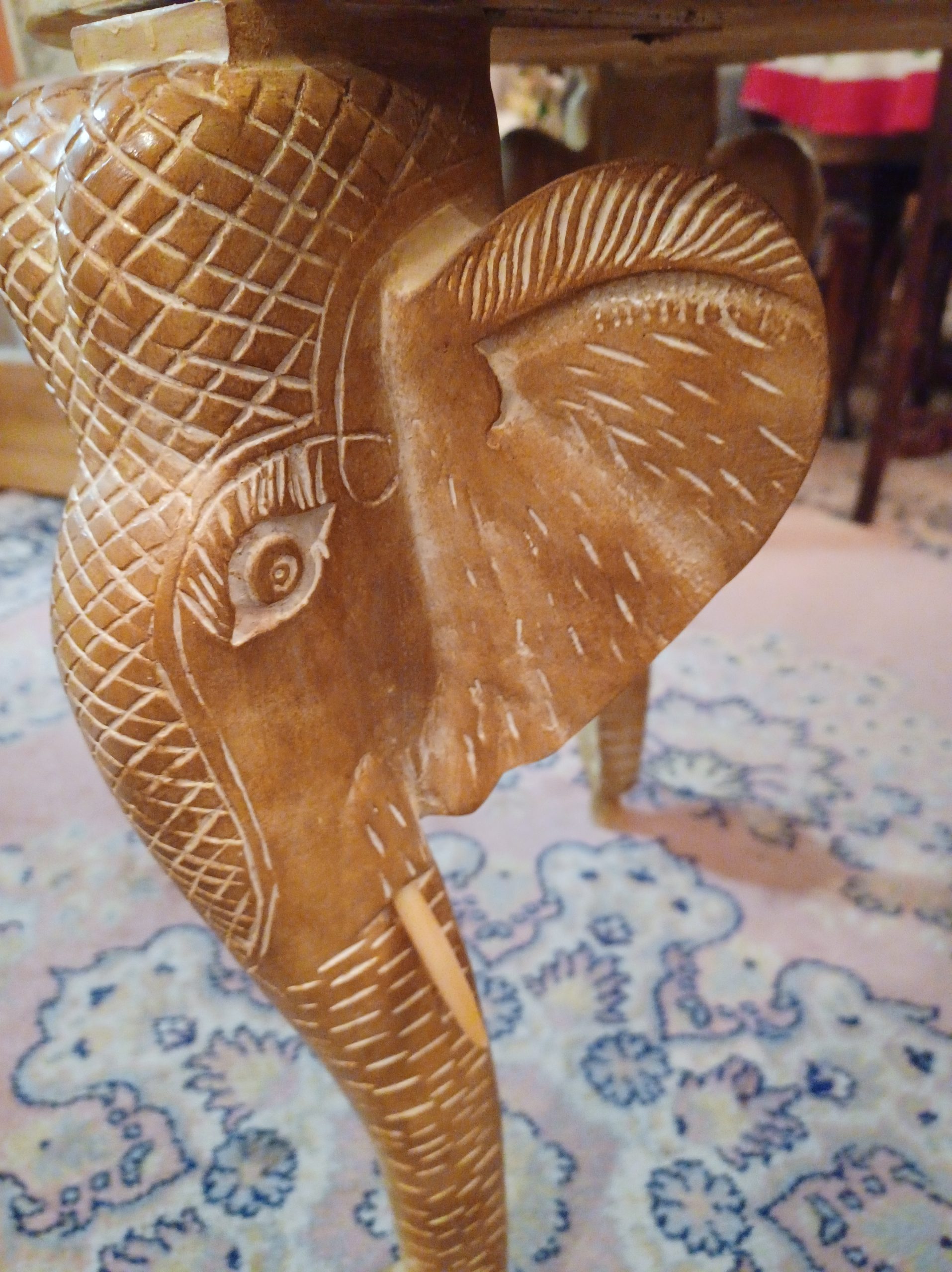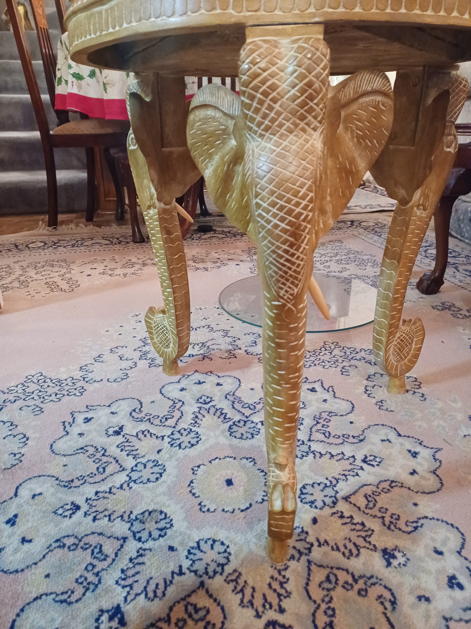 Anglo Indian style teakwood elephant table. Having a heavily carved round top featuring a central medallion depicting an elephant, surrounded by leaves, flowers, and small elephants, on outer rim having leaves all around. Standing on three legs of carved elephant heads and trunks with carved wood for the faux ivory. It has a removeable glass top. From the mid 20th century.