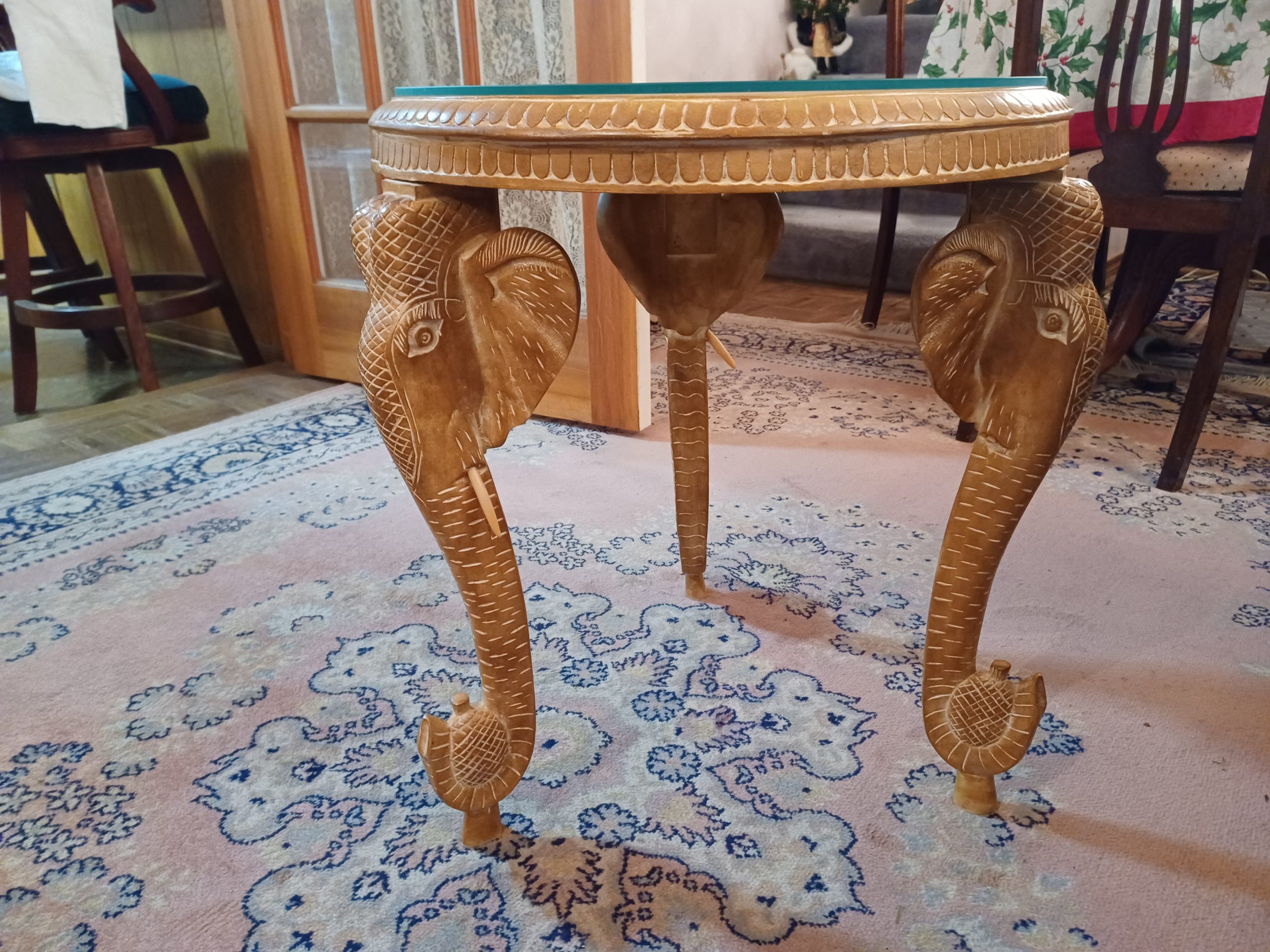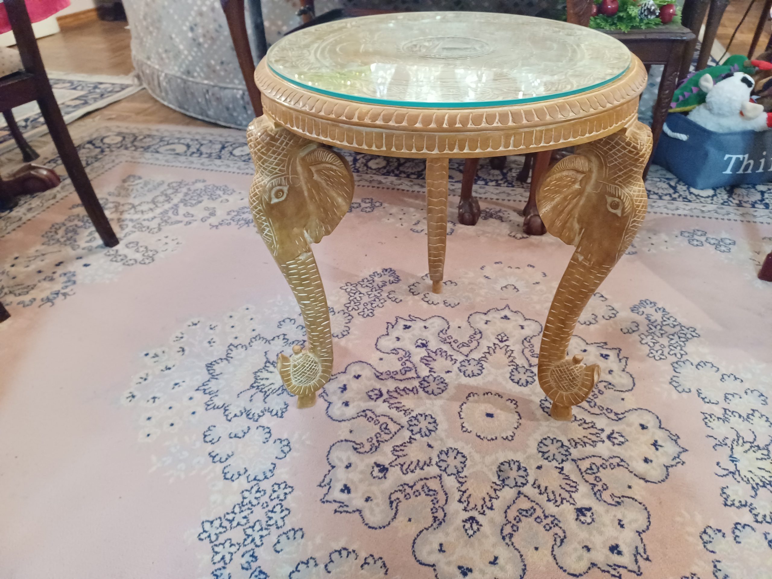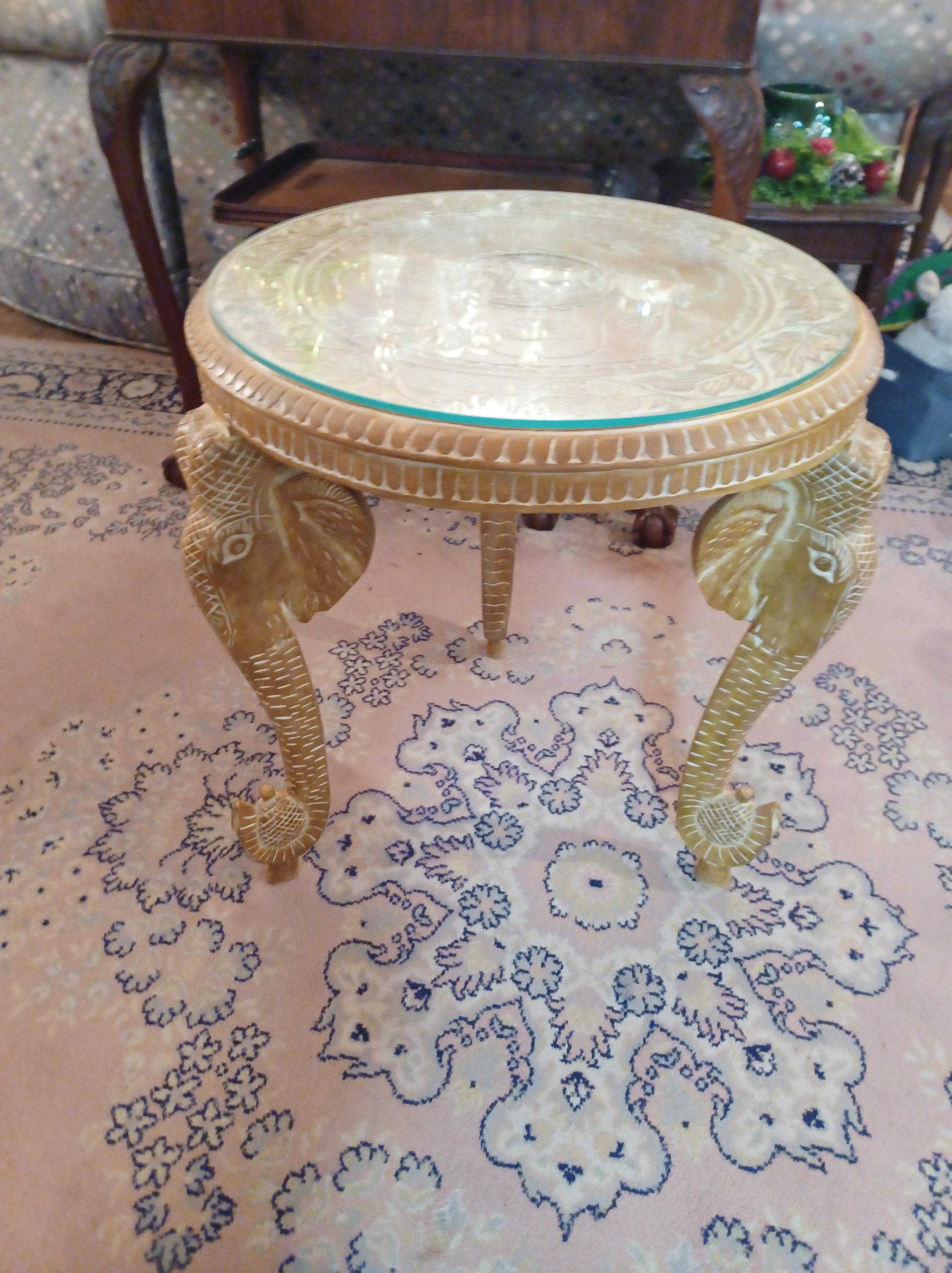Anglo Indian style teakwood elephant table. Having a heavily carved round top featuring a central medallion depicting an elephant, surrounded by leaves, flowers, and small elephants, on outer rim having leaves all around. Standing on three legs of carved elephant heads and trunks with carved wood for the faux ivory. It has a removeable glass top. From the mid 20th century.