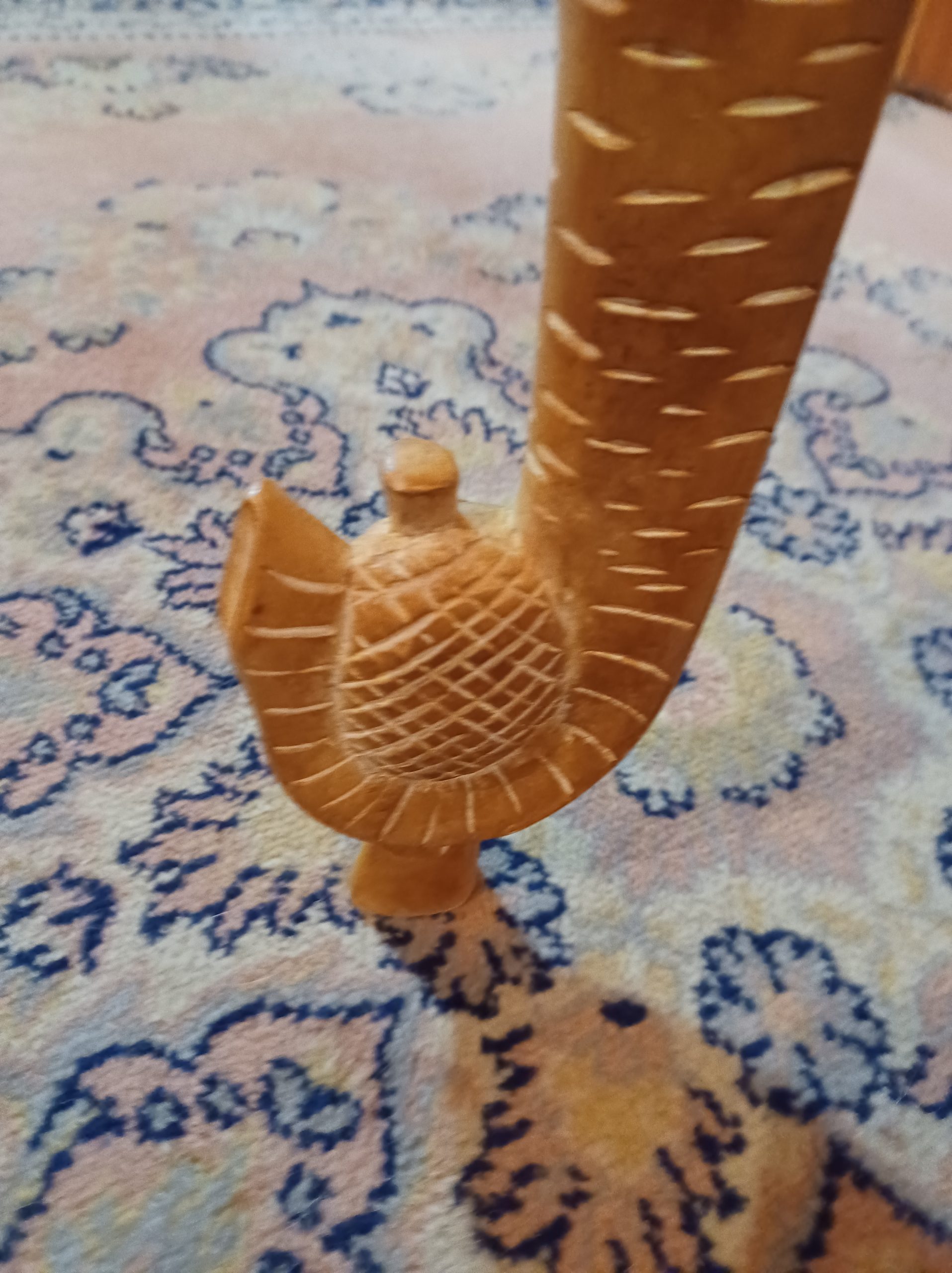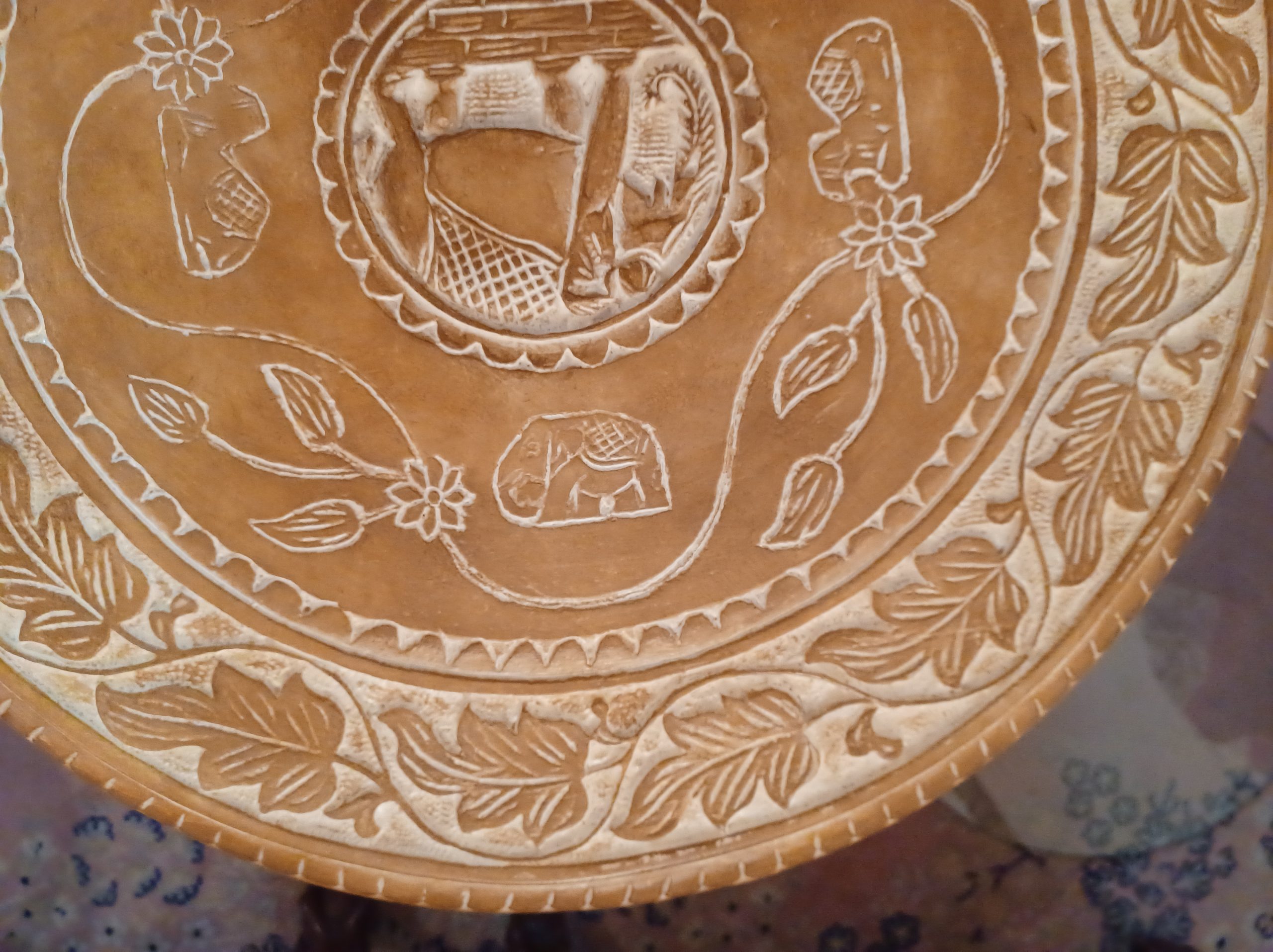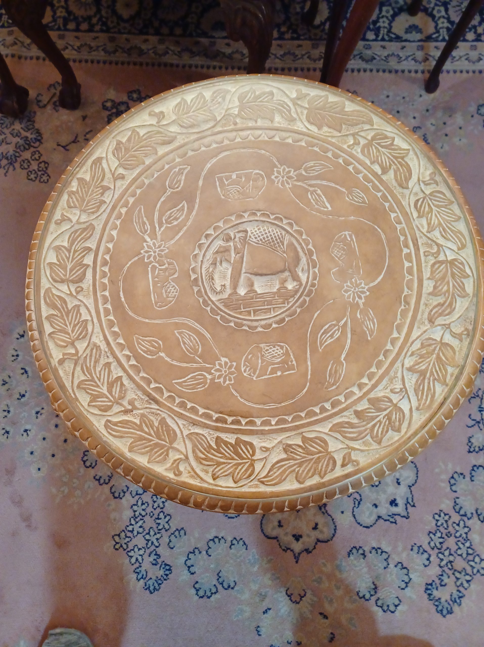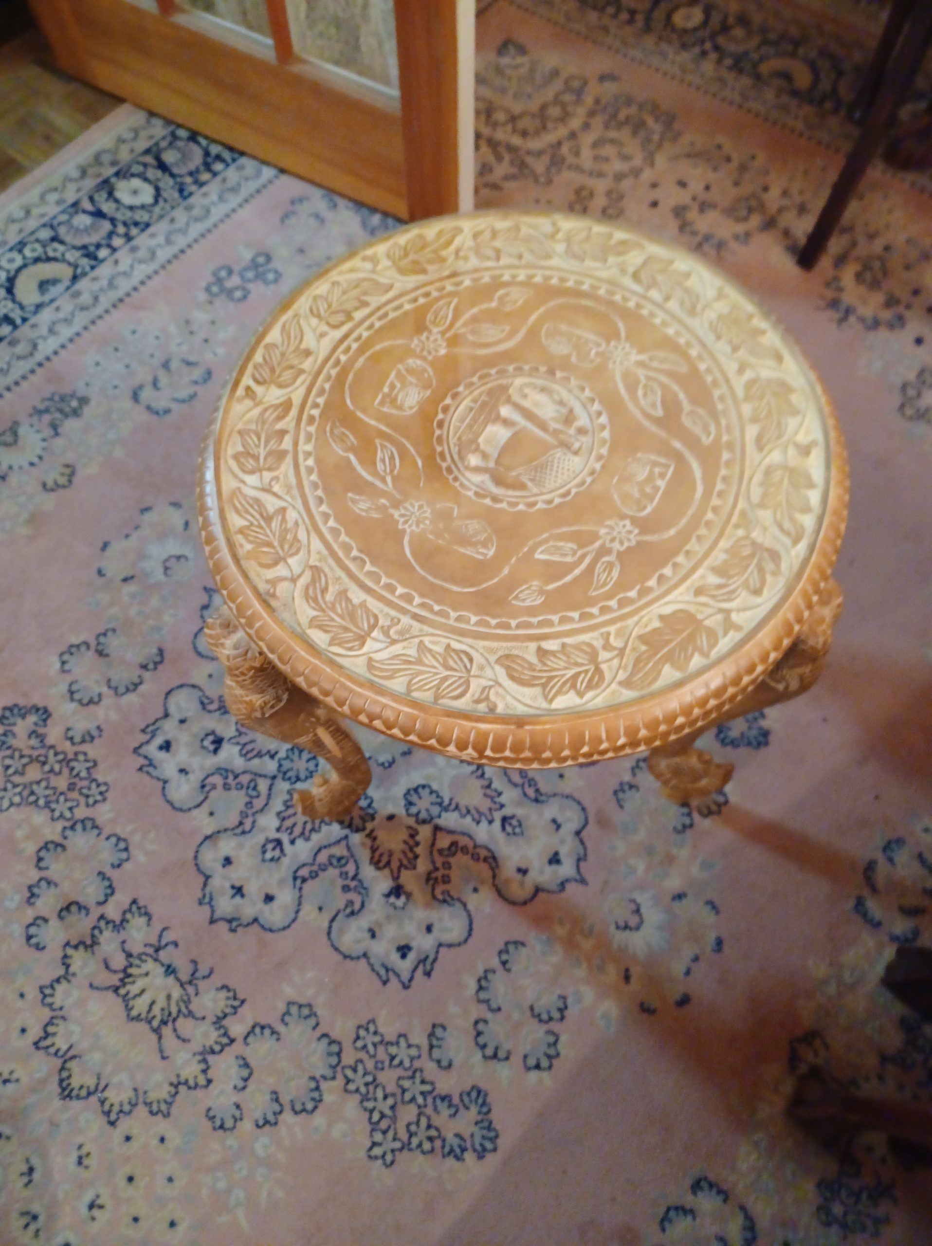 Anglo Indian style teakwood elephant table. Having a heavily carved round top featuring a central medallion depicting an elephant, surrounded by leaves, flowers, and small elephants, on outer rim having leaves all around. Standing on three legs of carved elephant heads and trunks with carved wood for the faux ivory. It has a removeable glass top. From the mid 20th century.