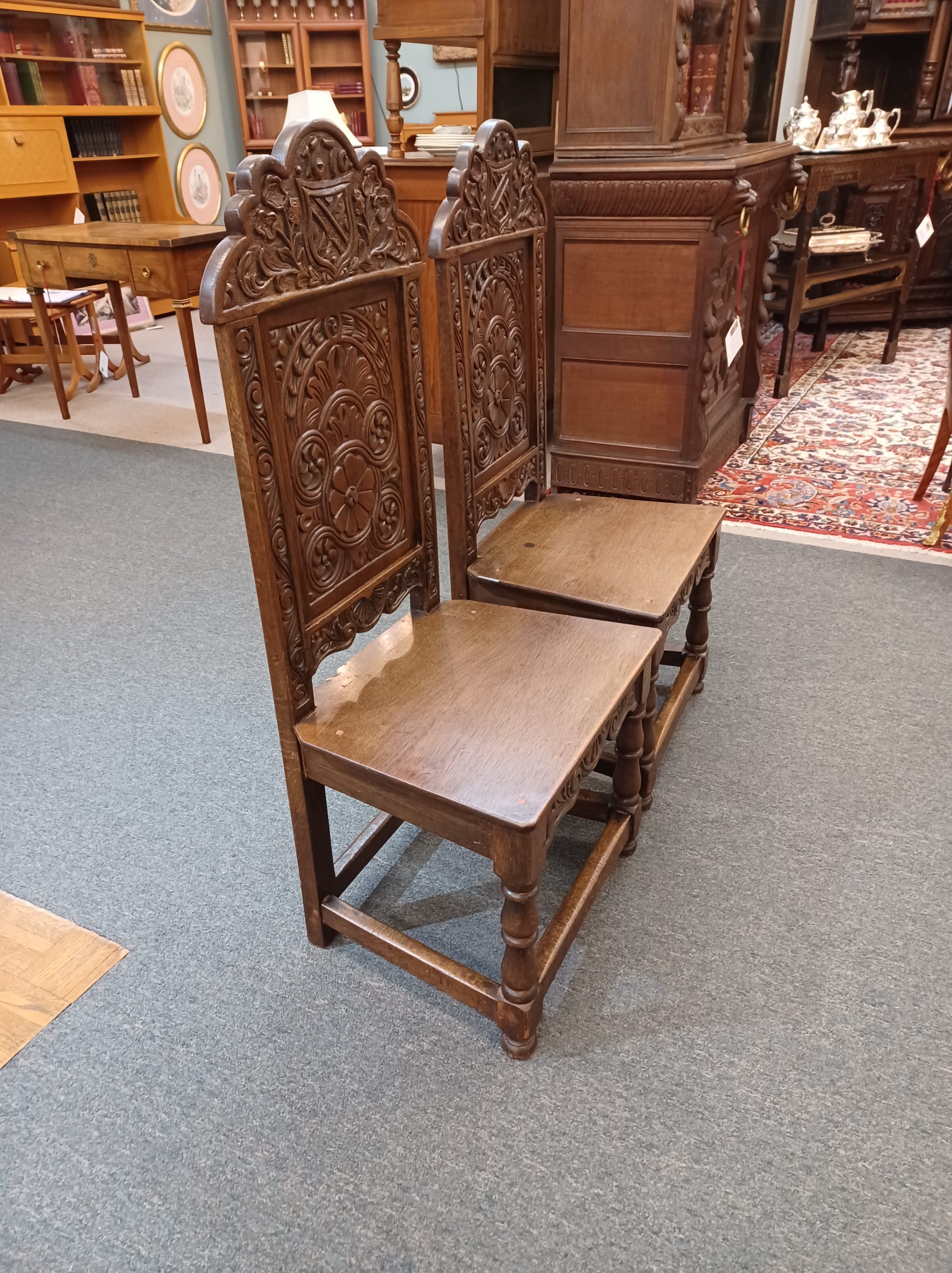 Antique 17th century pair of Scottish hall chairs featuring a heavily carved back, shaped and carved top rail with 1670 carved on it, wide tapered seat section, carved seat apron, turned legs, raised on bun feet and united by box stretcher.