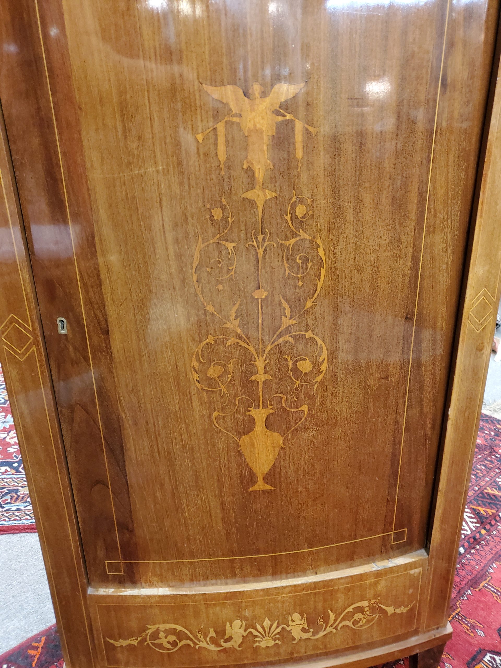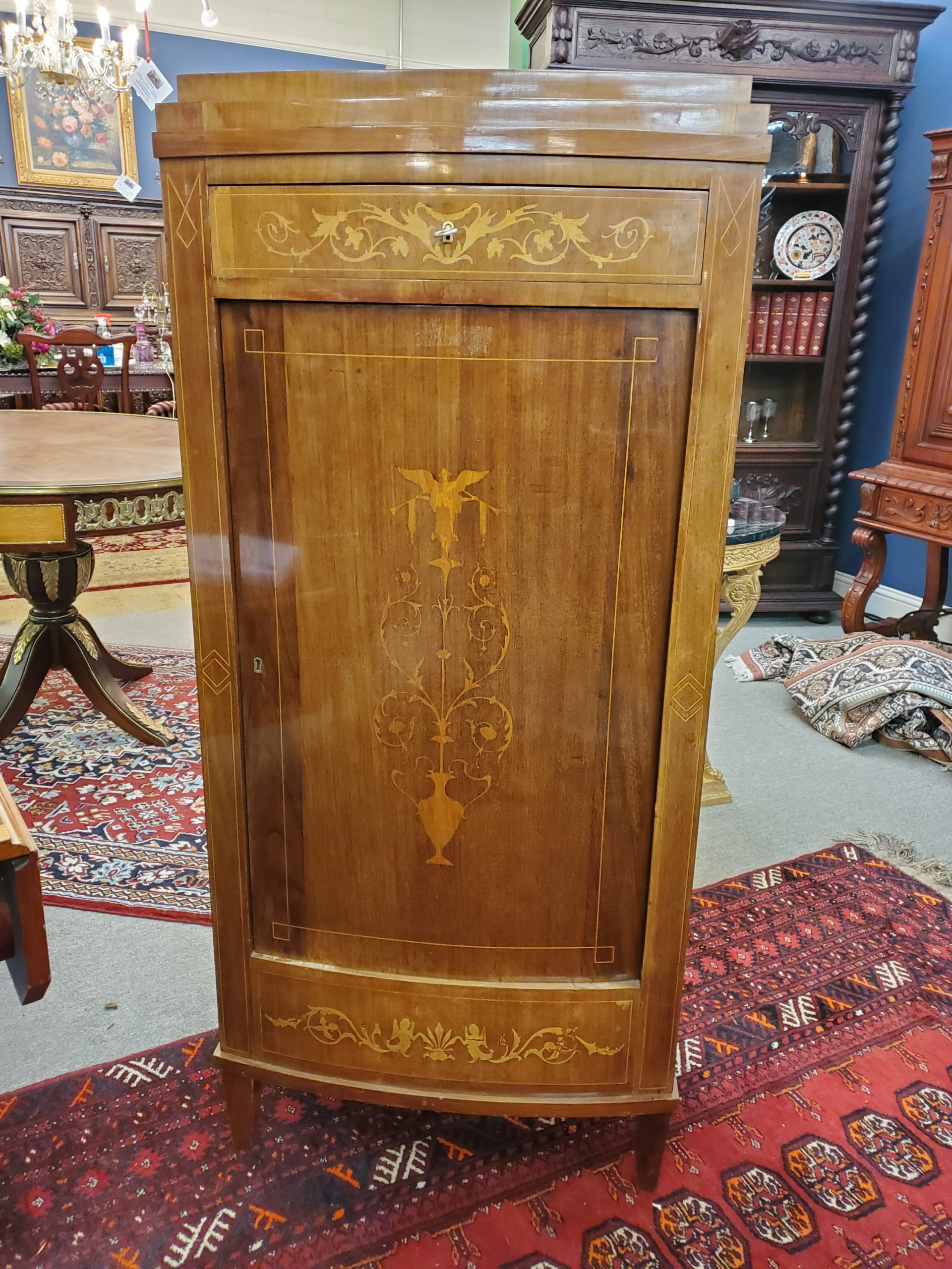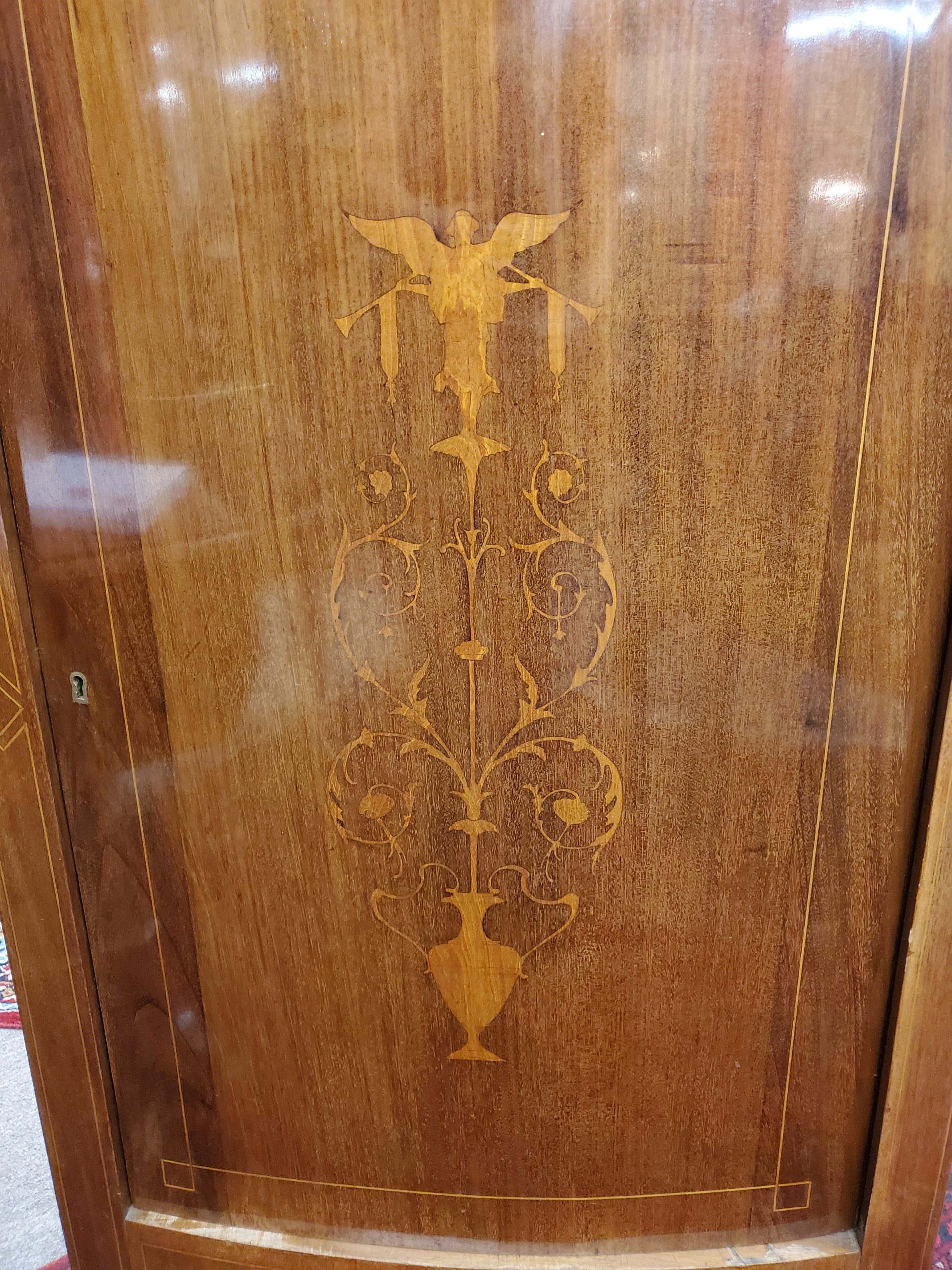 Beautiful antique mahogany cabinet with a single dovetail drawer above a door that opens to reveal three wooden shelves, inlaid on the front depicting vase, flowers, and angels. Circa early 19th century.