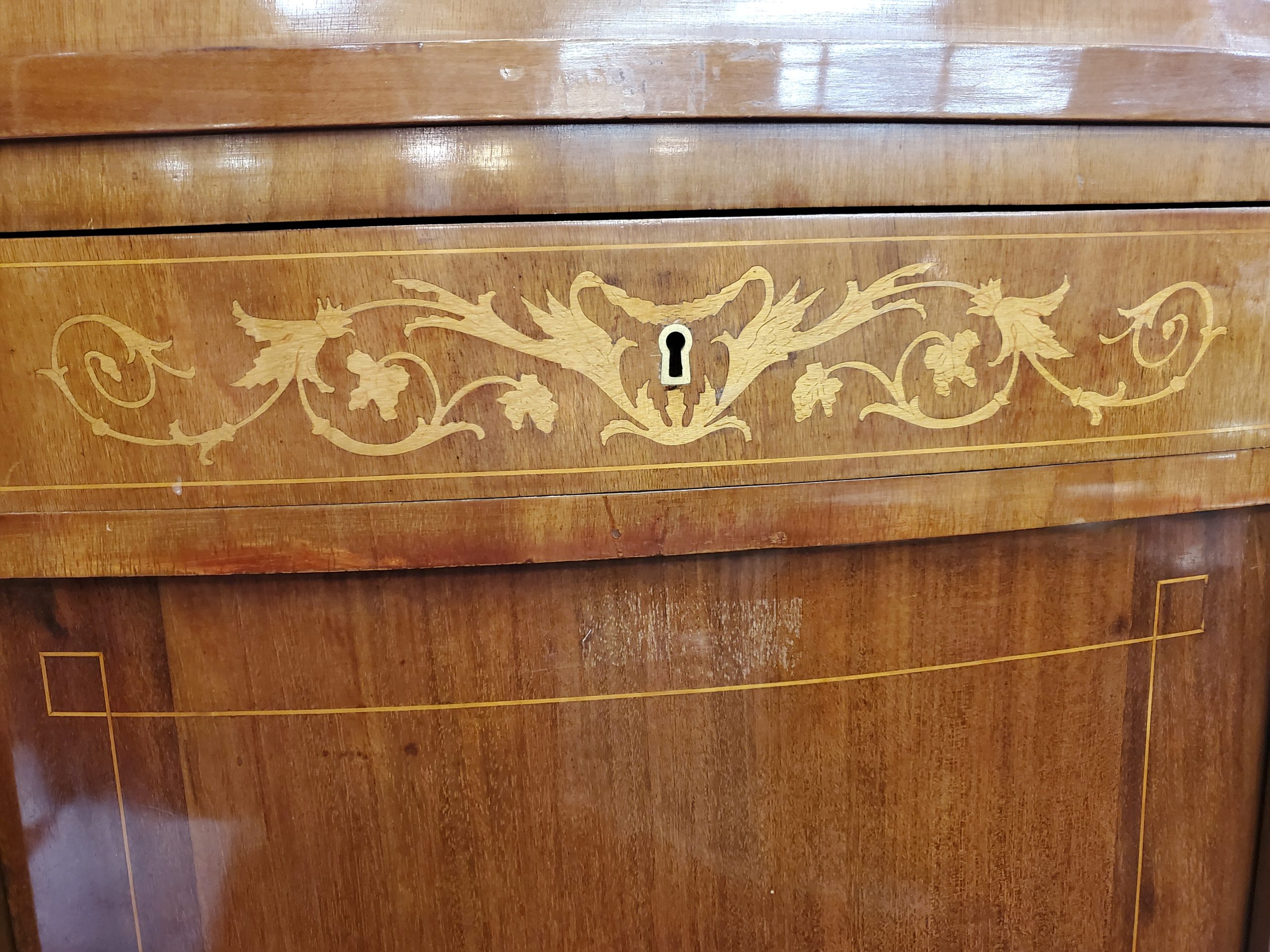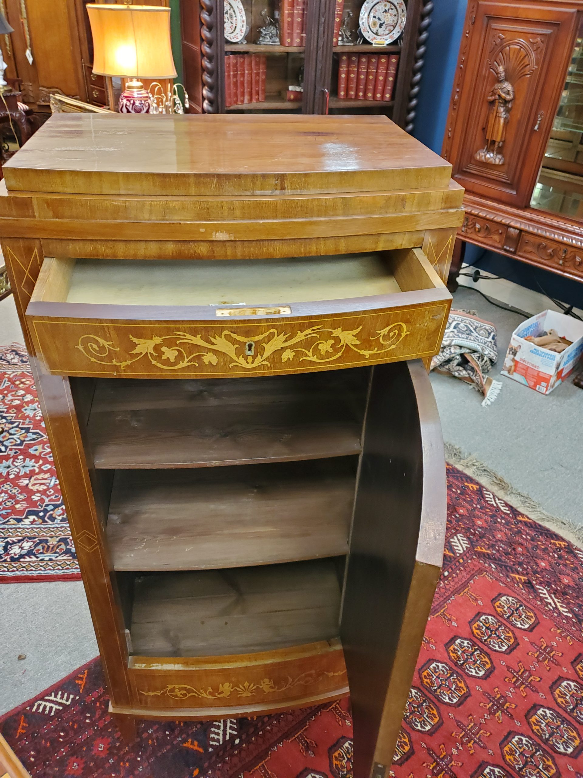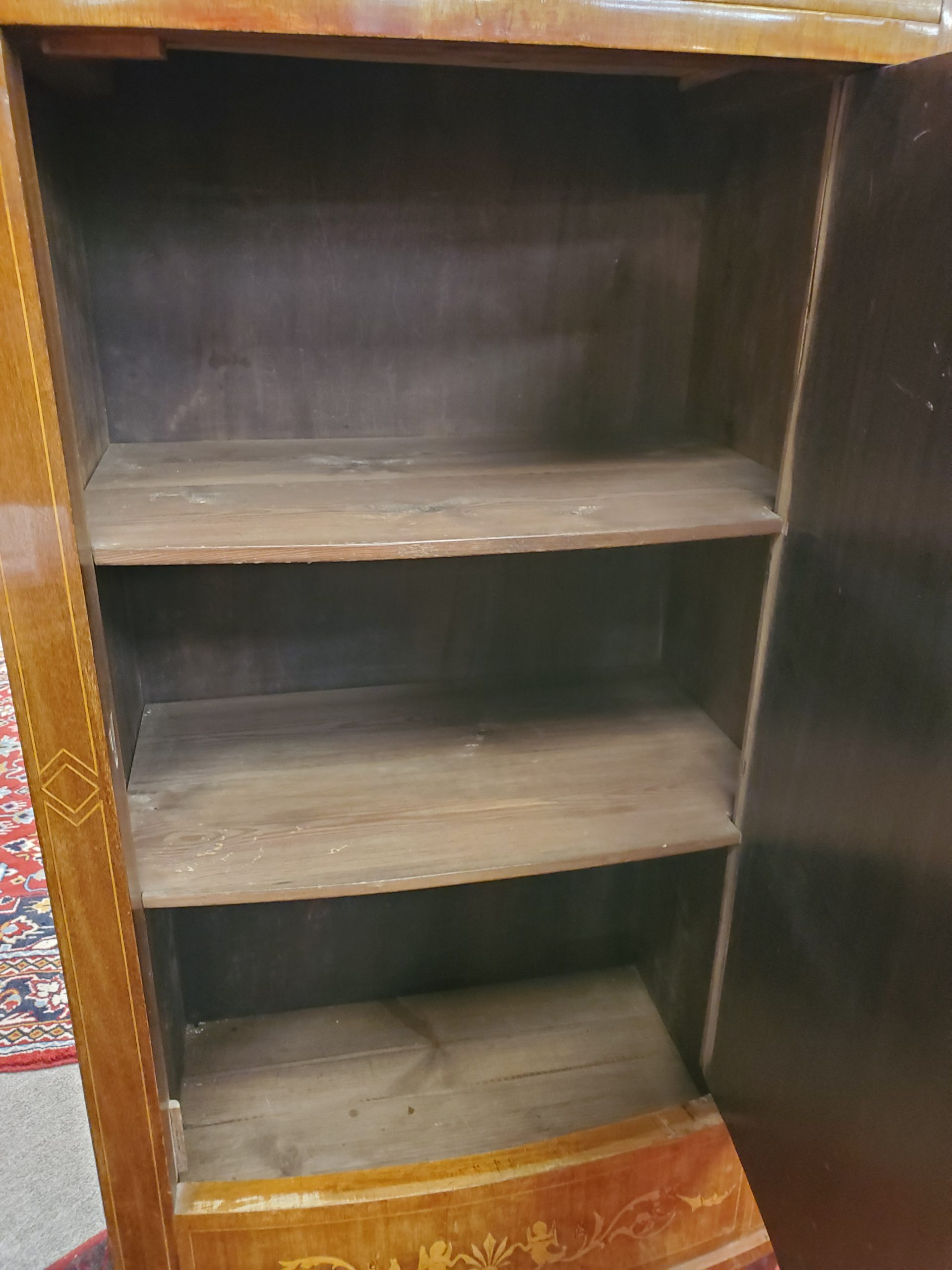 Beautiful antique mahogany cabinet with a single dovetail drawer above a door that opens to reveal three wooden shelves, inlaid on the front depicting vase, flowers, and angels. Circa early 19th century.