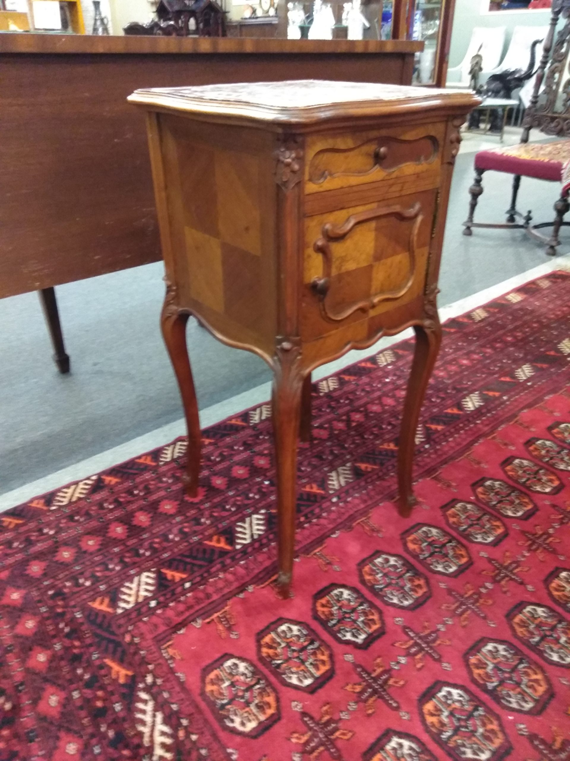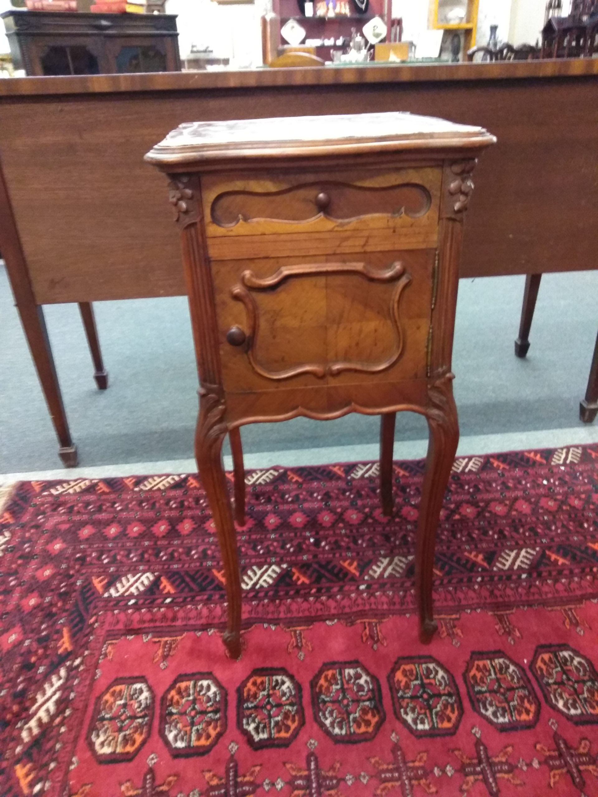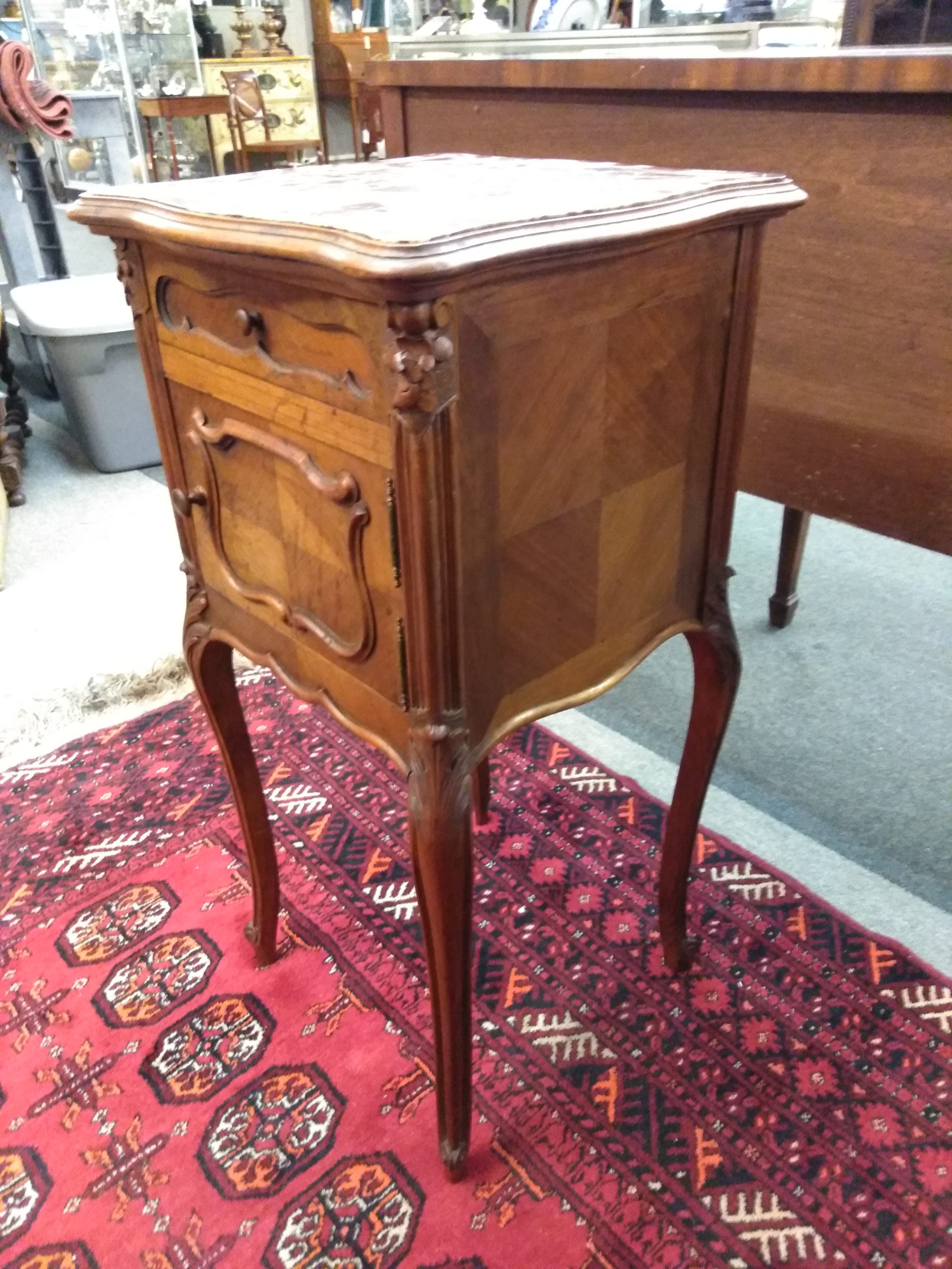 19th century French Louis XV nightstand with a single drawer, cared door, and marble top, carved detail, ending in cabriole legs.
