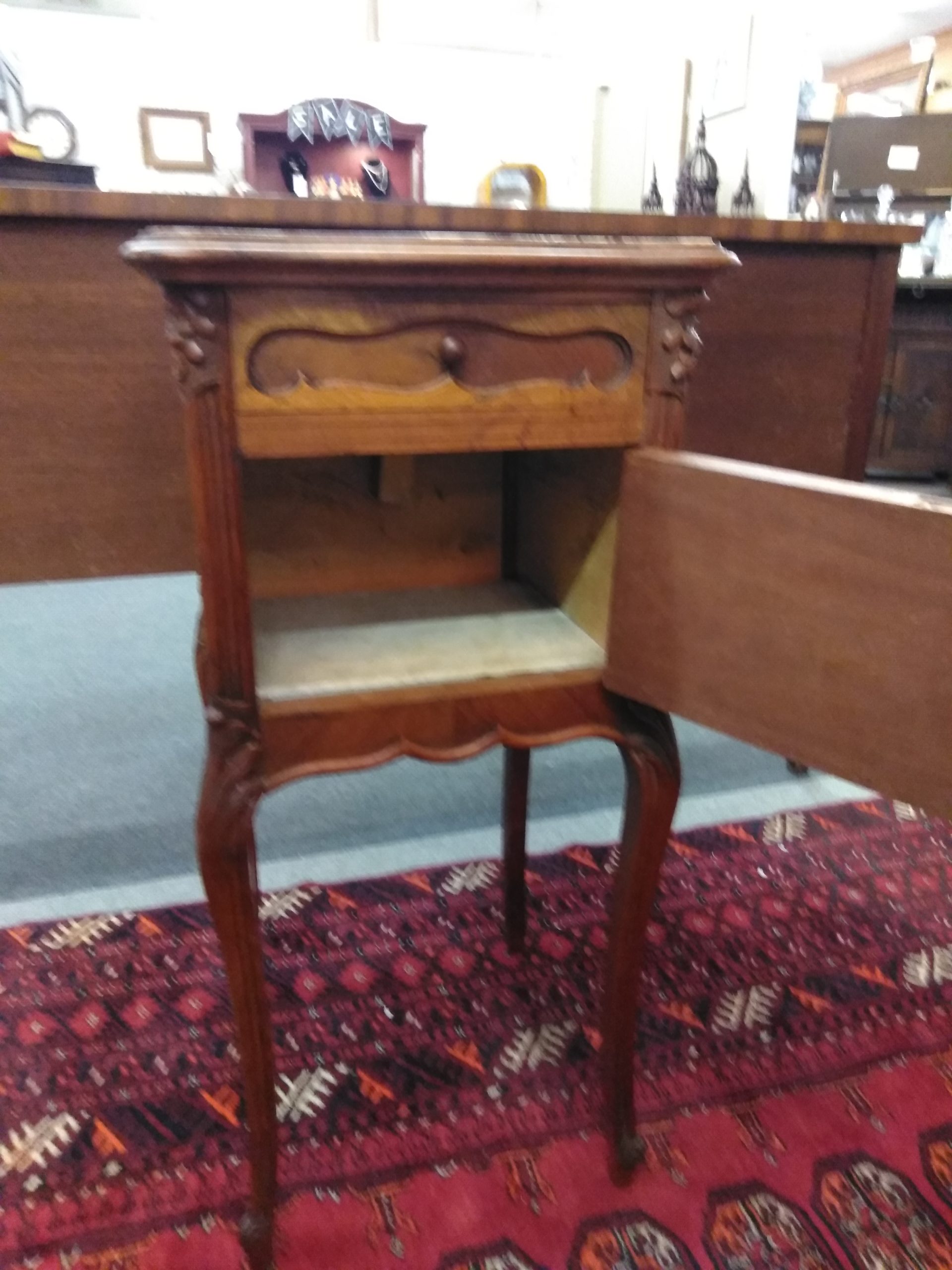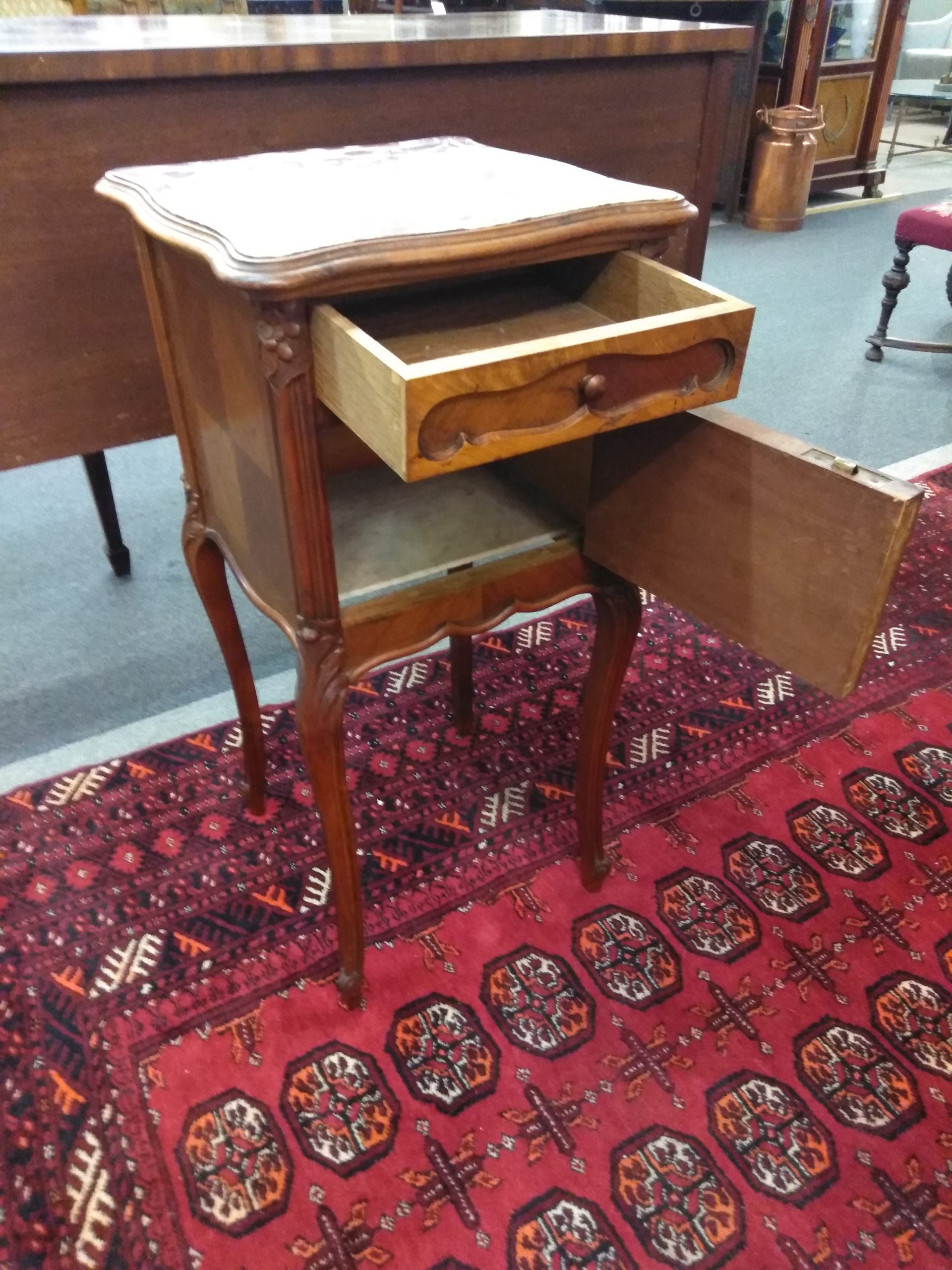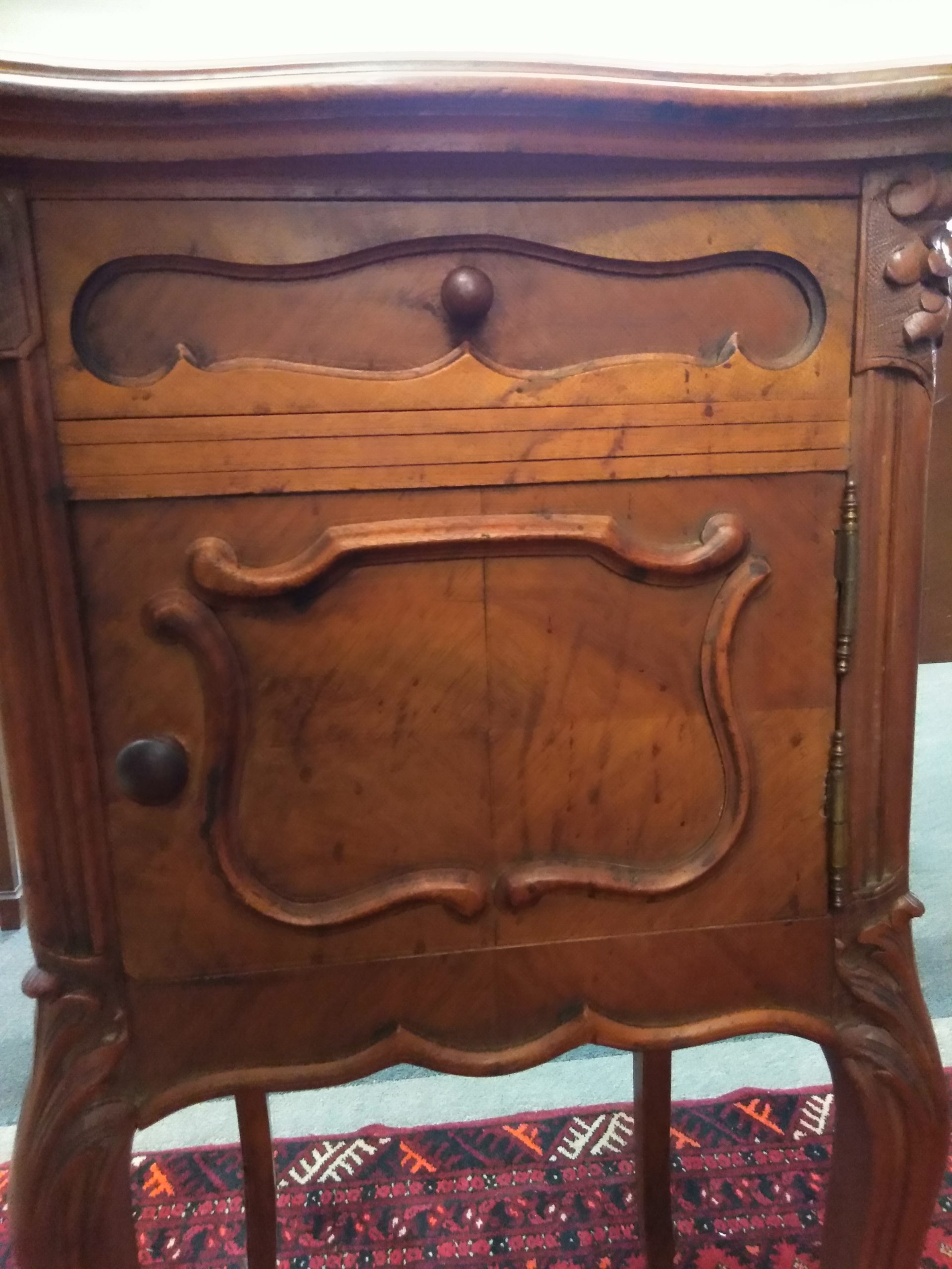 19th century French Louis XV nightstand with a single drawer, cared door, and marble top, carved detail, ending in cabriole legs.