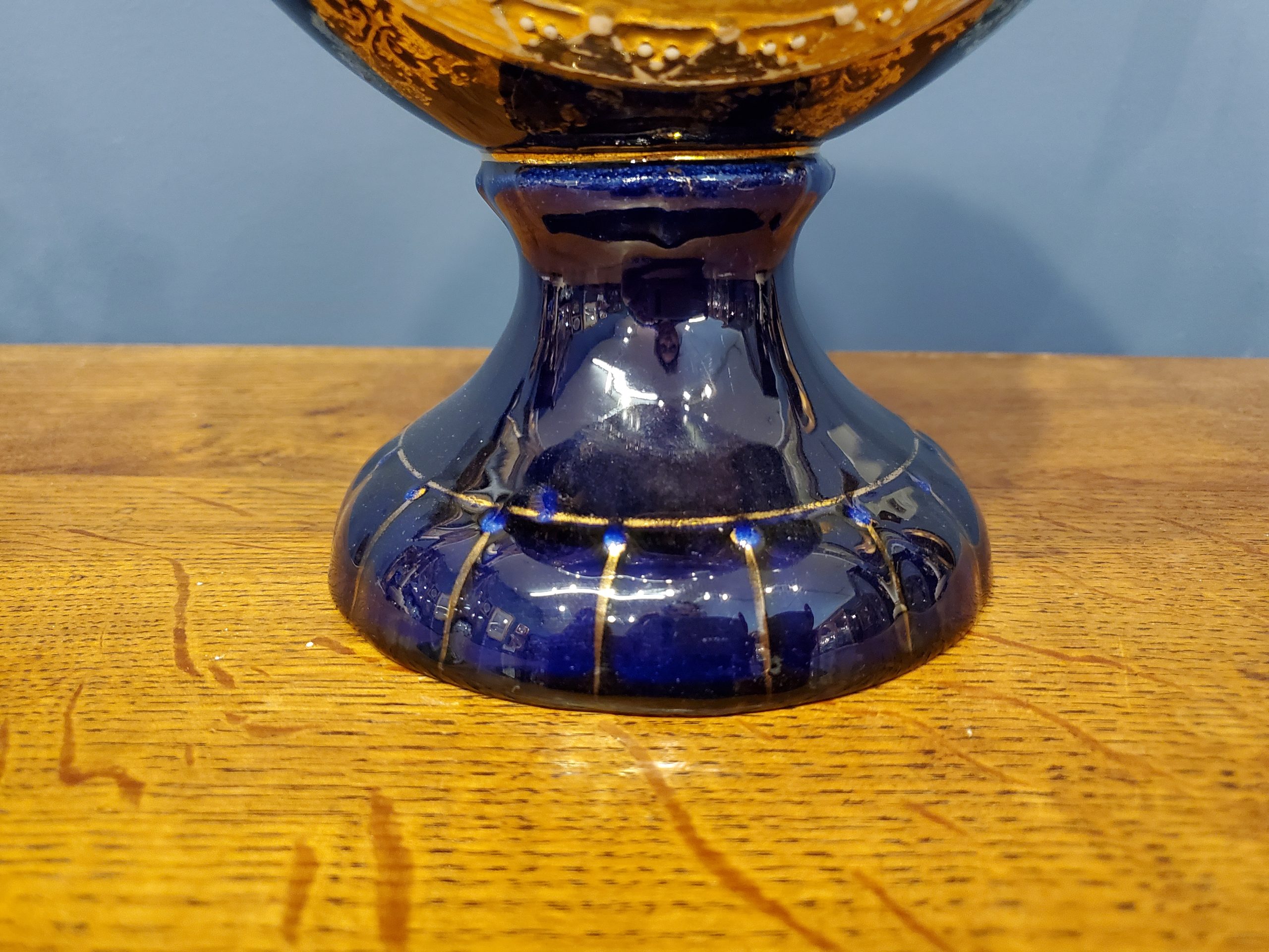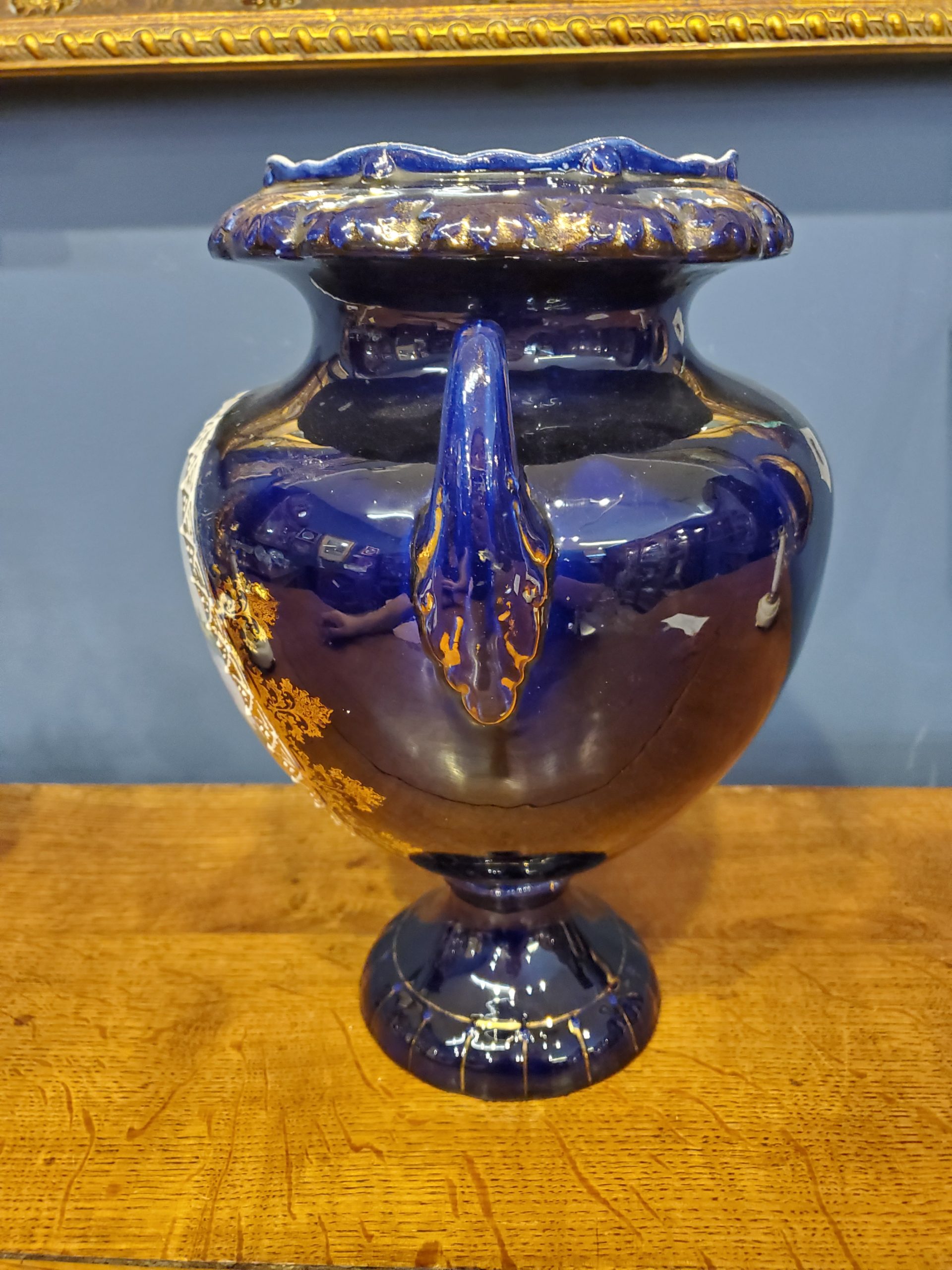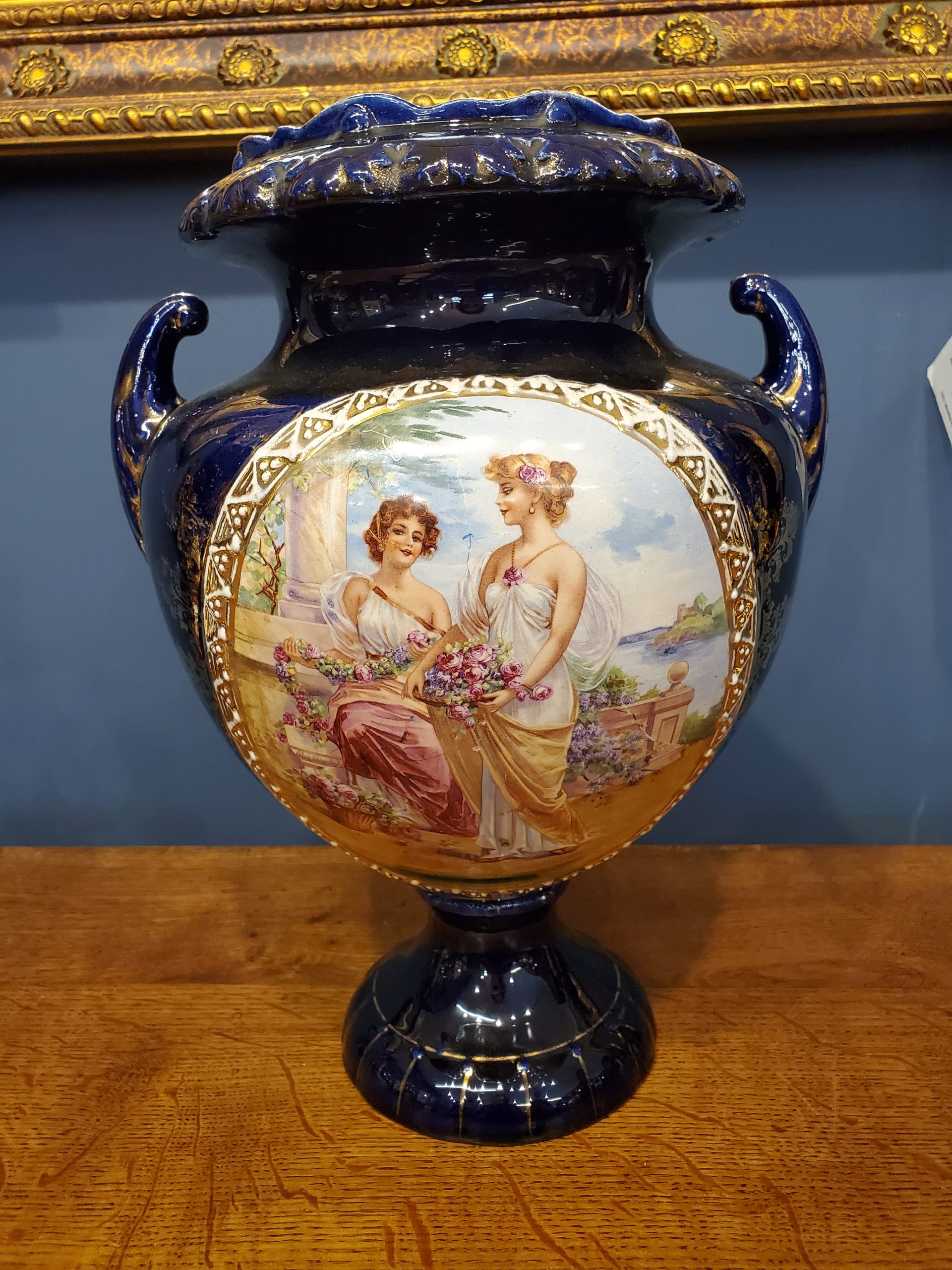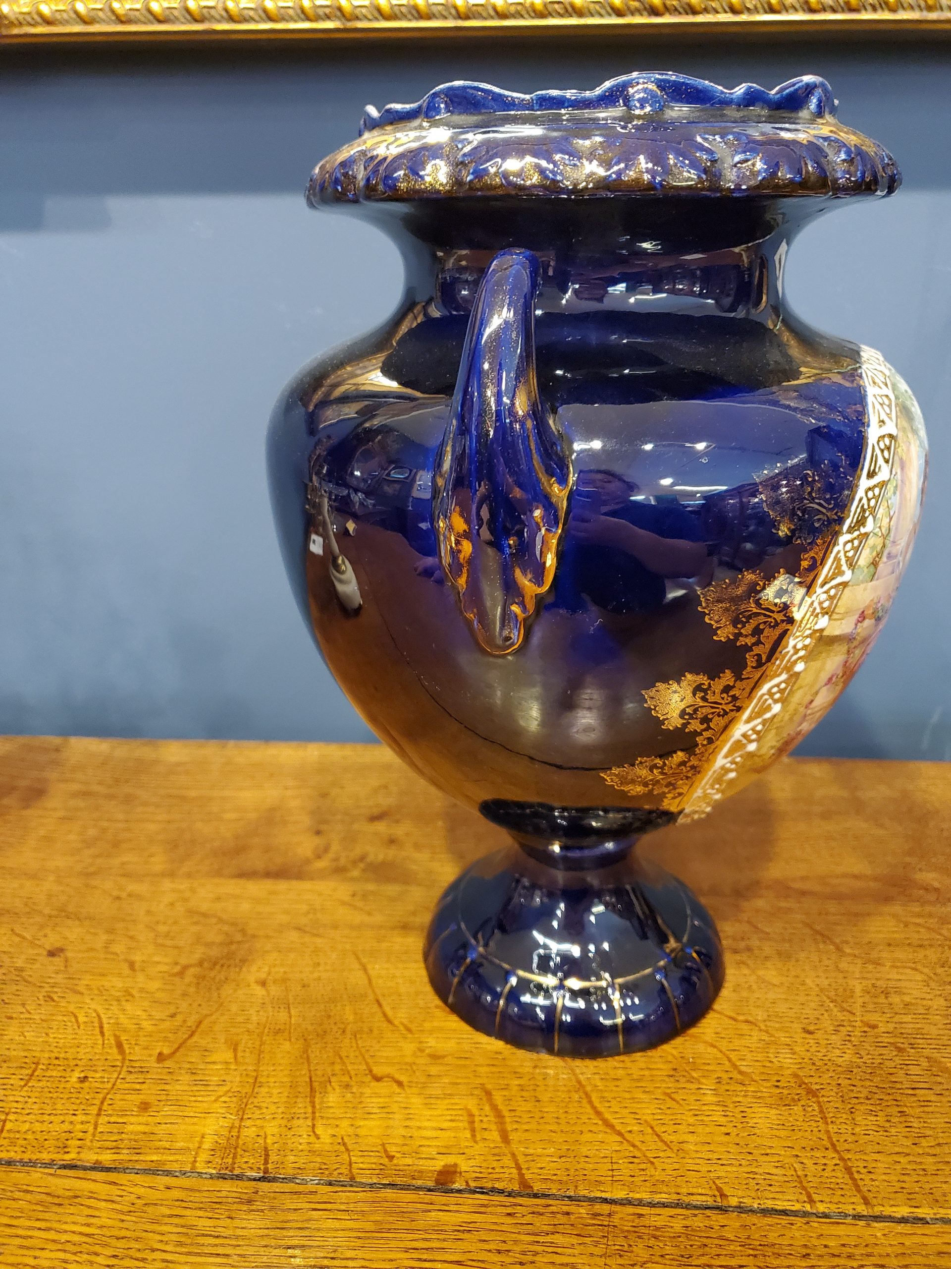 An antique Austrian Cabinet Vase with a central medallion of two maidens surrounded blue and gilt border on a cobalt background.