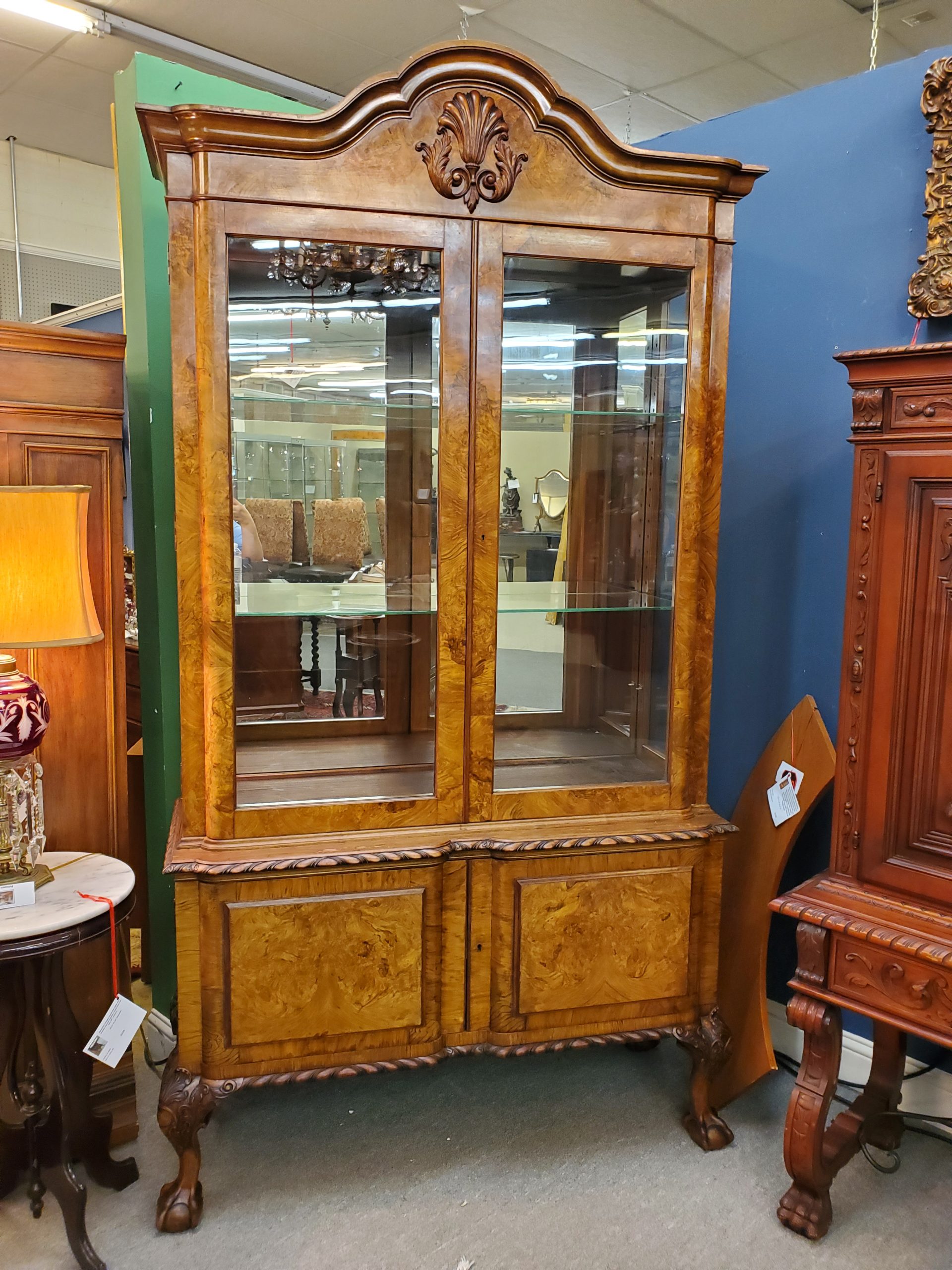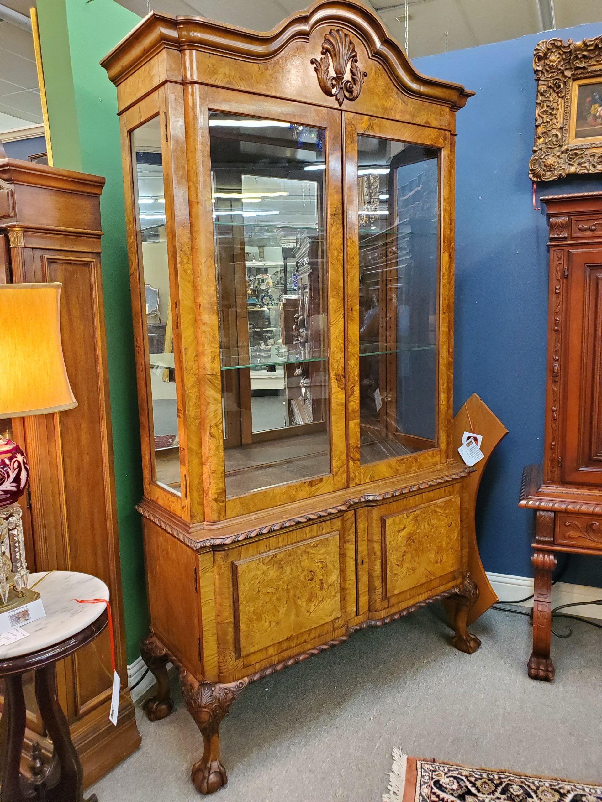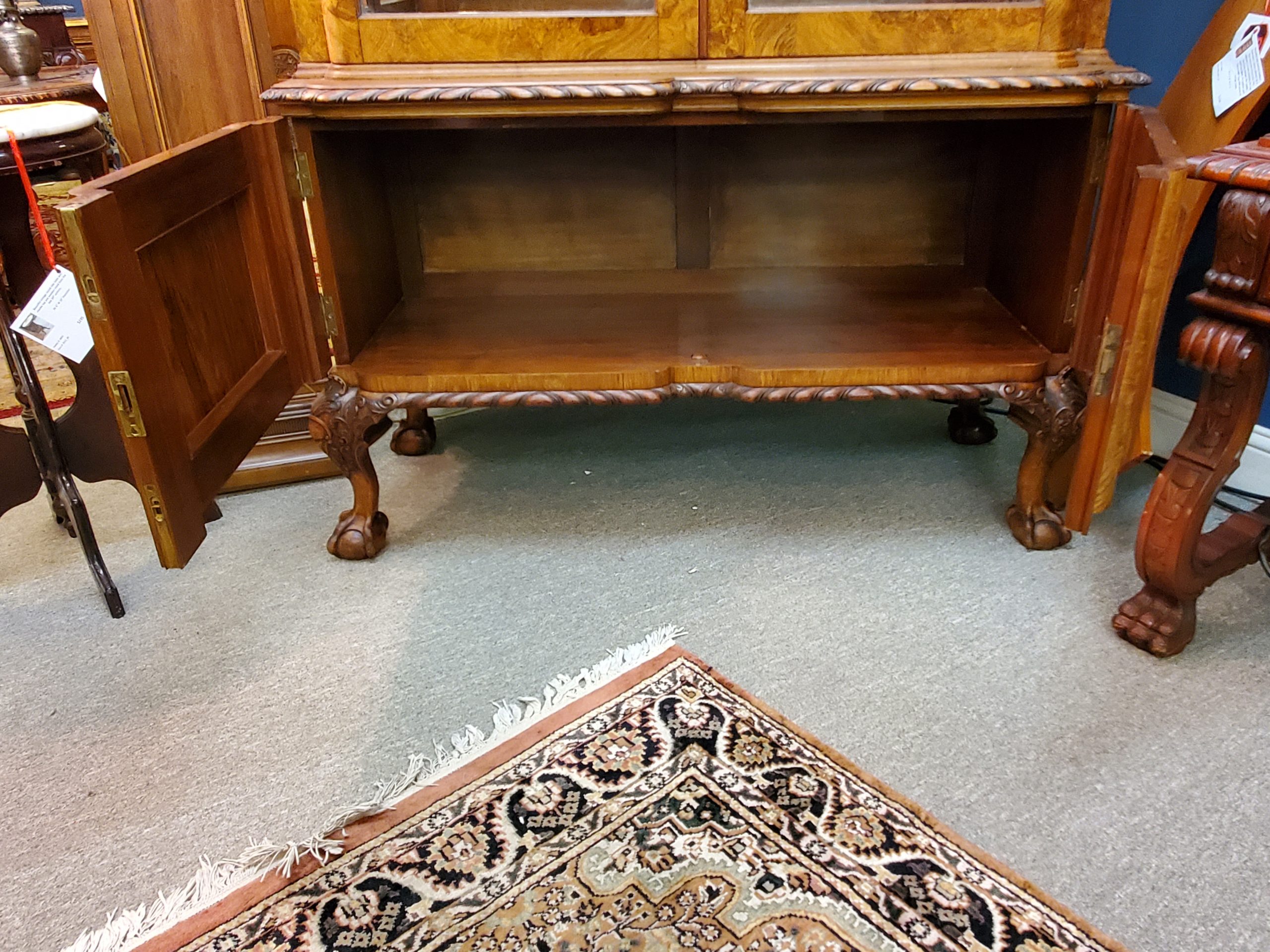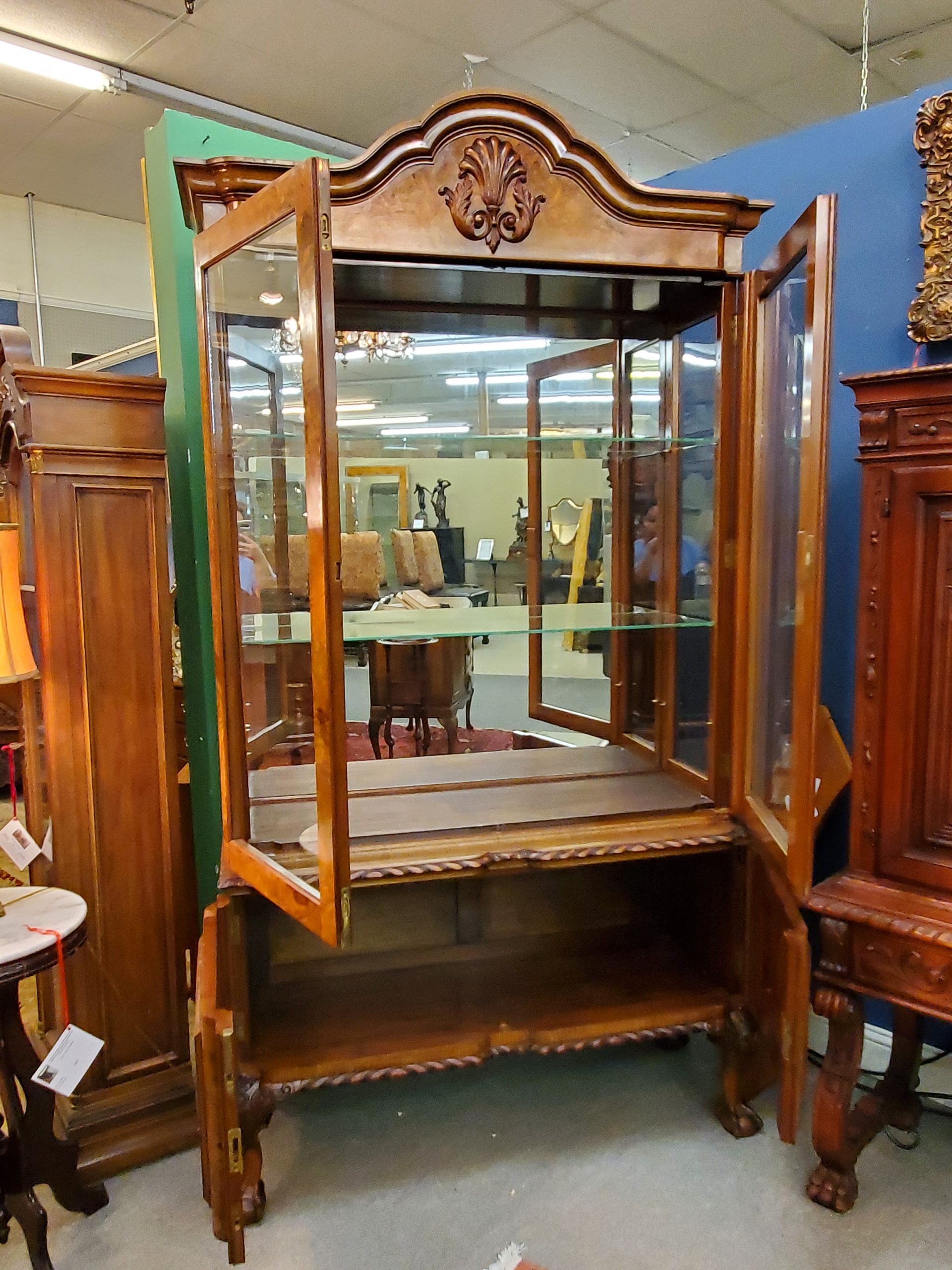 Beautiful antique walnut display cabinet, the top has two glass doors when open they reveal a mirror back, glass sides, and two adjustable glass shelves, under two wooden doors with lots of storage inside, with carving on top and carved edge on bottom, ending in ball and claw feet. Circa early 20th century.