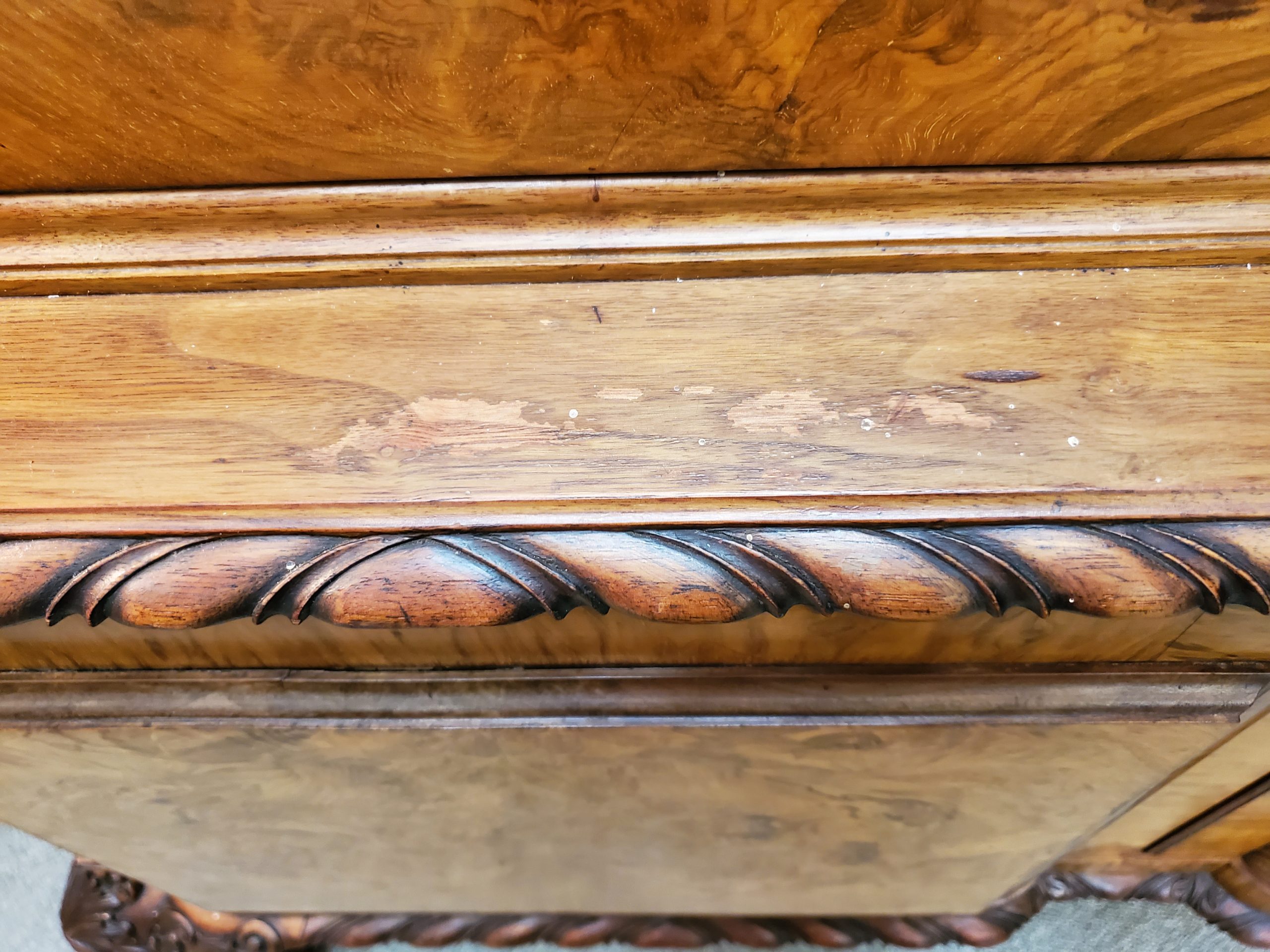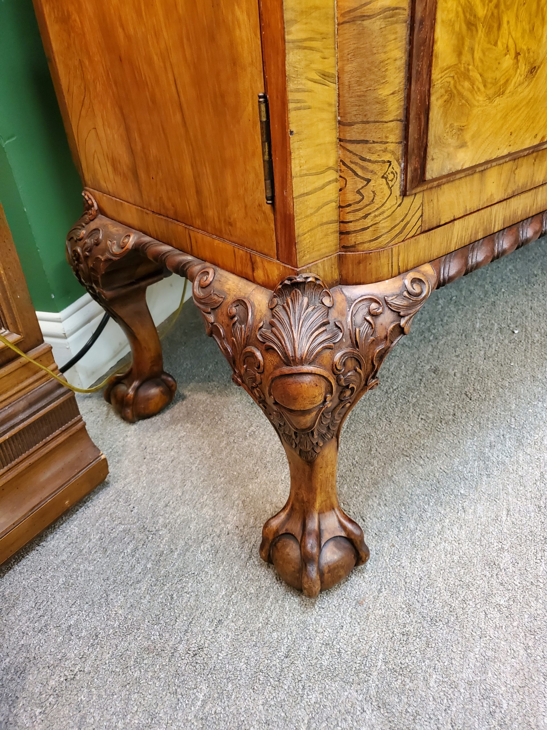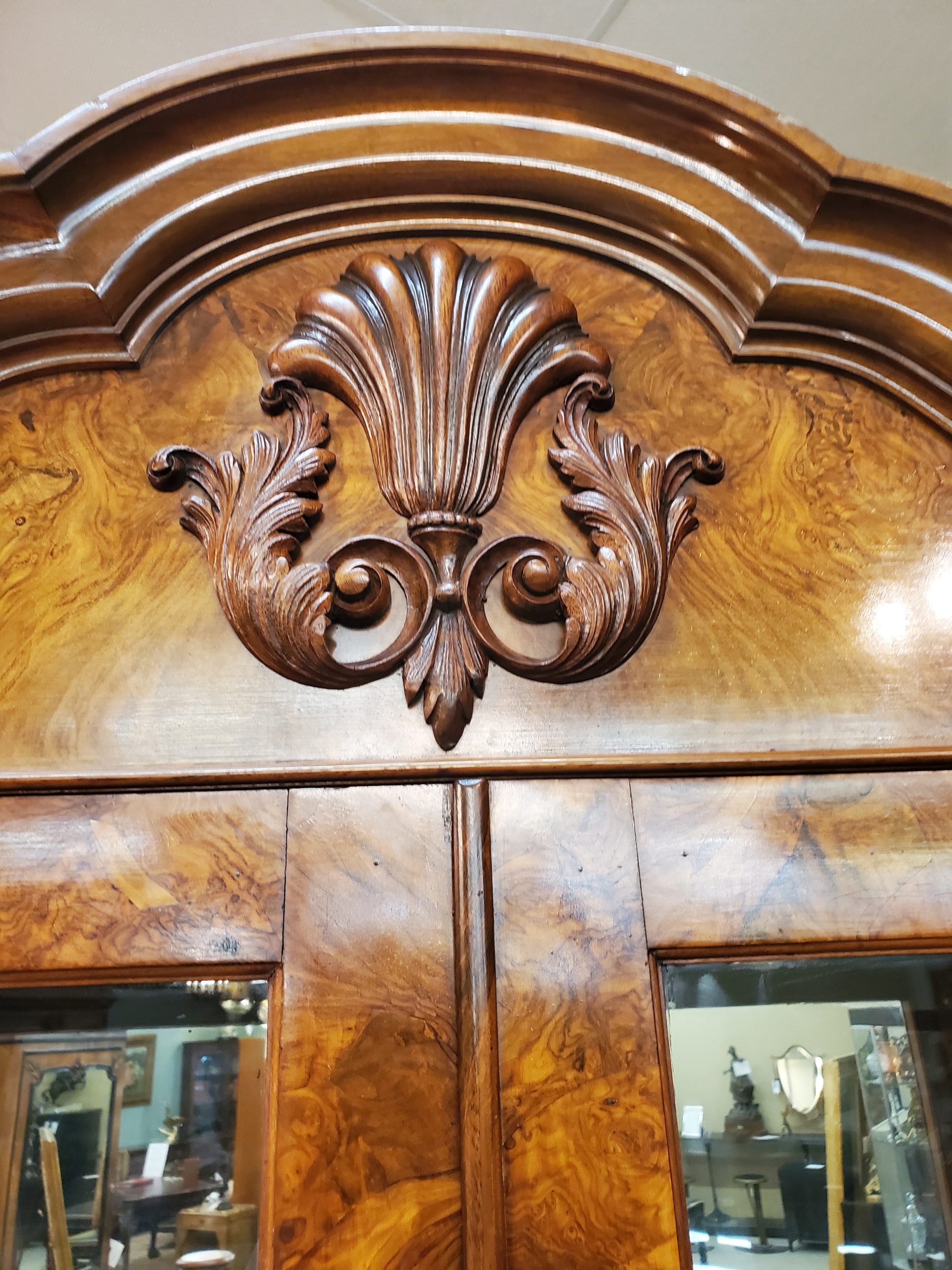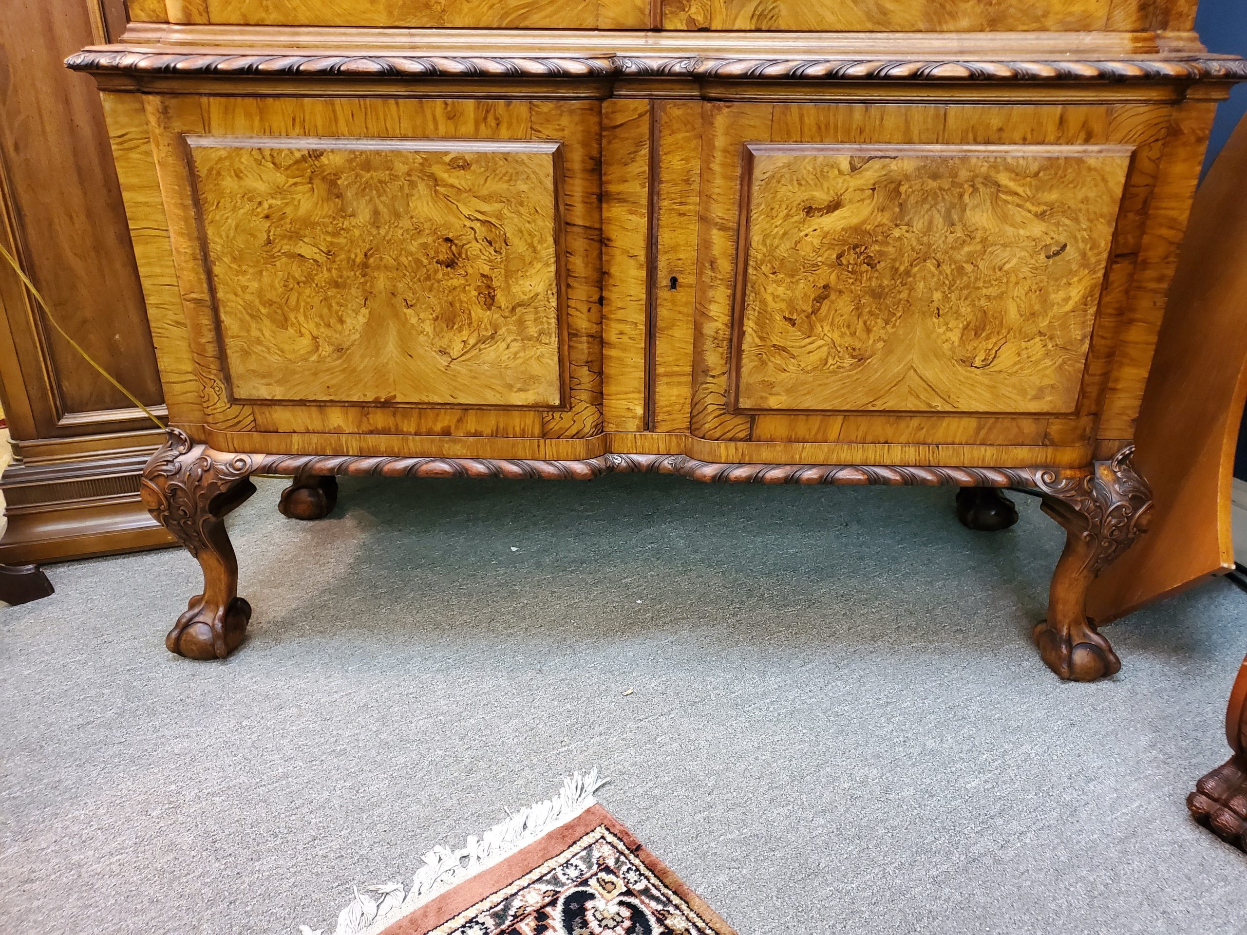 Beautiful antique walnut display cabinet, the top has two glass doors when open they reveal a mirror back, glass sides, and two adjustable glass shelves, under two wooden doors with lots of storage inside, with carving on top and carved edge on bottom, ending in ball and claw feet. Circa early 20th century.
