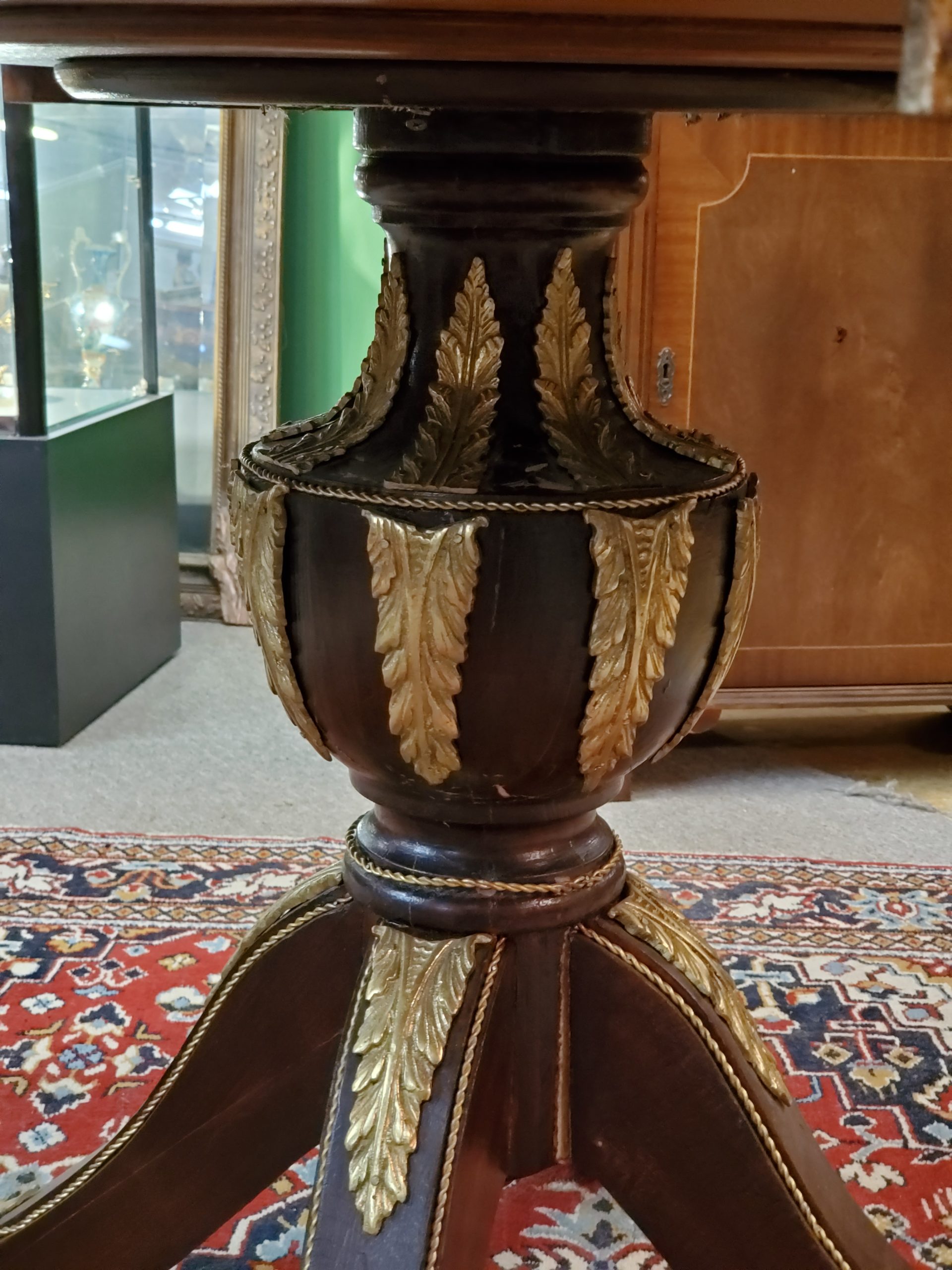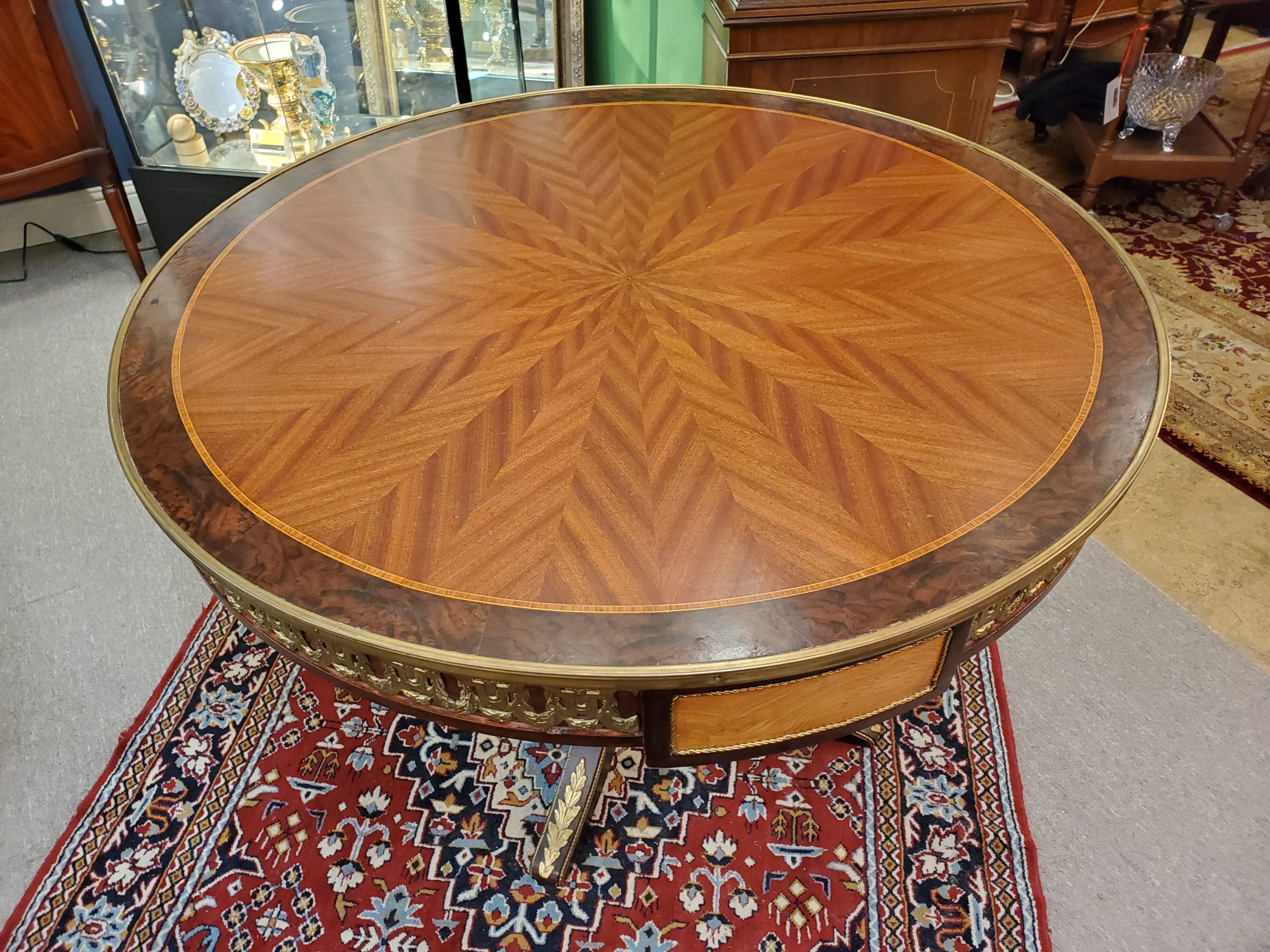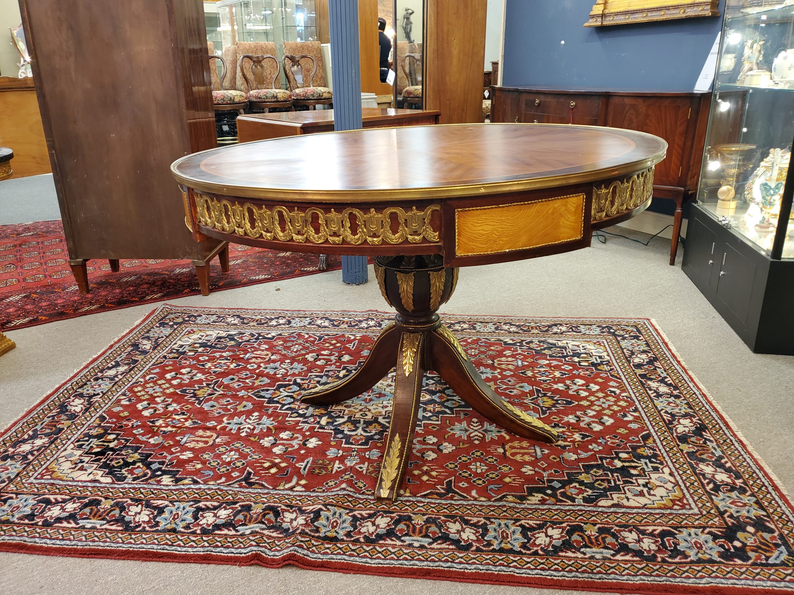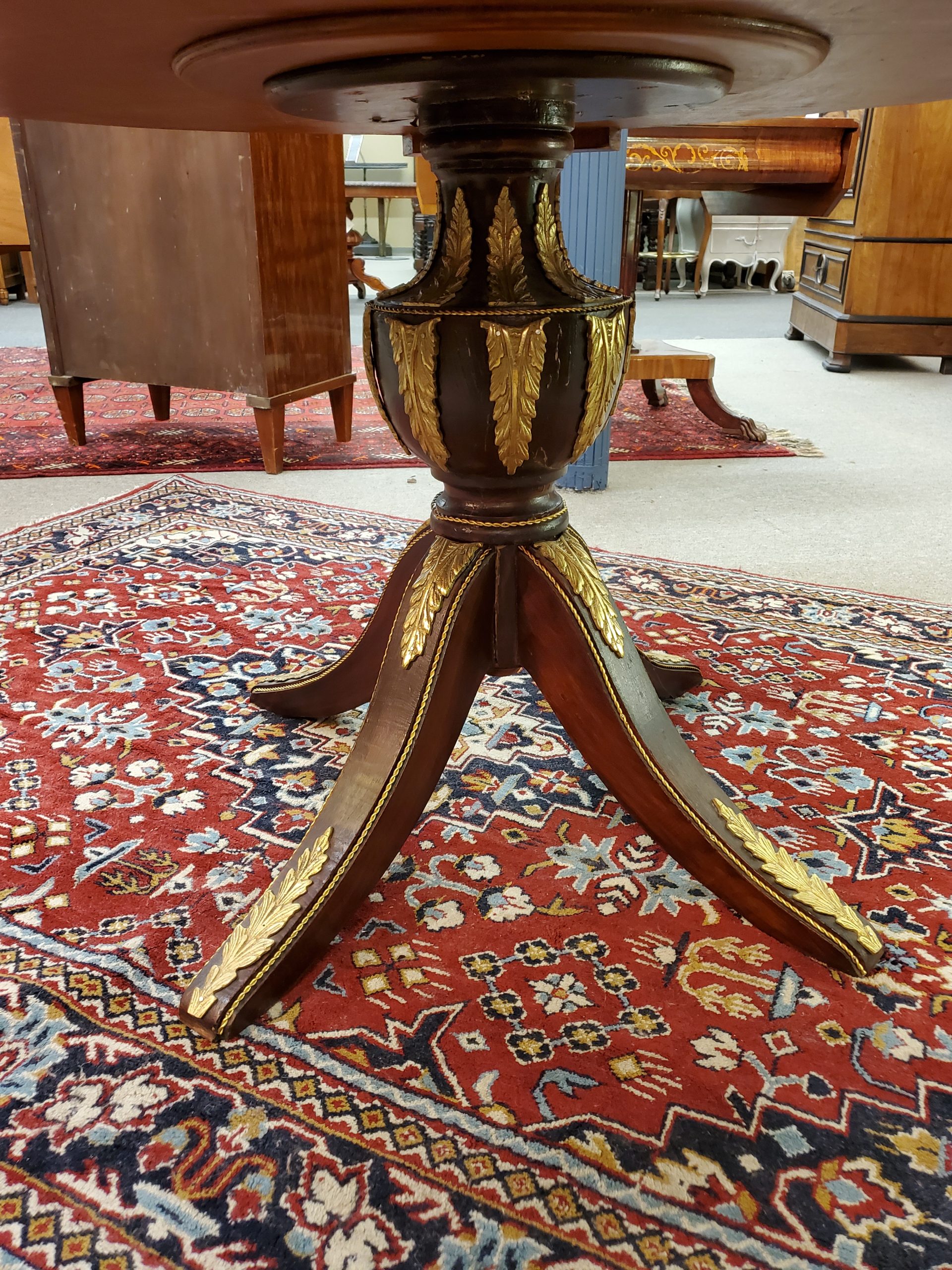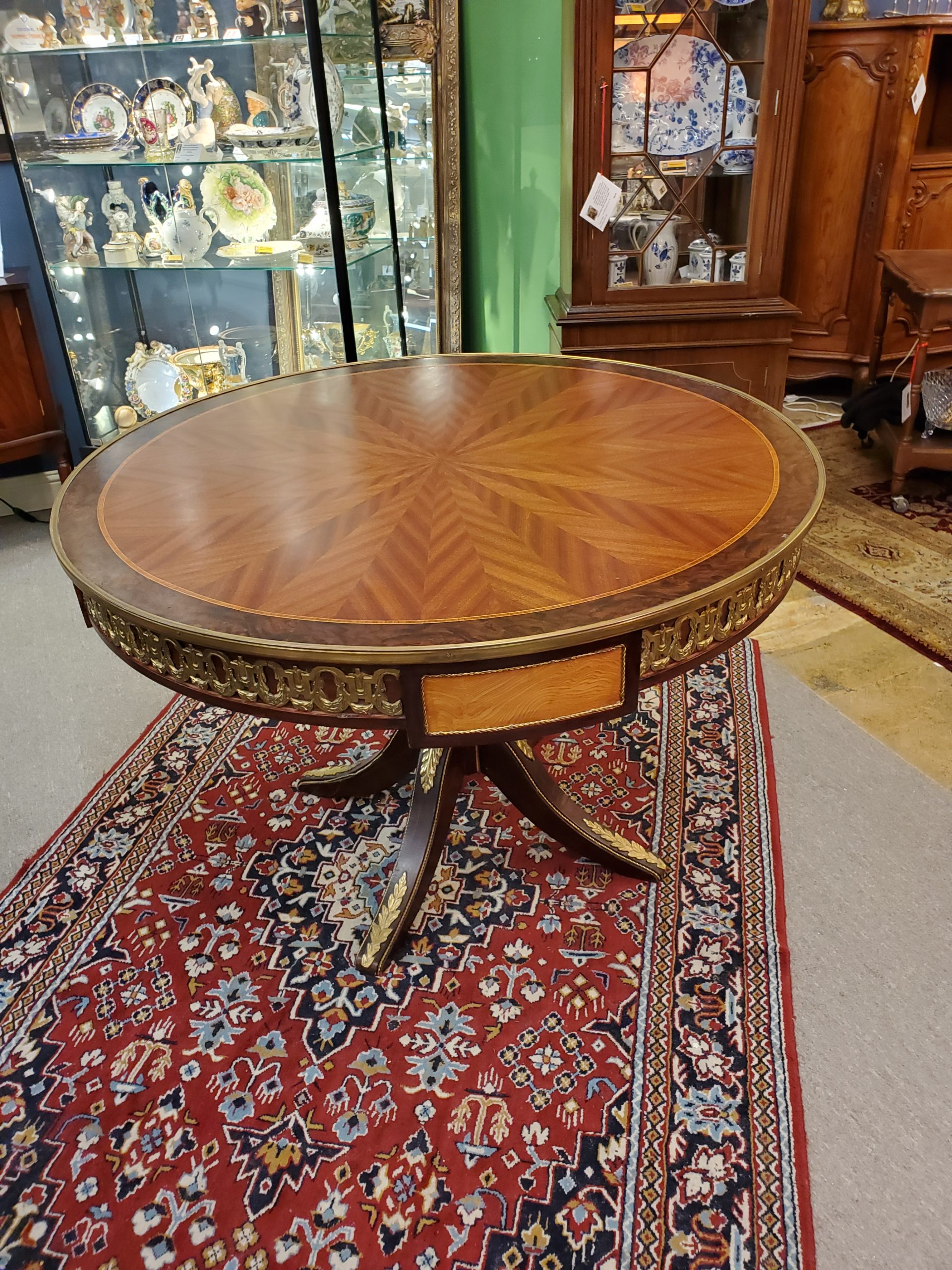 Beautiful antique Empire style inlaid center table with gilt bronze ormolu, ending on splayed legs.