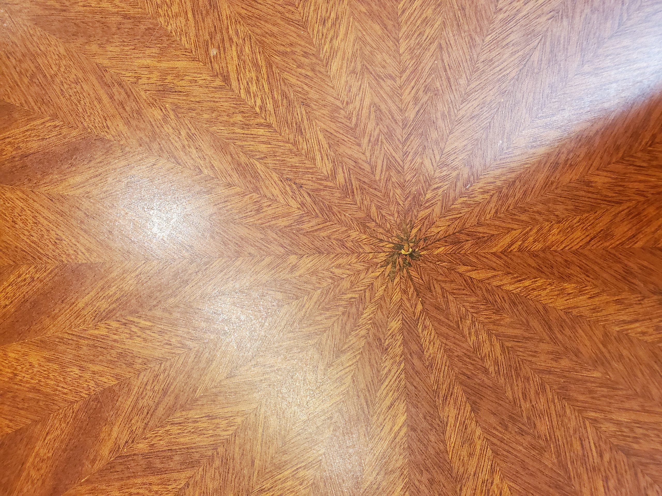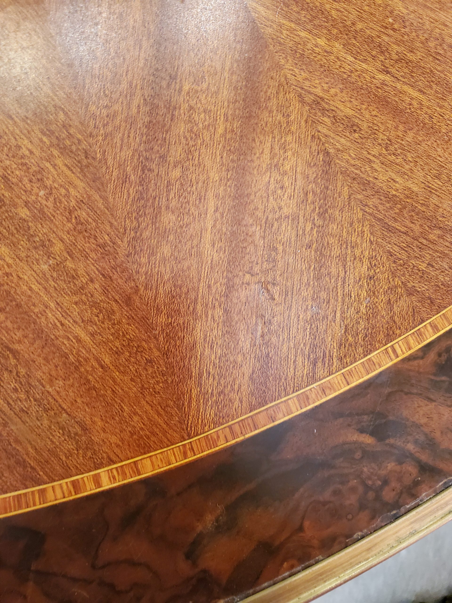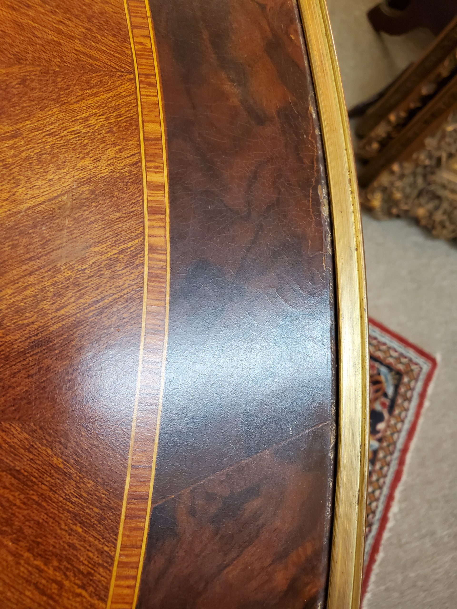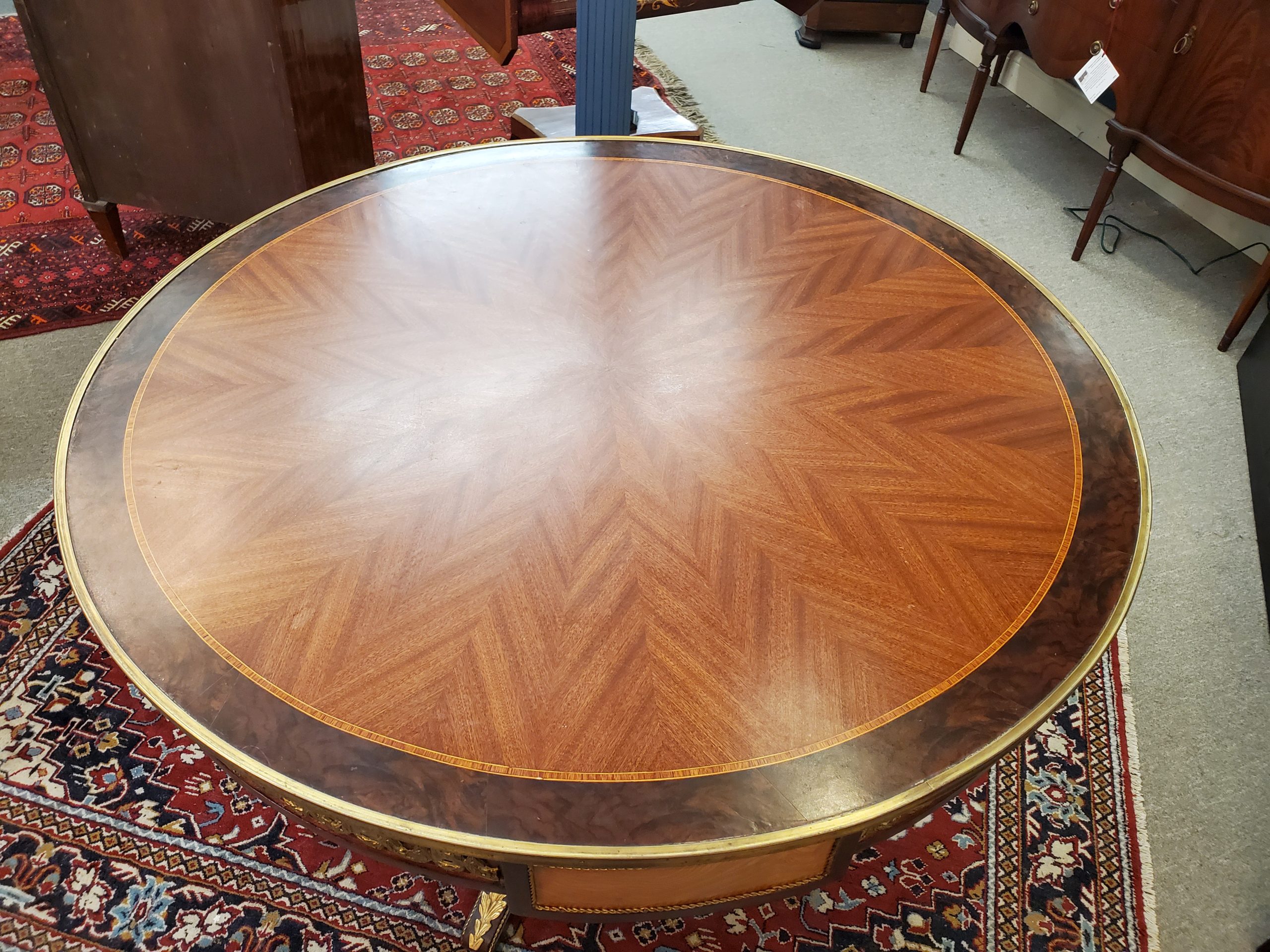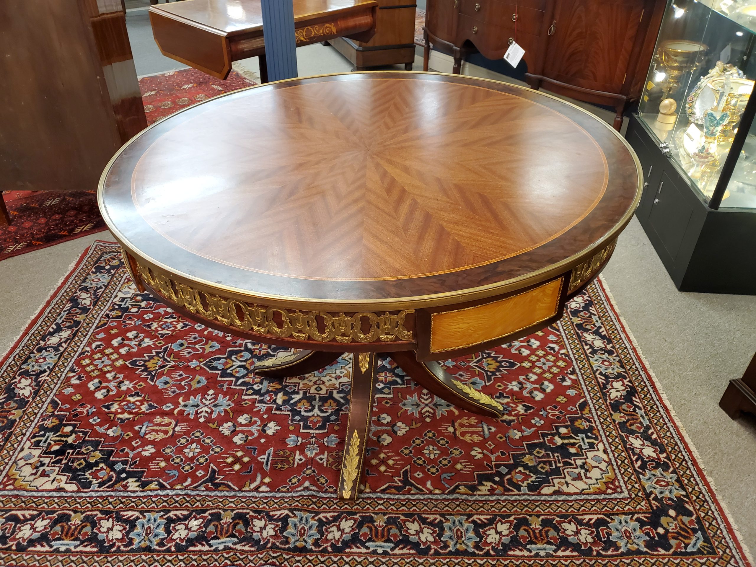 Beautiful antique Empire style inlaid center table with gilt bronze ormolu, ending on splayed legs.