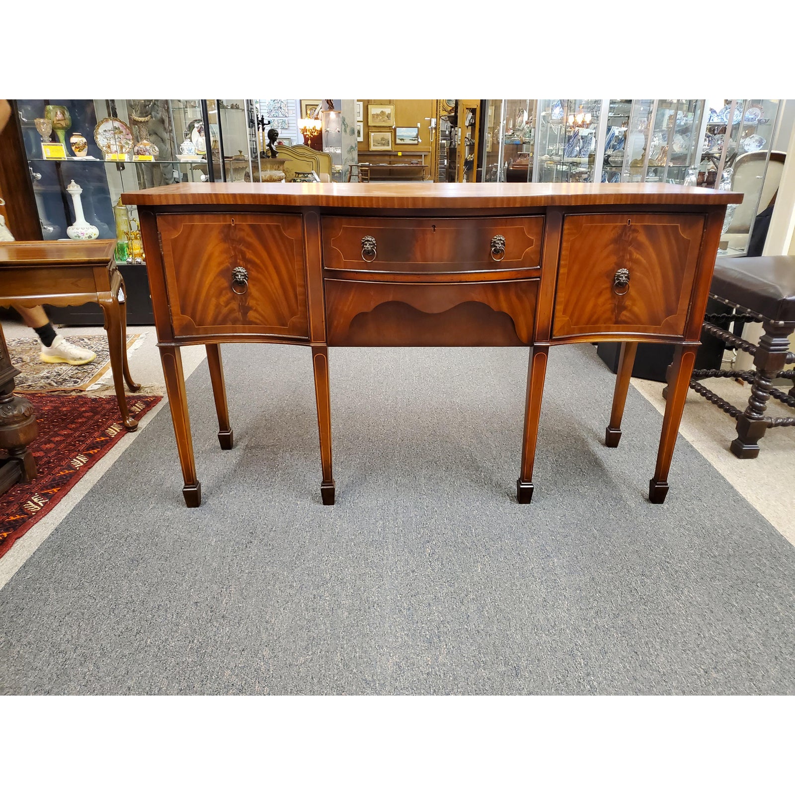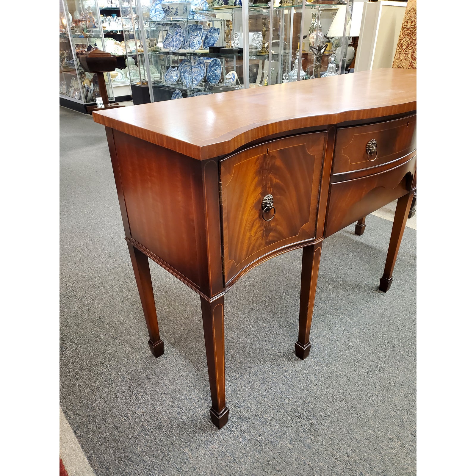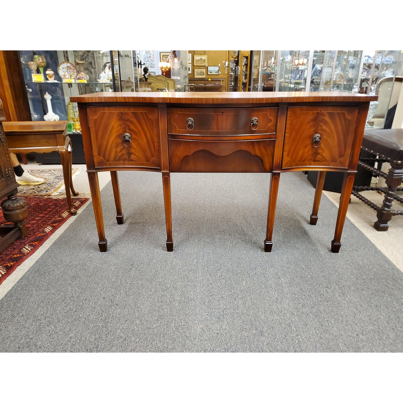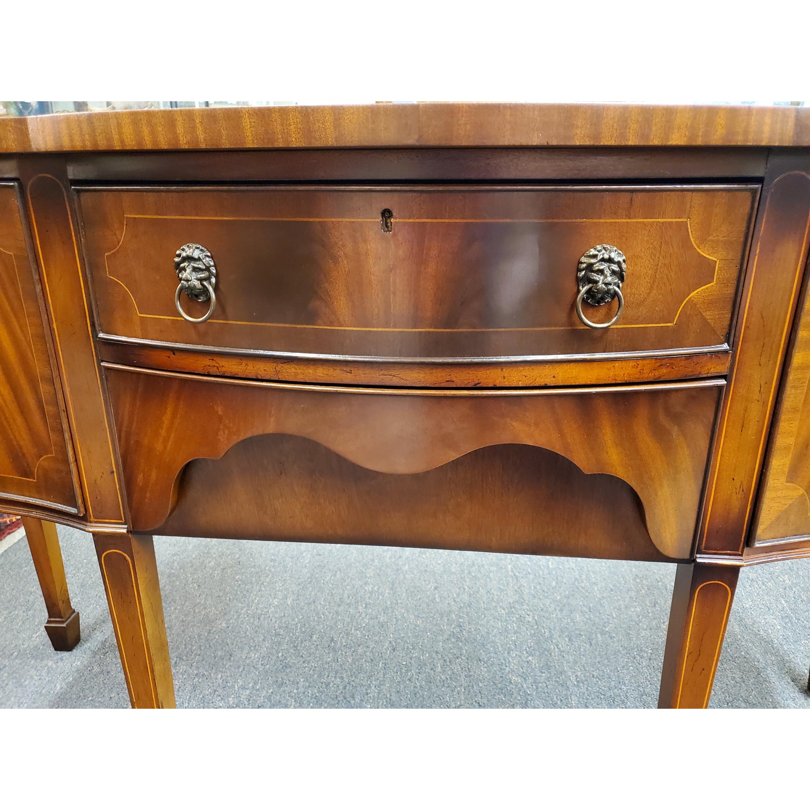 Beautiful antique Georgian style inlaid flamed mahogany sideboard, featuring lion head pulls, two central dovetail drawers flanked by a door on each side, on one side it has an interior shelf, ending on six tapered legs. Circa early 20th century.