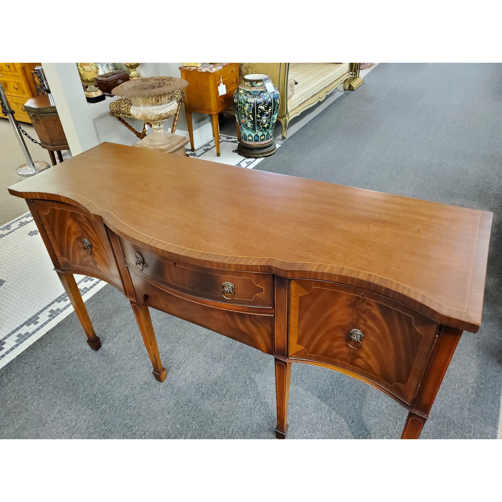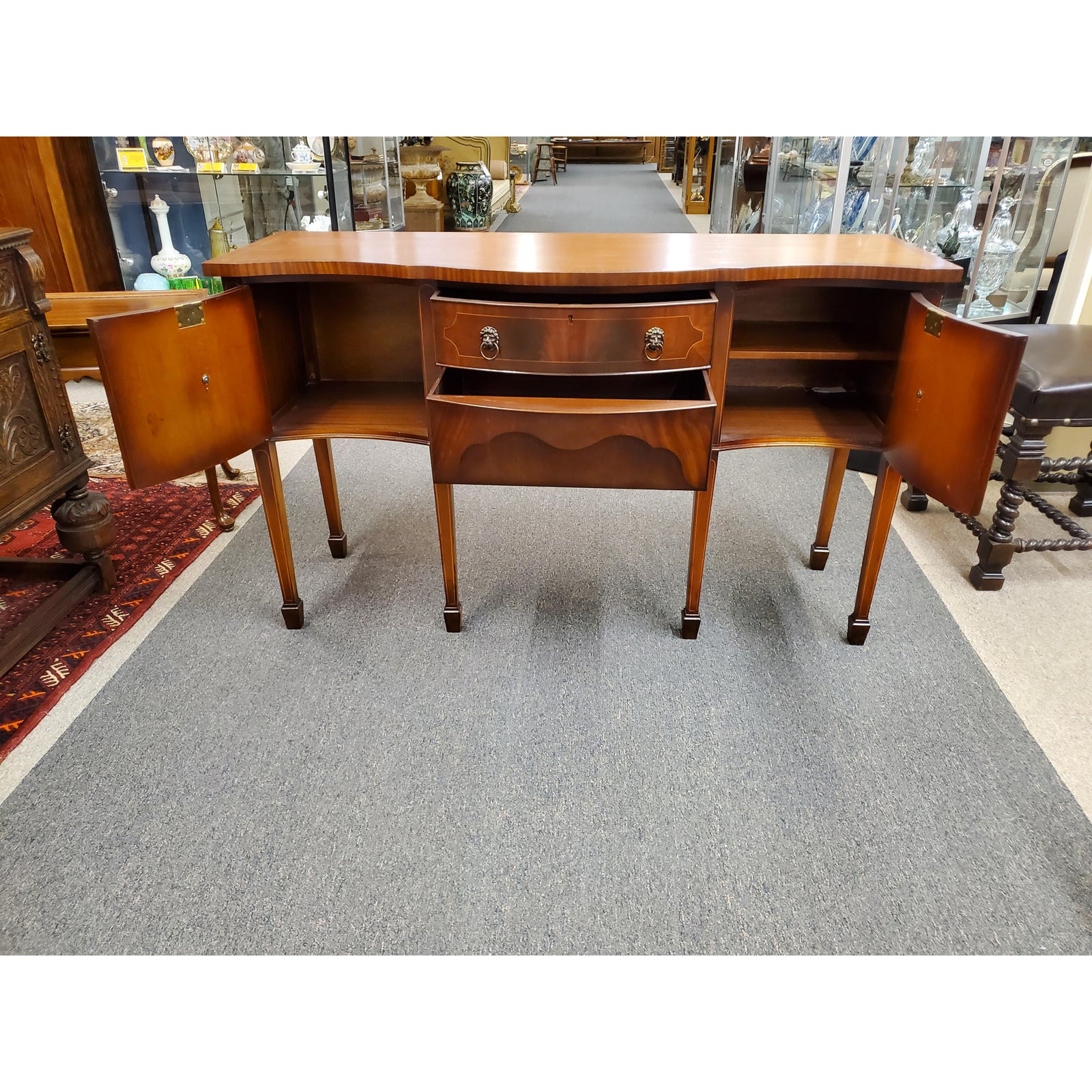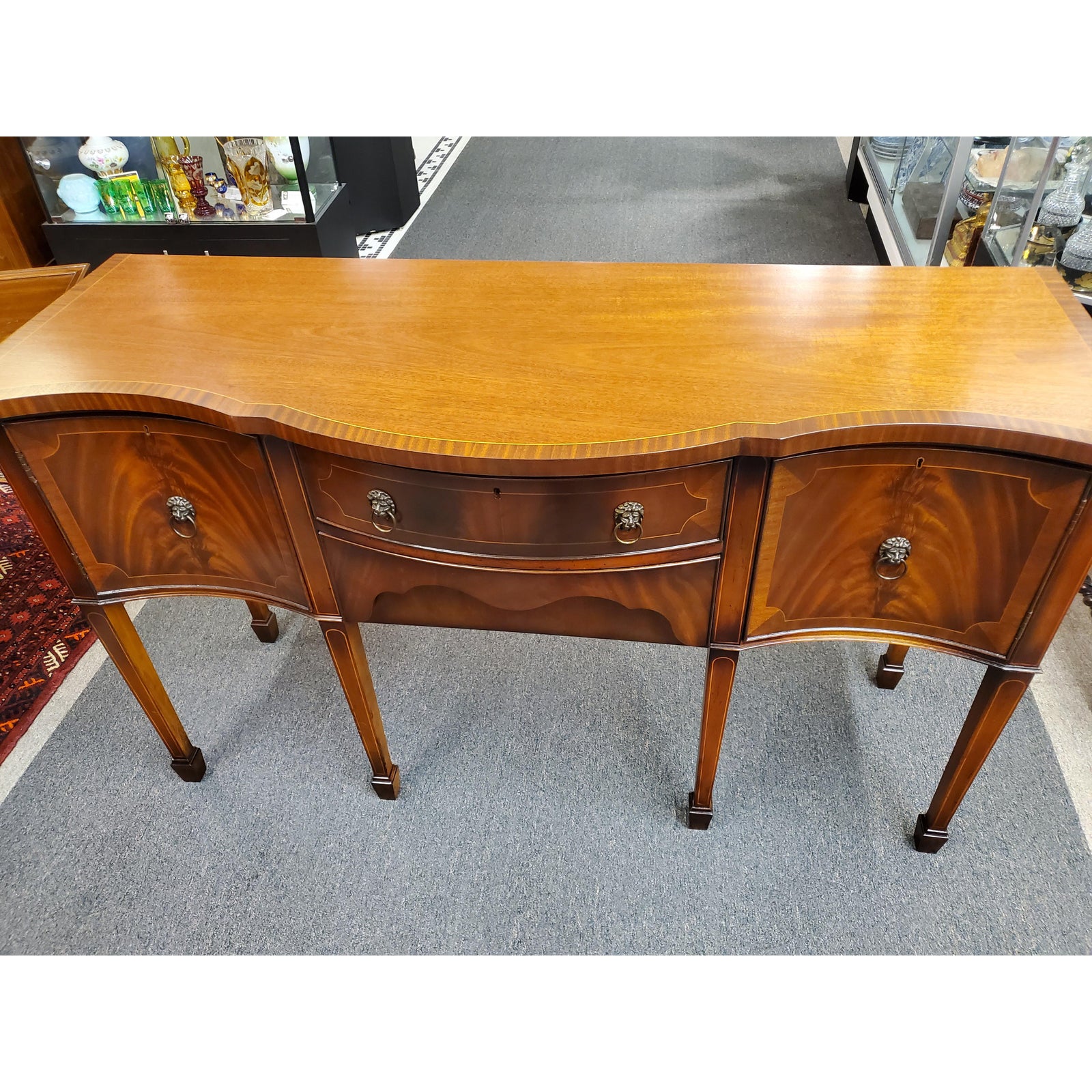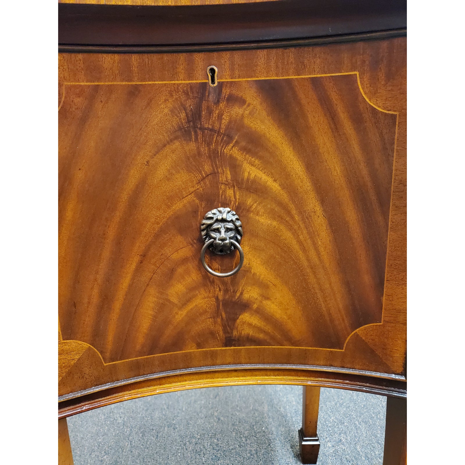 Beautiful antique Georgian style inlaid flamed mahogany sideboard, featuring lion head pulls, two central dovetail drawers flanked by a door on each side, on one side it has an interior shelf, ending on six tapered legs. Circa early 20th century.