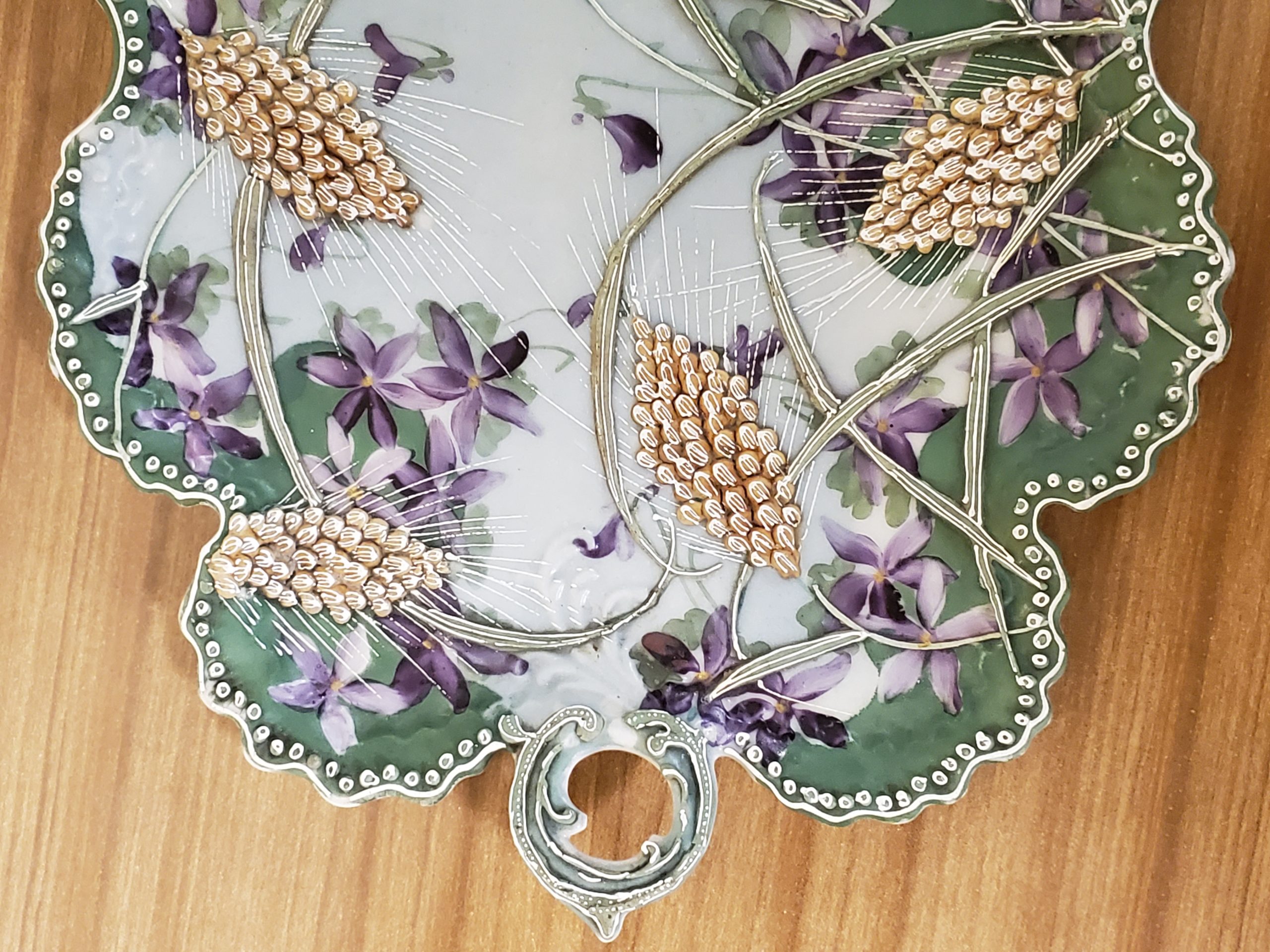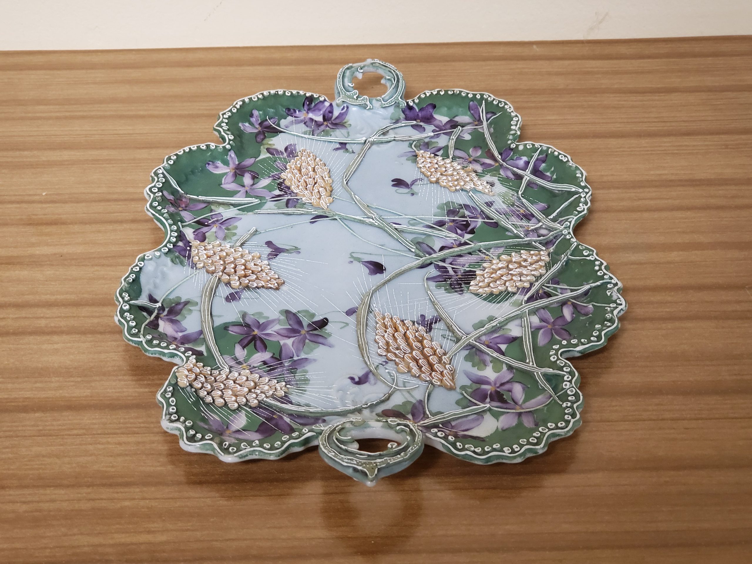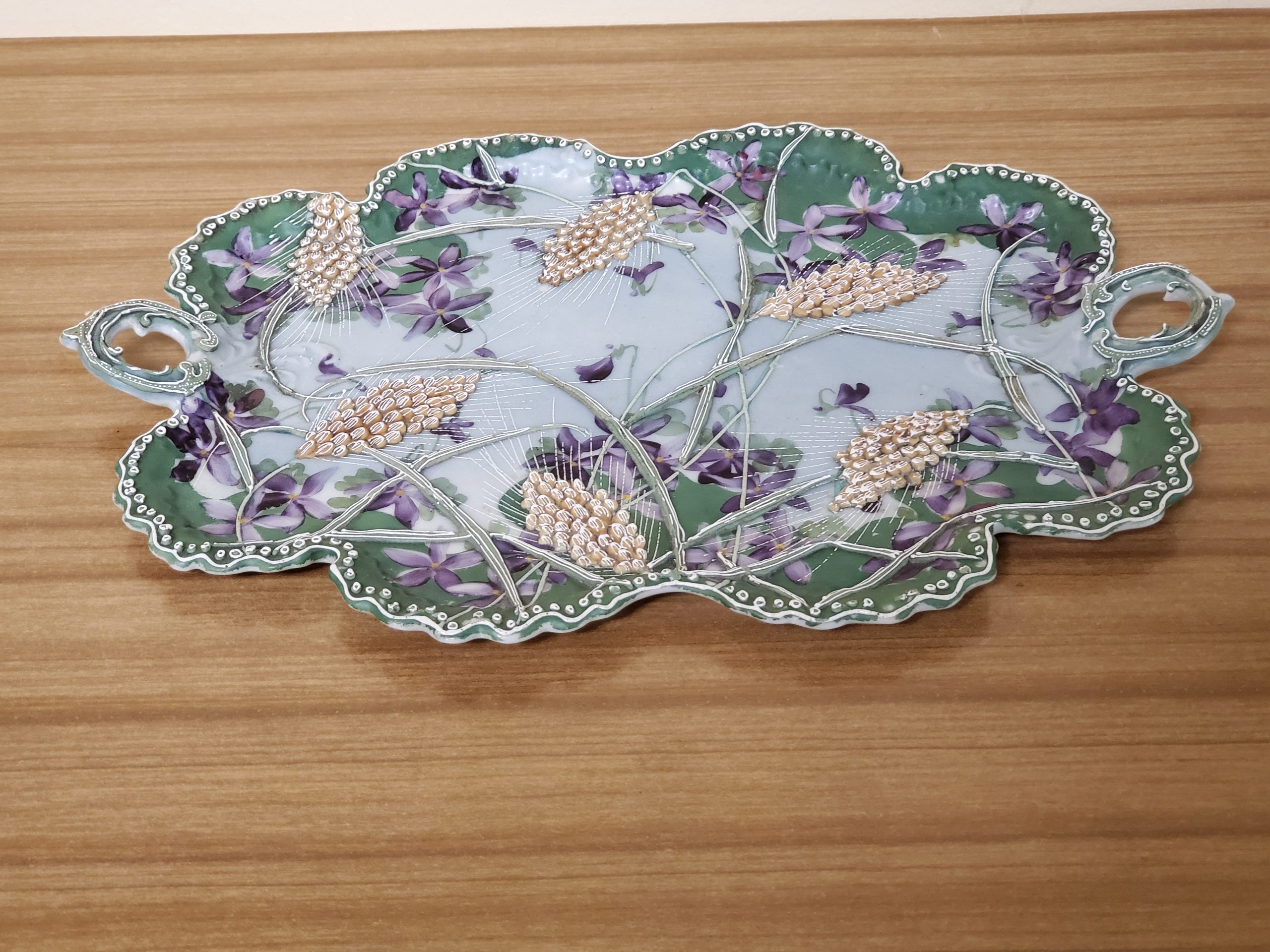 Antique moriage double handle tray, hand painted with violets and relief white flowers. Signed underneath ORIENTAL NIPPON CHINA. Circa 1910-1920.
