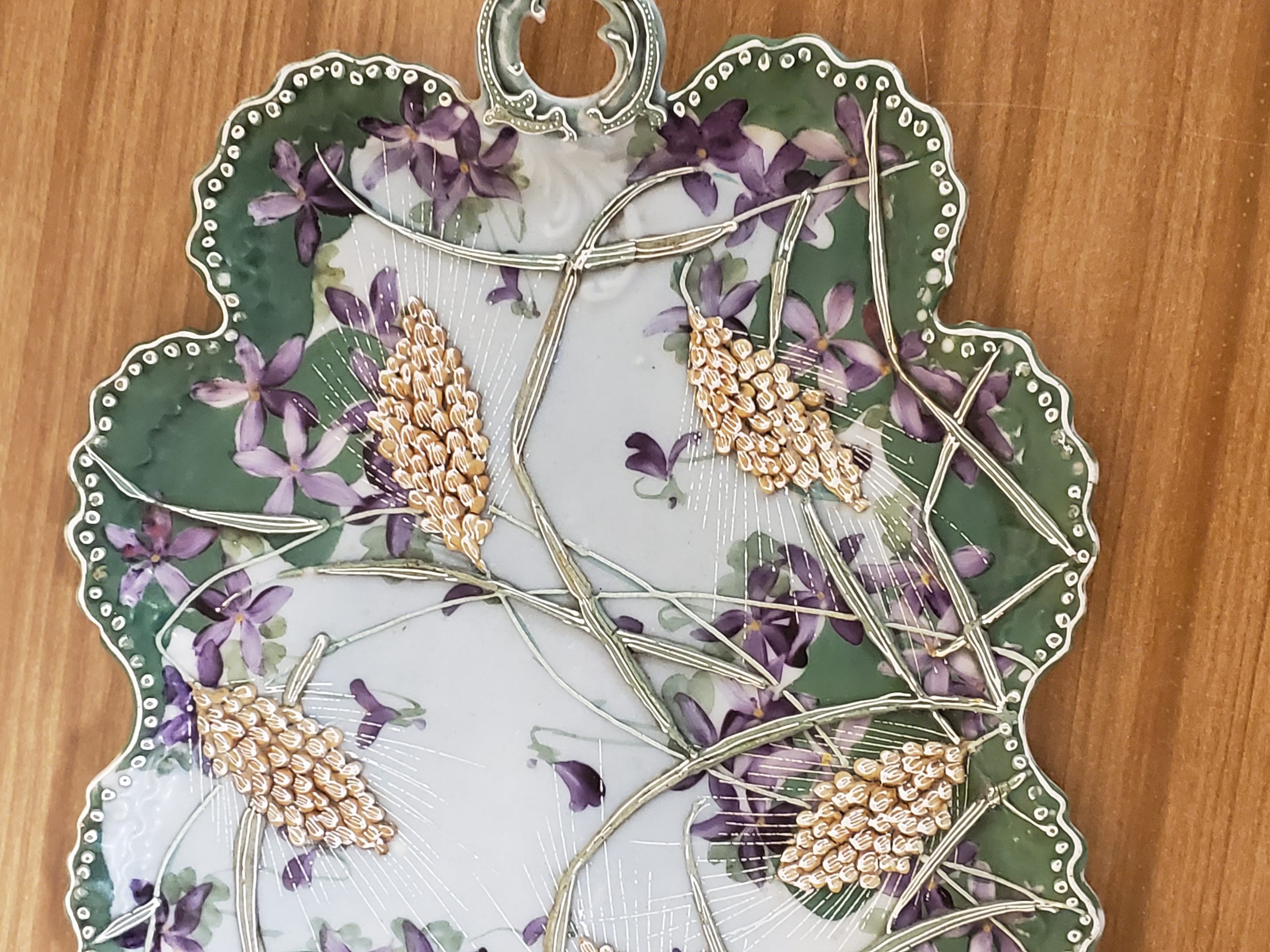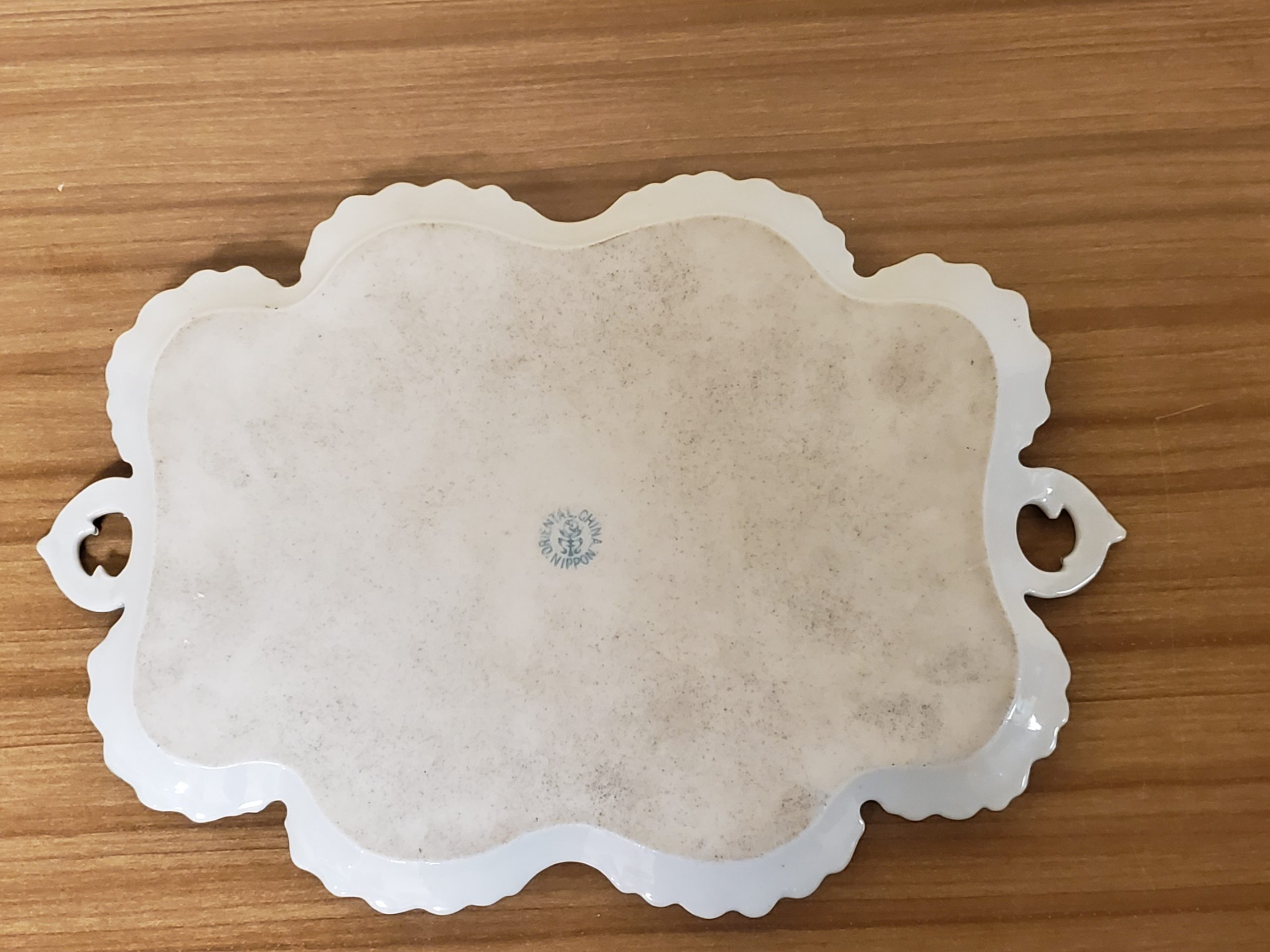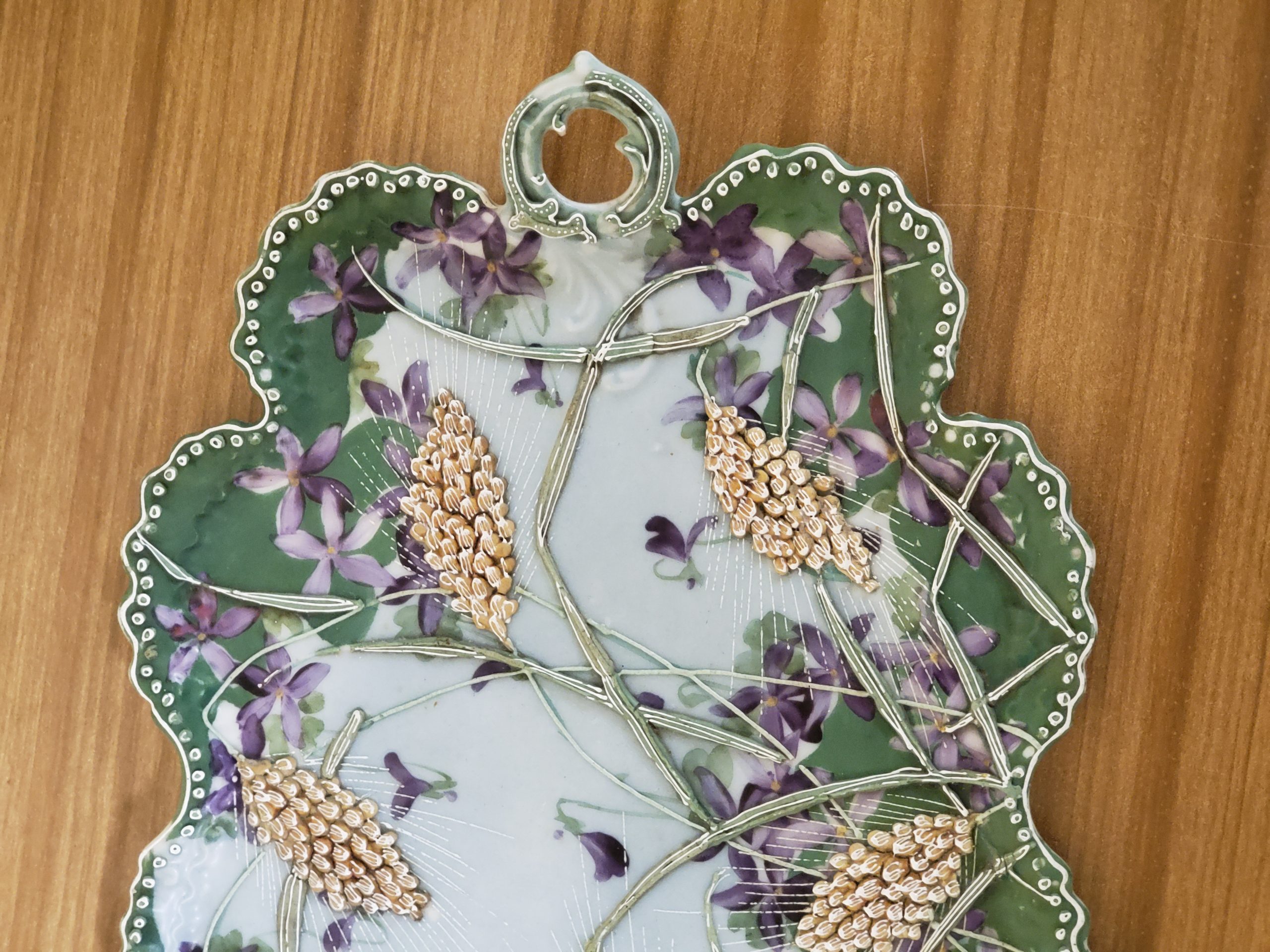 Antique moriage double handle tray, hand painted with violets and relief white flowers. Signed underneath ORIENTAL NIPPON CHINA. Circa 1910-1920.