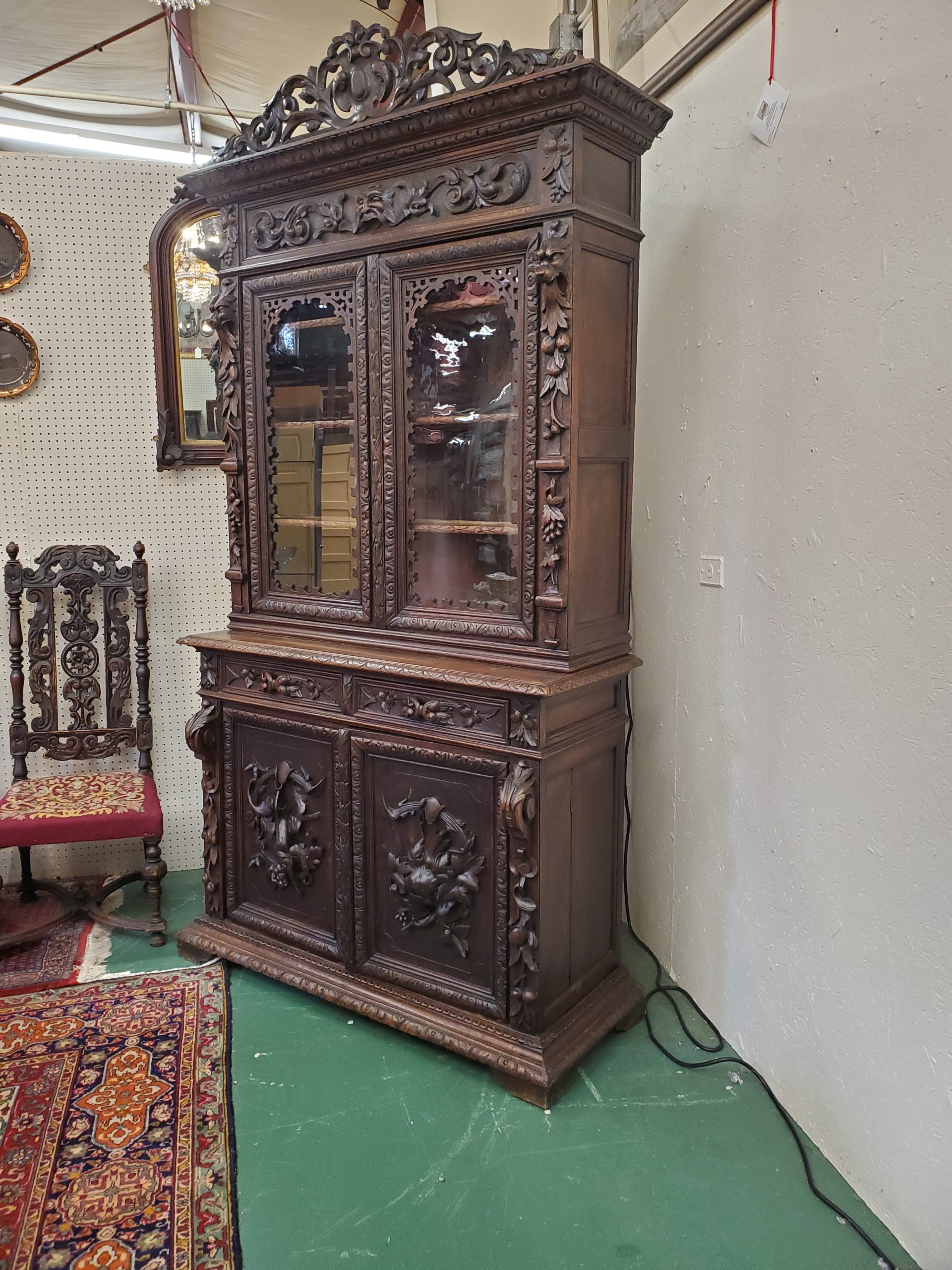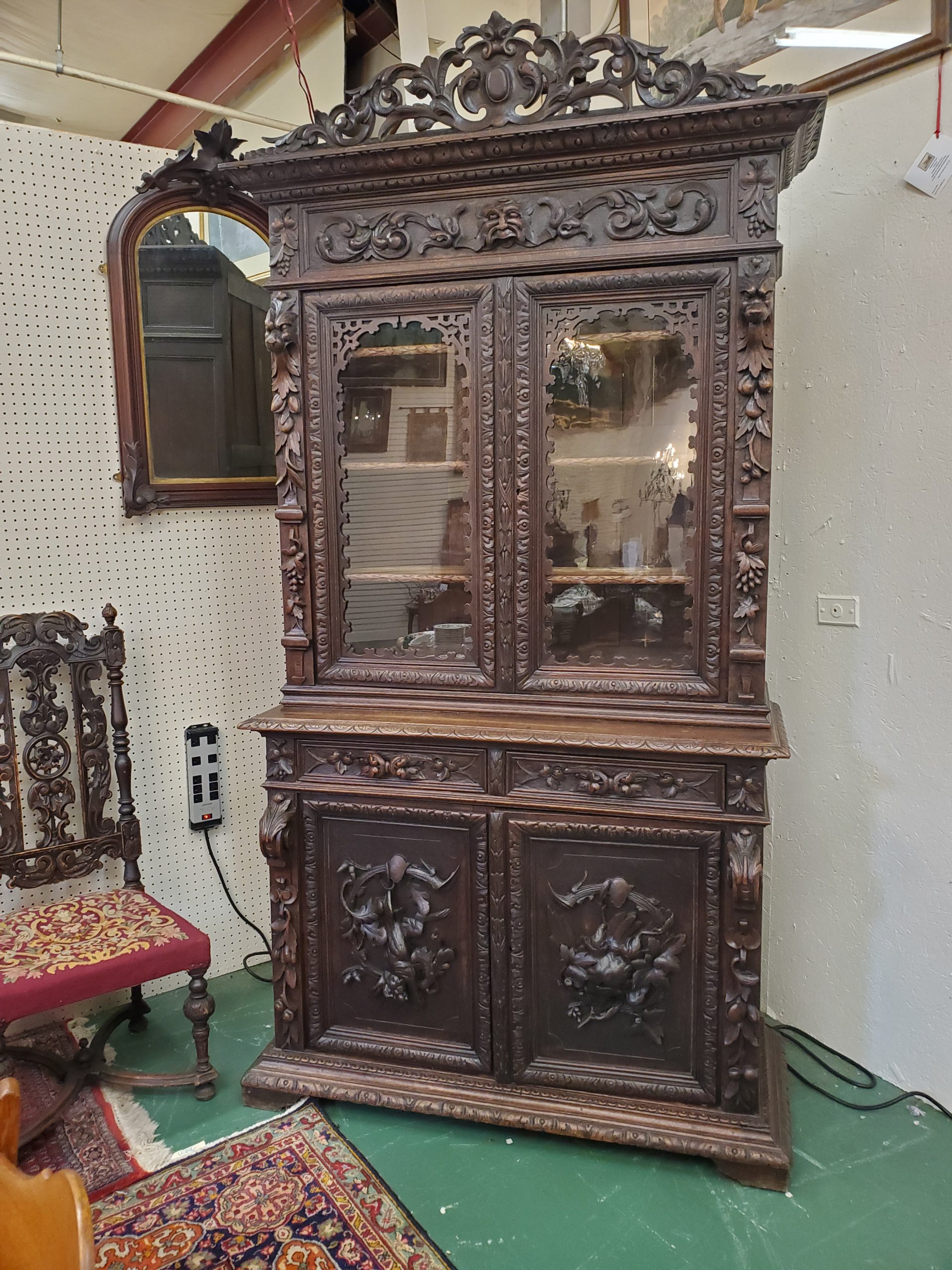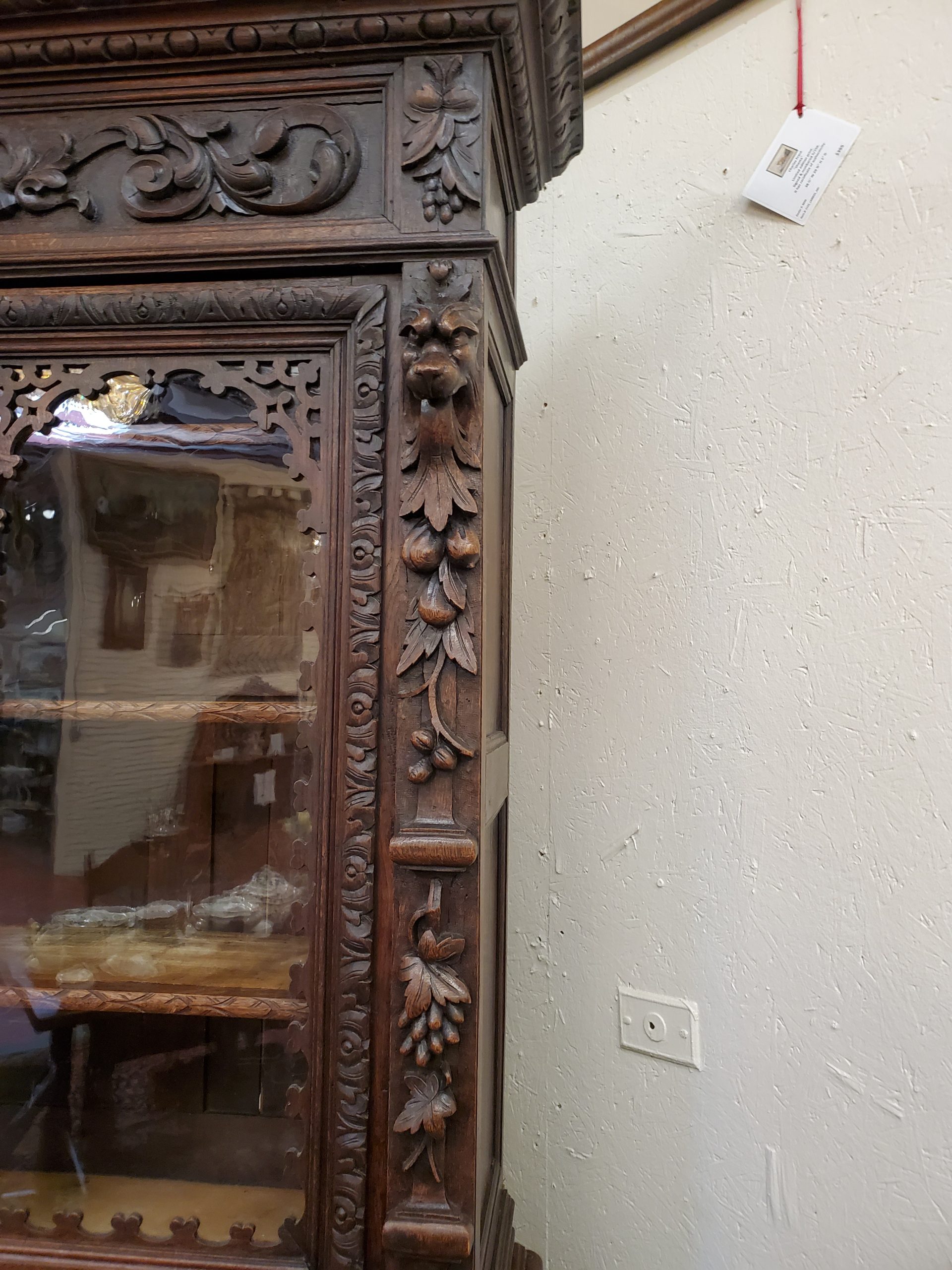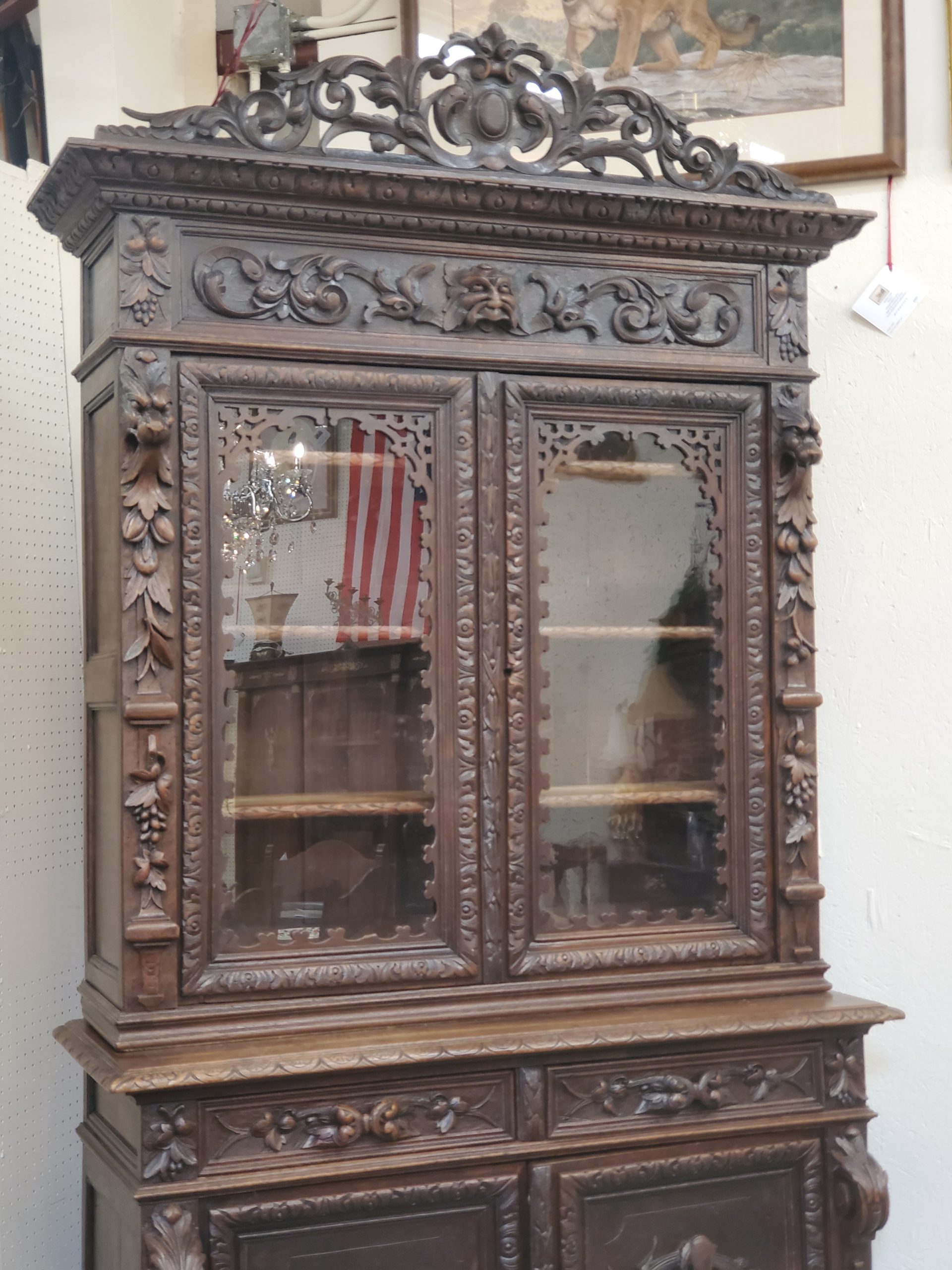 Beautiful antique hunter’s cabinet, upper cabinet has two leaded glass doors that open to reveal three wood shelves, the doors are flanked with grapes and leaves carvings, above the doors it has a lion head carving, and an intricate carving. The lower cabinet has two drawers with leaves carved handles and two carved doors depicting the hunter’s bounty, and a wood shelf inside.
