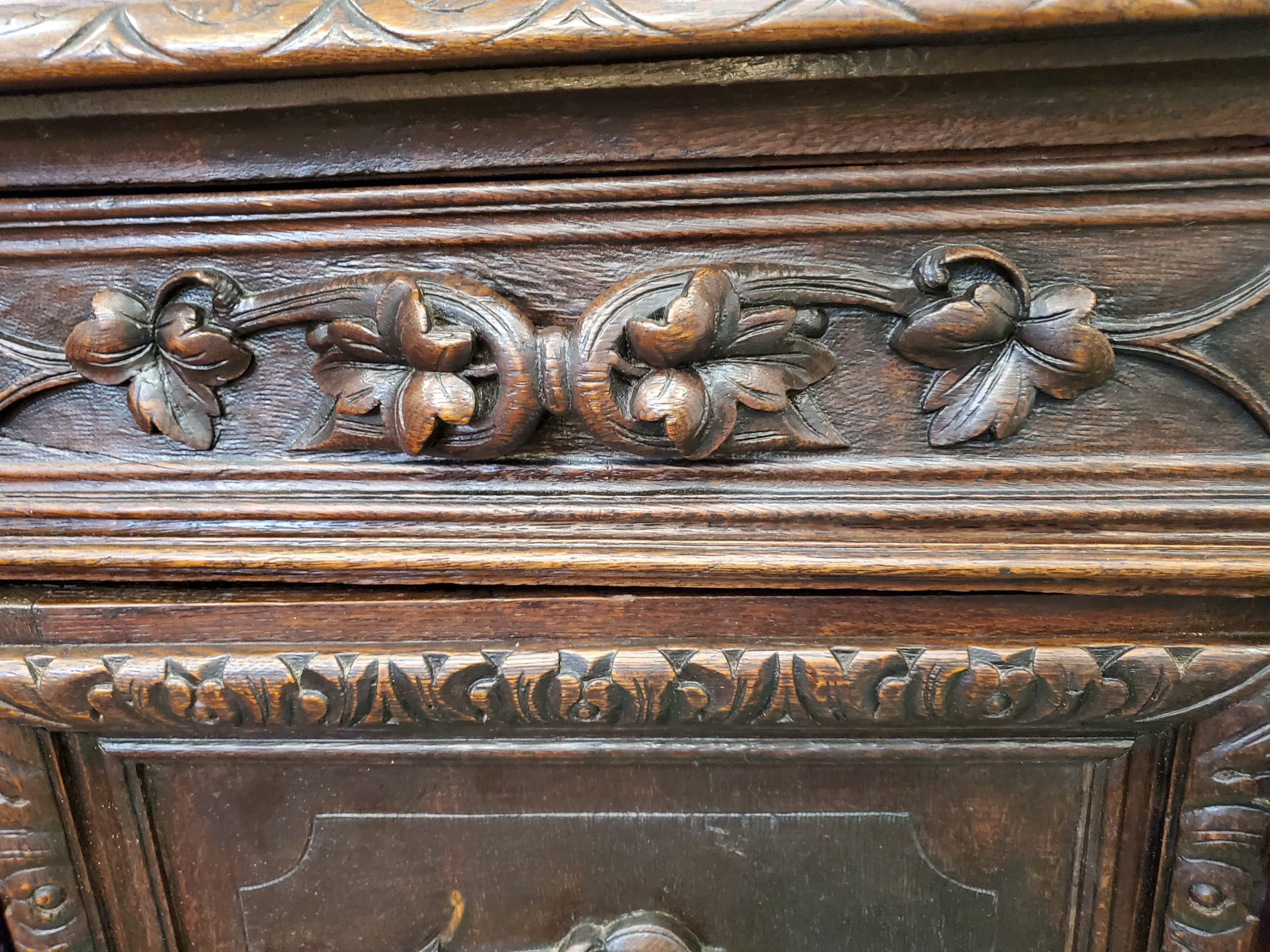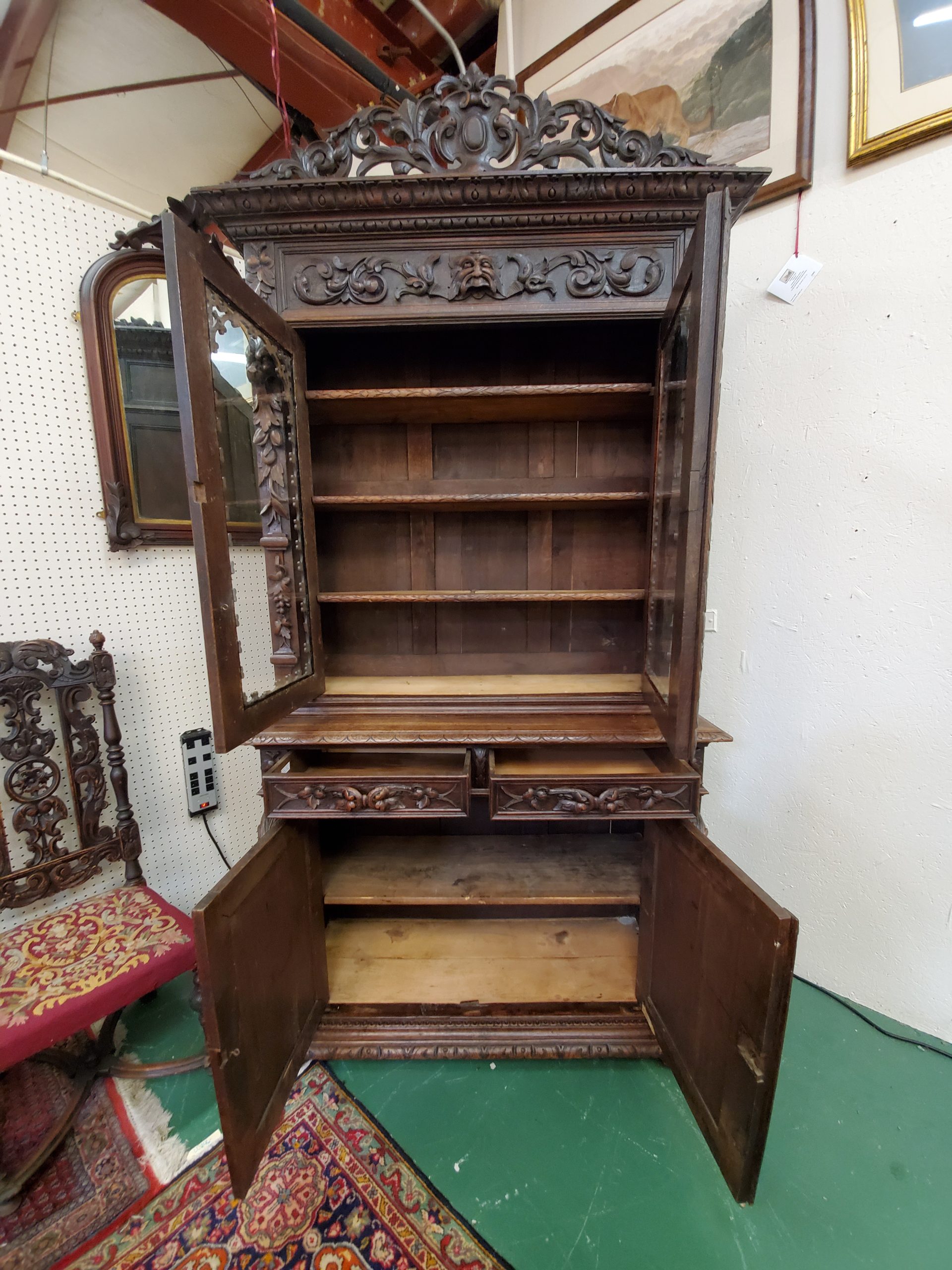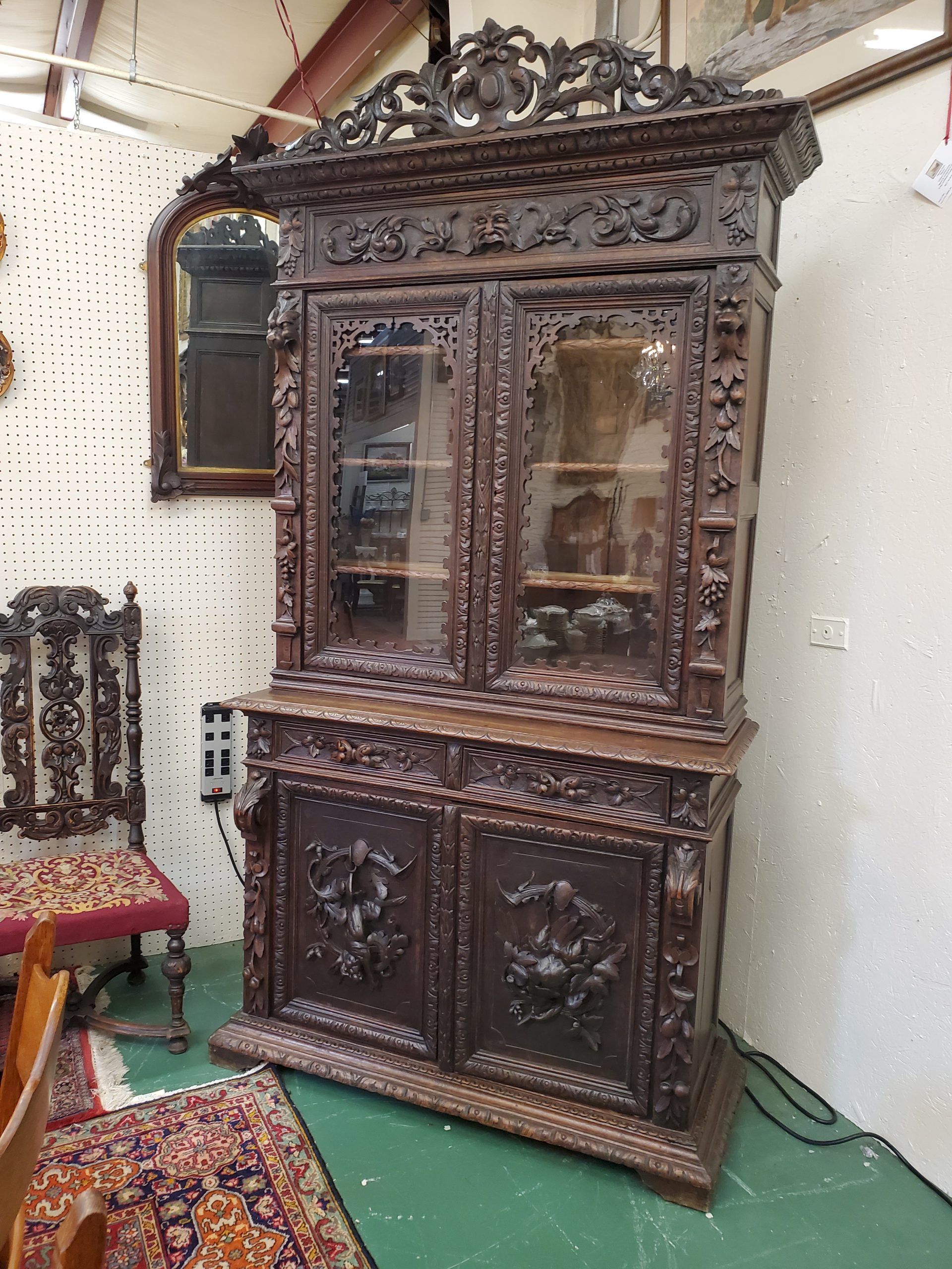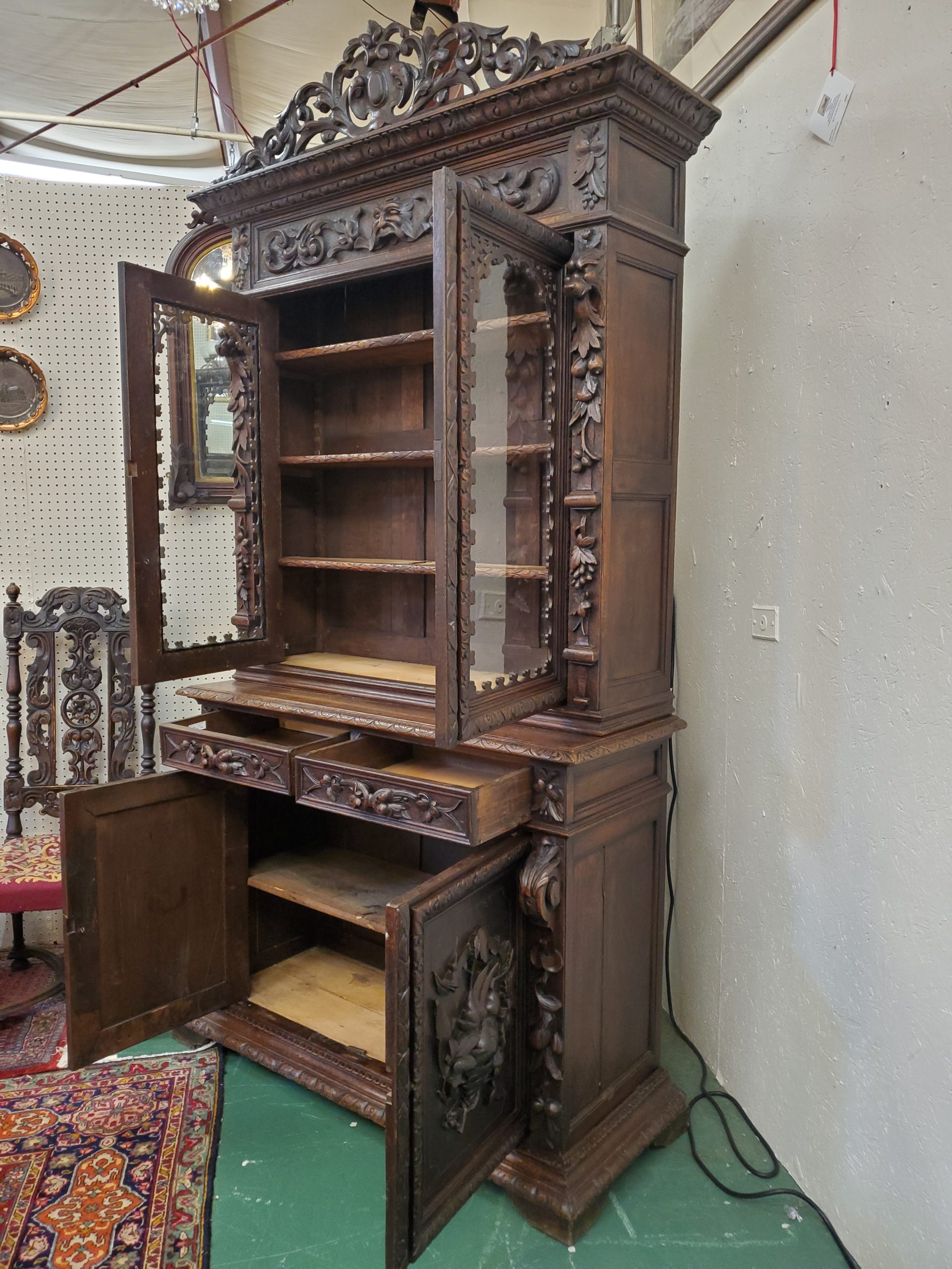 Beautiful antique hunter’s cabinet, upper cabinet has two leaded glass doors that open to reveal three wood shelves, the doors are flanked with grapes and leaves carvings, above the doors it has a lion head carving, and an intricate carving. The lower cabinet has two drawers with leaves carved handles and two carved doors depicting the hunter’s bounty, and a wood shelf inside.