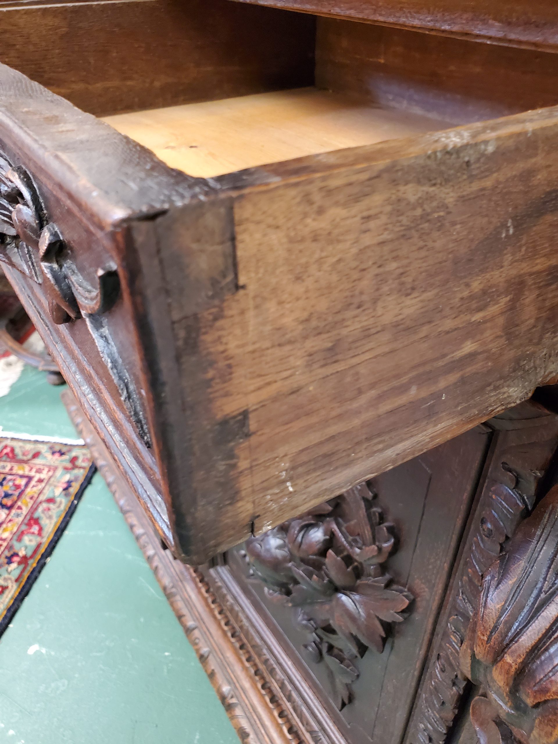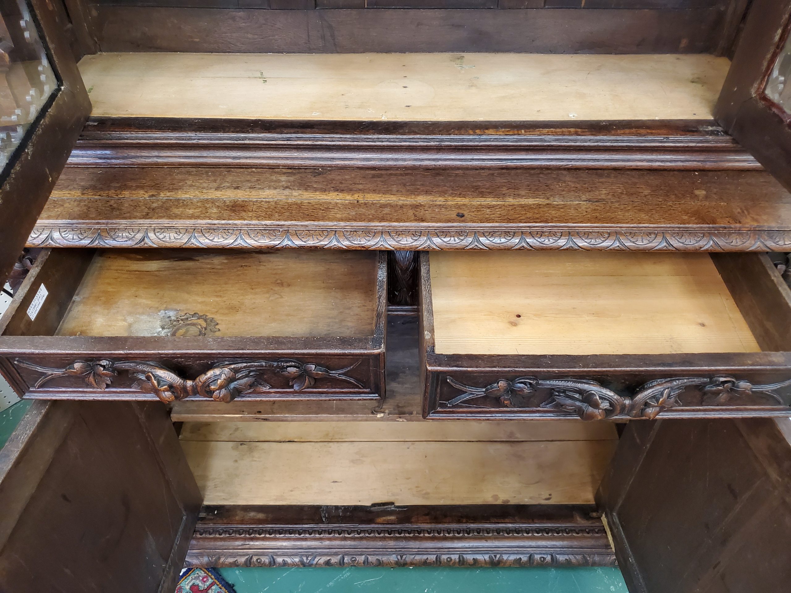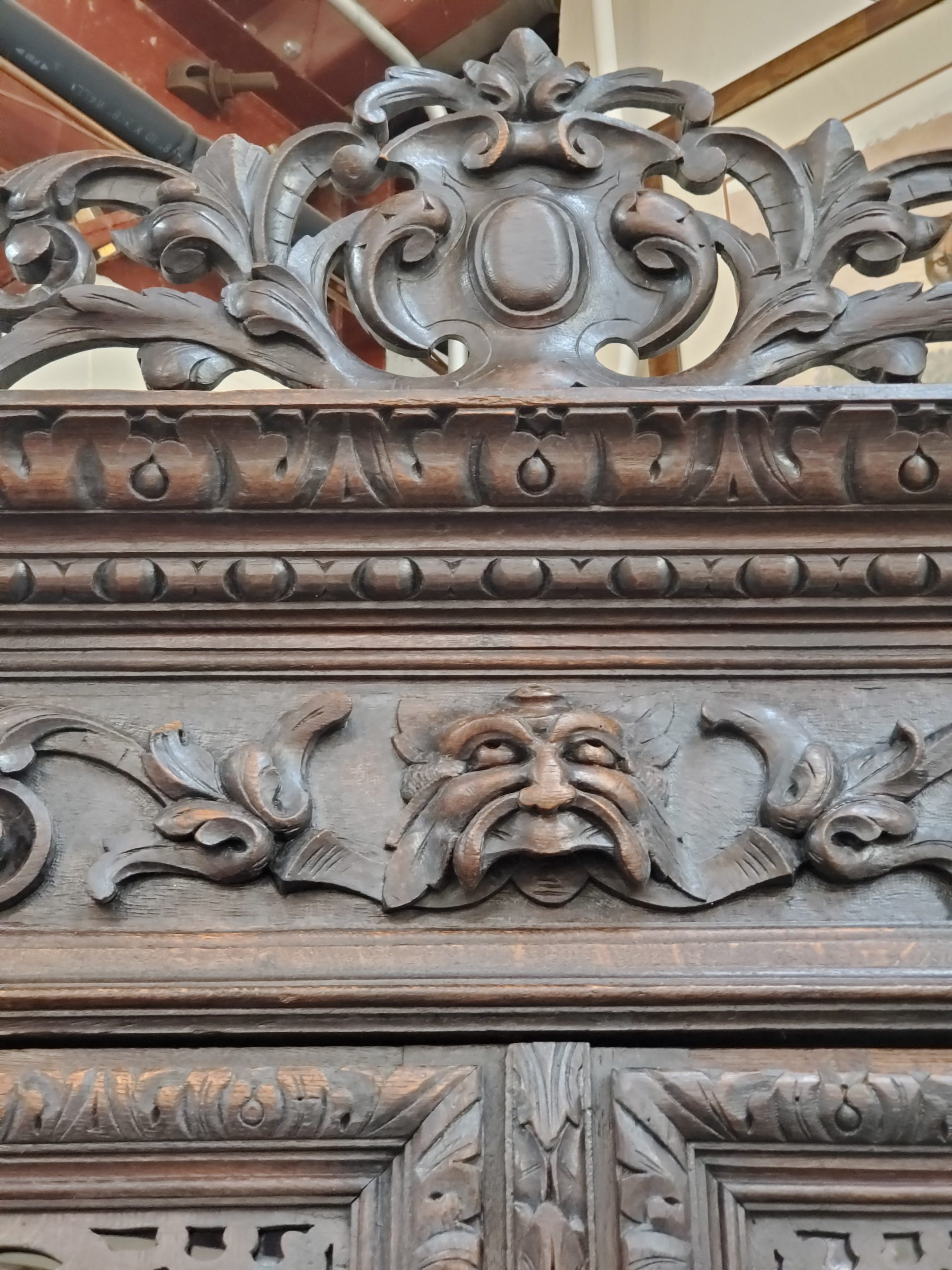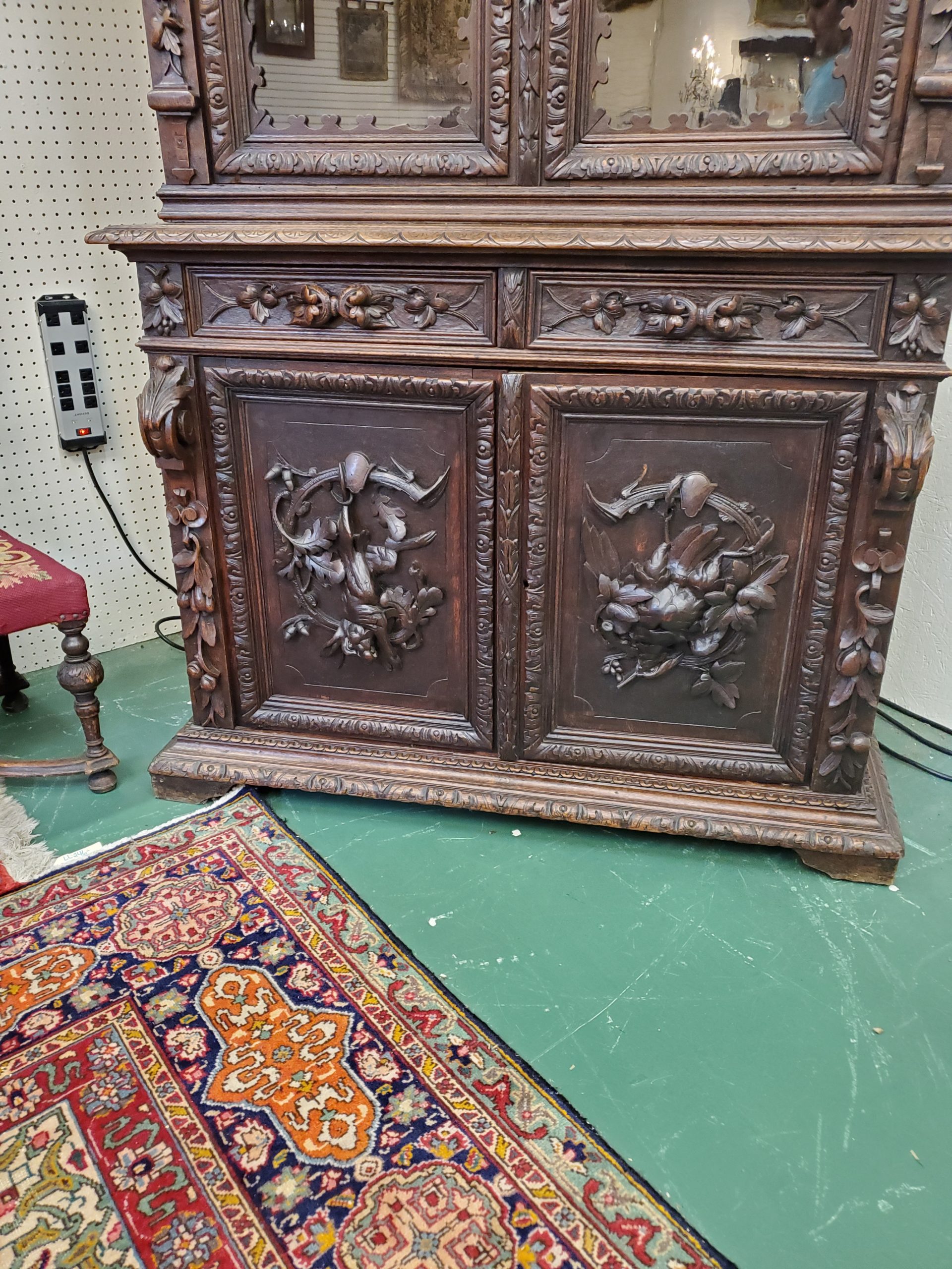 Beautiful antique hunter’s cabinet, upper cabinet has two leaded glass doors that open to reveal three wood shelves, the doors are flanked with grapes and leaves carvings, above the doors it has a lion head carving, and an intricate carving. The lower cabinet has two drawers with leaves carved handles and two carved doors depicting the hunter’s bounty, and a wood shelf inside.