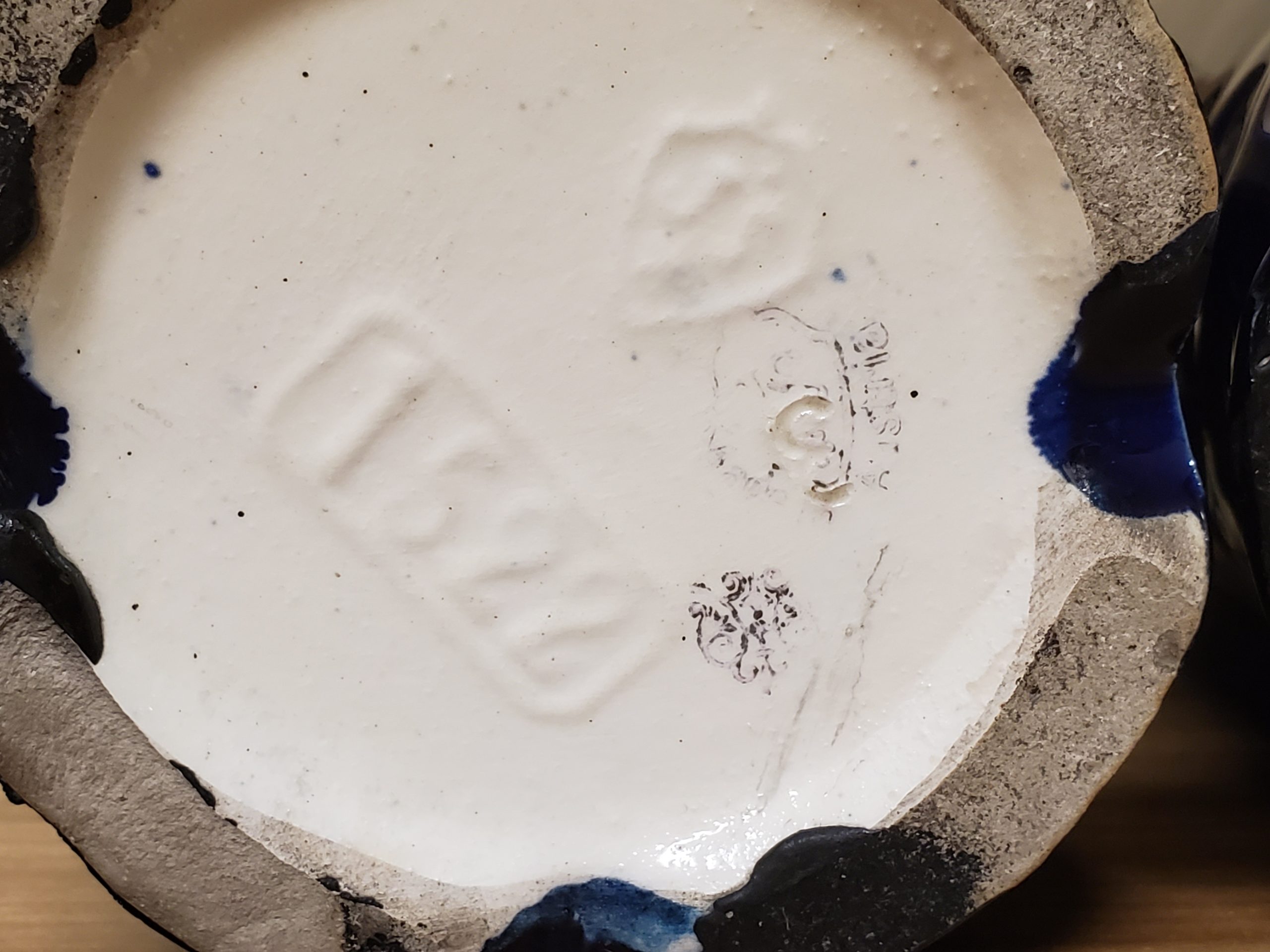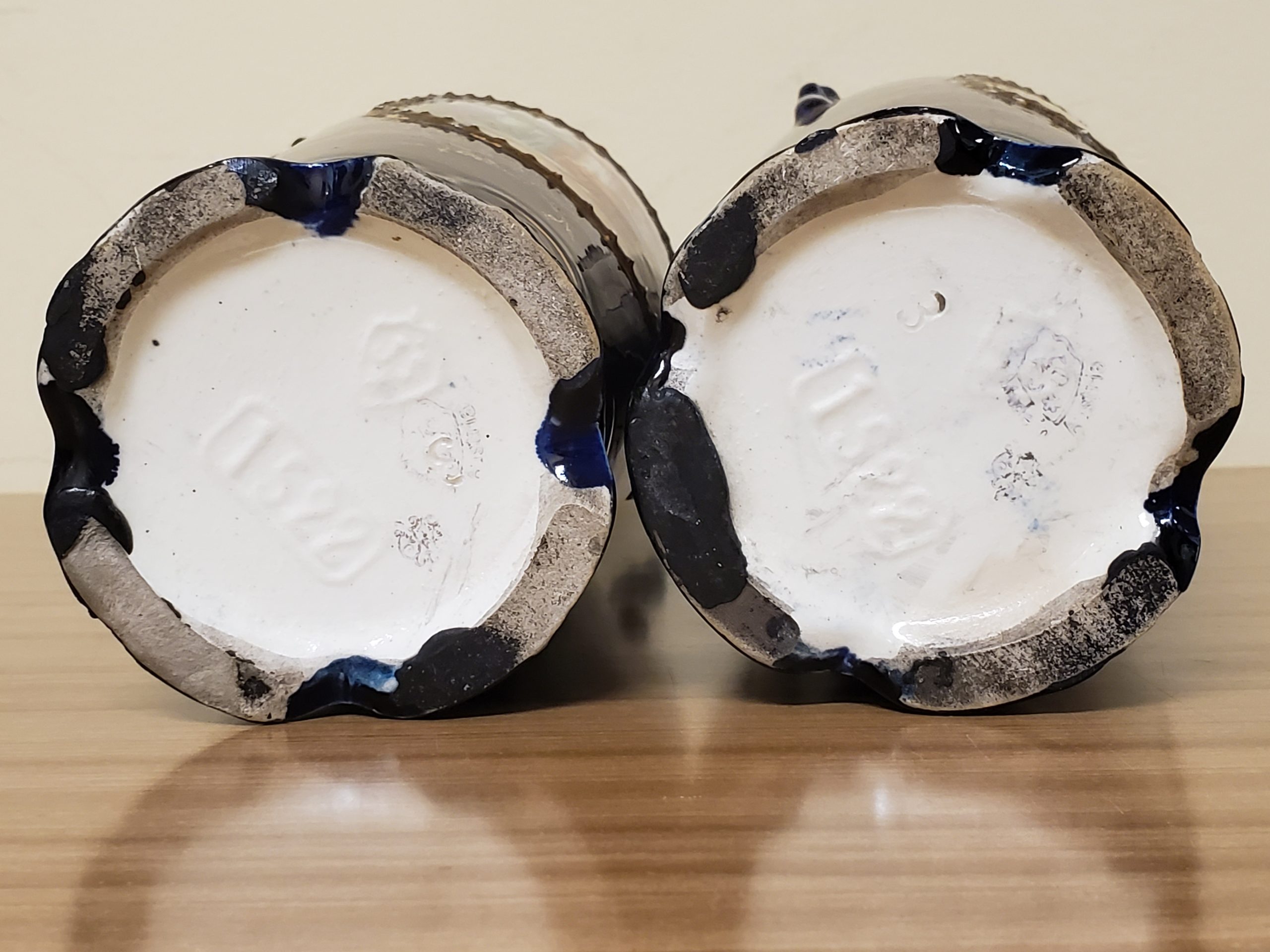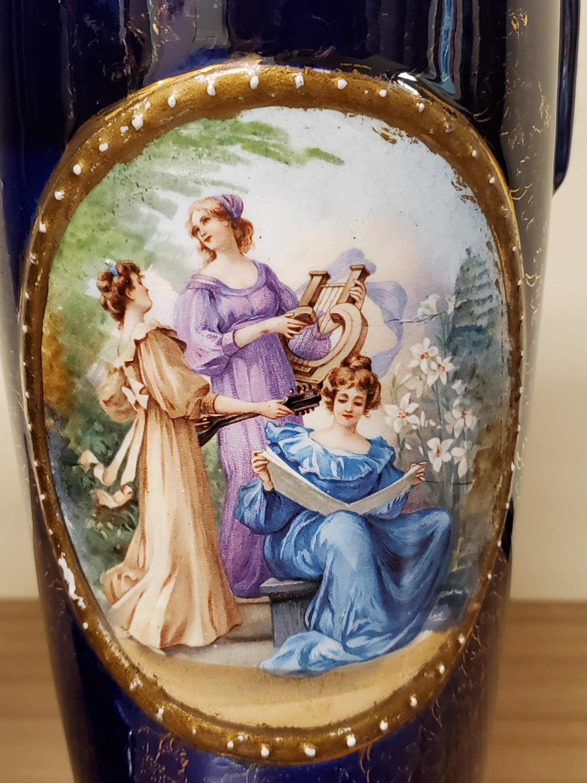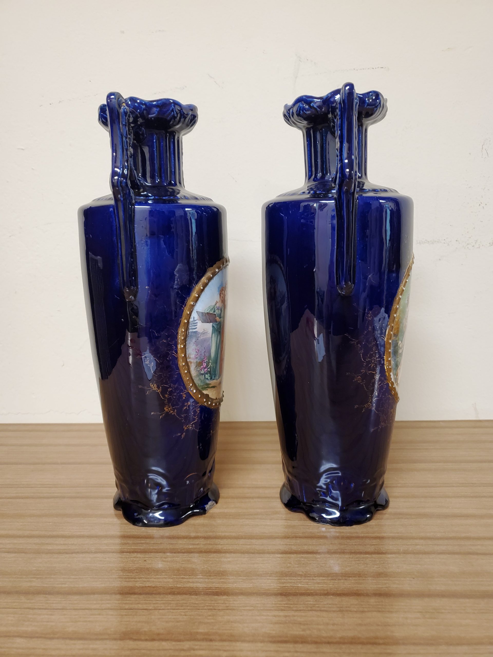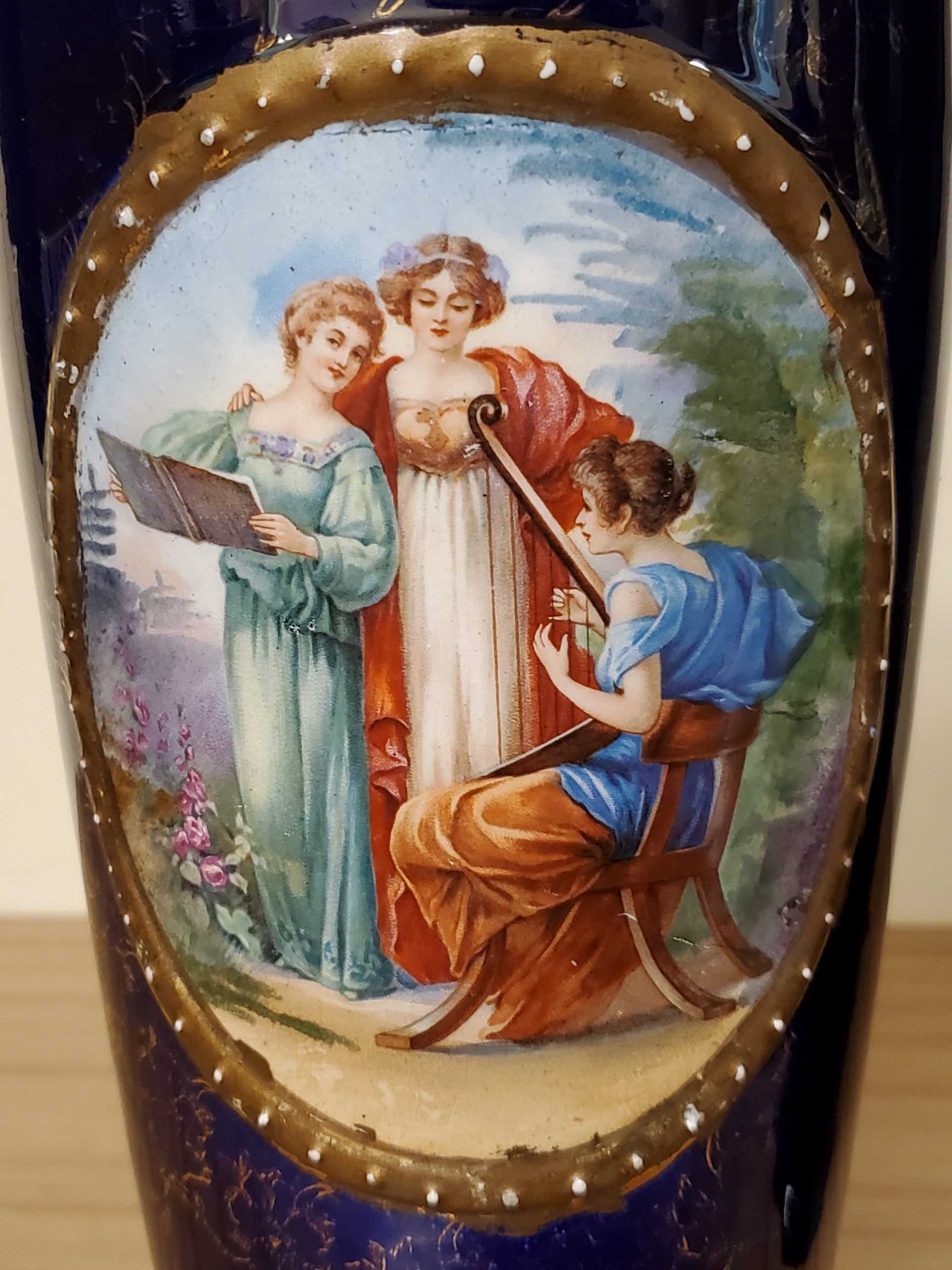 Antique vases with a central medallion of maidens surrounded by a blue and gilt border on a cobalt background.