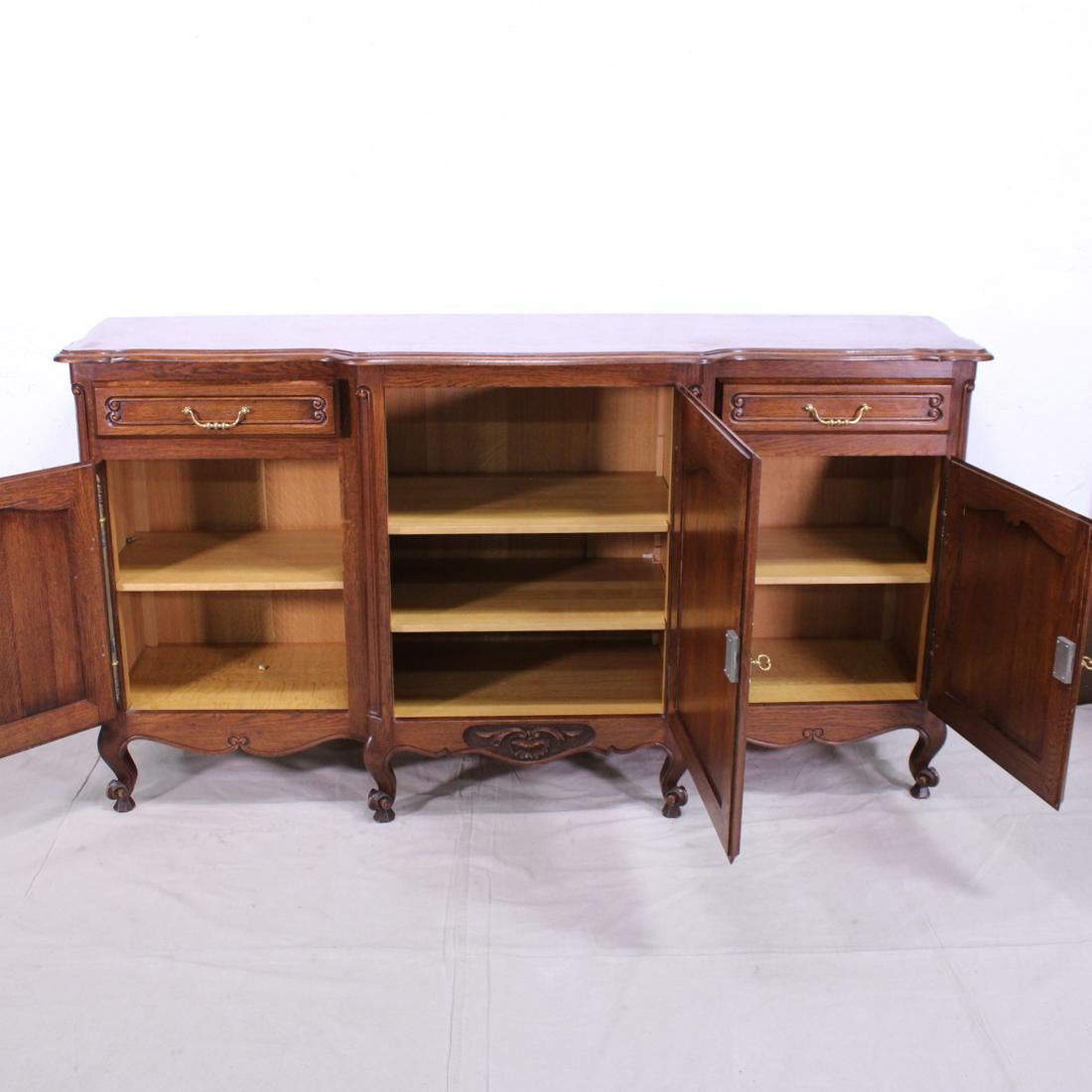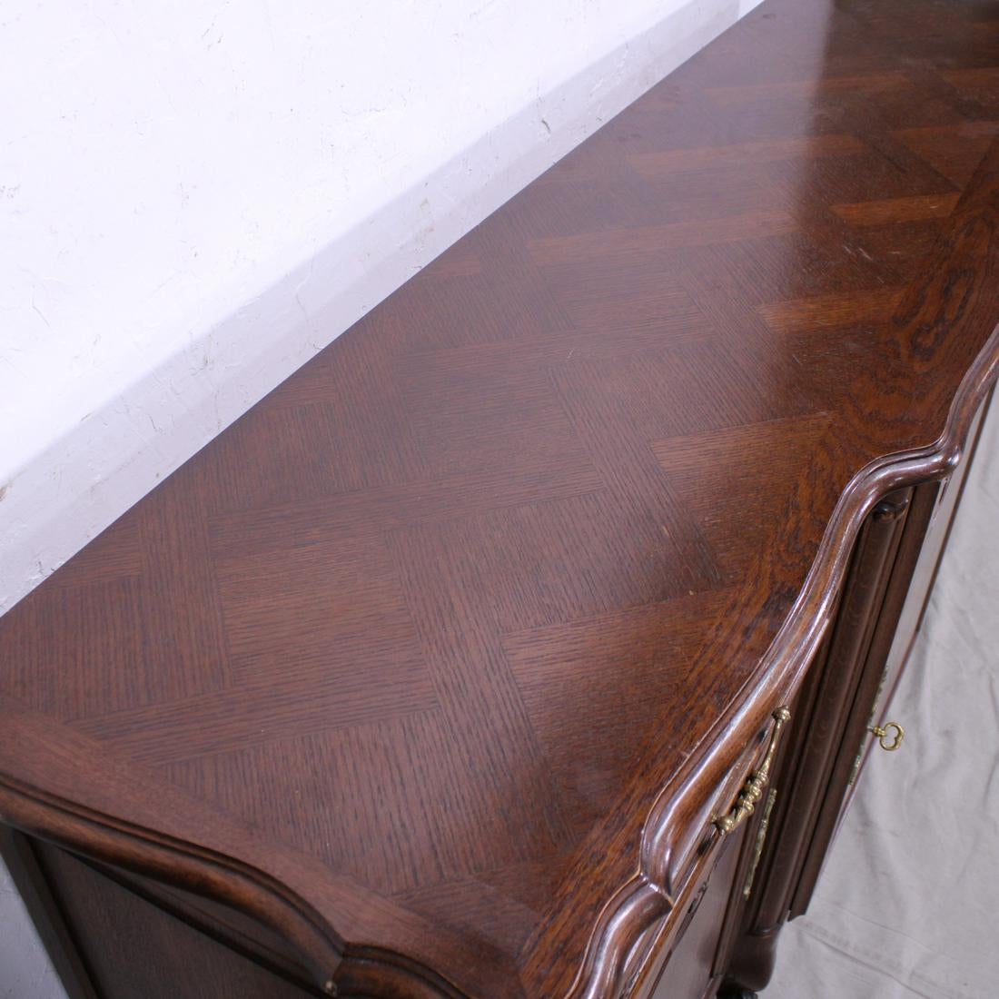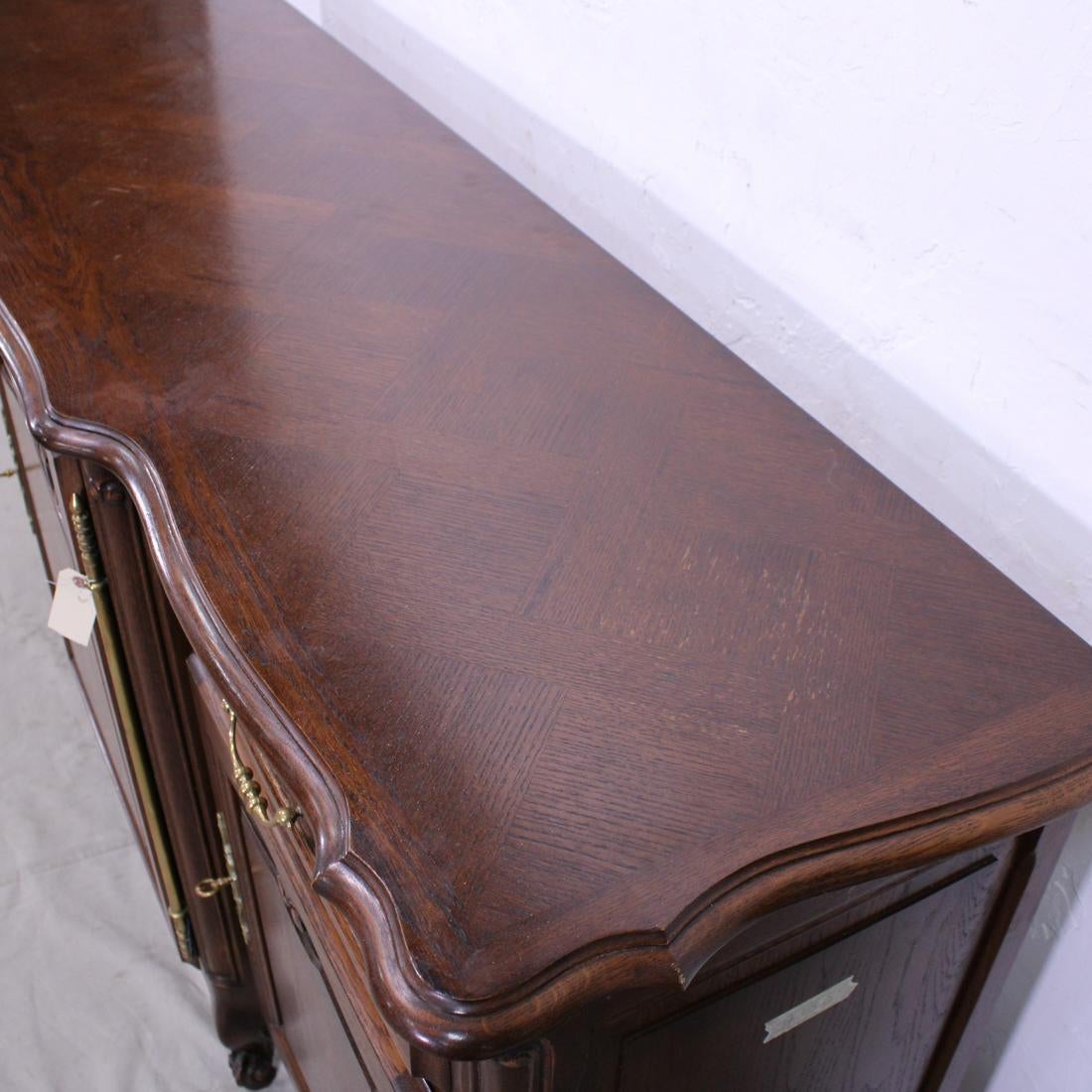 Antique Louis XV style parquet top sideboard from the turn of the century. Beautiful carved details on doors with one central door flanked by a drawer and a door on each side, the doors open to reveal wood shelves inside, ending in cabriole legs.