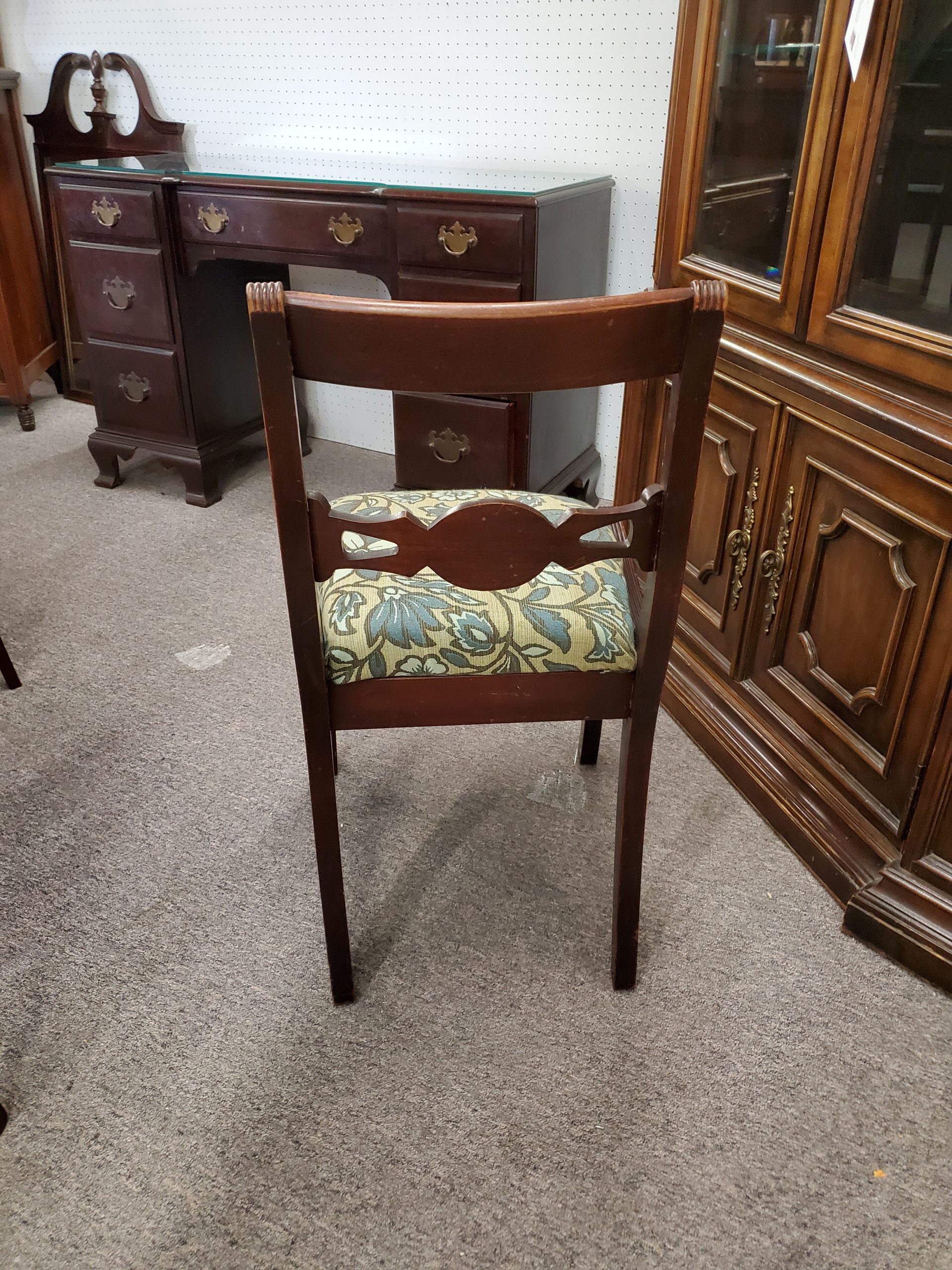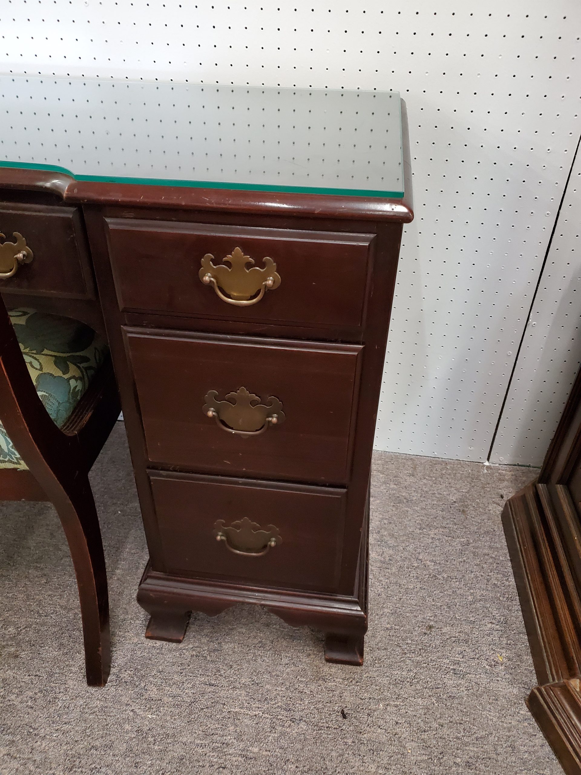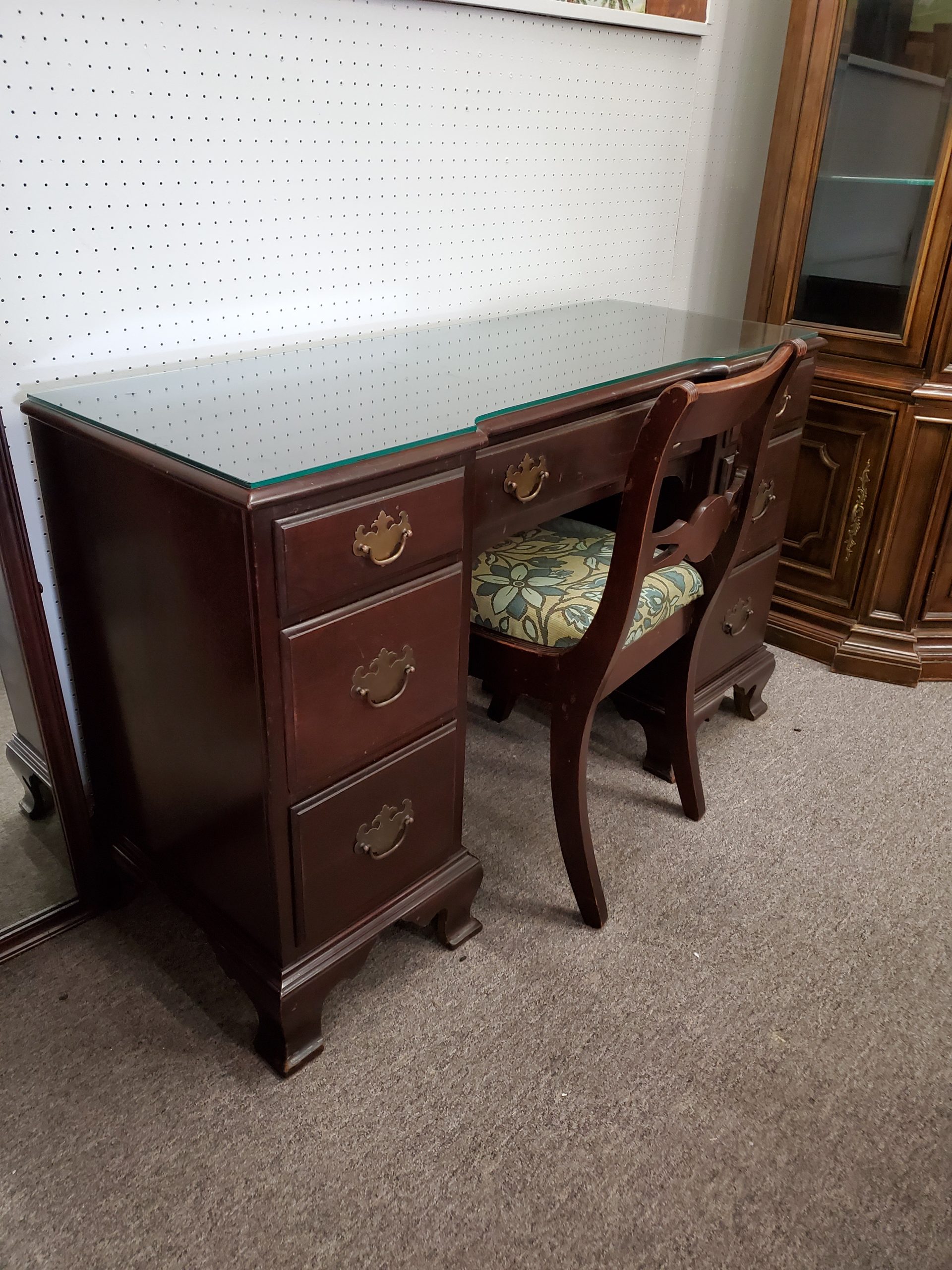 Vintage Mahogany desk and chair. The desk has a central drawer flanked by a drawer on each side and two deep drawers under them. Manufactured by Owosso Mfg Company circa 1940’s-1950’s. The chair has an oval central slat with green flower upholstery.