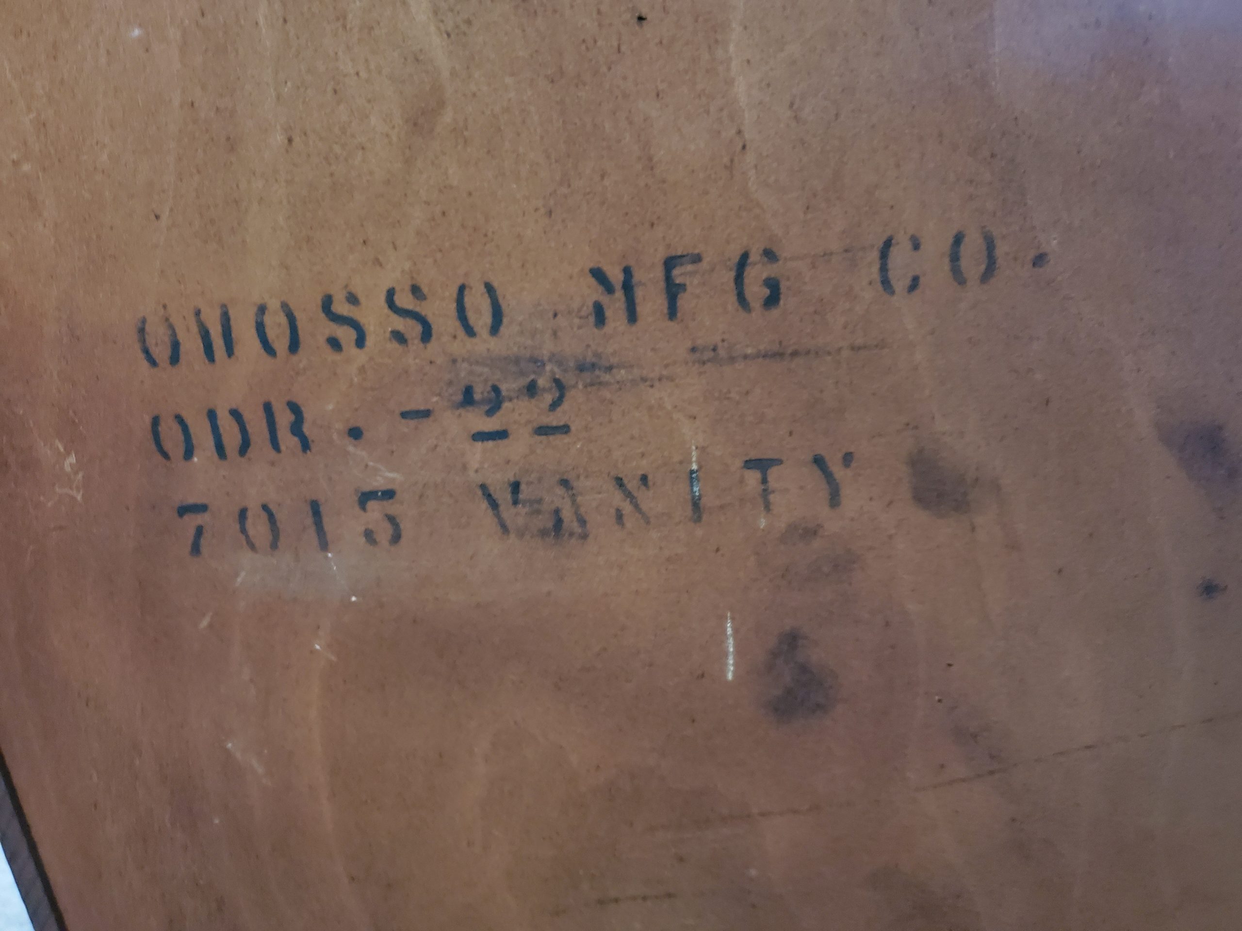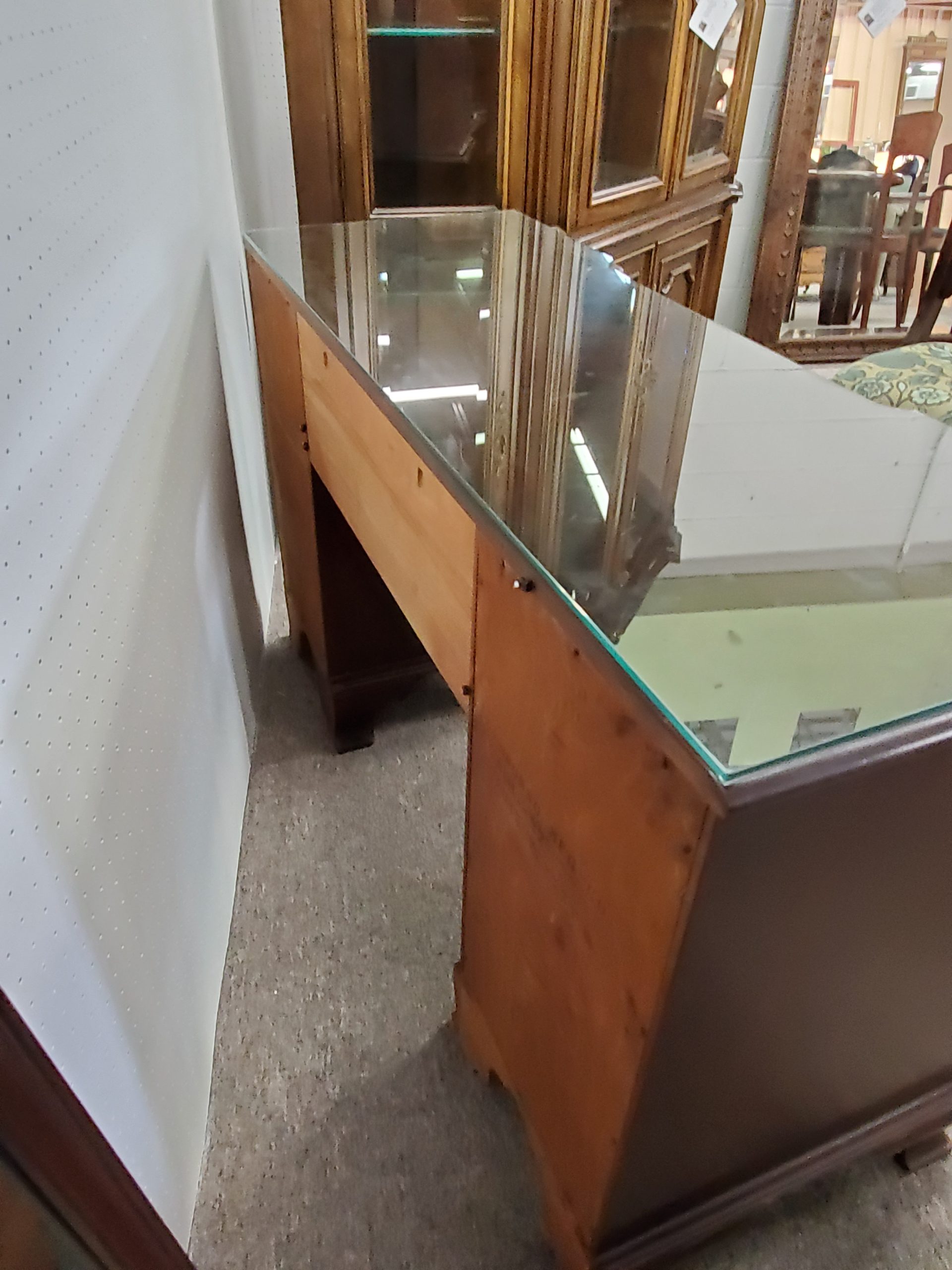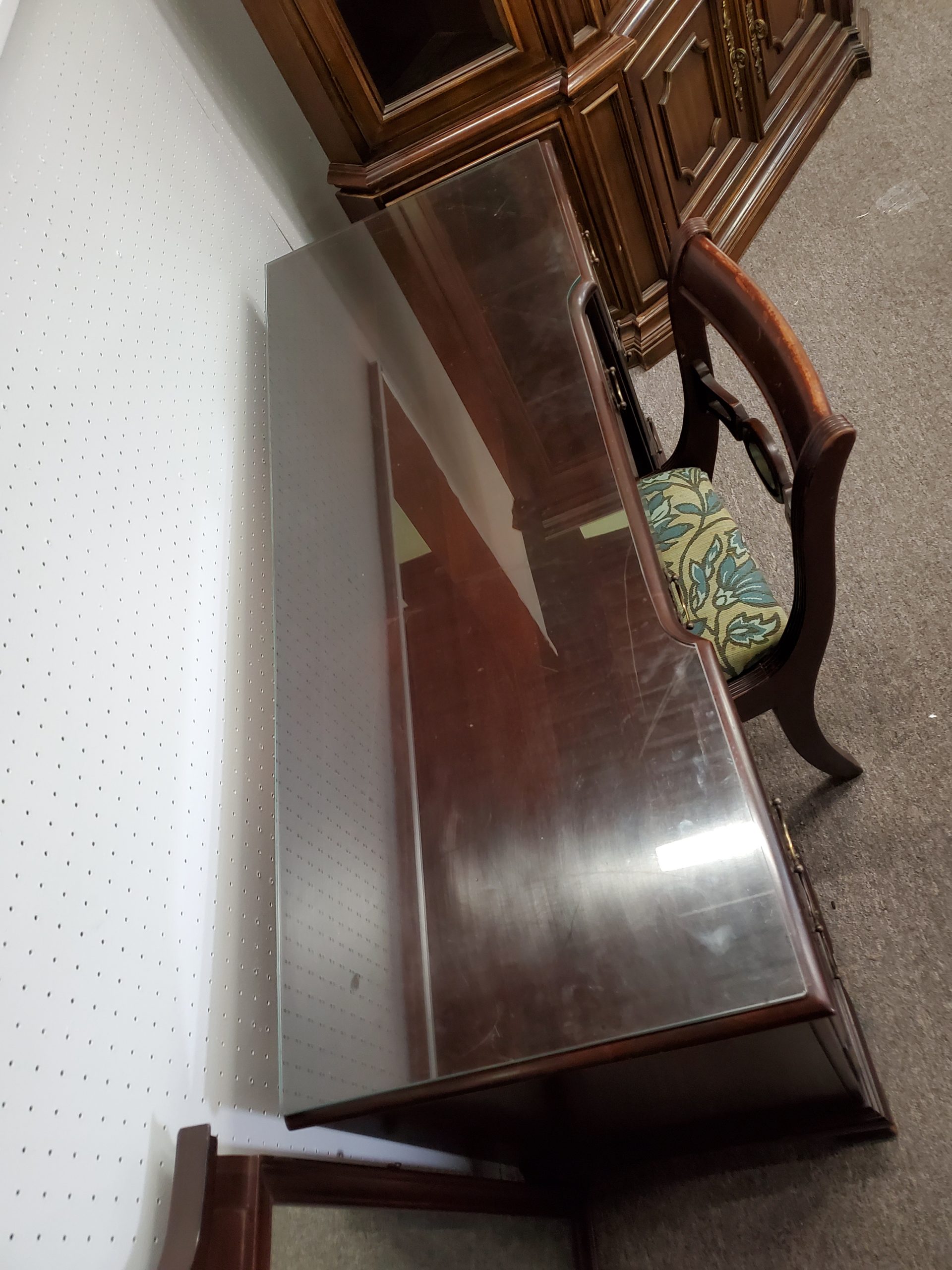 Vintage Mahogany desk and chair. The desk has a central drawer flanked by a drawer on each side and two deep drawers under them. Manufactured by Owosso Mfg Company circa 1940’s-1950’s. The chair has an oval central slat with green flower upholstery.