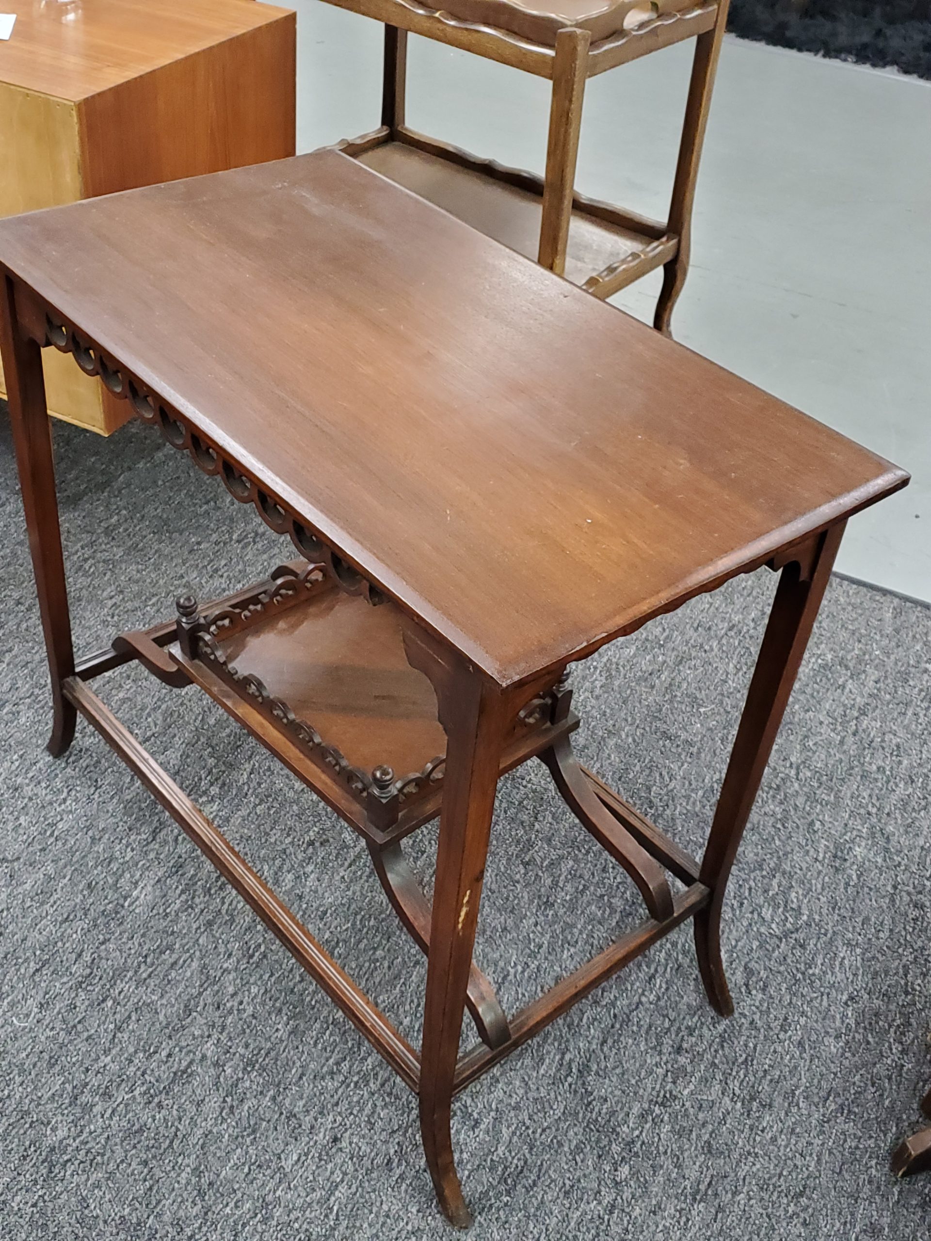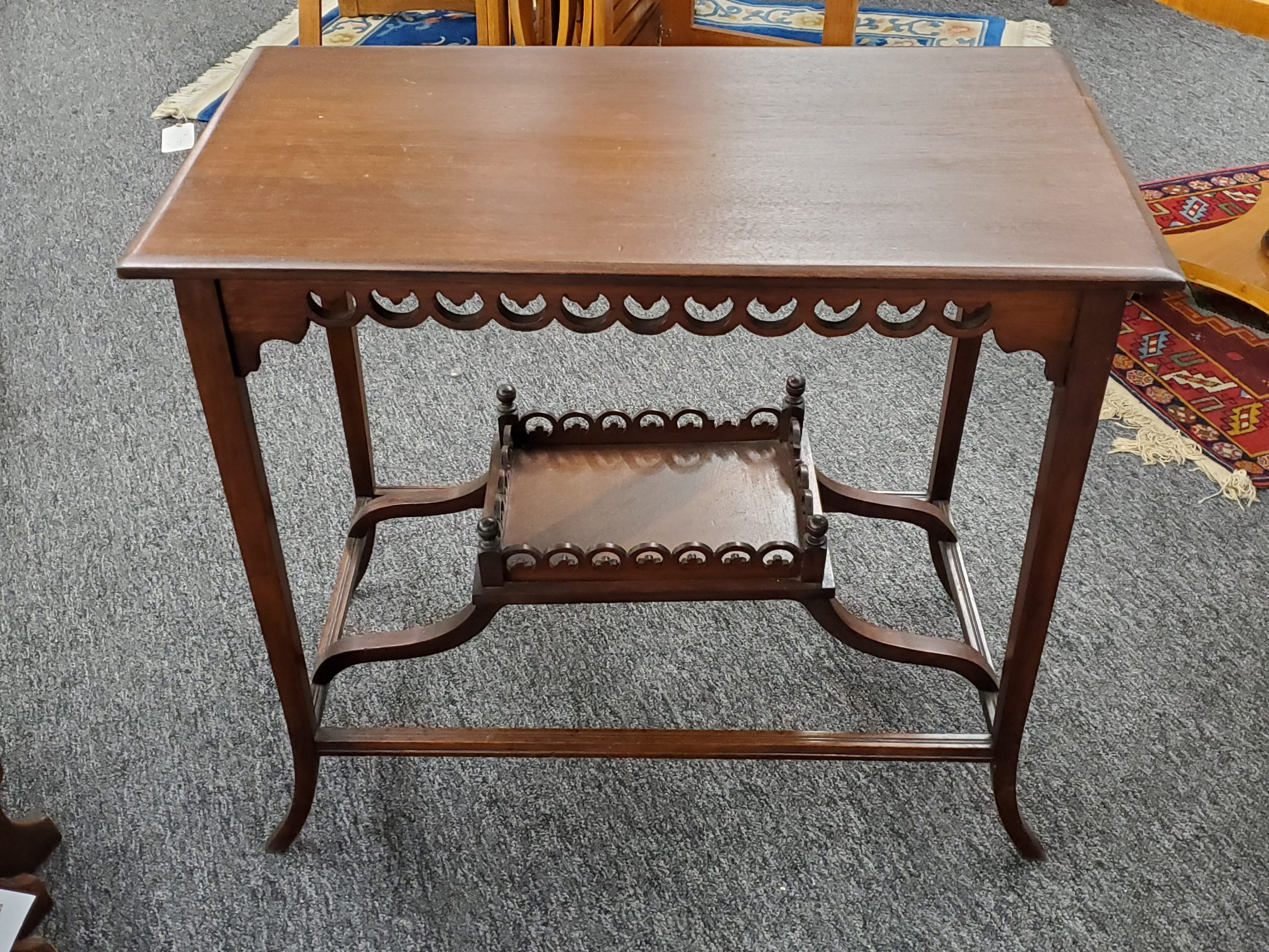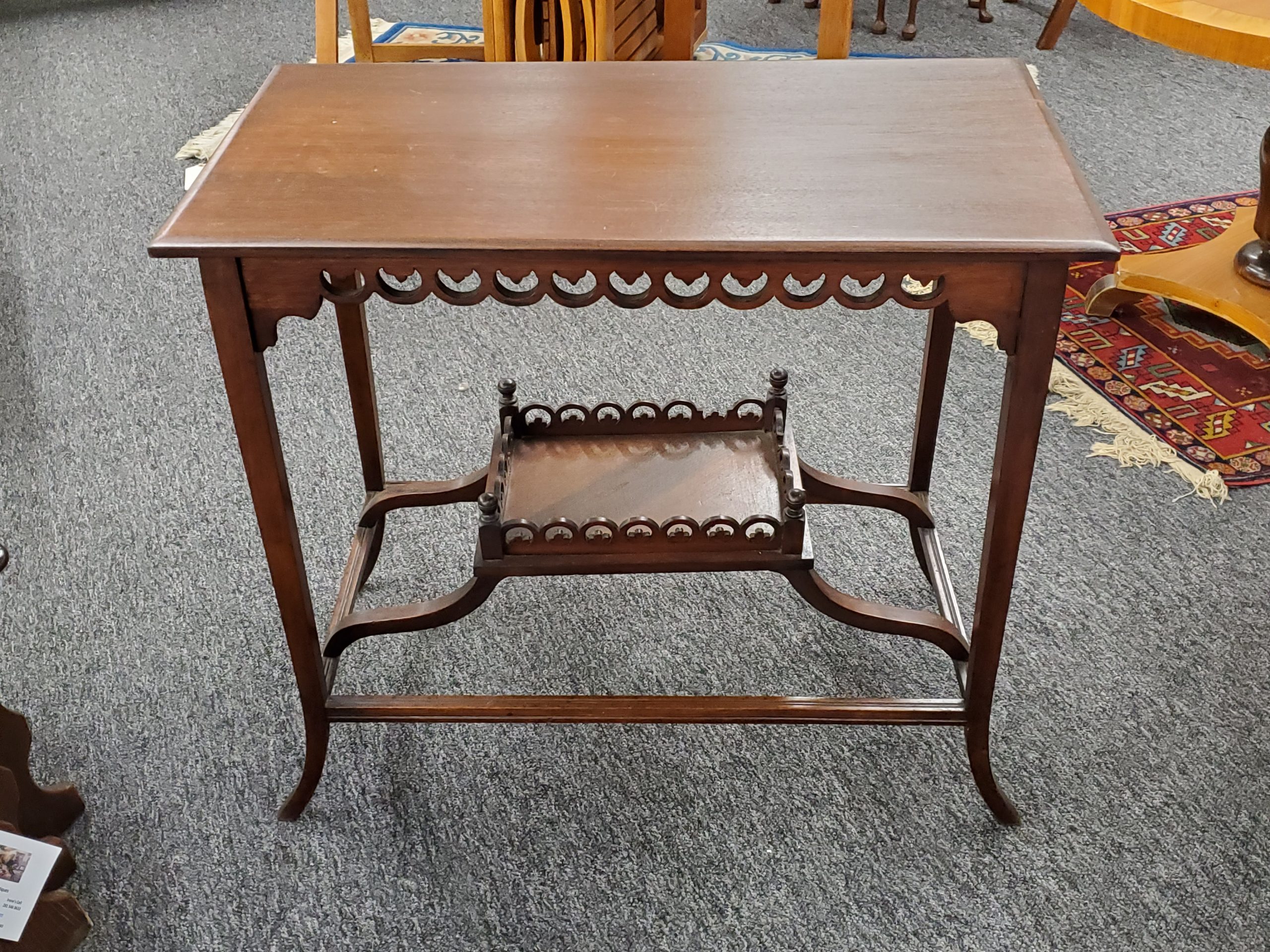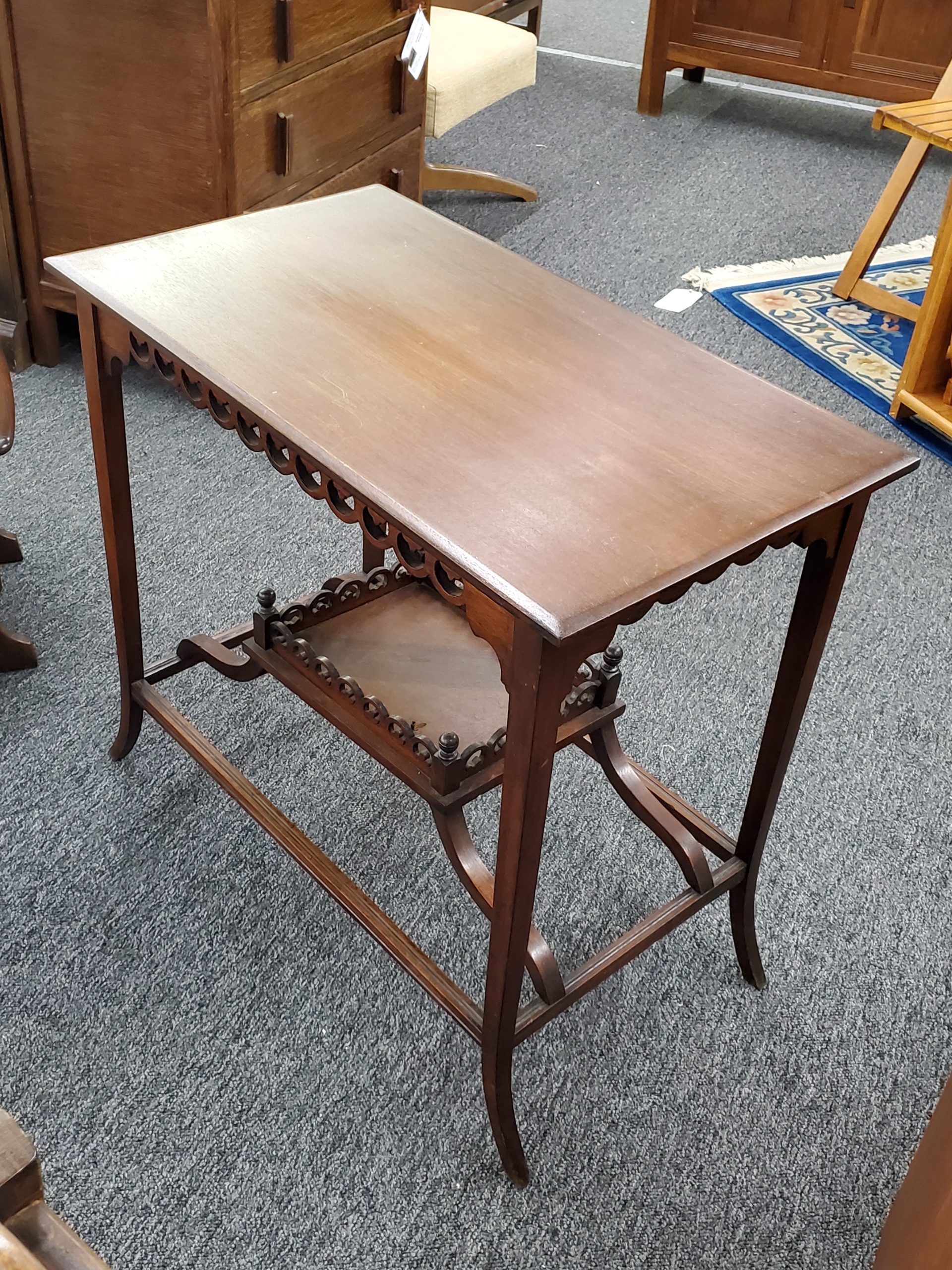 Antique mahogany two tier occasional table, it has a decorative apron and a bottom shelf with pierced design and finials on each corner.