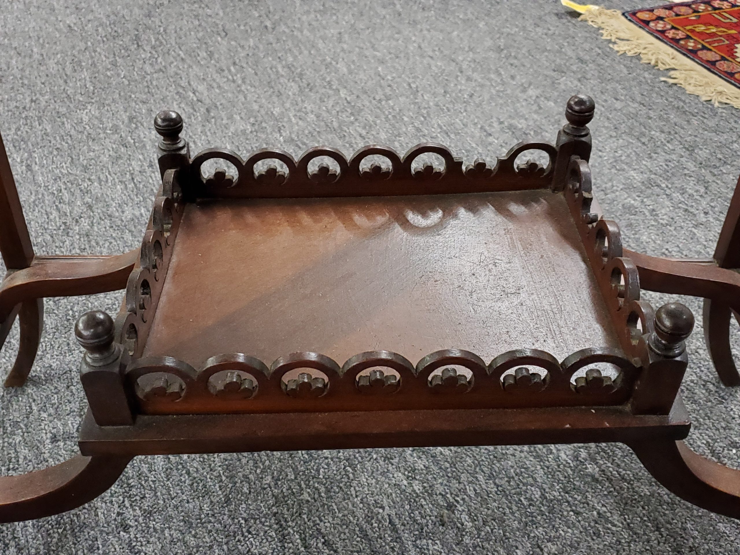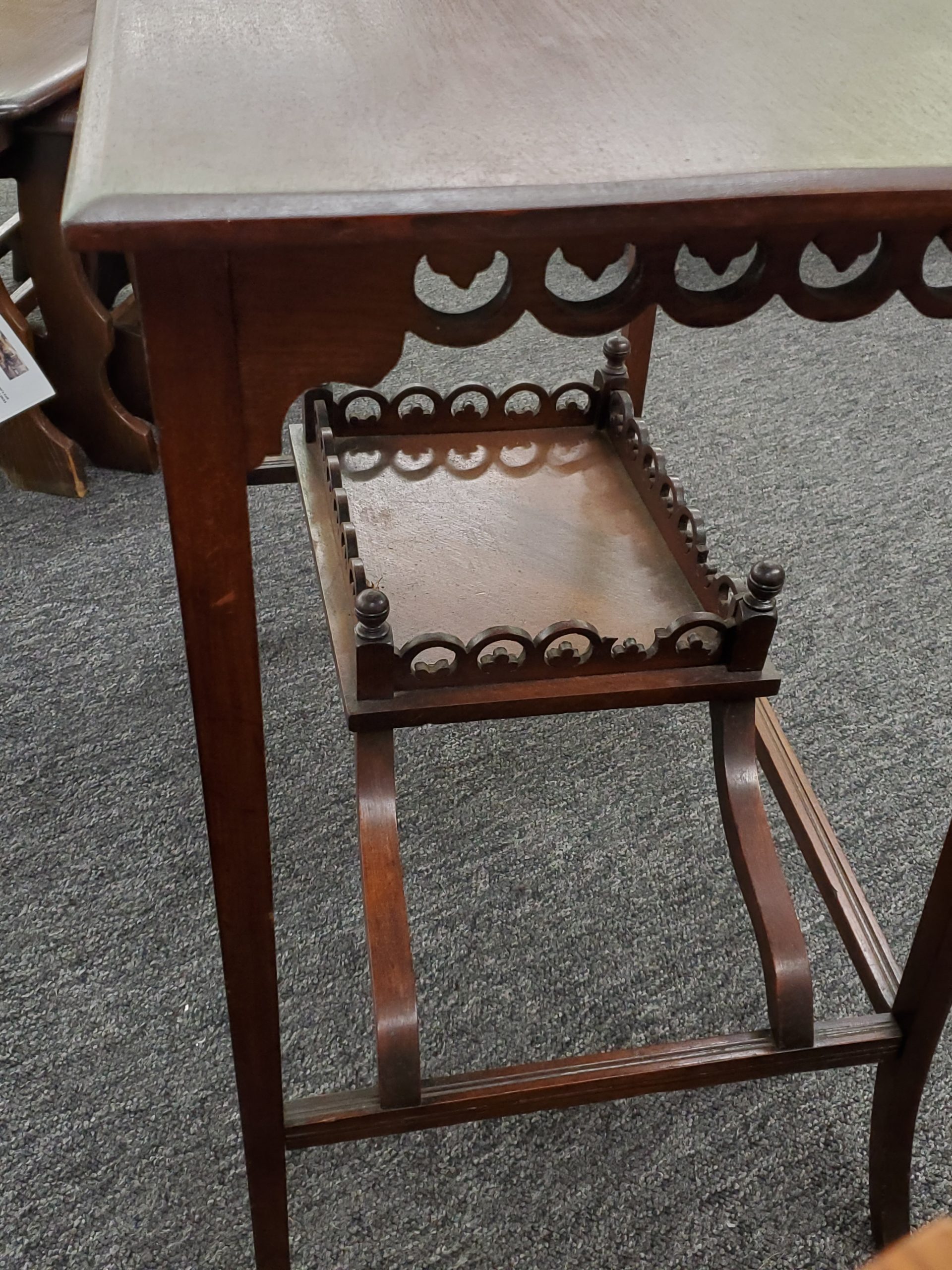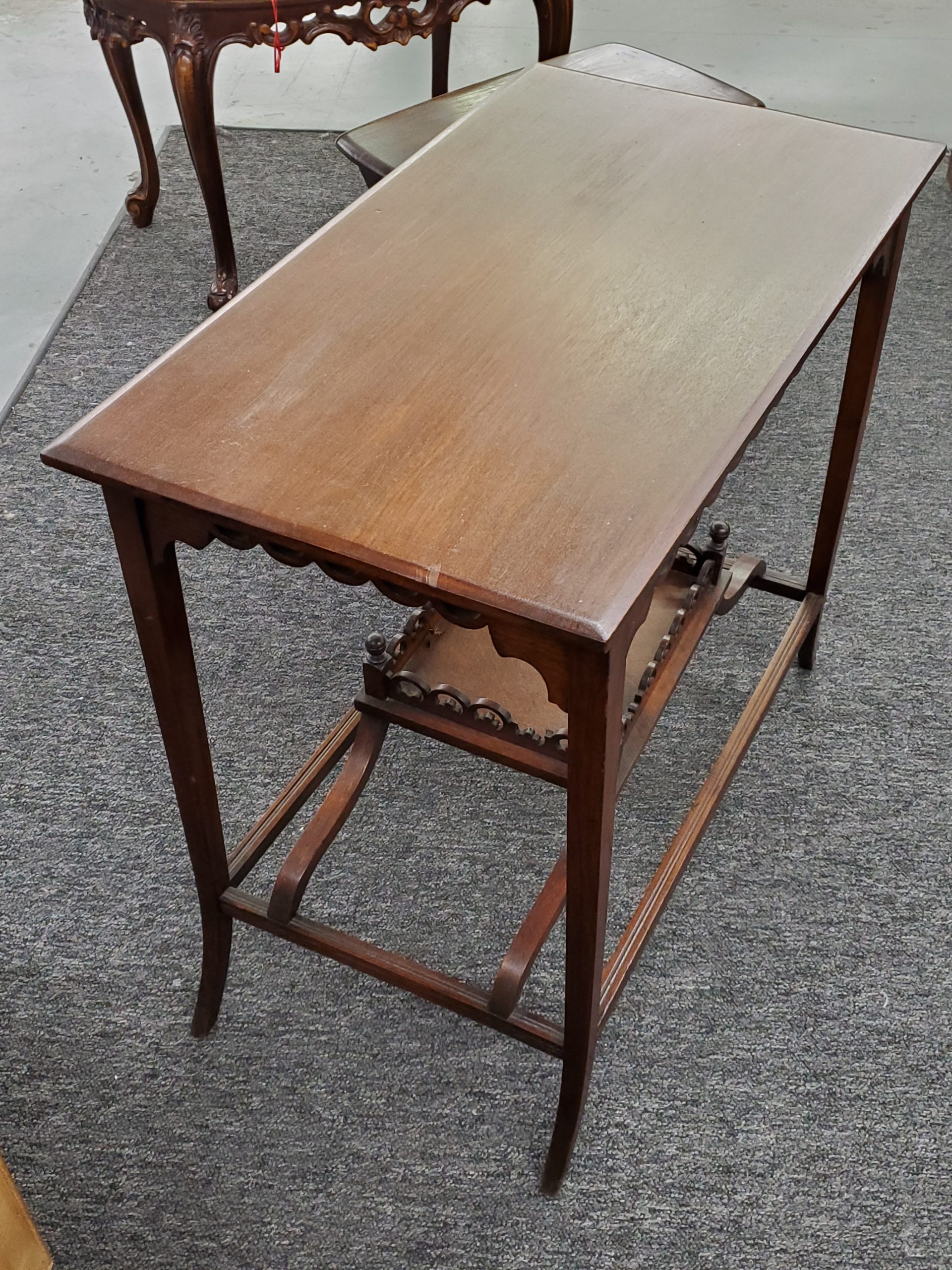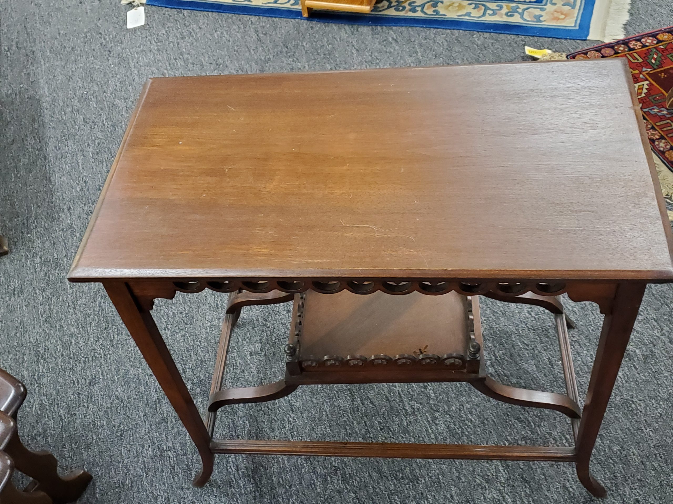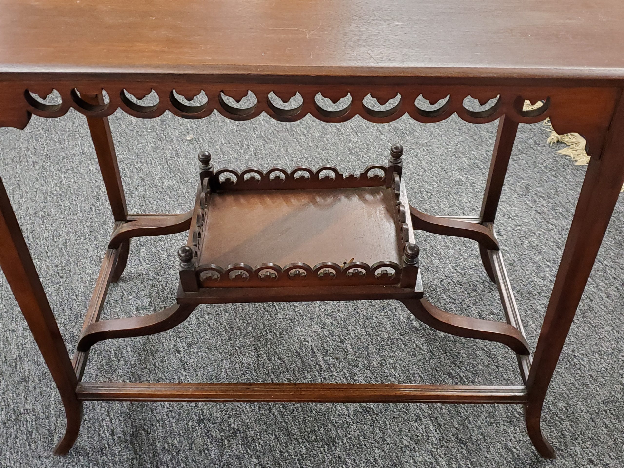 Antique mahogany two tier occasional table, it has a decorative apron and a bottom shelf with pierced design and finials on each corner.
