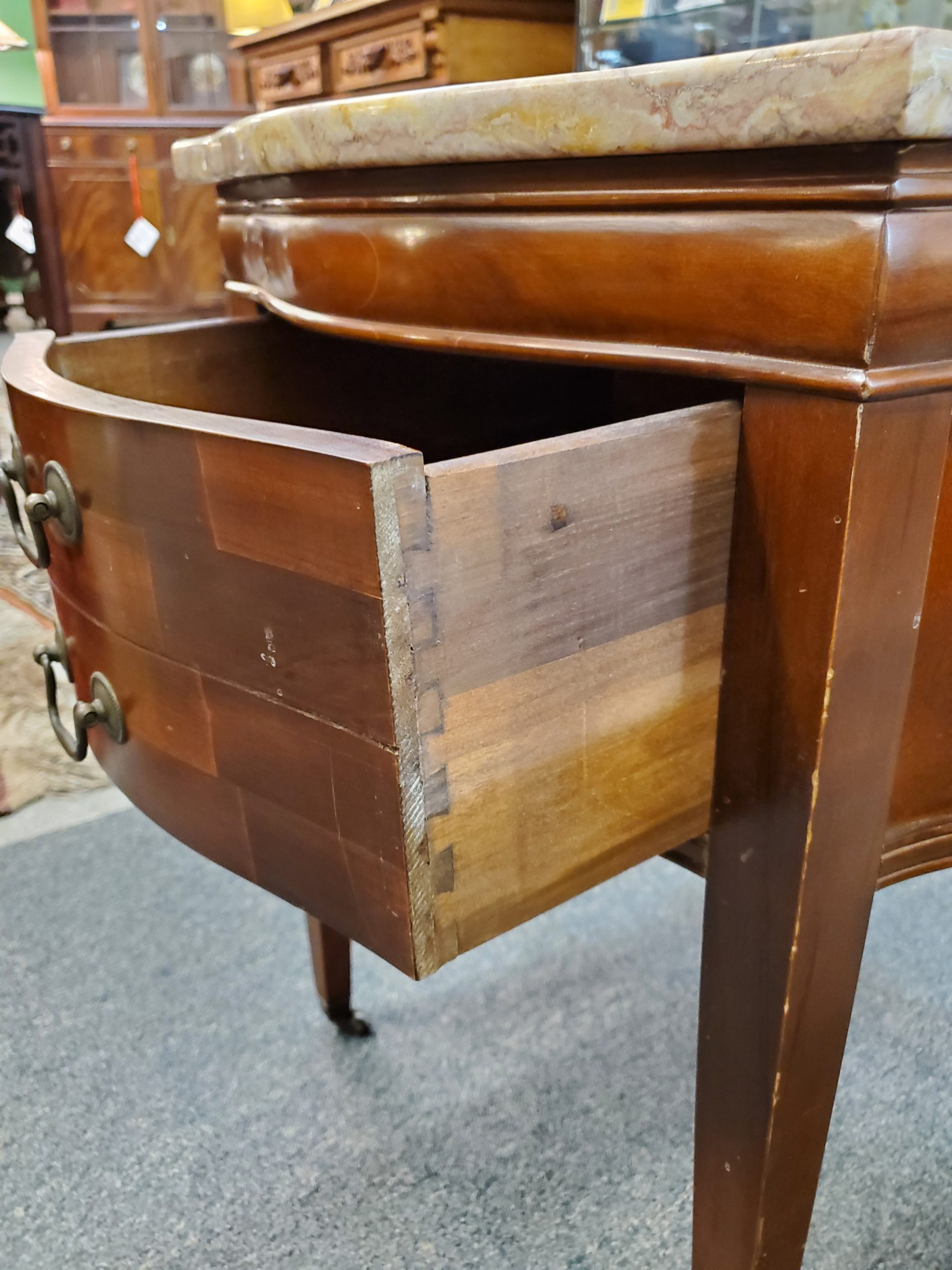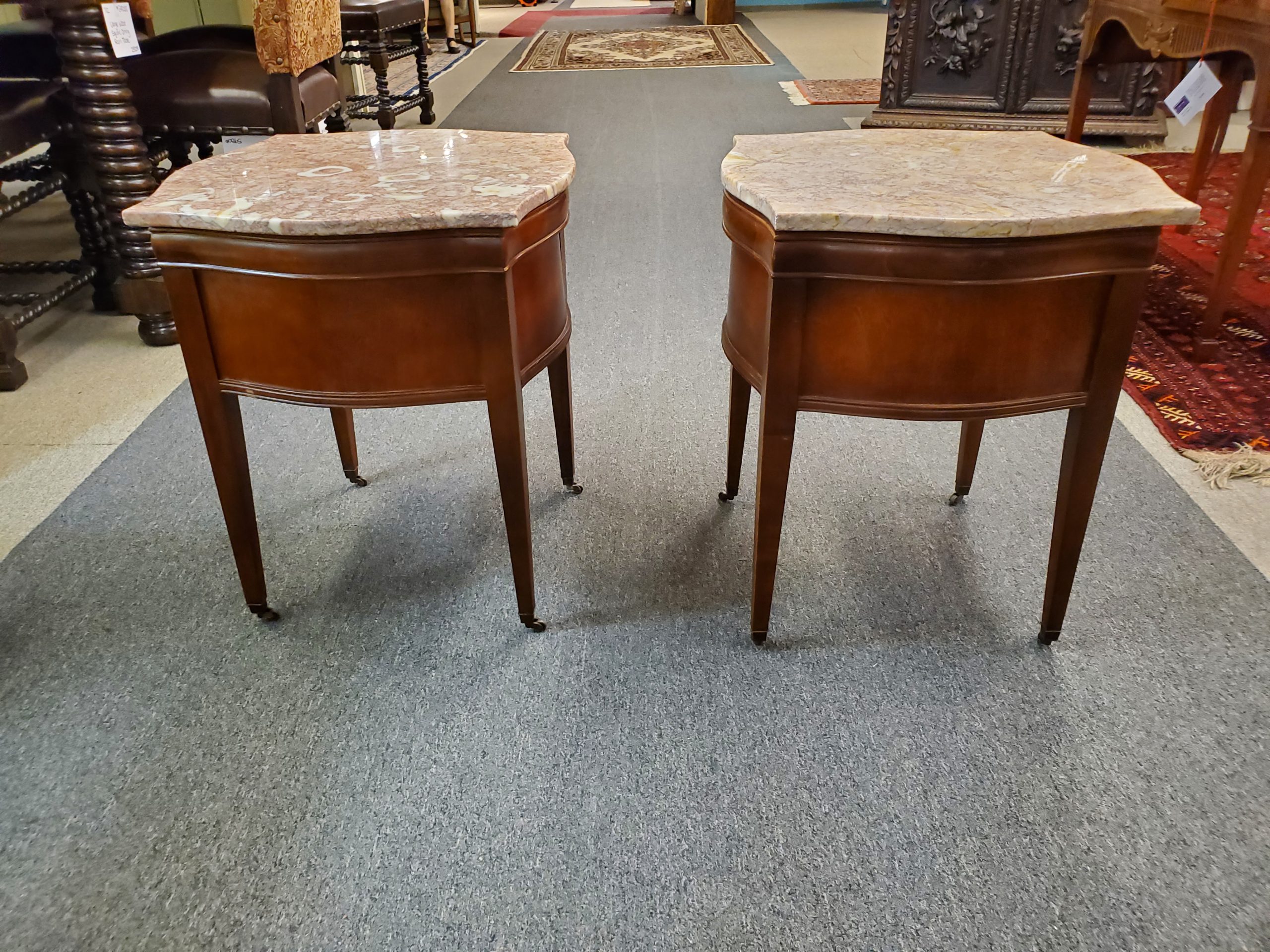 Antique mahogany nightstands/side tables. They each feature a marble top, single dovetail drawer with two brass handles, ending in castors, from a prominent estate in Houston.