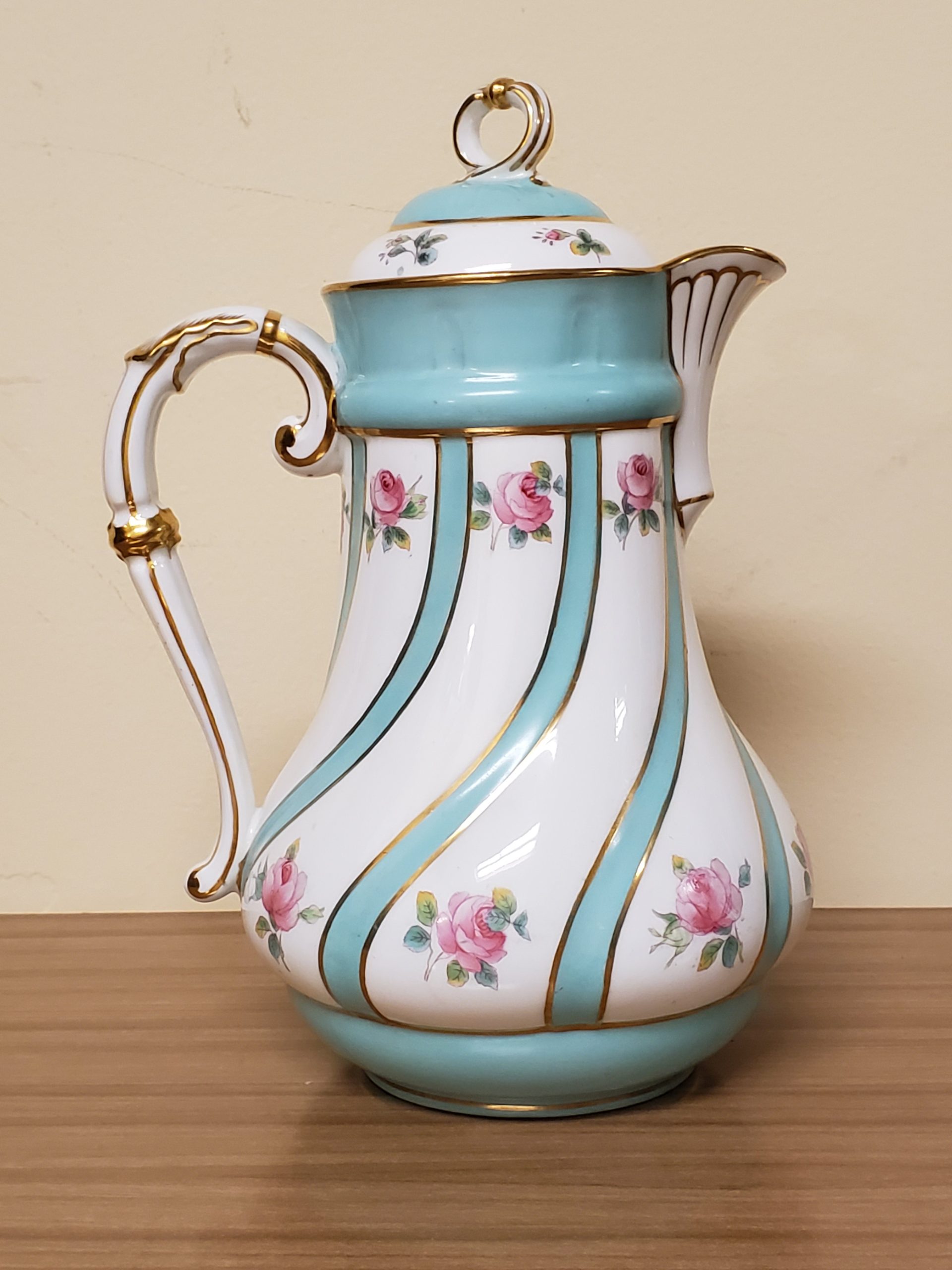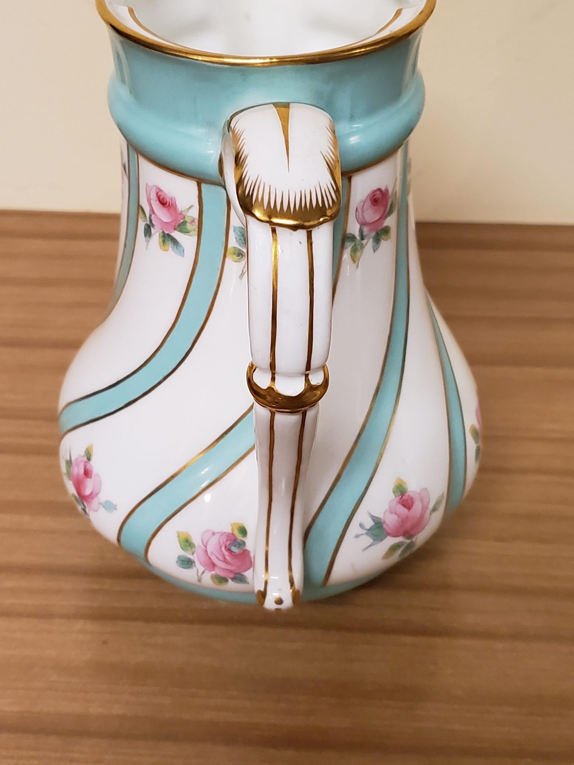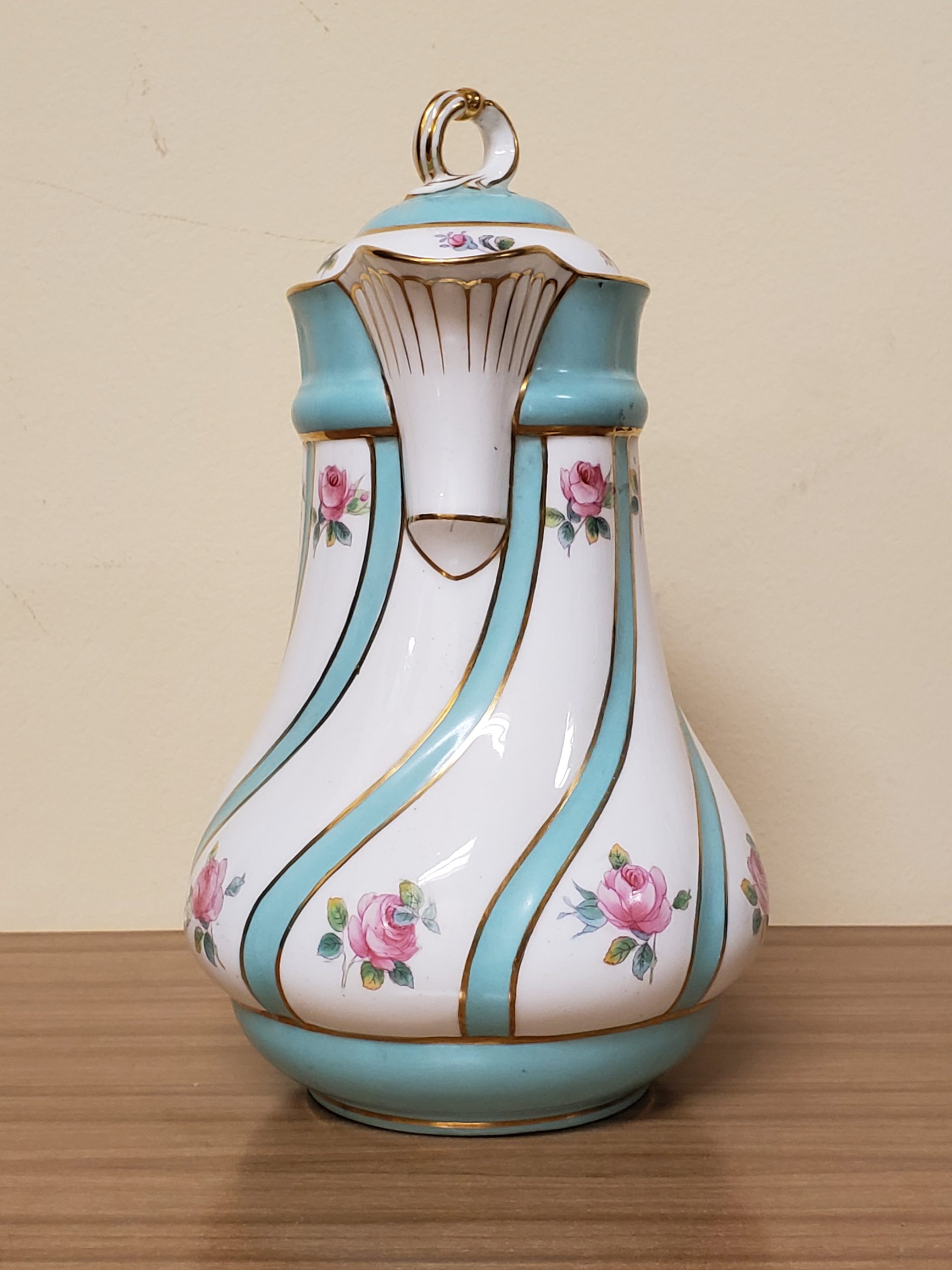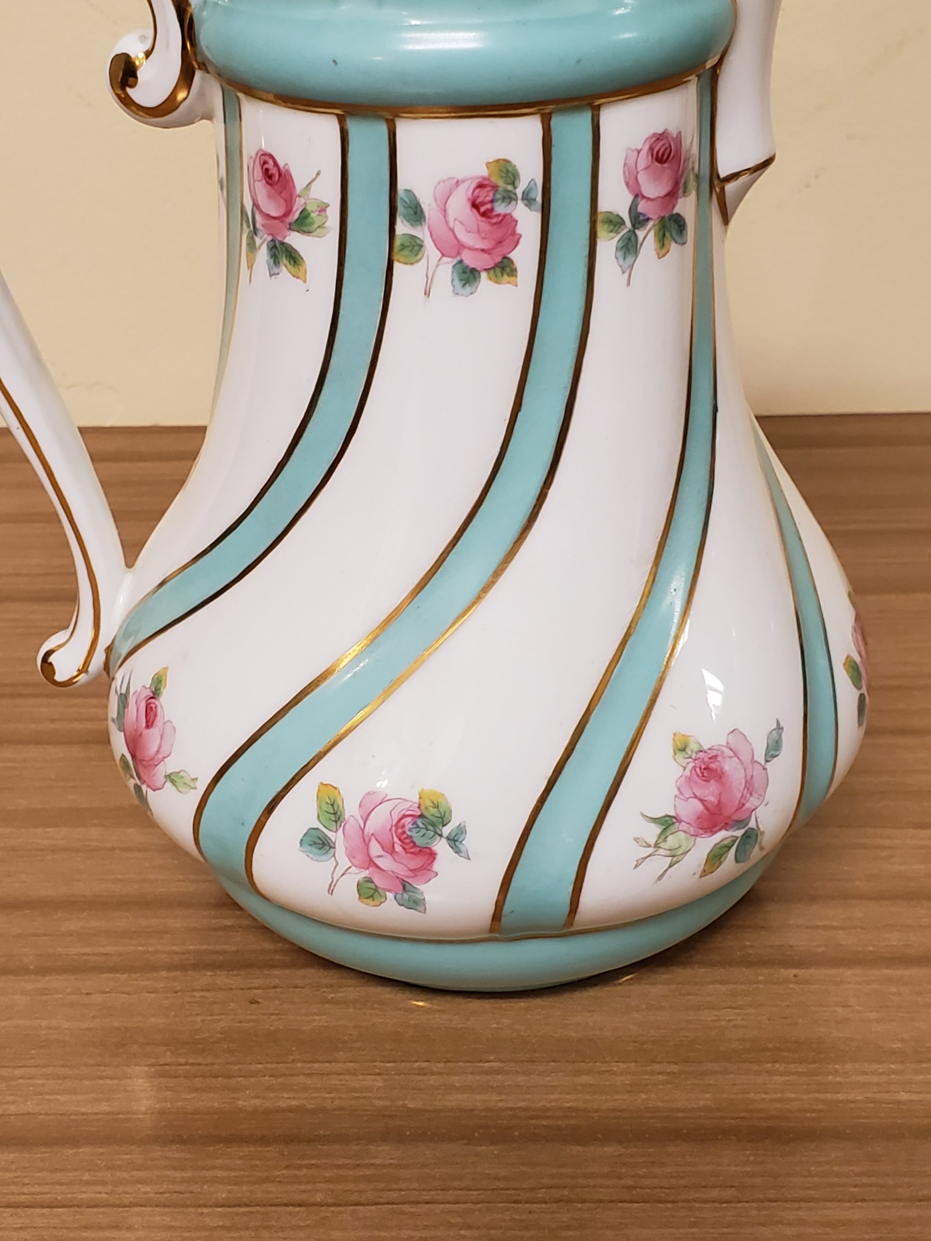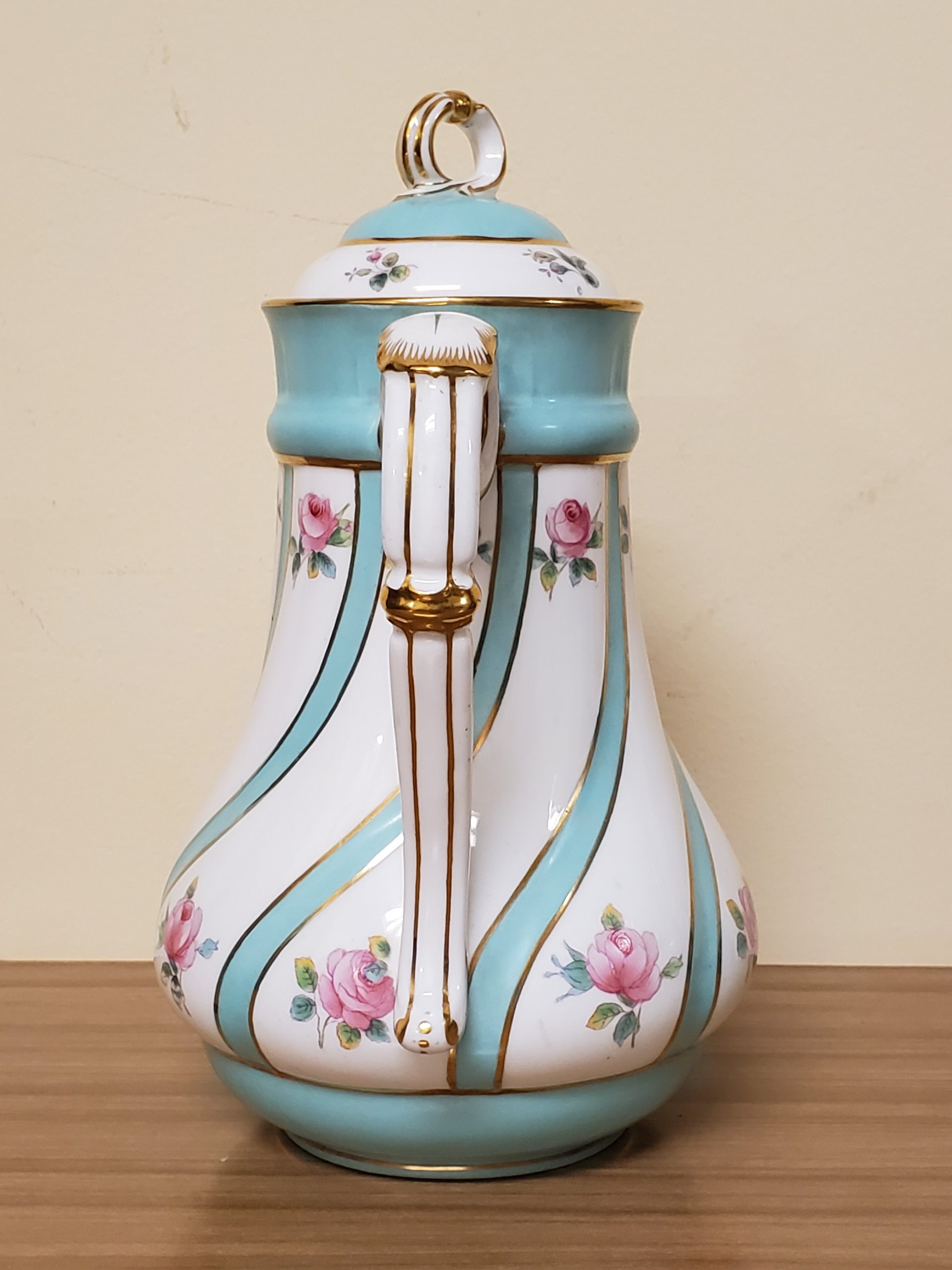 Antique porcelain coffee pot made in England hand painted turquoise enamel and gilt bands alternating with pink roses.