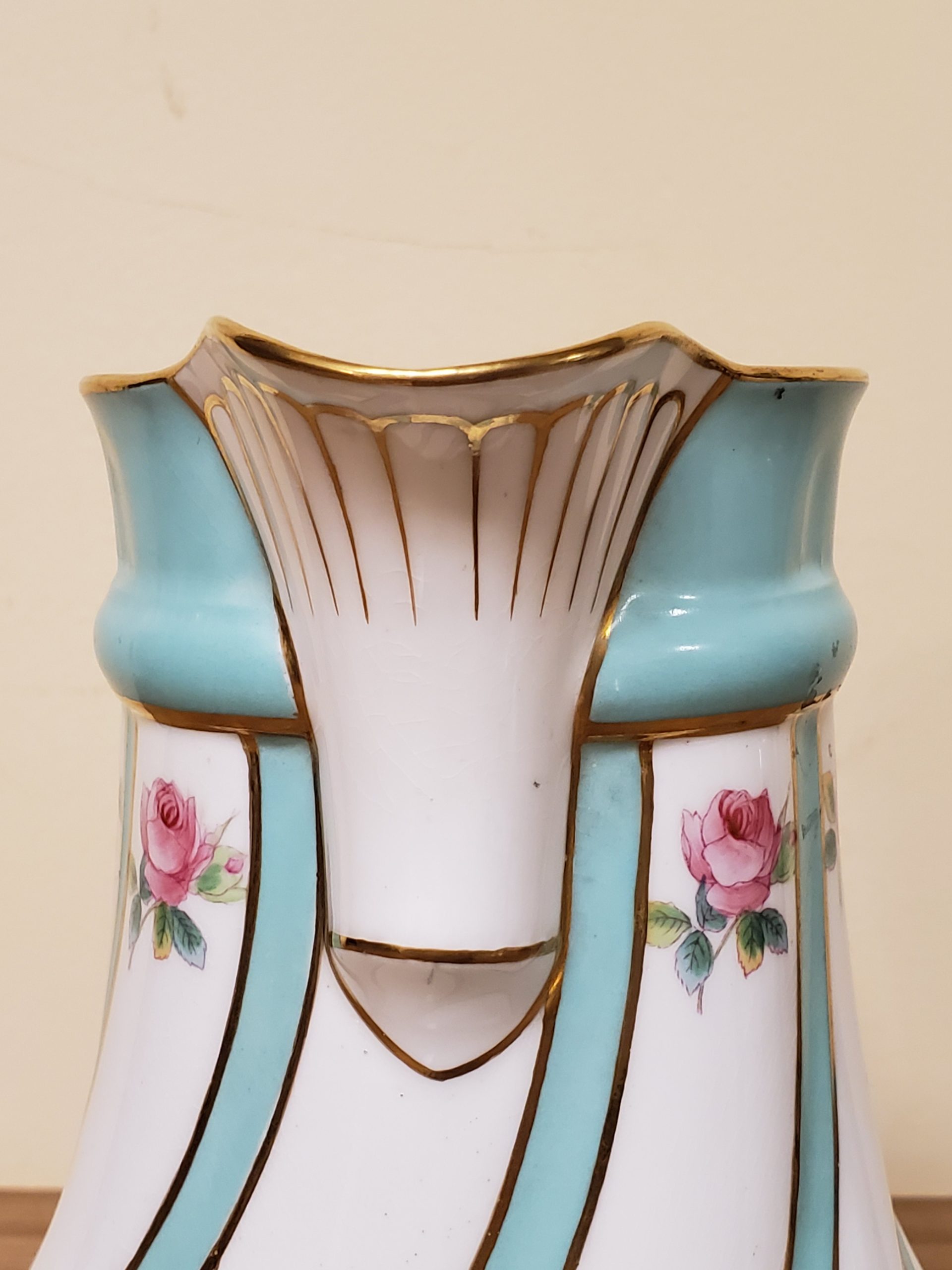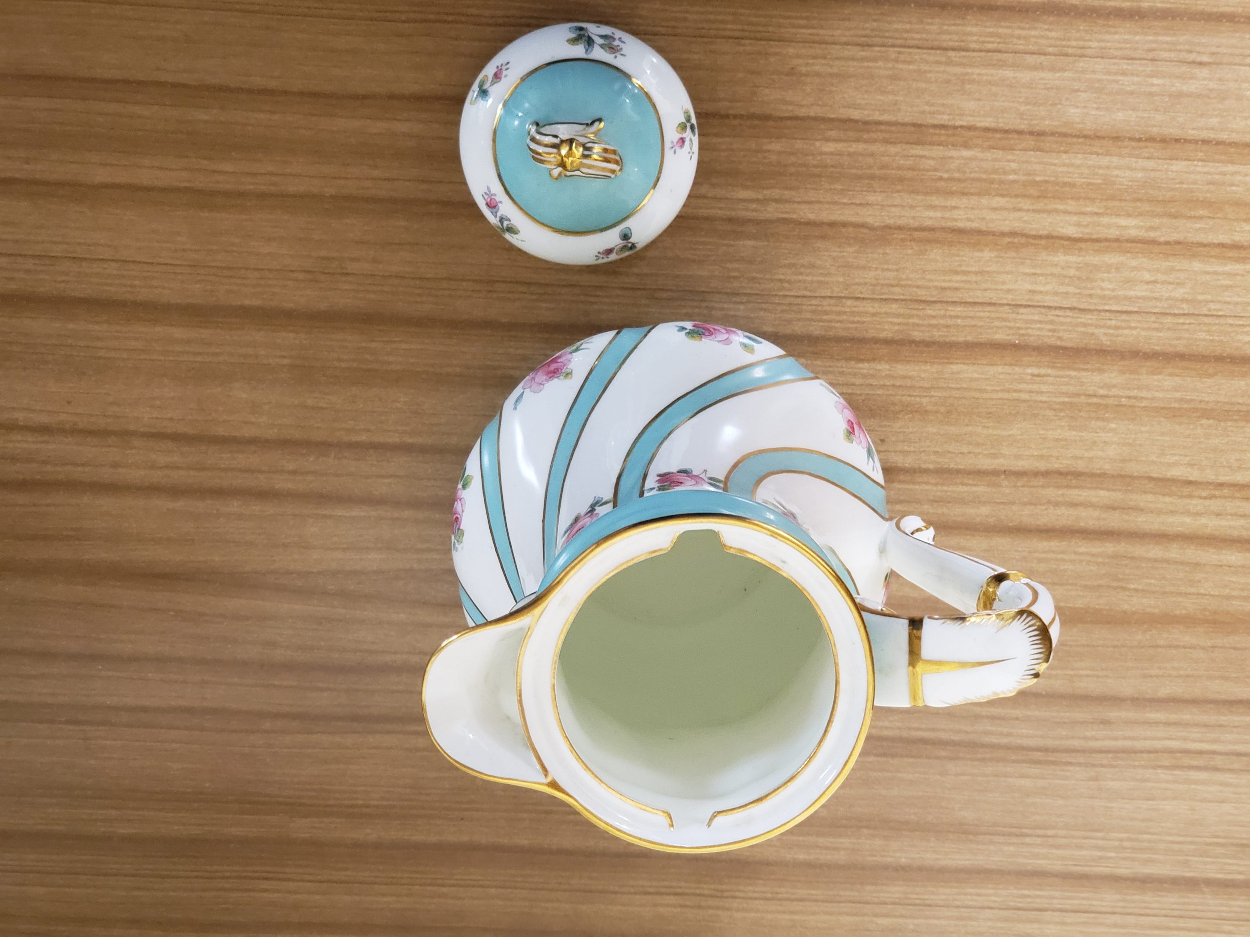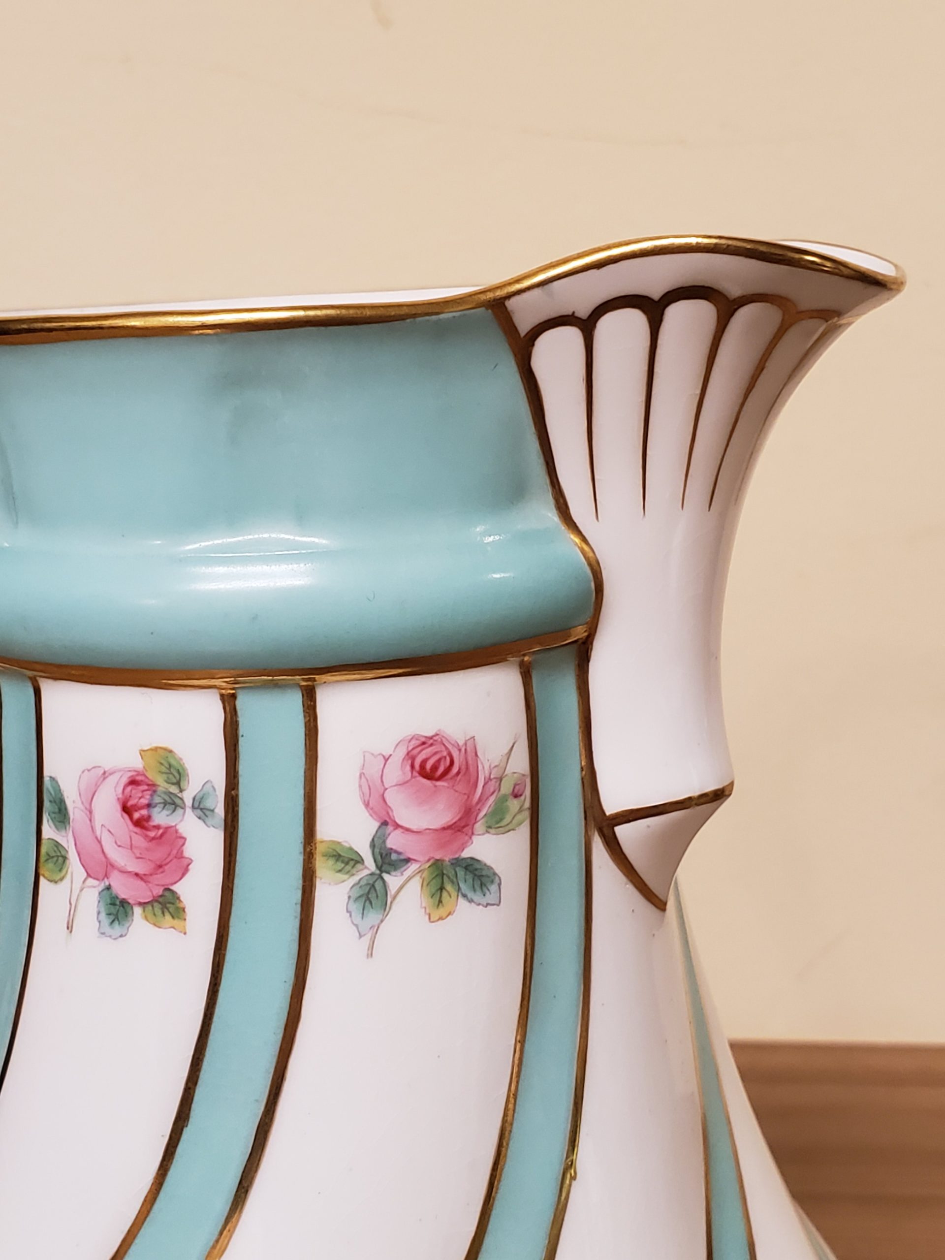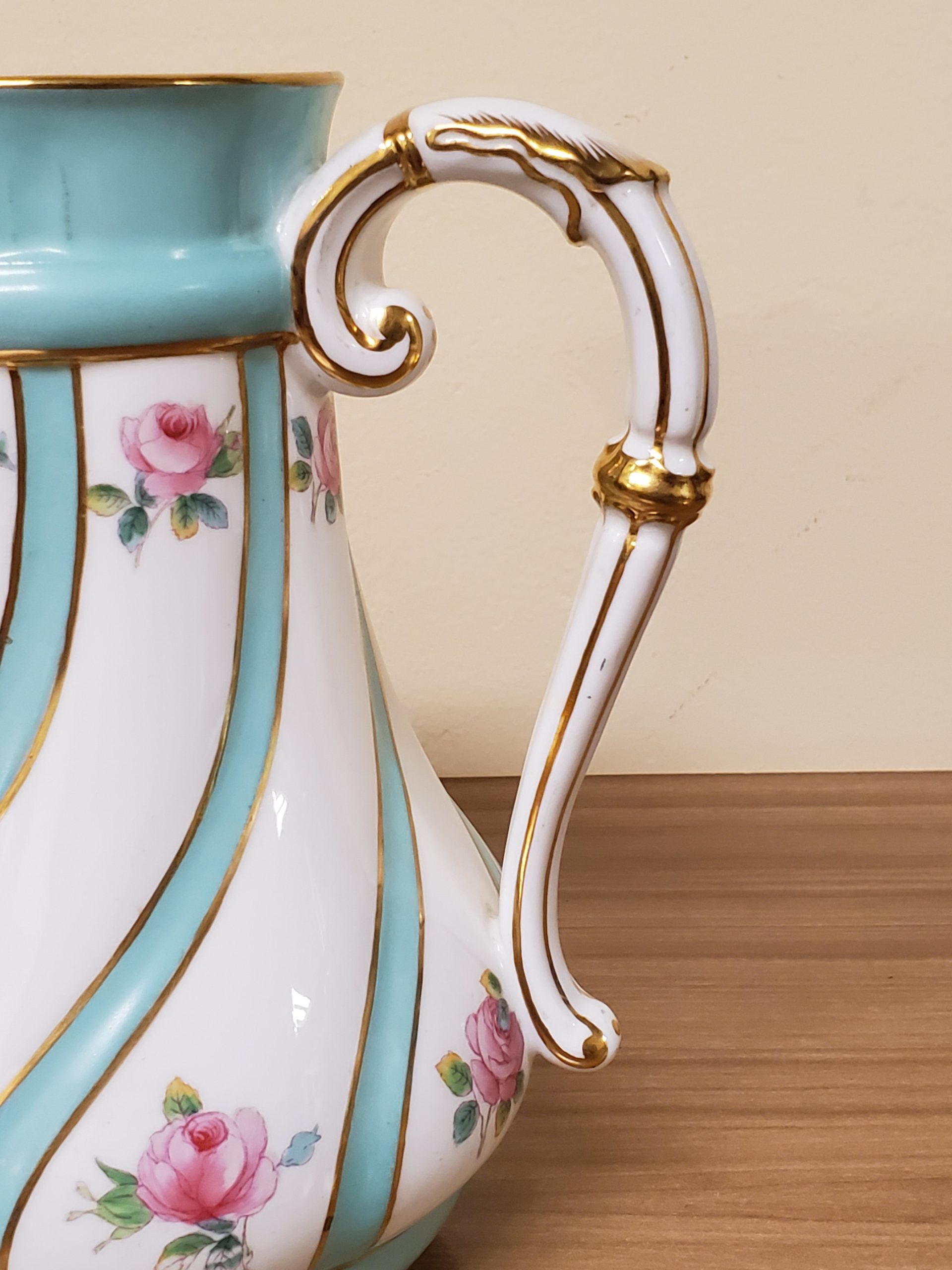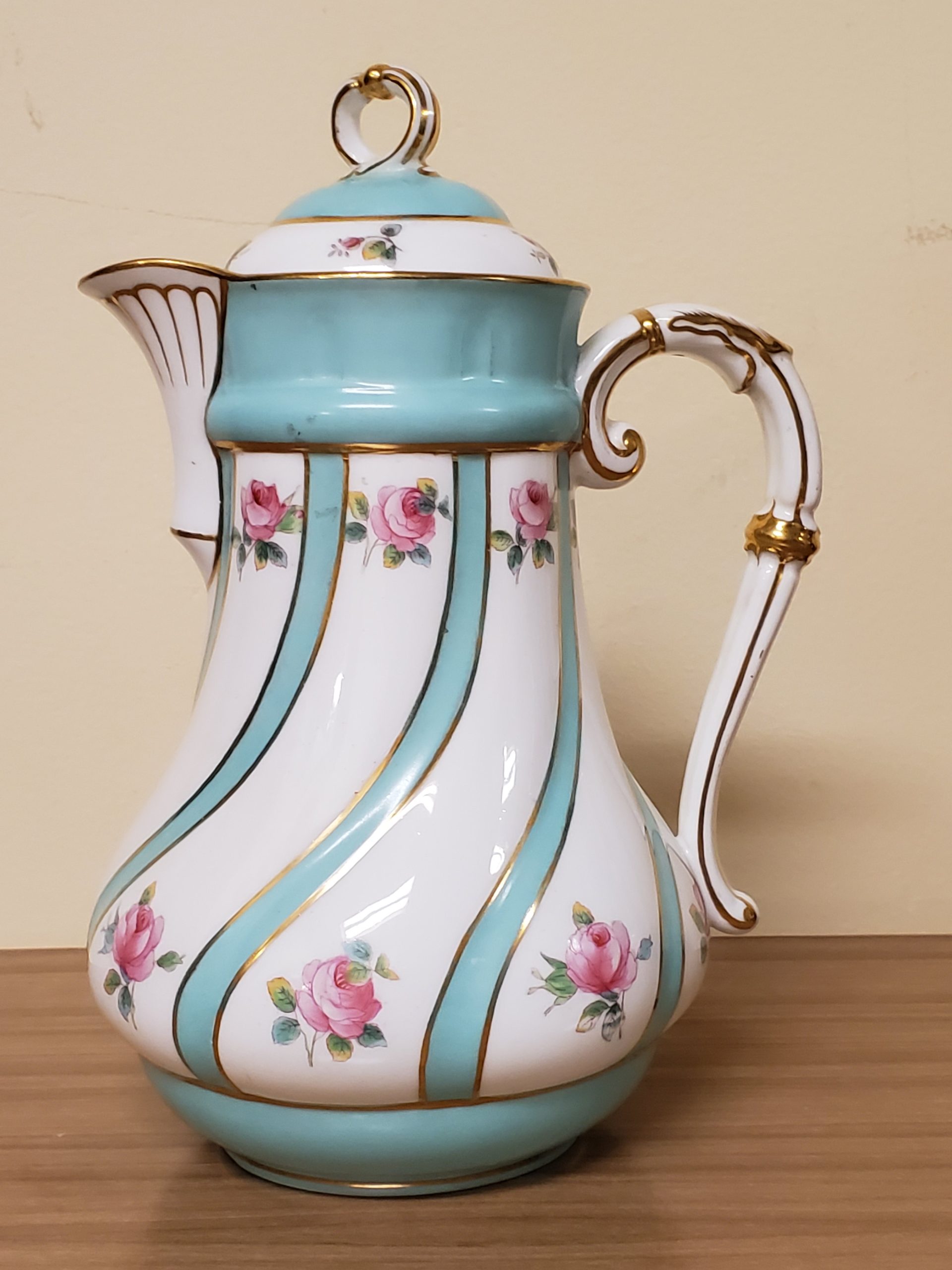Antique porcelain coffee pot made in England hand painted turquoise enamel and gilt bands alternating with pink roses.