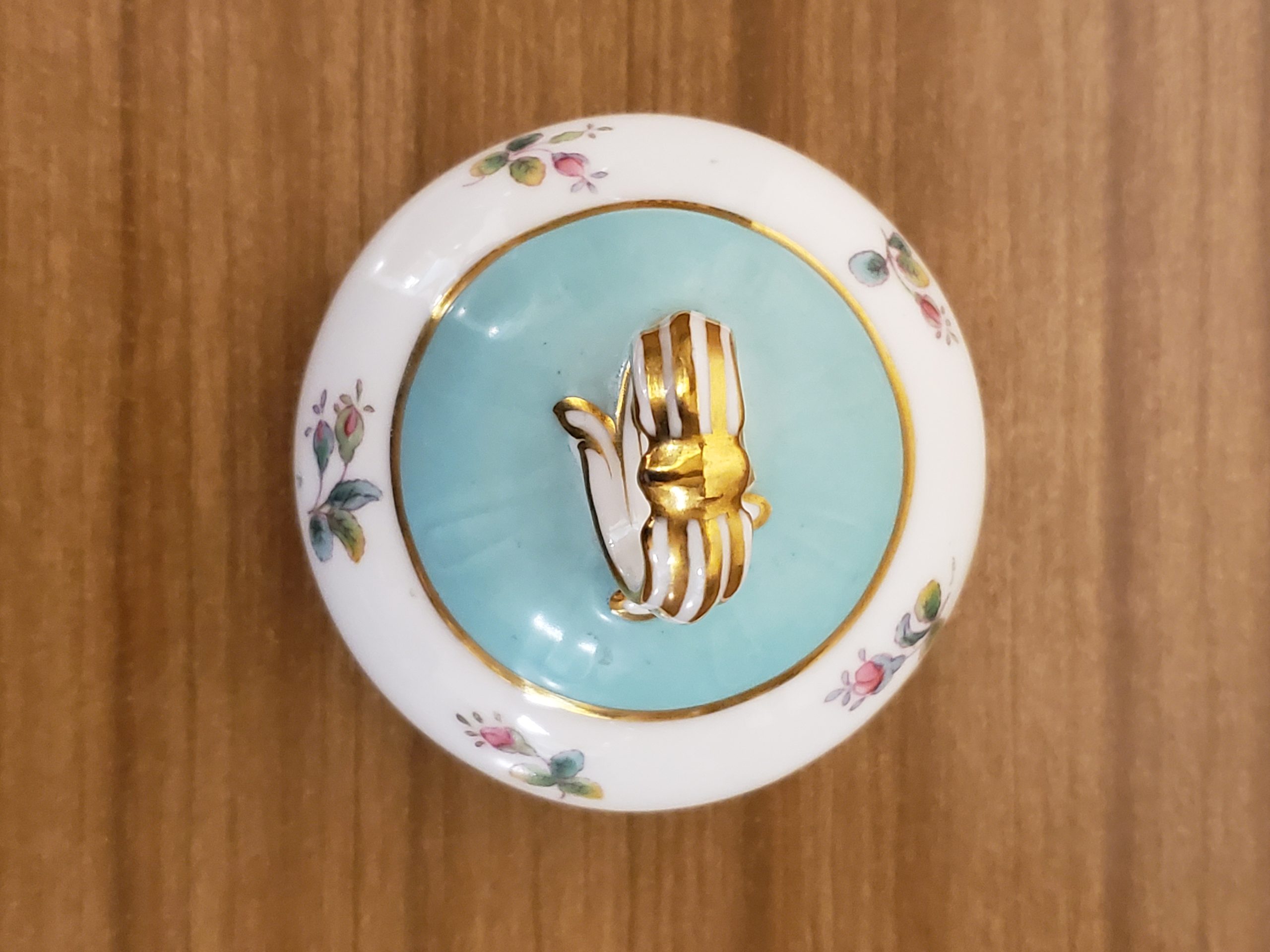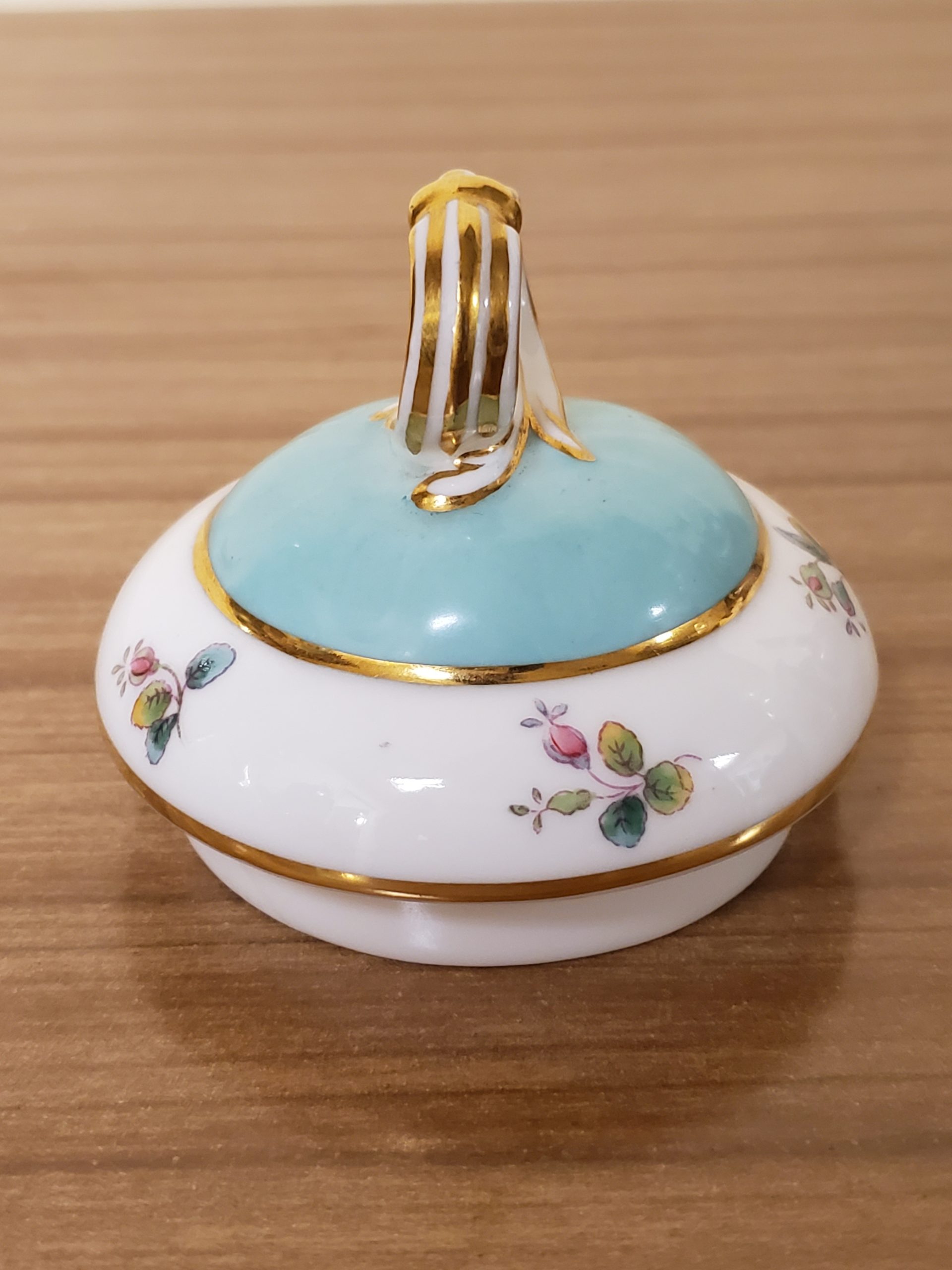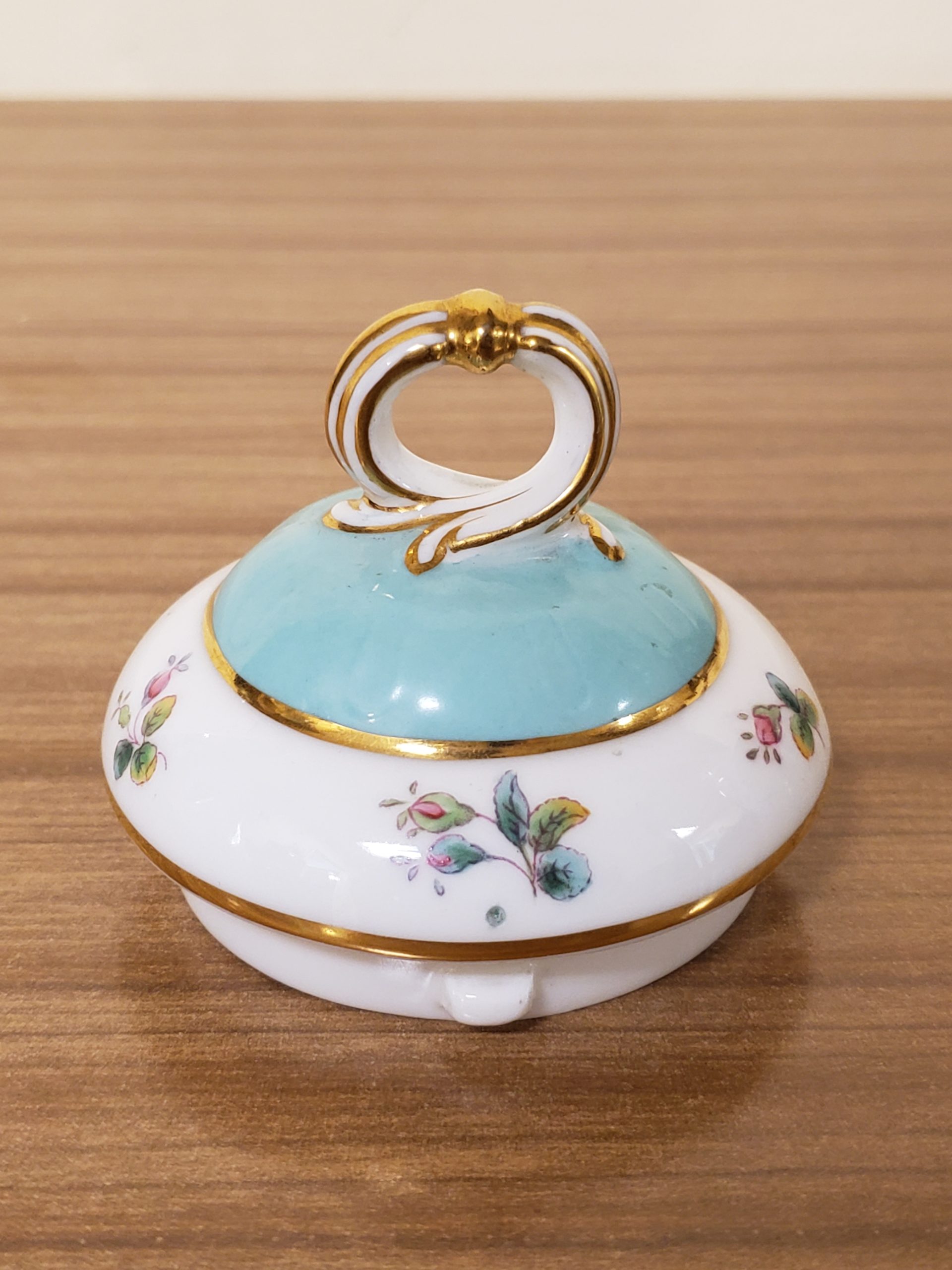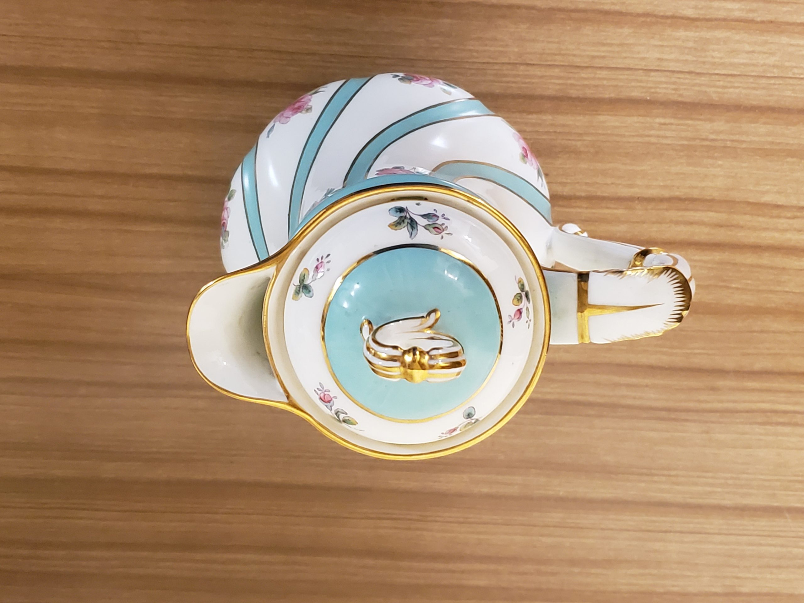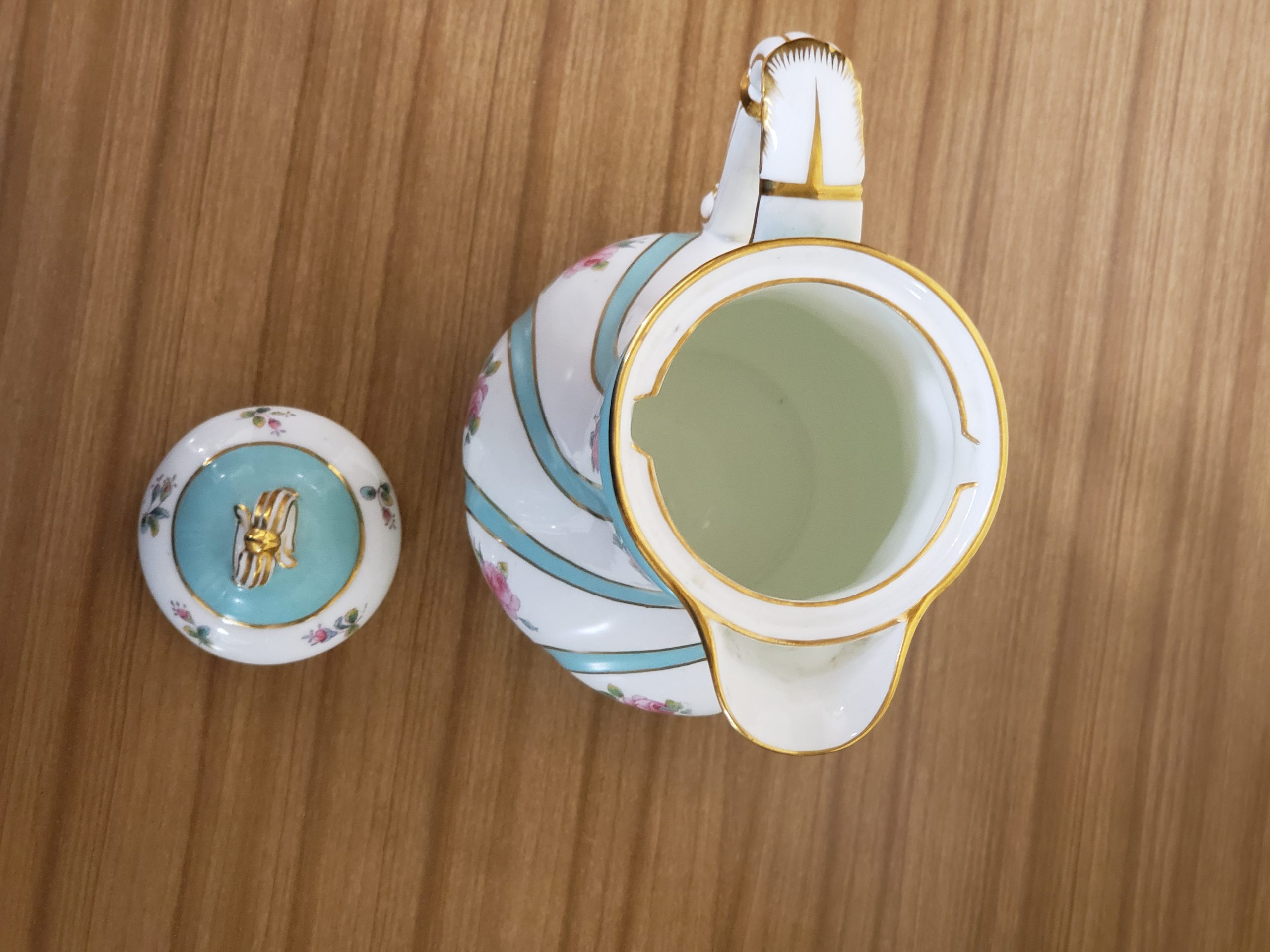 Antique porcelain coffee pot made in England hand painted turquoise enamel and gilt bands alternating with pink roses.
