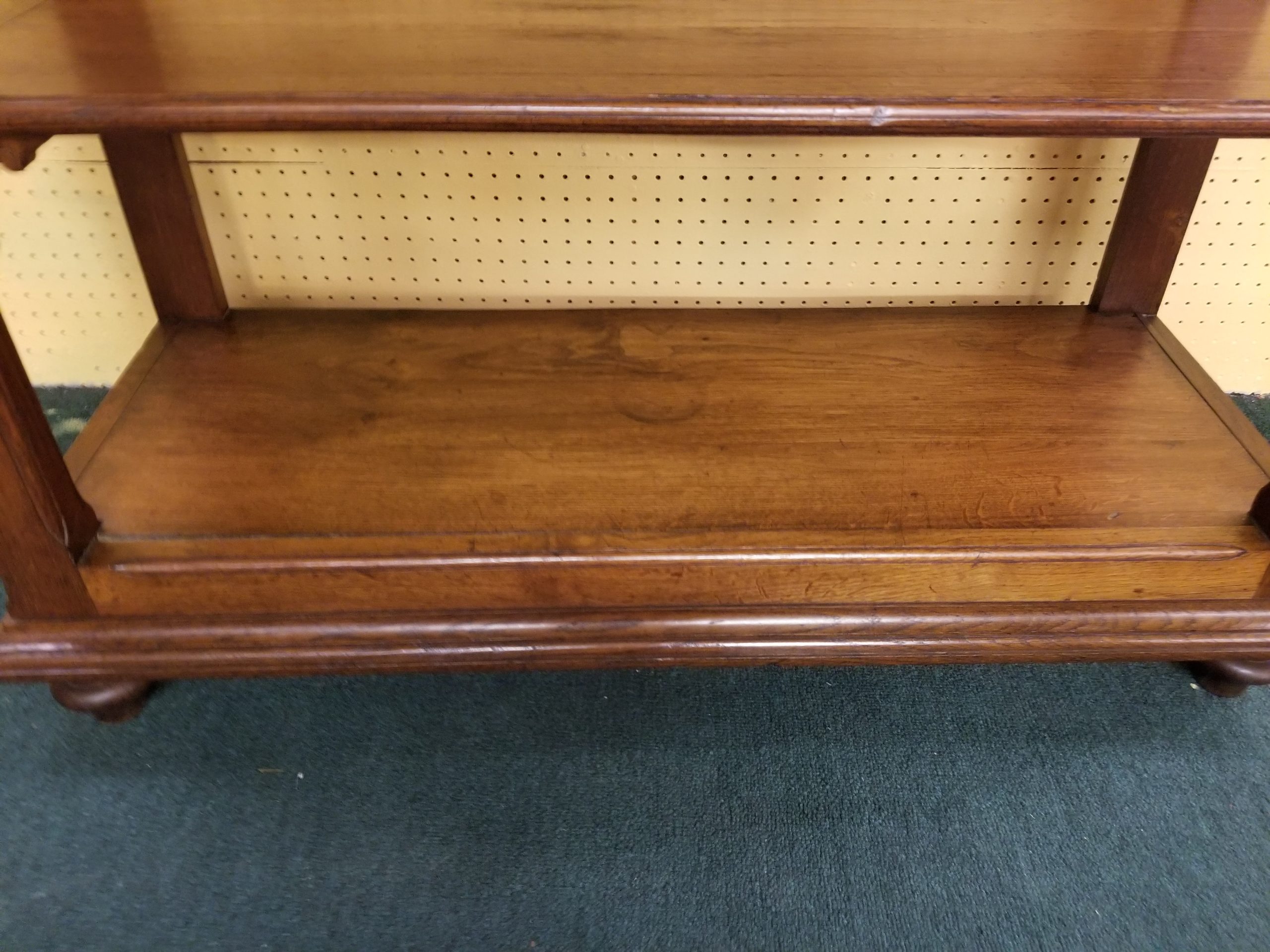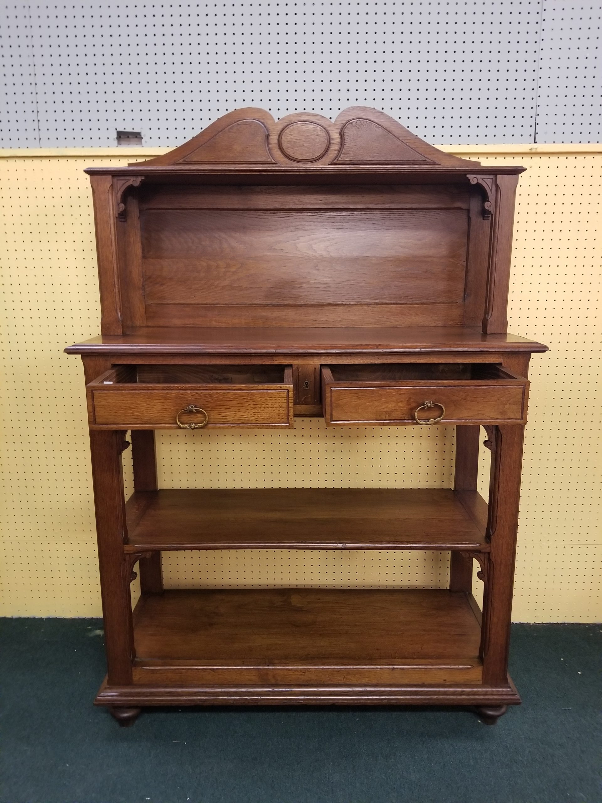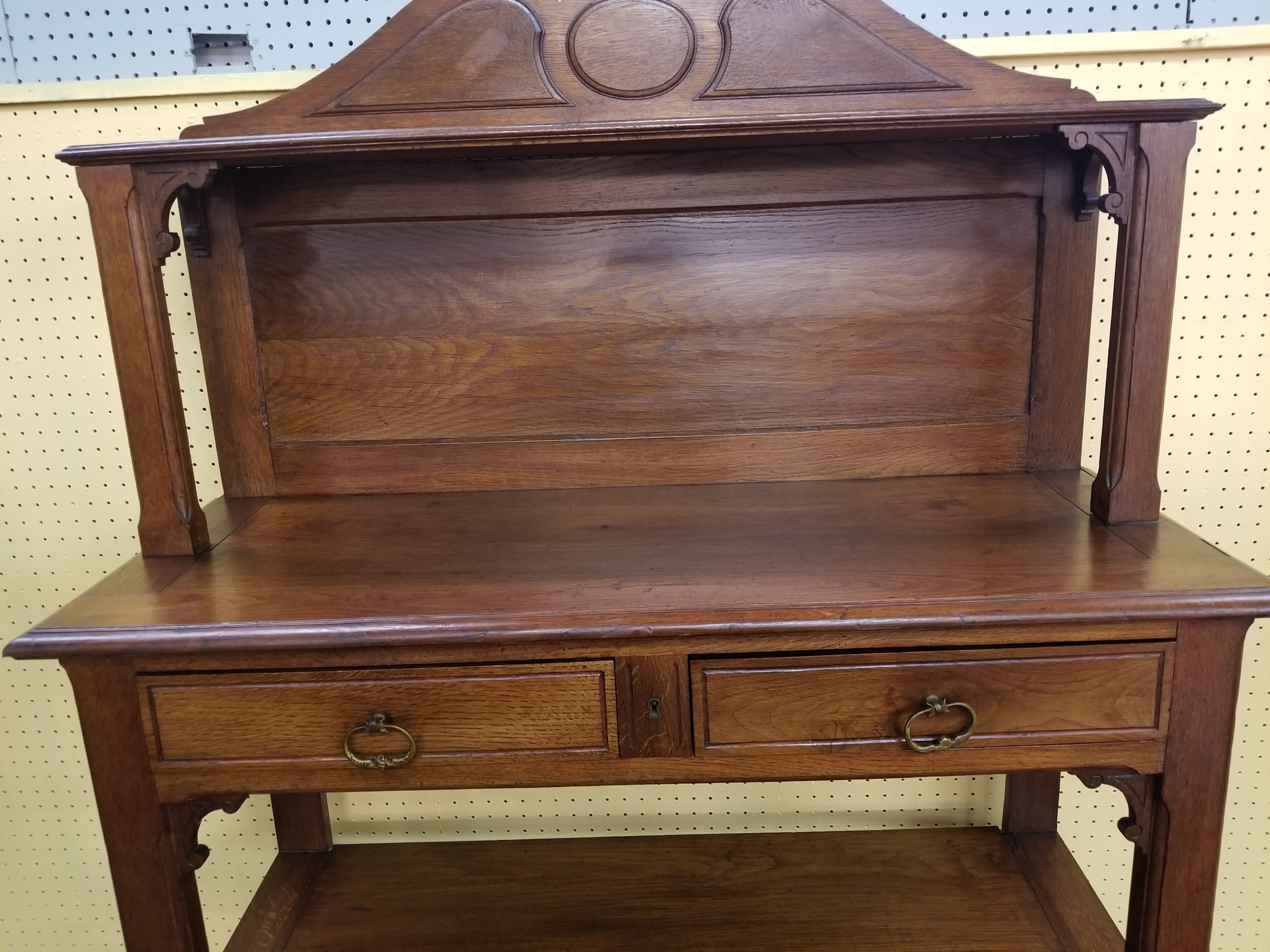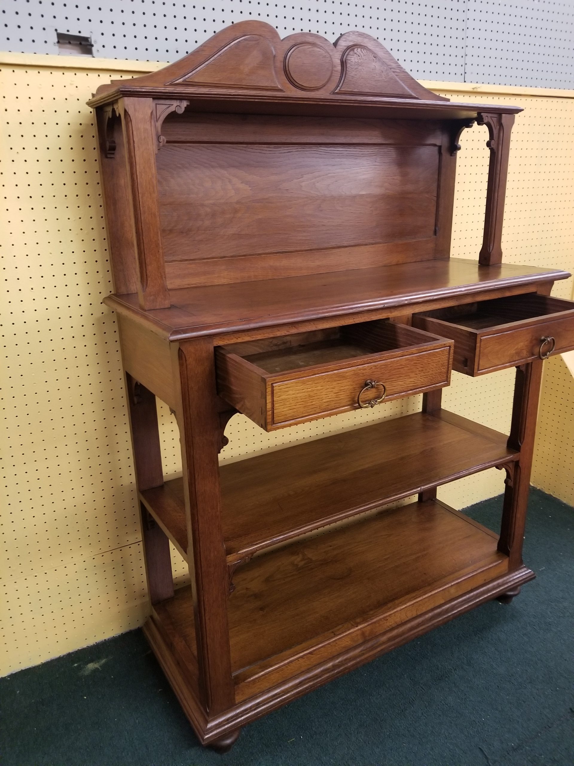 Antique oak dessert server, one shelf on top that is supported by a column on each side, below two drawers with brass pulls and two shelves underneath.