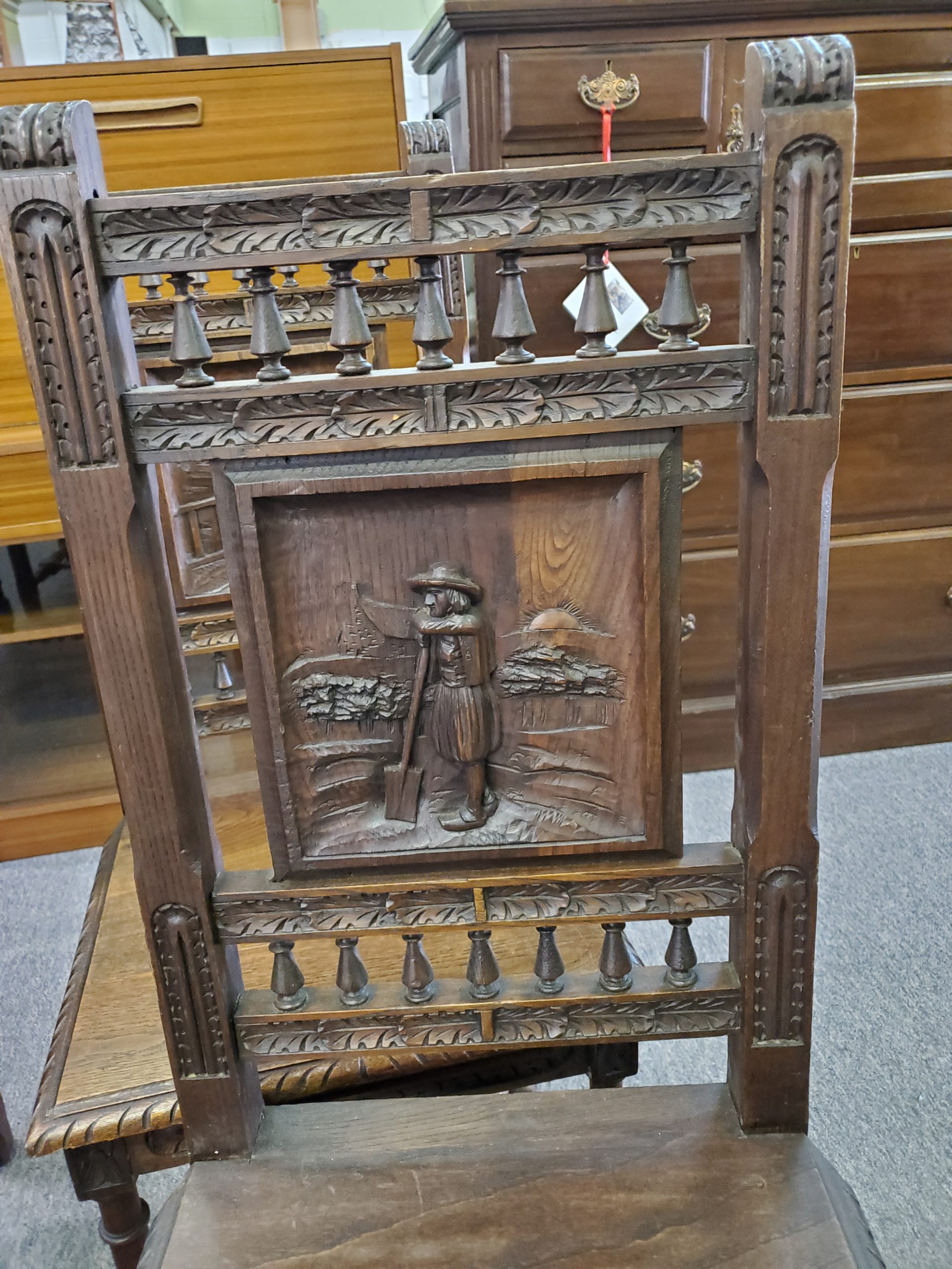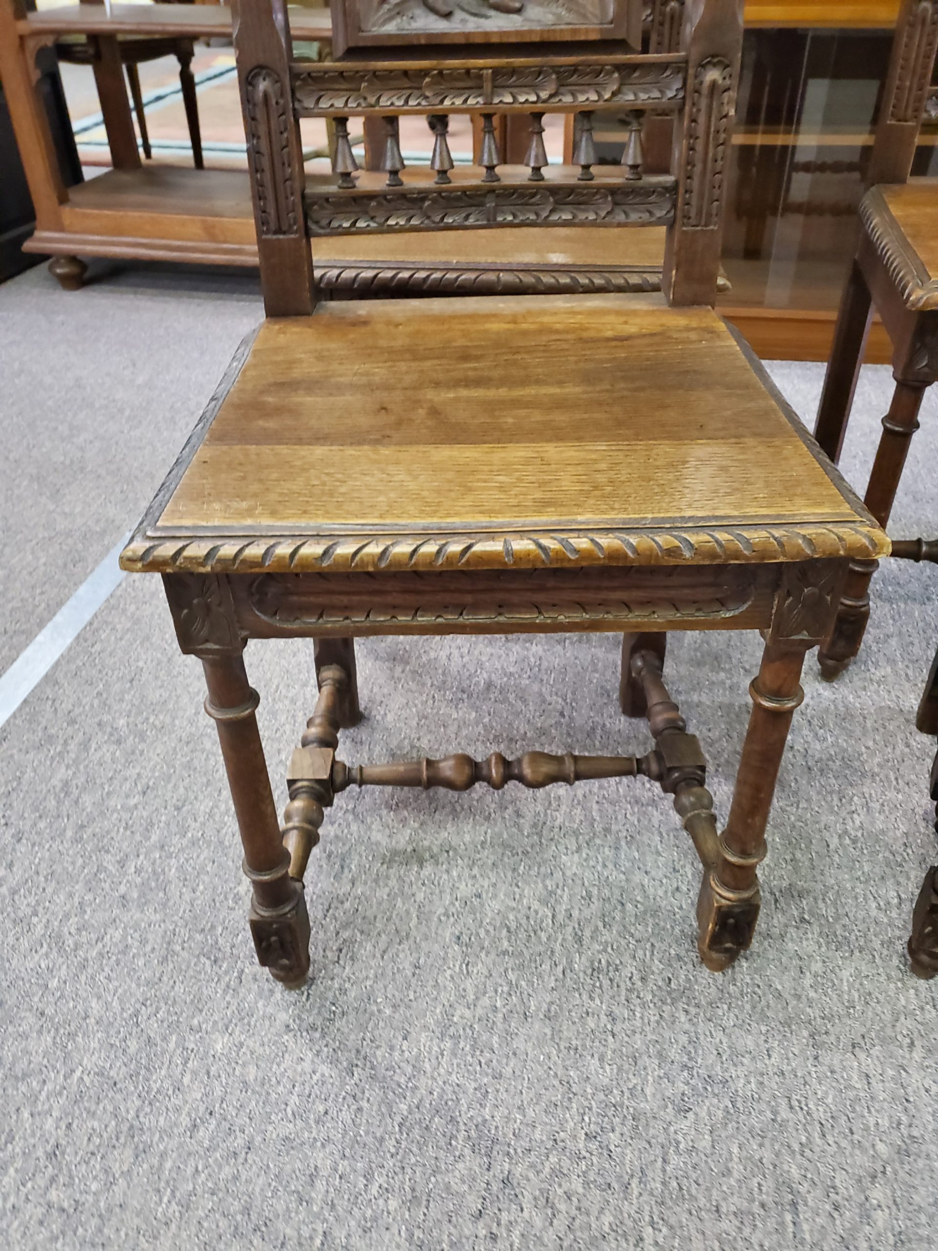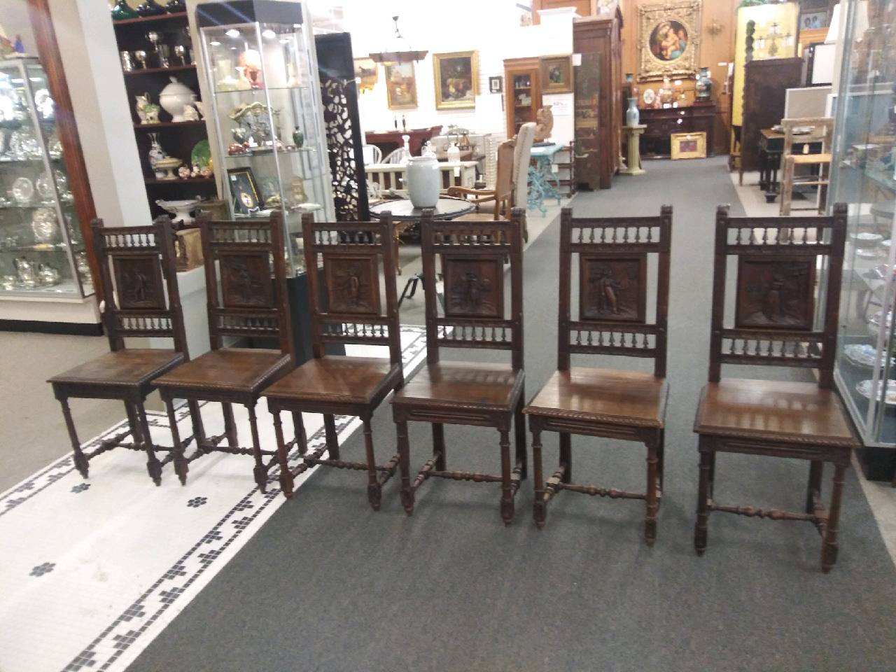 Antique set of six oak dining chairs with carved backs, each one has a different scene, with an H-stretcher connecting the legs.Â