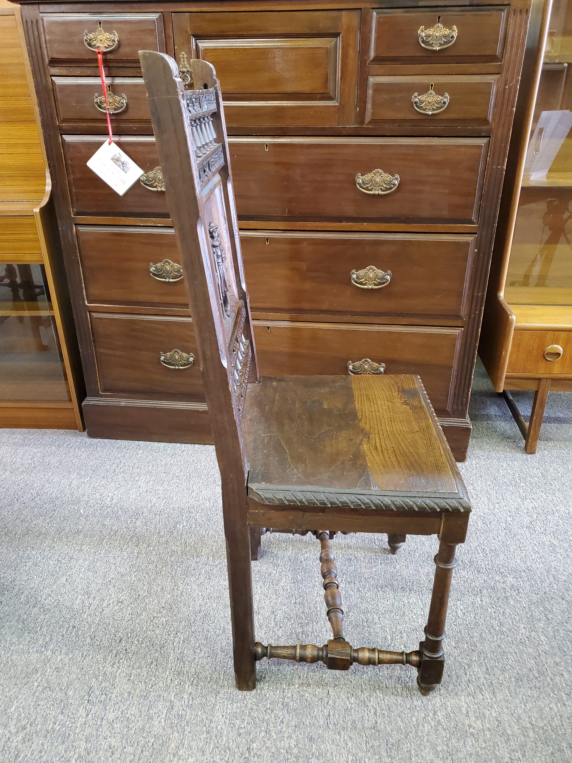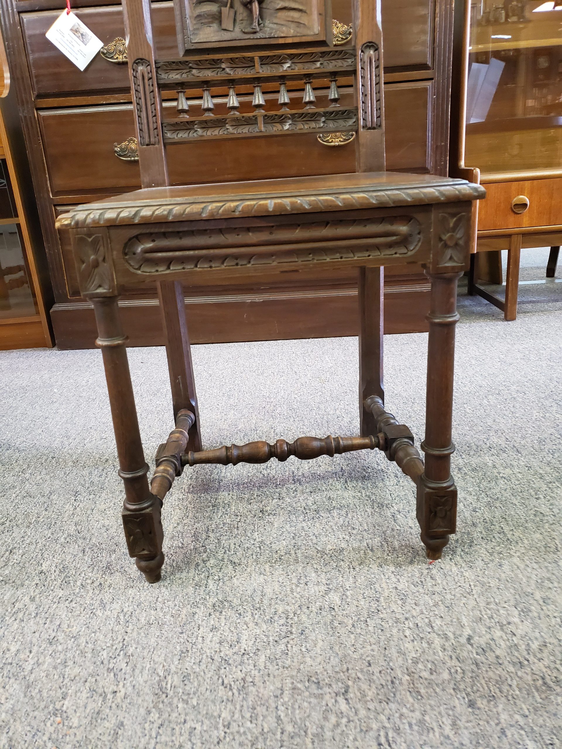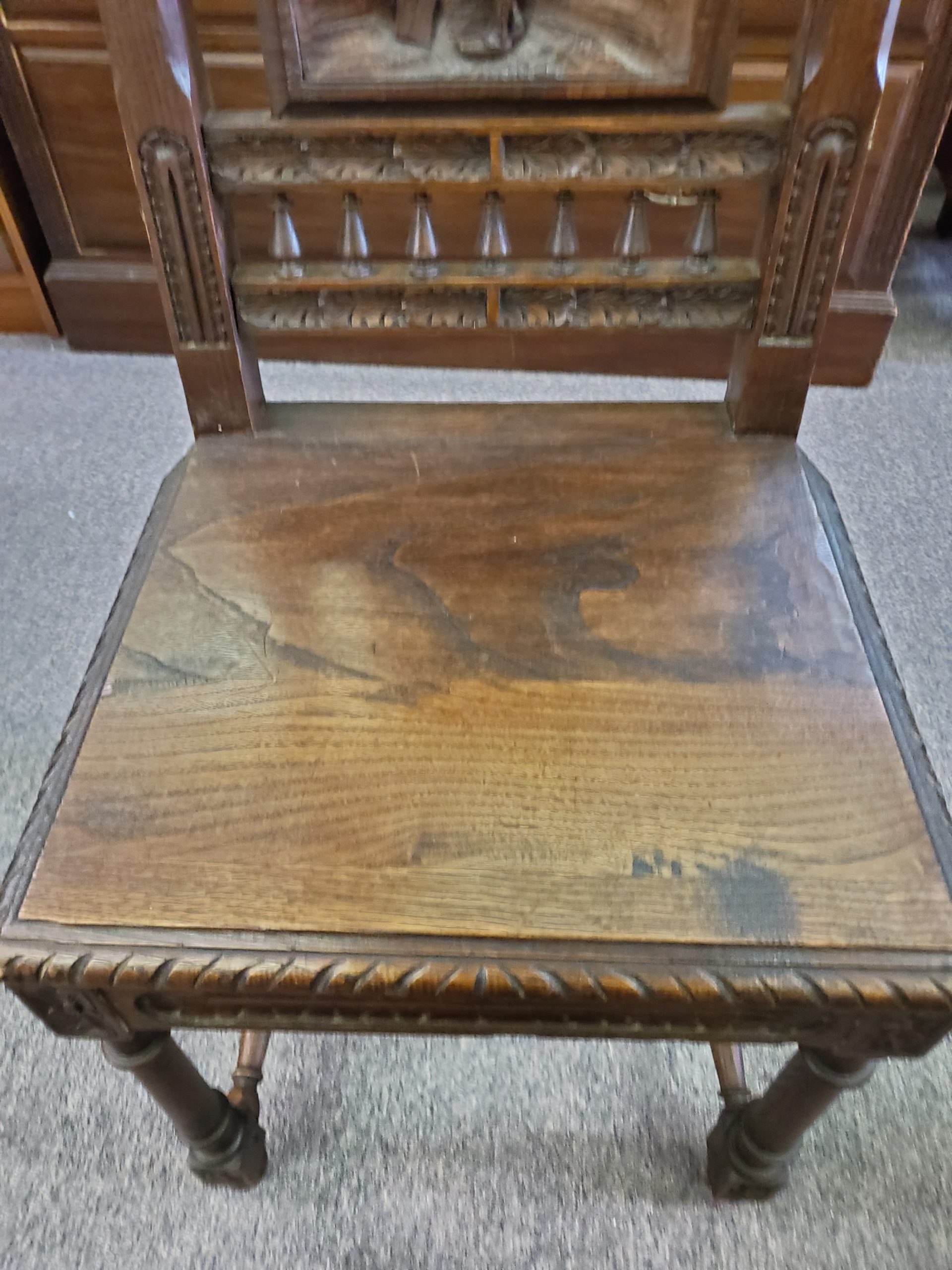 Antique set of six oak dining chairs with carved backs, each one has a different scene, with an H-stretcher connecting the legs.Â