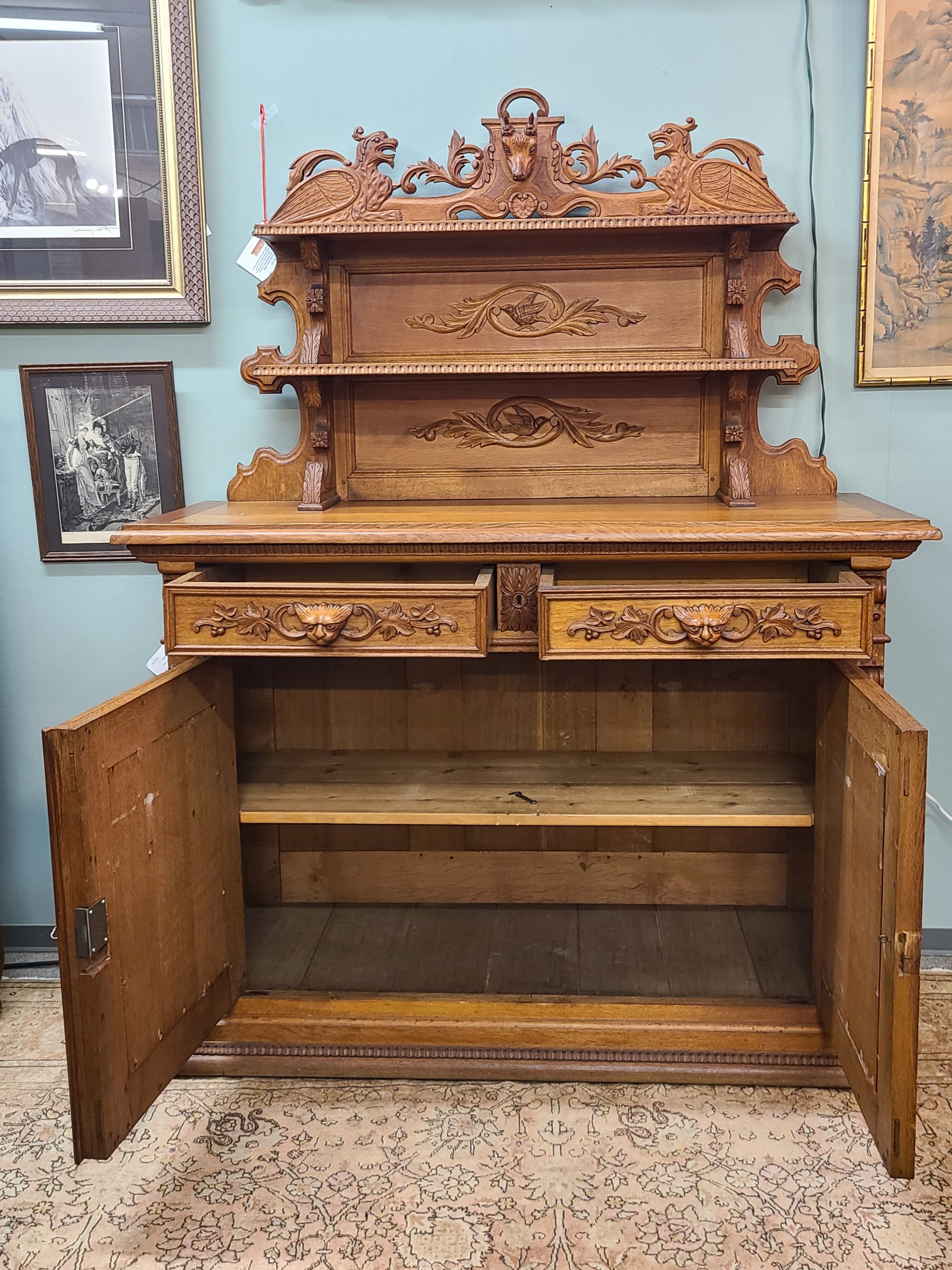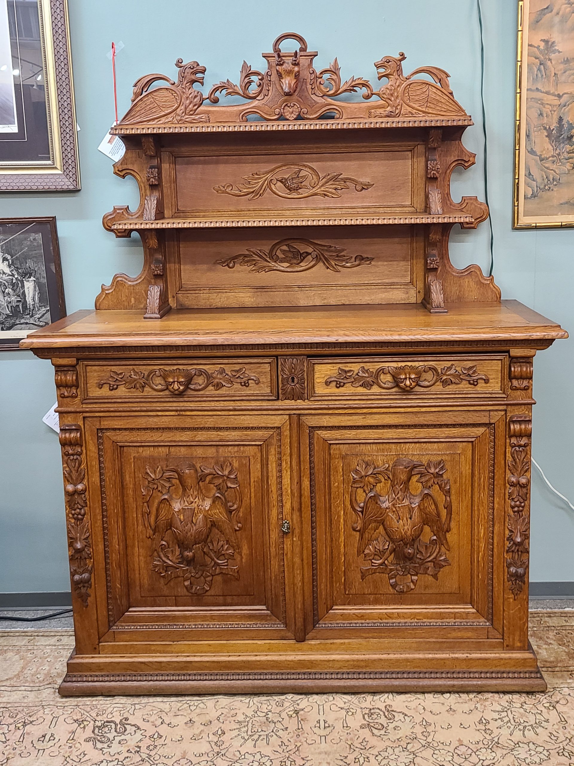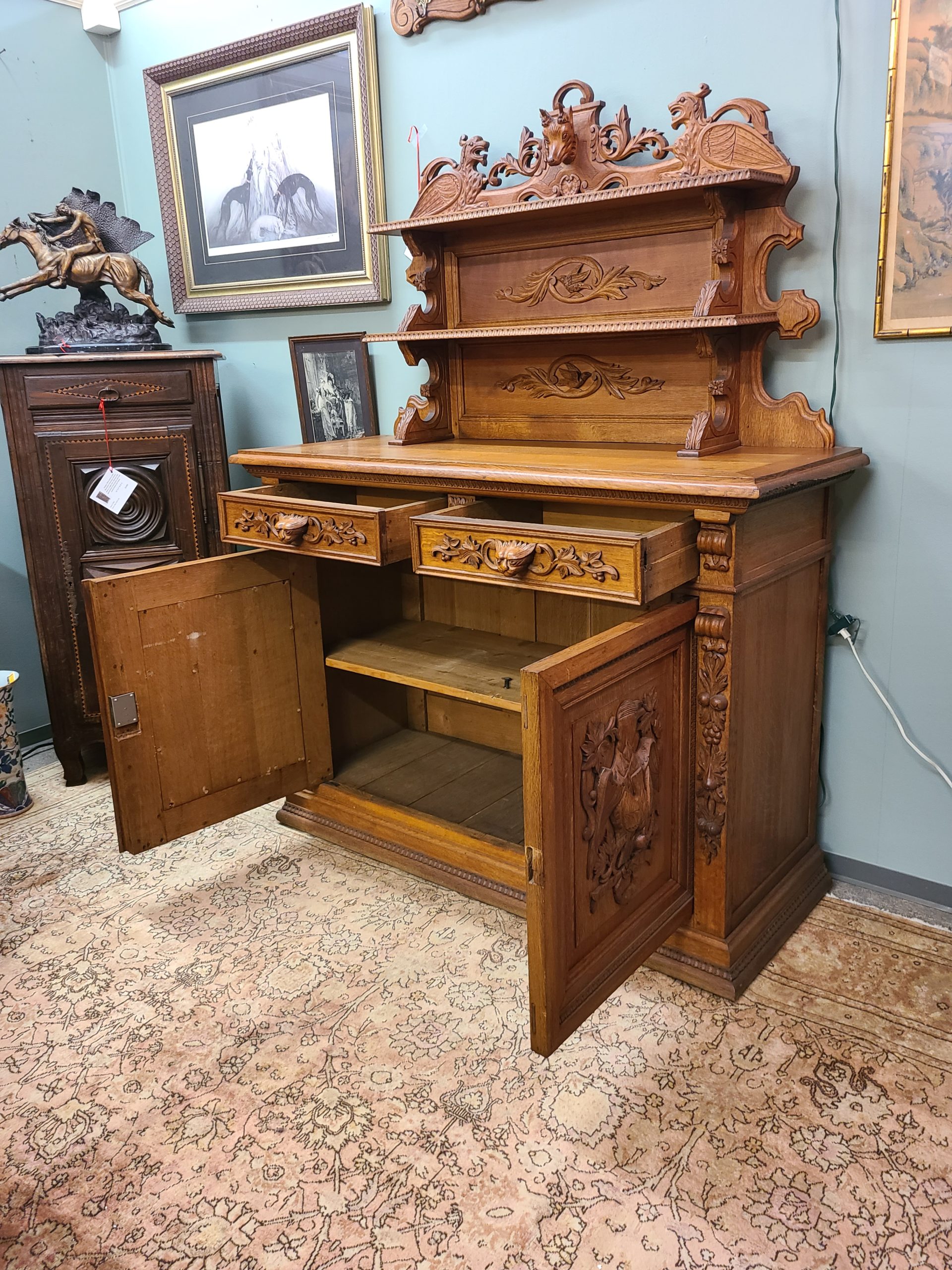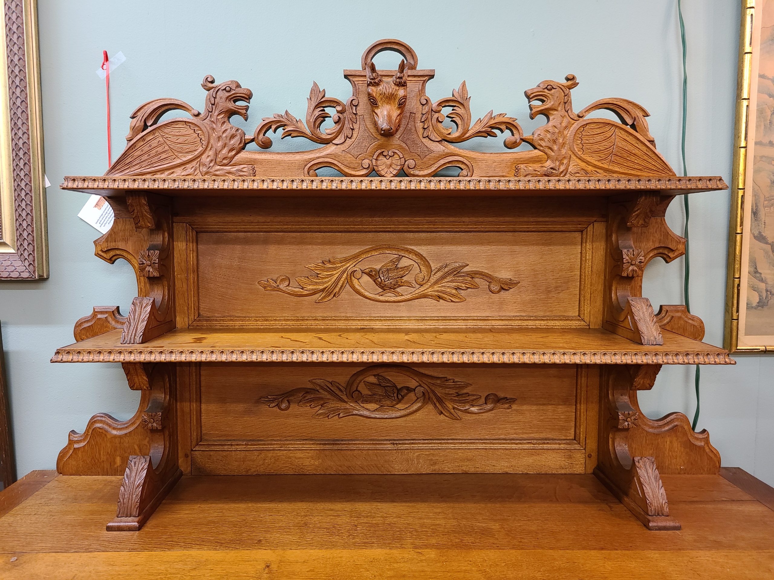 Animal carvings adorn the top of two display shelves, drawer pulls, and two doors below.