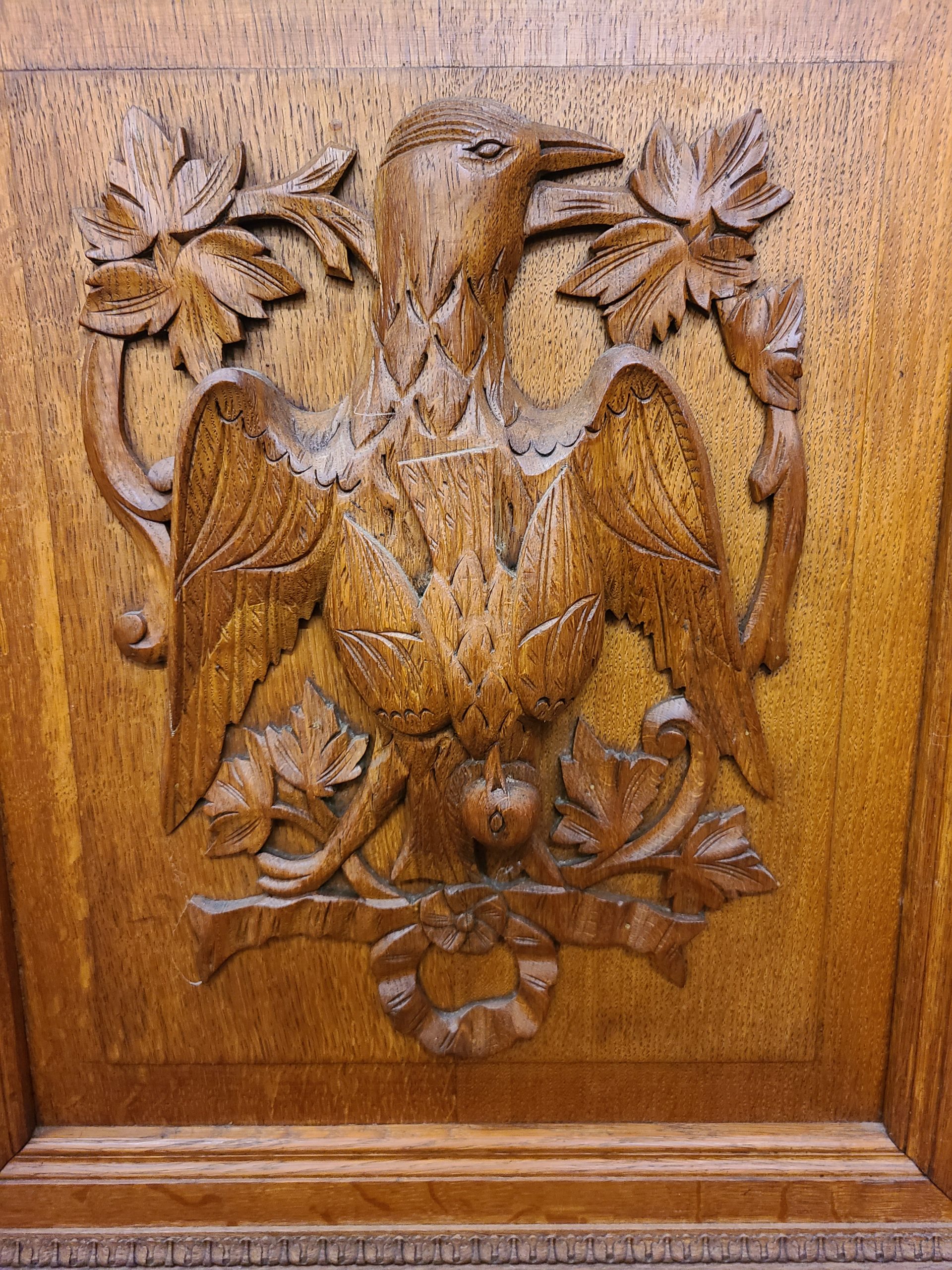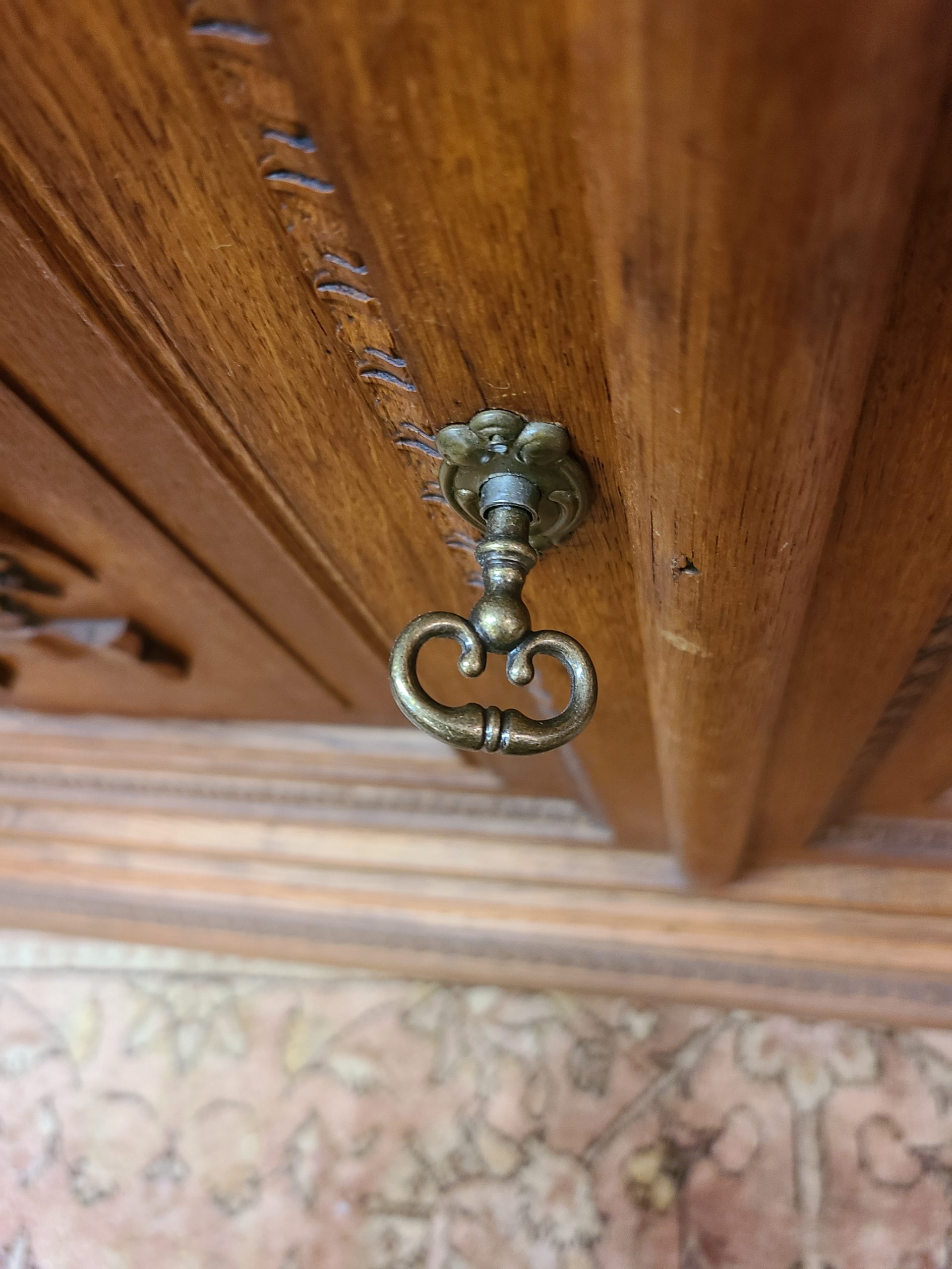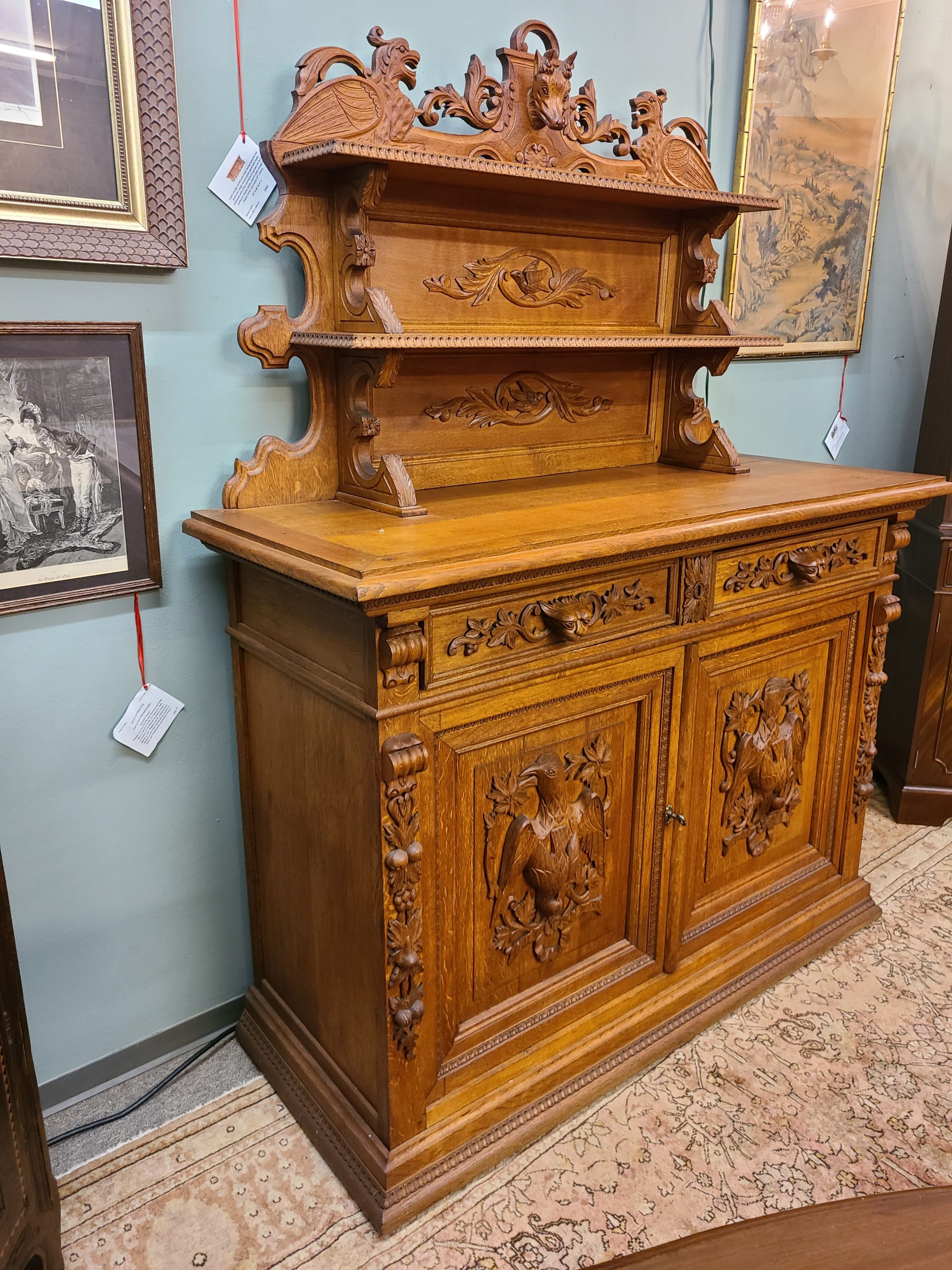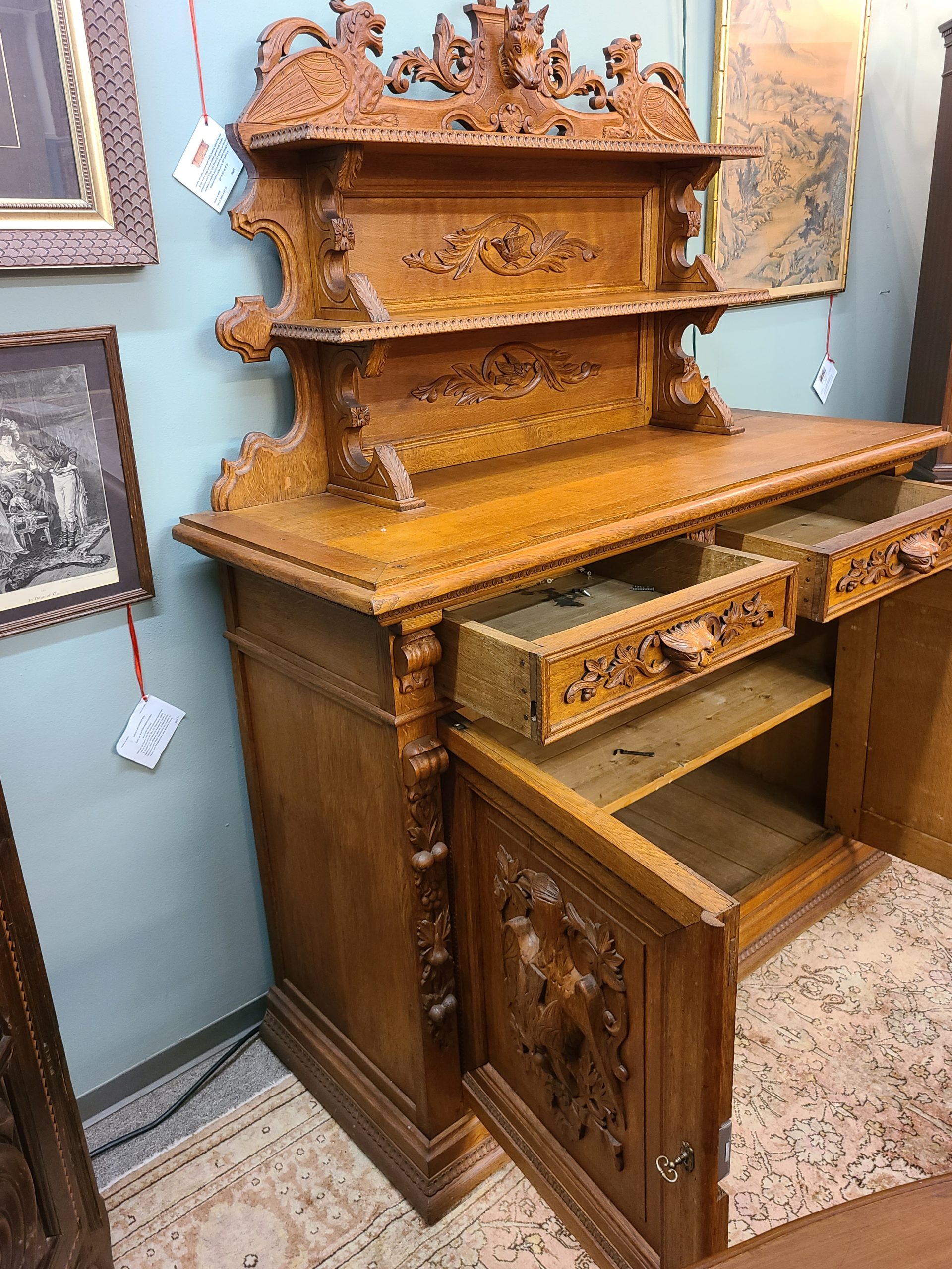Animal carvings adorn the top of two display shelves, drawer pulls, and two doors below.
