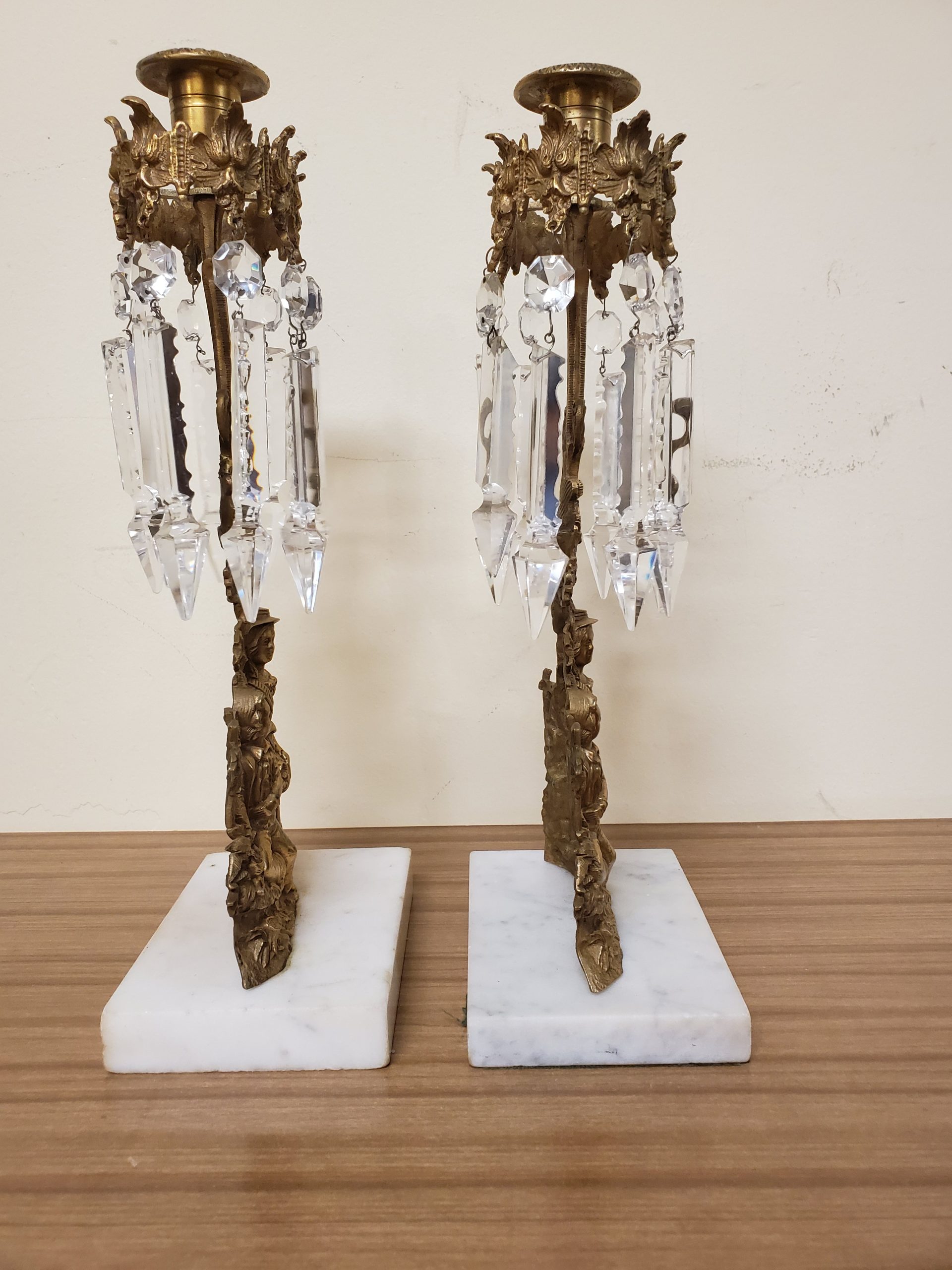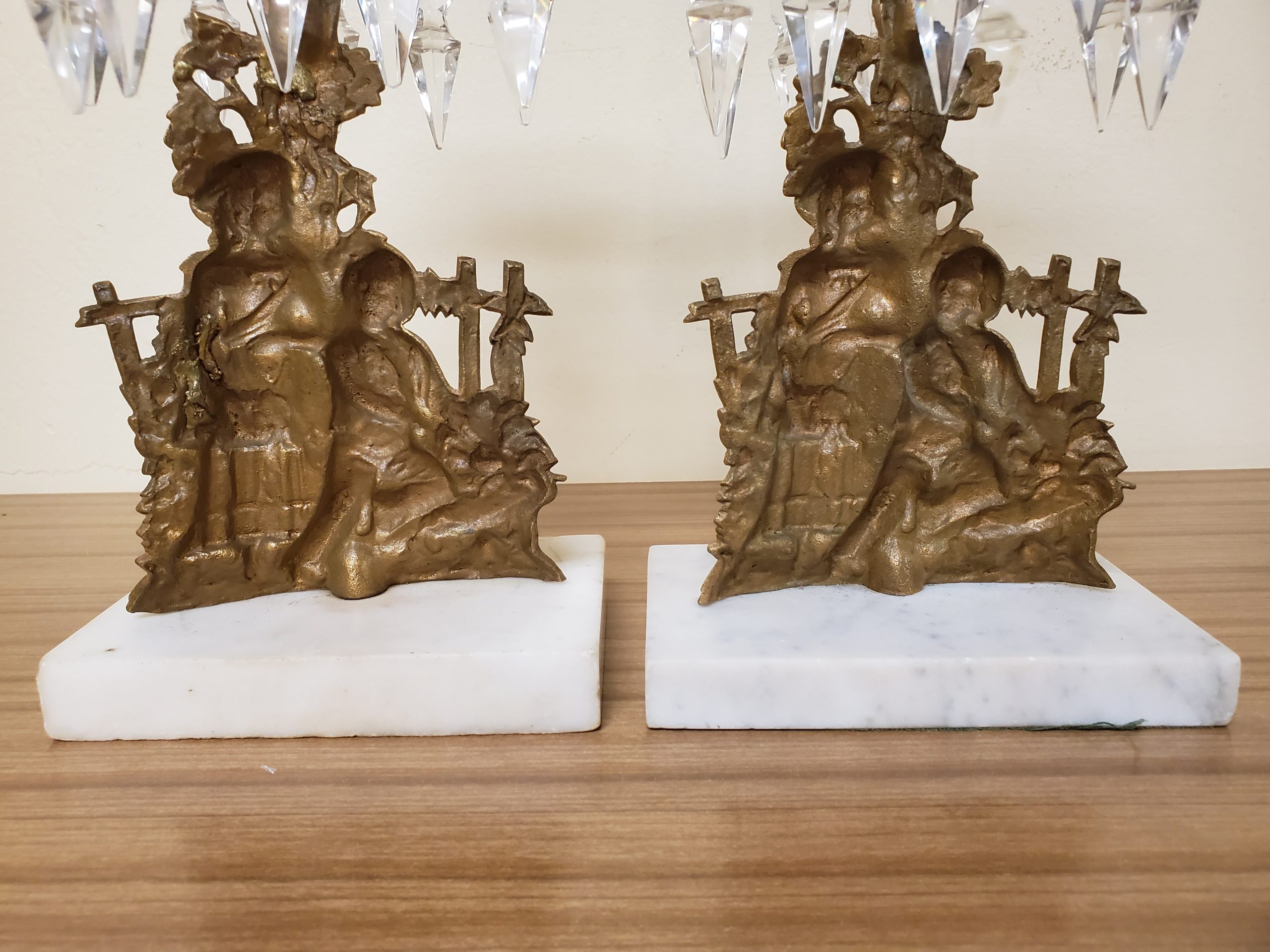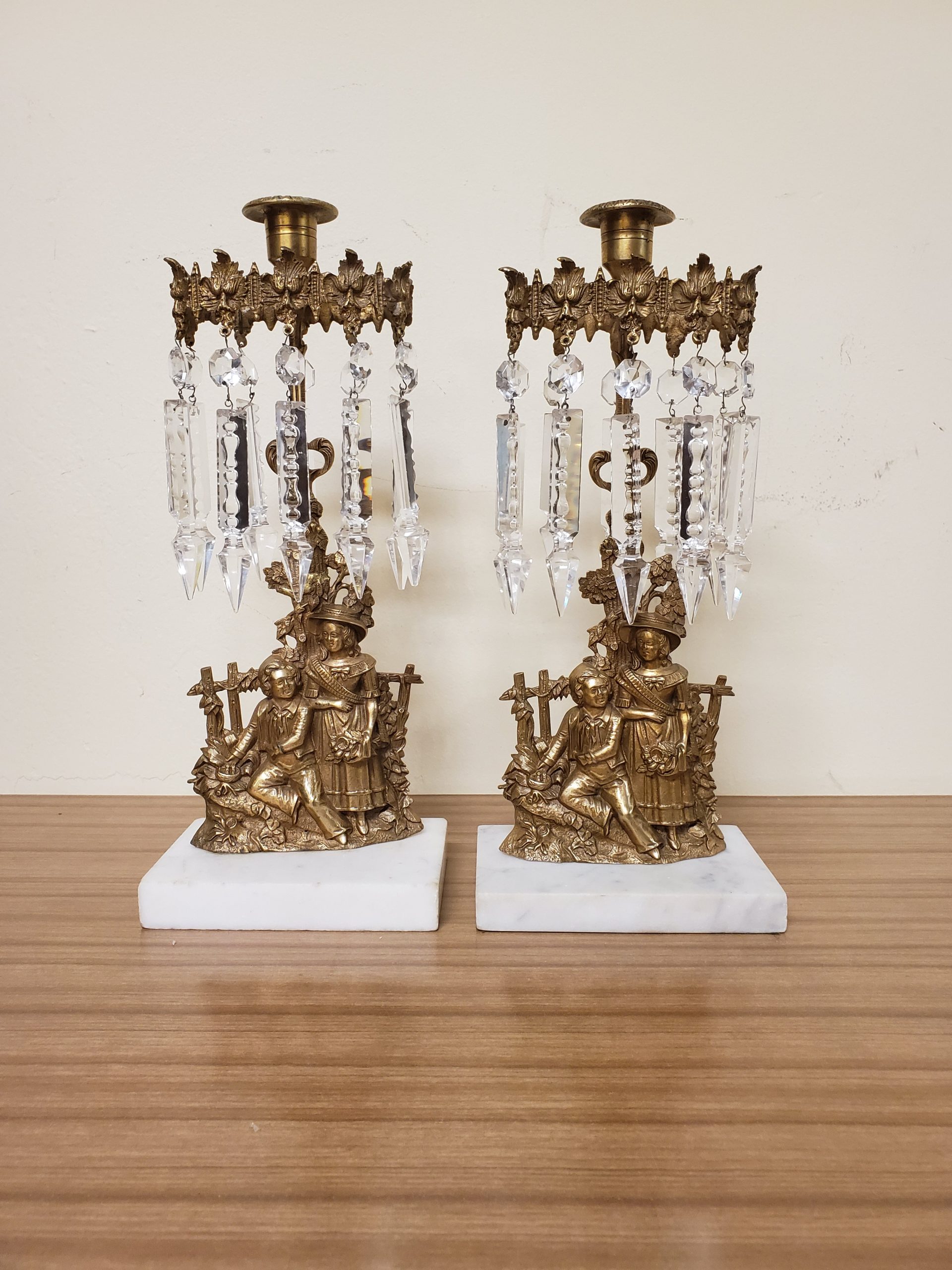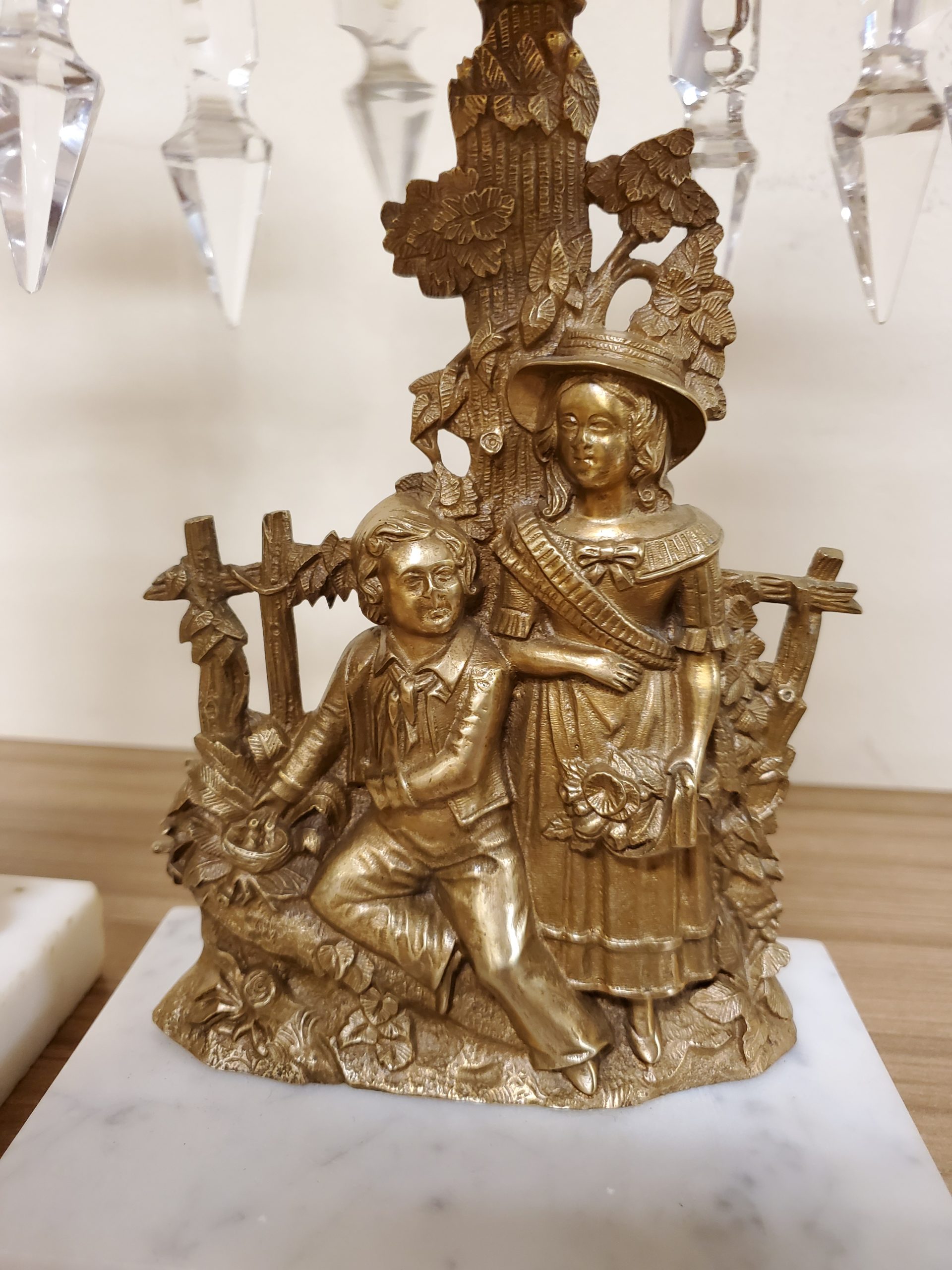 Antique pair of Victorian brass candelabras (candle holders) figural gilt metal girandole depicting a couple leaning against a trellis fence, that reaches up to form the encircled top with hanging crystal prisms, on white marble base. From the late 19th century.