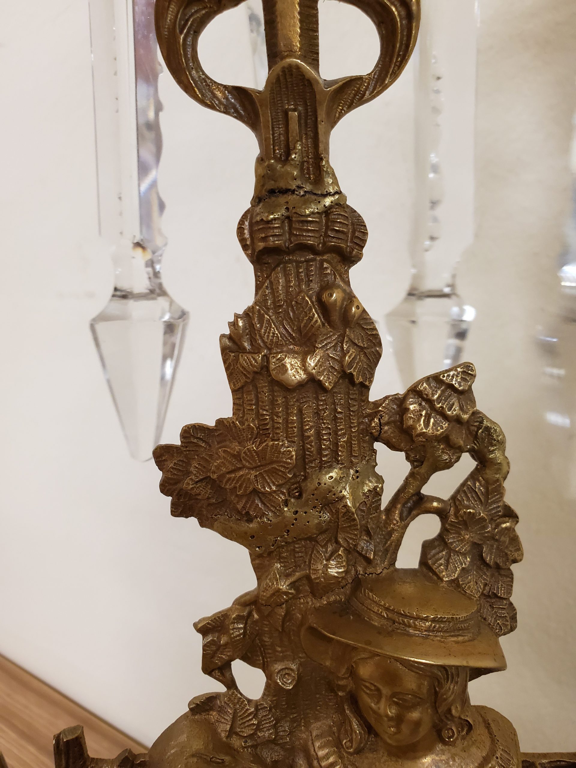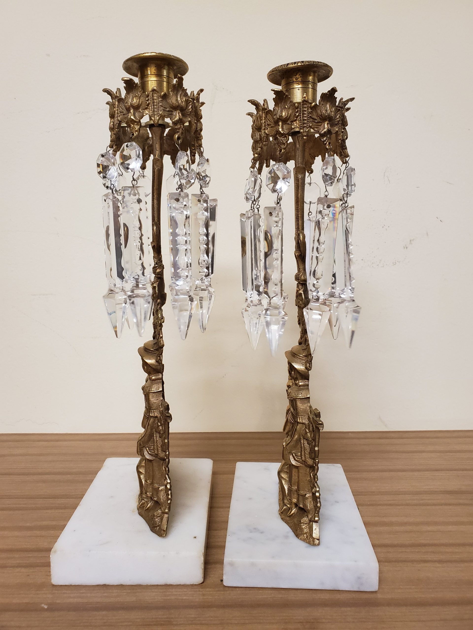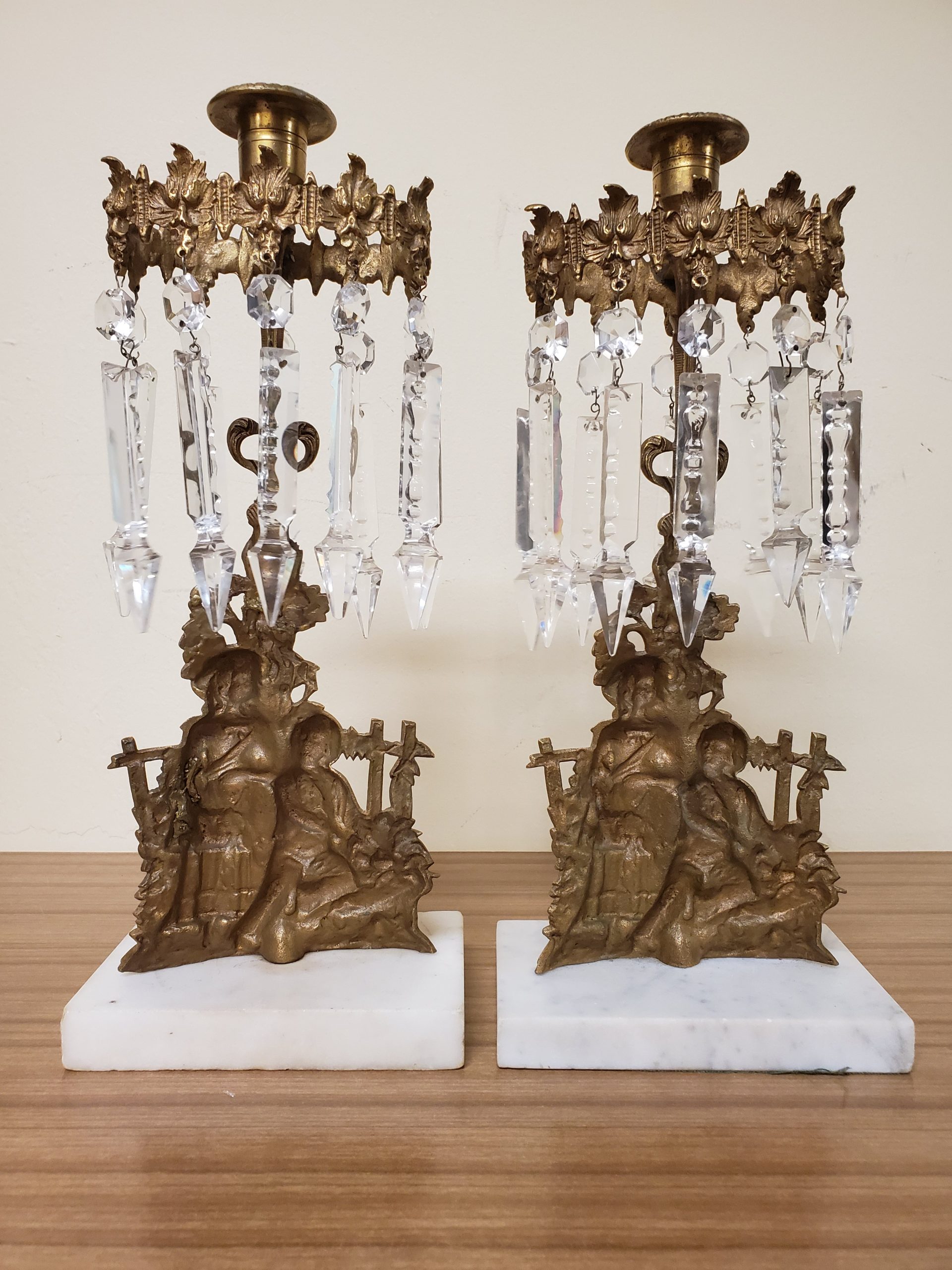 Antique pair of Victorian brass candelabras (candle holders) figural gilt metal girandole depicting a couple leaning against a trellis fence, that reaches up to form the encircled top with hanging crystal prisms, on white marble base. From the late 19th century.